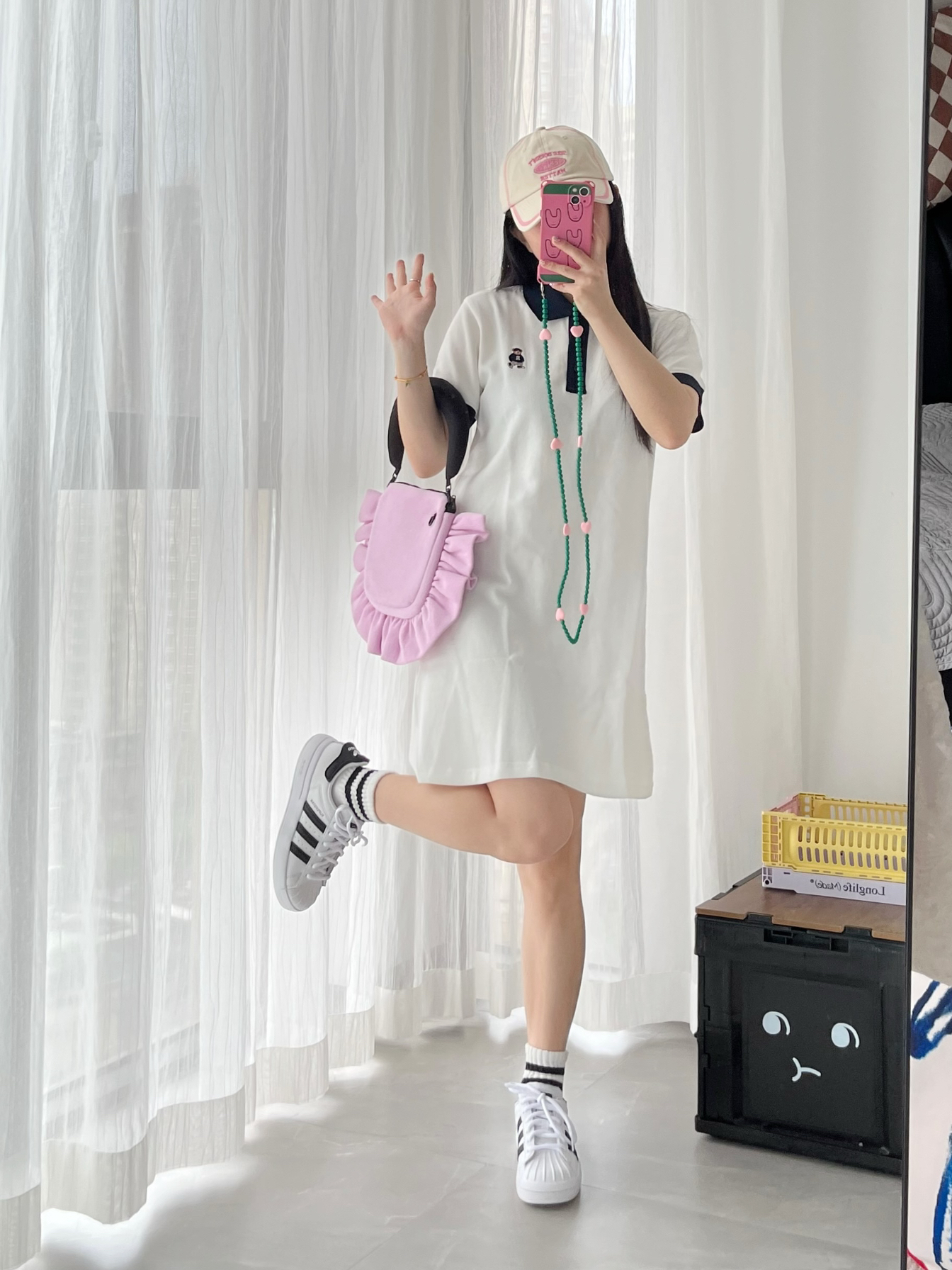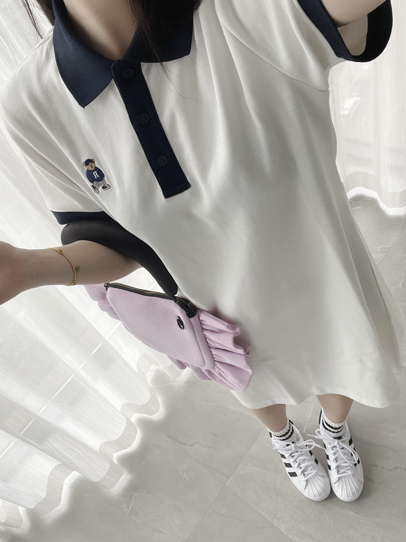 比起普通贝壳头! 这个鞋型好穿多啦! 不掉跟还很轻!就是很舒服~ 鞋型也是有点圆圆的偏可爱 搭配polo领连衣裙好韩啊! 这样穿简单又减龄!超有学院气!