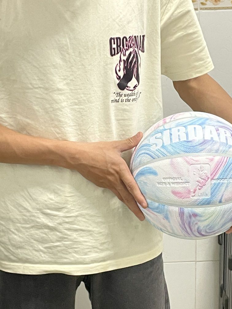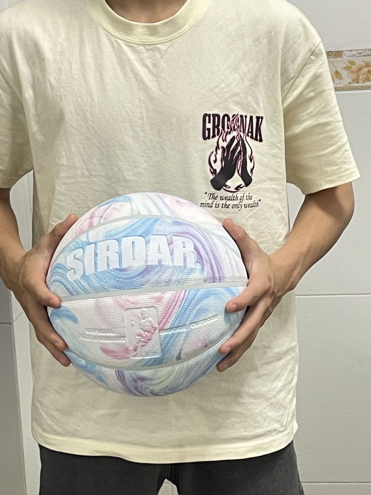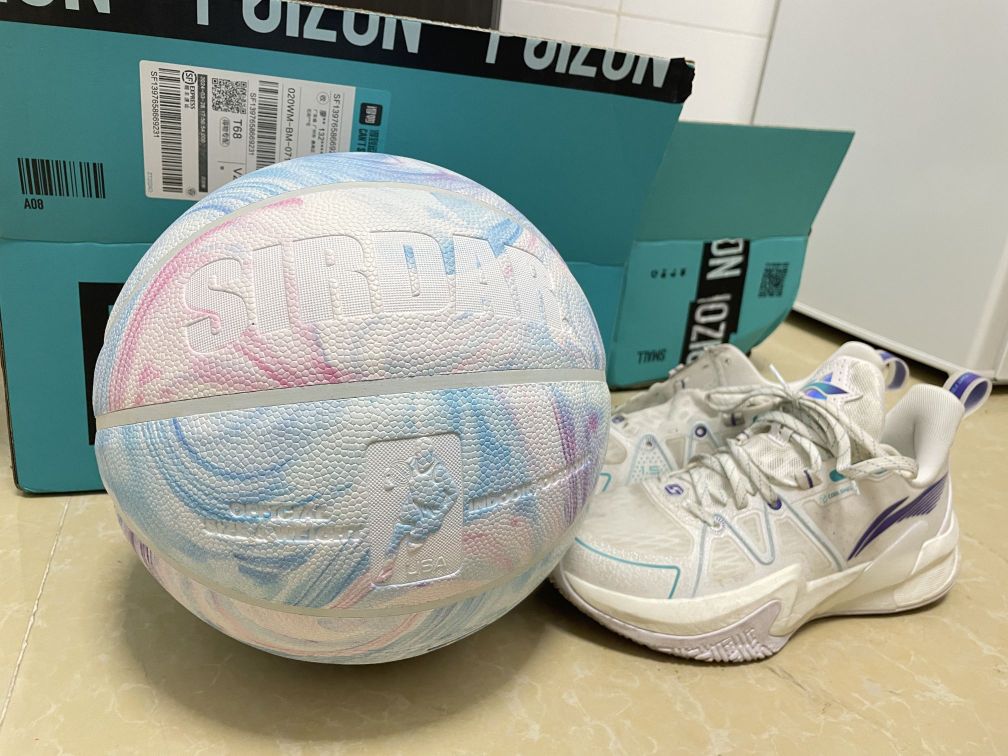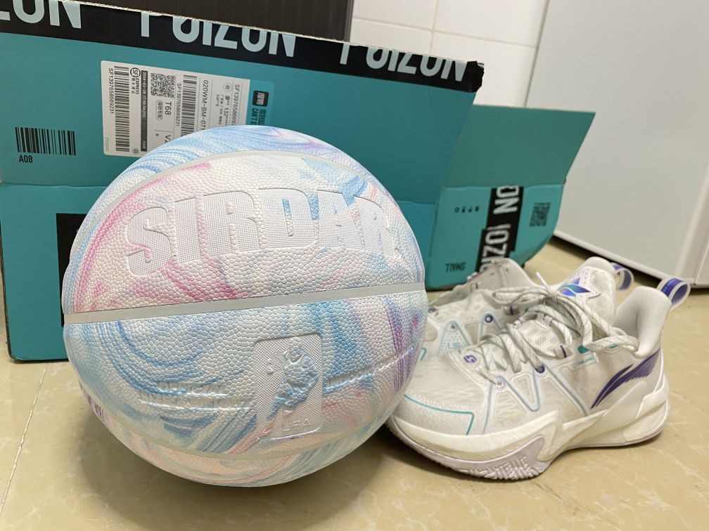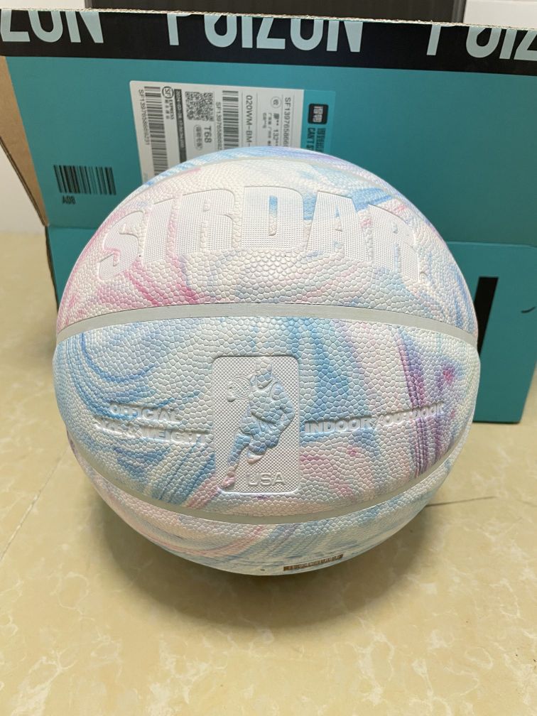 这款是萨达的行云流水配色篮球,篮球的材质是pu的,我打起来手感感觉还不错,也比较粘手。但是这款球我感觉只适合室内场去打,室外场容易脏,而且粉紫色的配色,是一款送女朋友的不错选择!