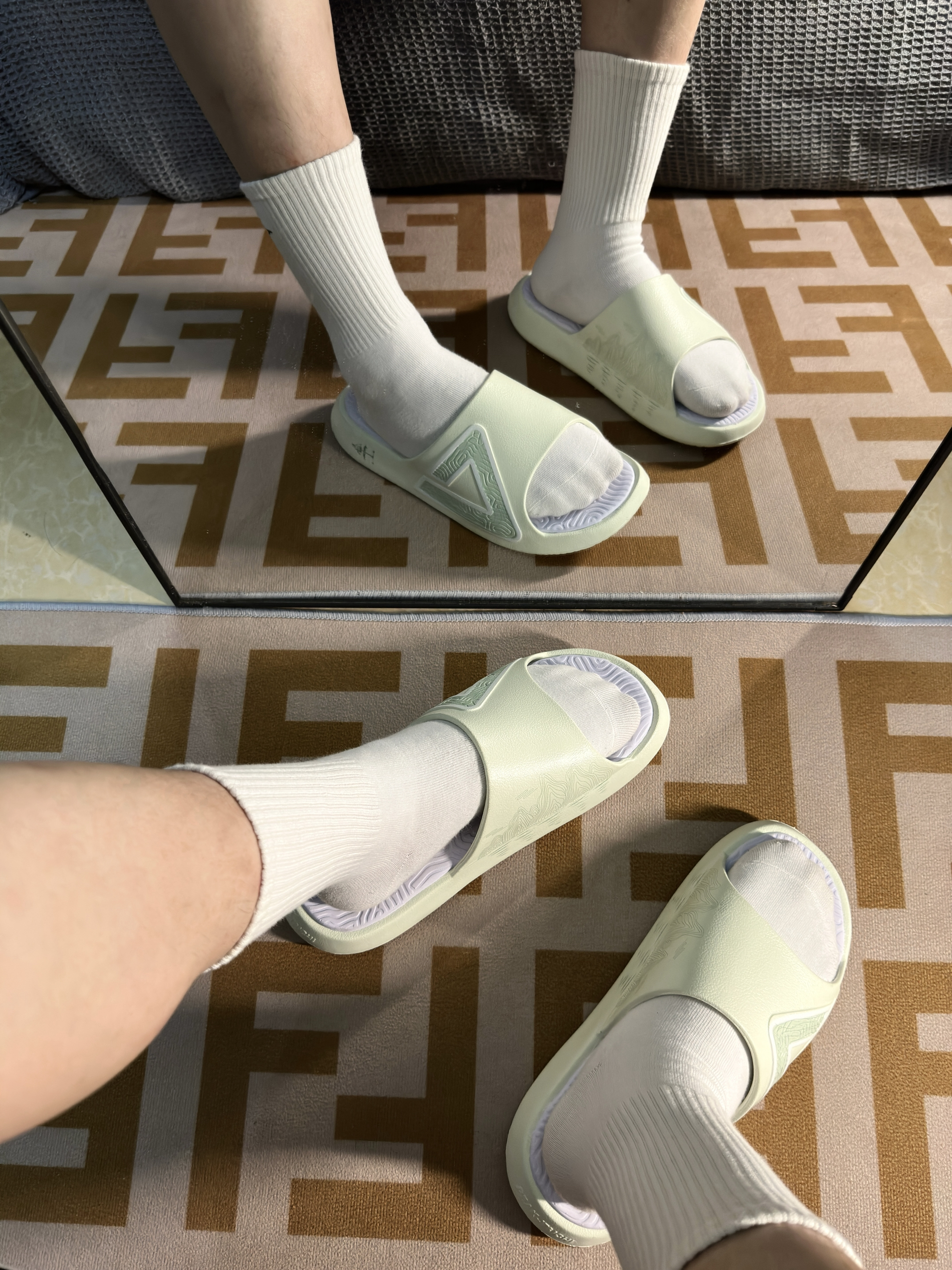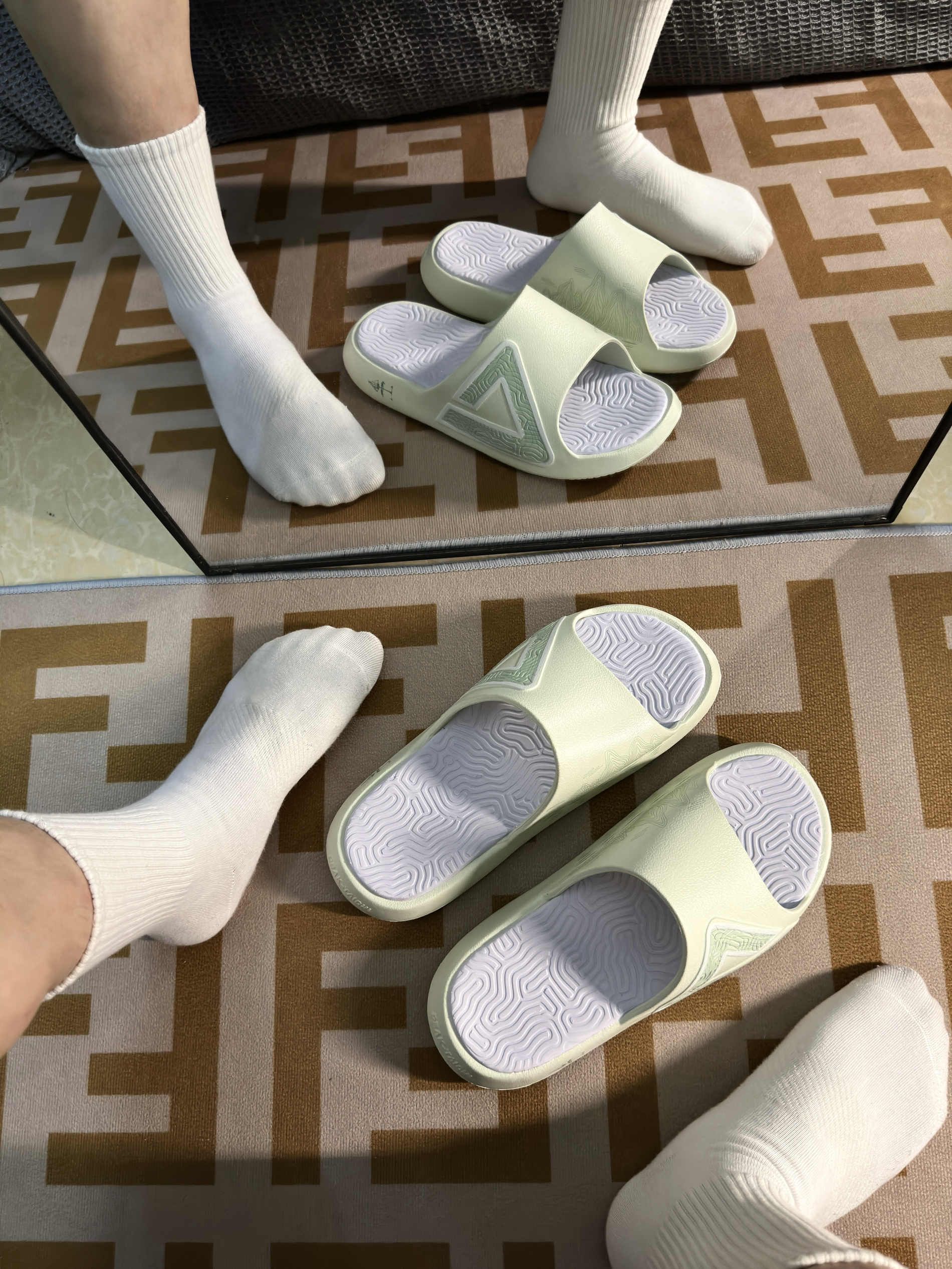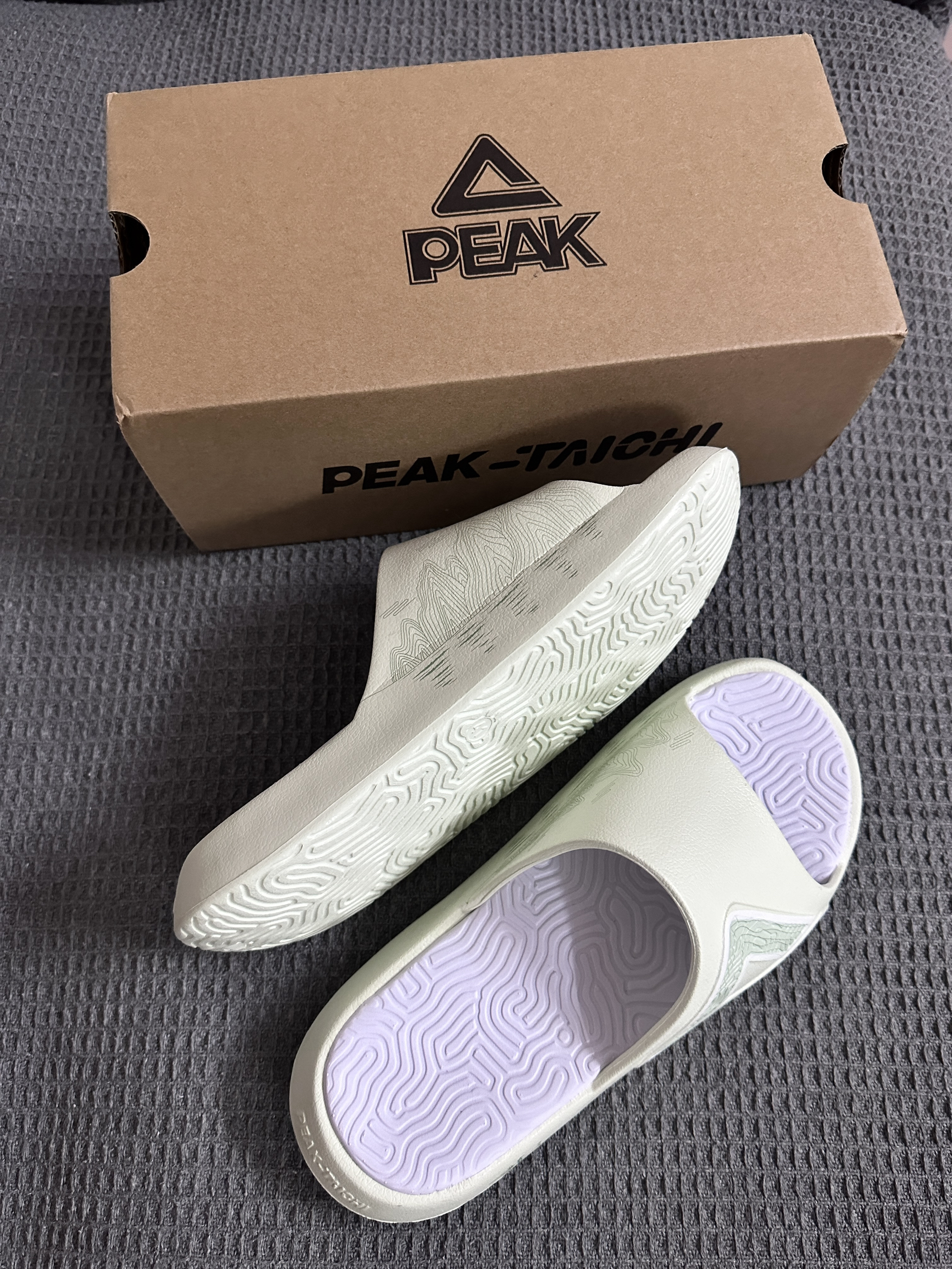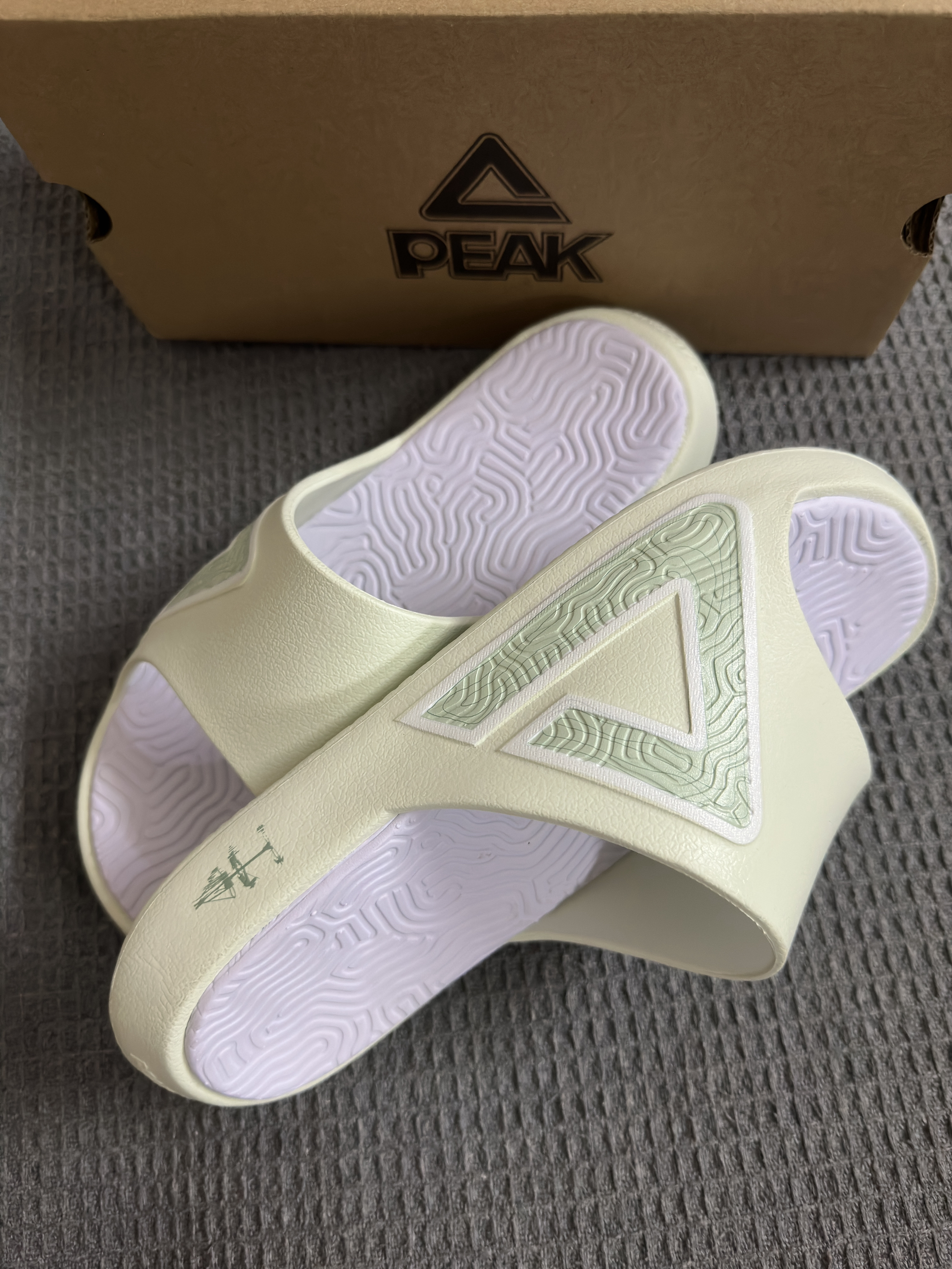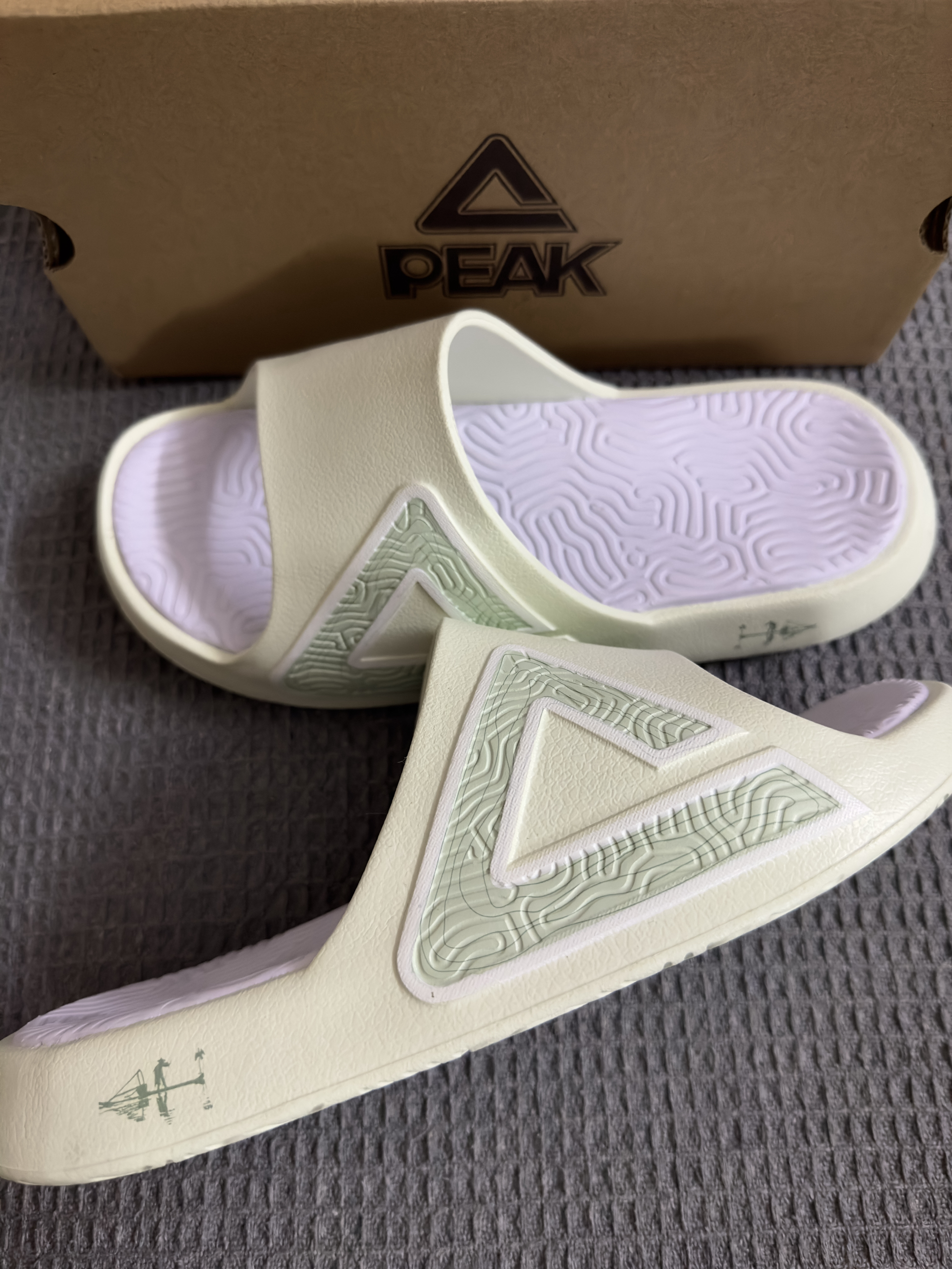 近期入手了匹克态极大三角2.0拖鞋🩴 匹克大三角拖鞋大家一定不陌生吧,几乎人手一双的拖鞋,热度很高很火的一款拖鞋! 这次2.0配色颜值拉满,颜色很夏天,白绿匹克大logo和侧面⛰️的印花,真的很国风呀,有一种桂林山水的感觉哈哈哈,非常不错👍 上脚舒适度很软,很轻弹,有种踩在泡棉的感觉,夏天球场打球来上一双,日常通勤来上一双,蛮值得推荐入手的👍