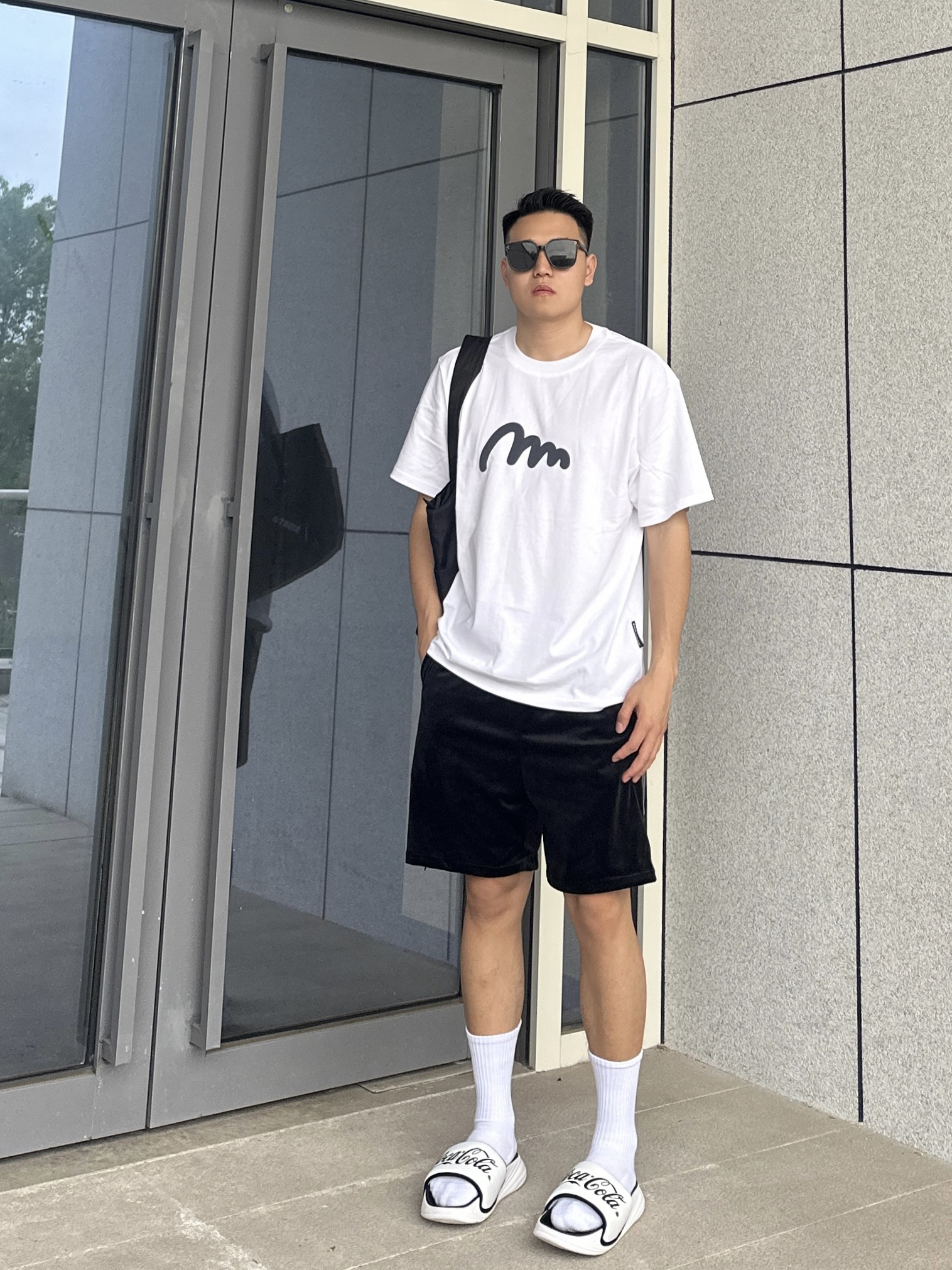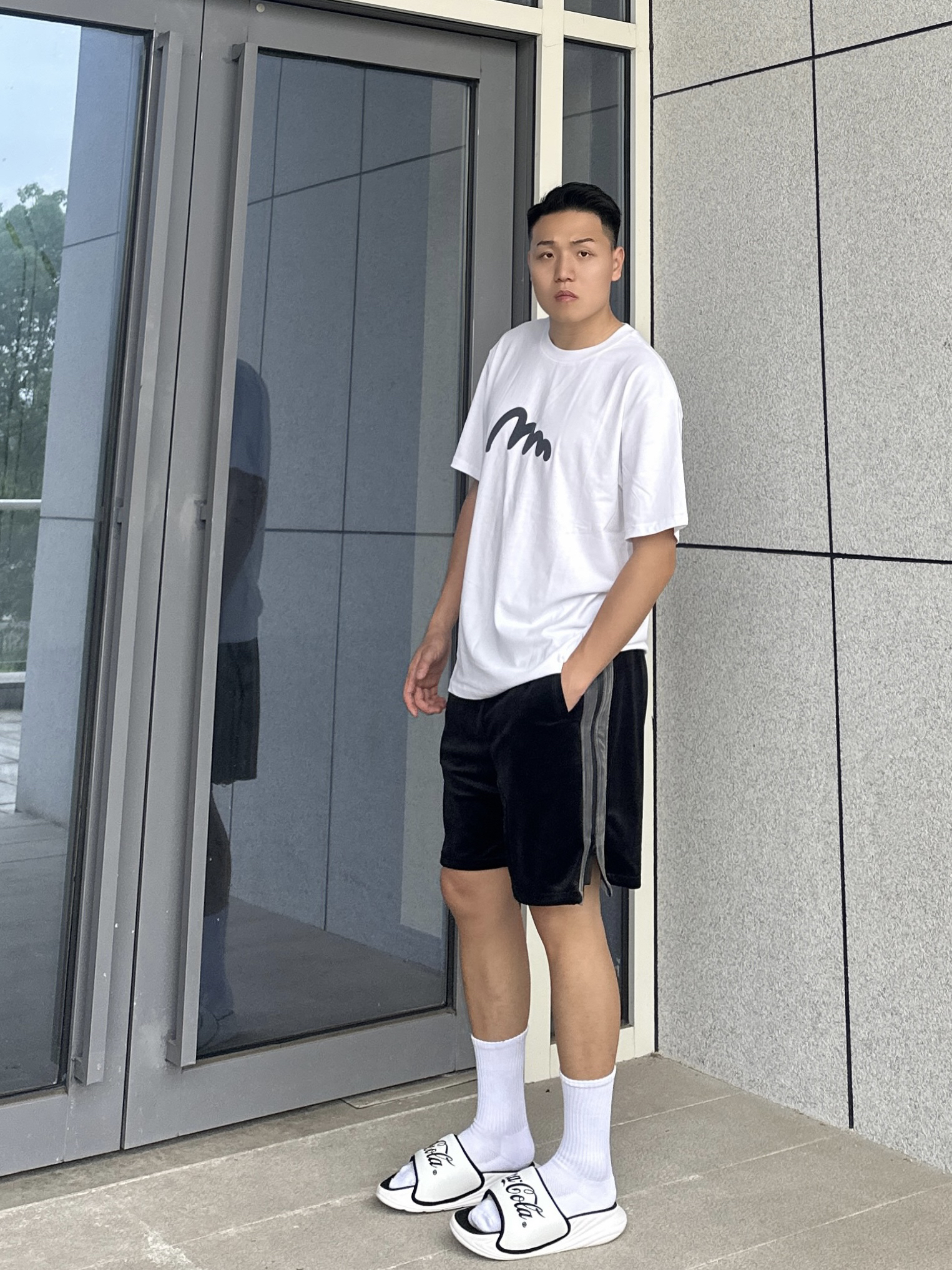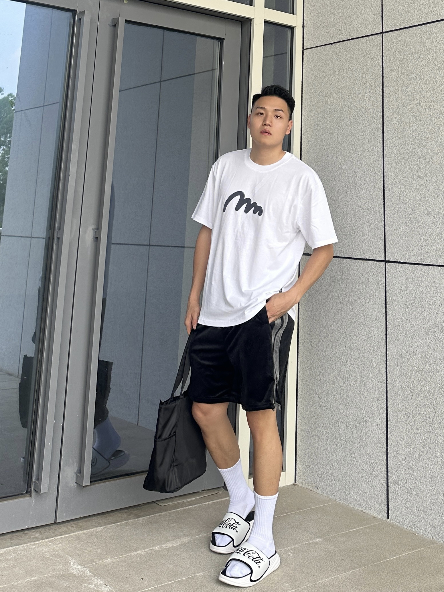 夏天当然要穿的干净清爽啦 那就少不了一件简约显干净的T恤 白色圆领短袖加上胸前小印花 整个简约又时尚 搭配一条黑色丝绒短裤舒适又很百搭 再来双黑白色系的百搭运动拖鞋 鞋身的黑色logo时尚感满满 加上舒适的脚感 真的超赞 整个黑白搭配显得人干净又清爽
