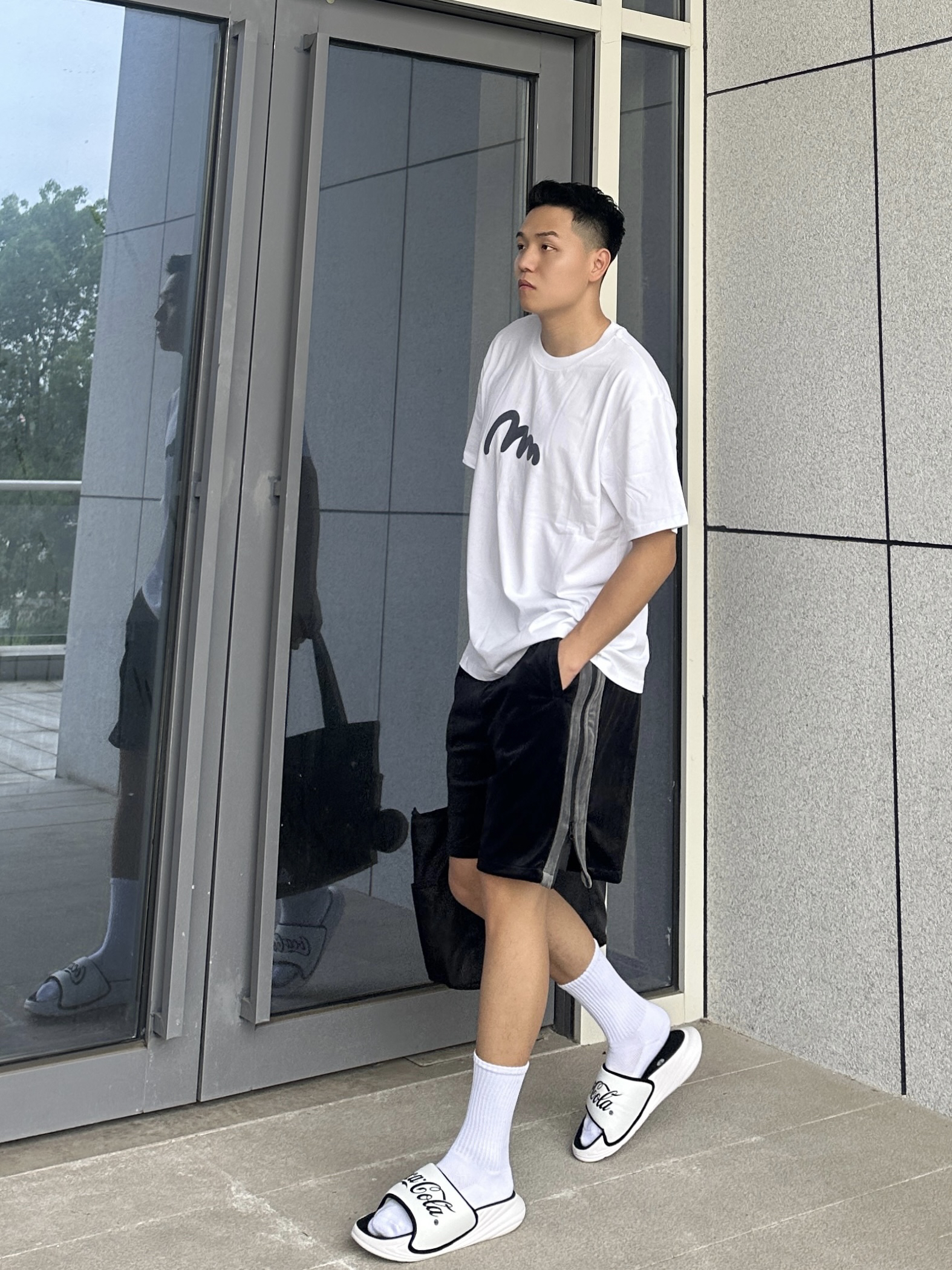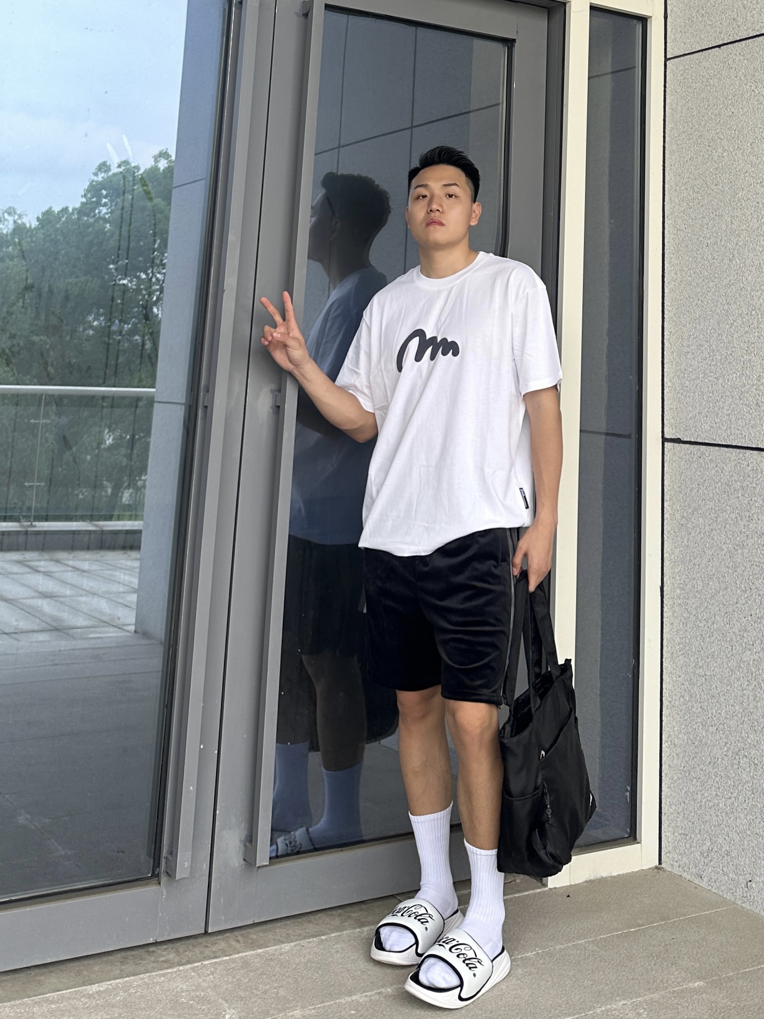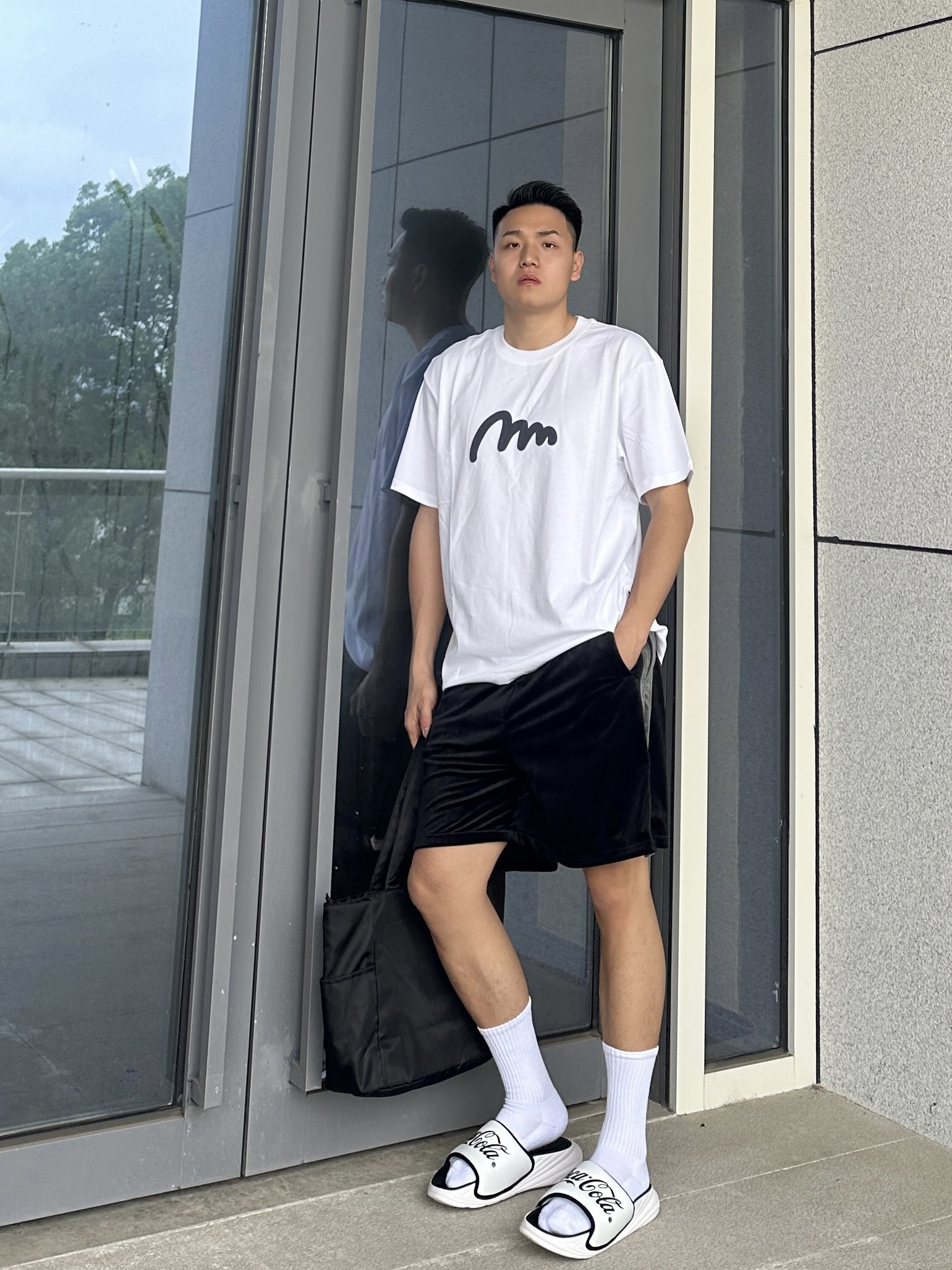 夏天当然要穿的干净清爽啦 那就少不了一件简约显干净的T恤 白色圆领短袖加上胸前小印花 整个简约又时尚 搭配一条黑色丝绒短裤舒适又很百搭 再来双黑白色系的百搭运动拖鞋 鞋身的黑色logo时尚感满满 加上舒适的脚感 真的超赞 整个黑白搭配显得人干净又清爽