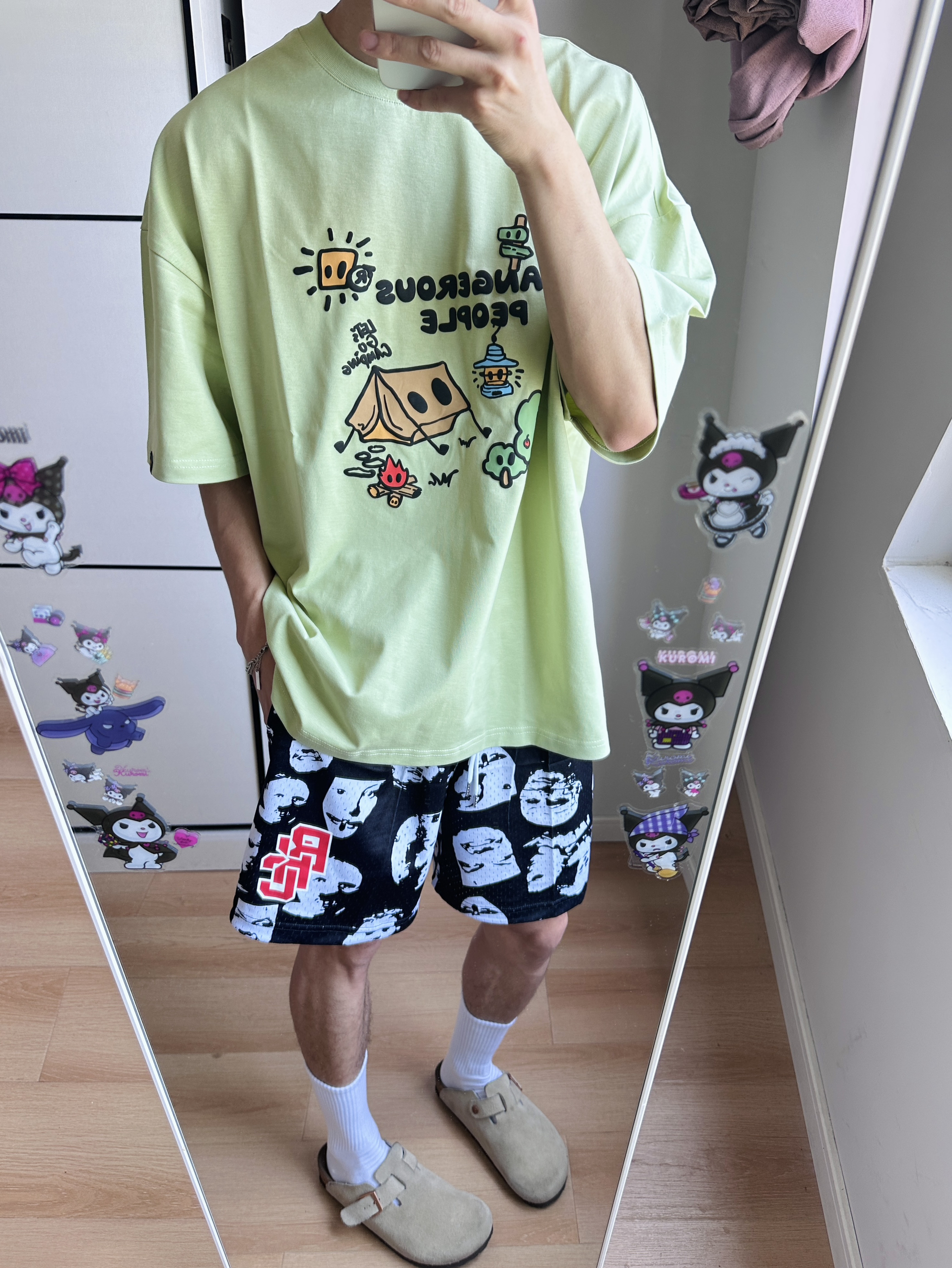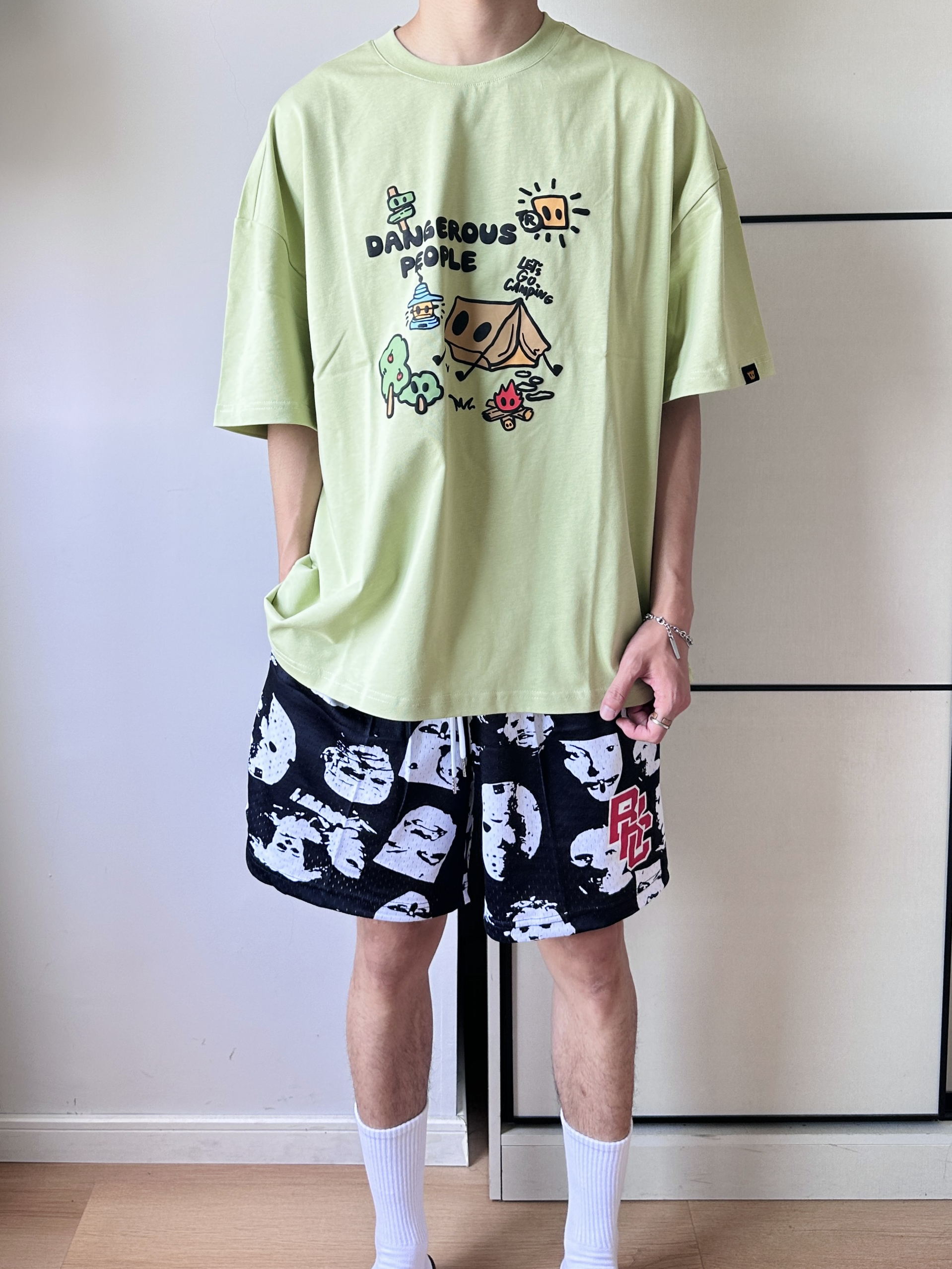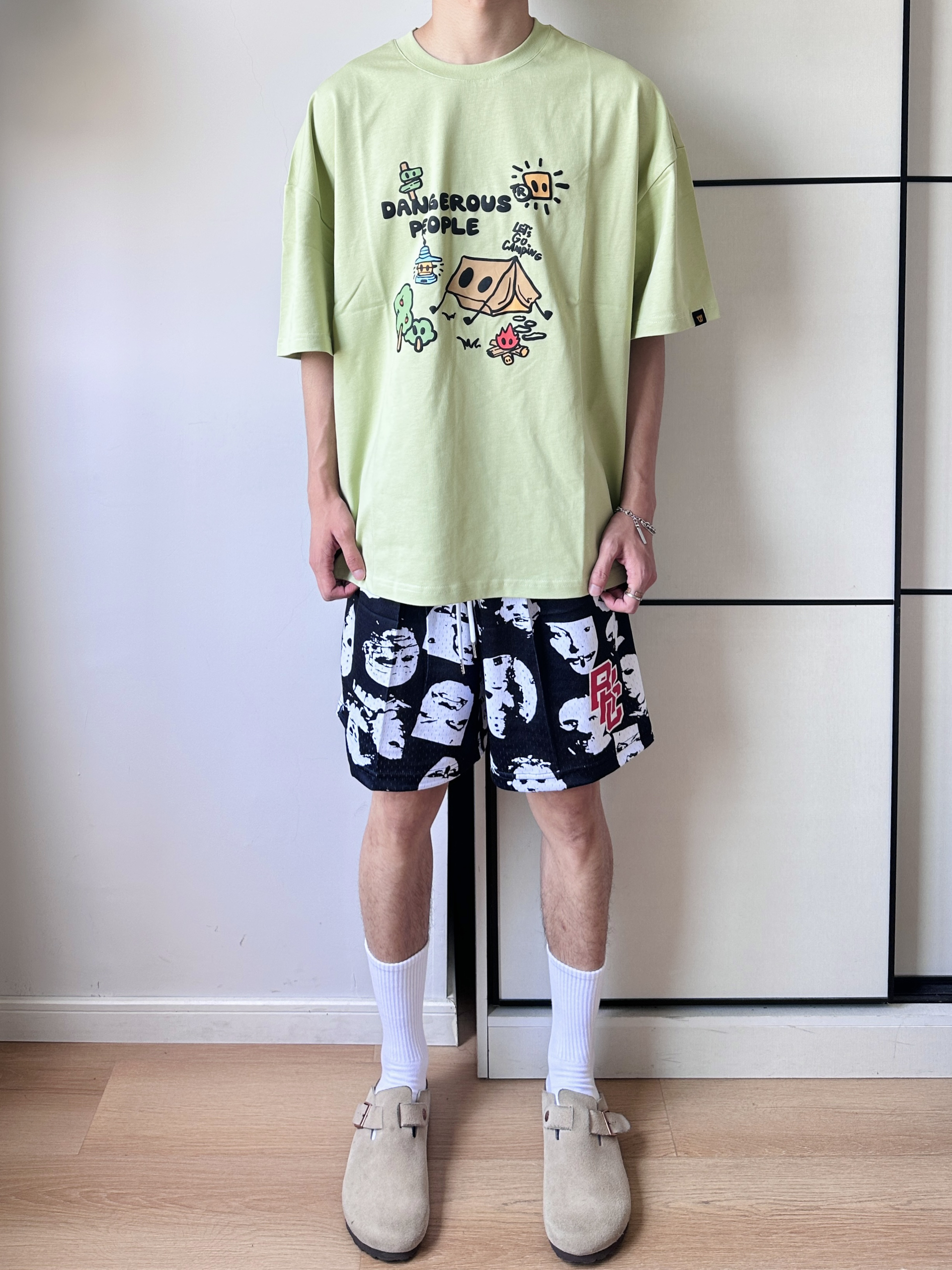 夏天一到 开启🔛短袖短裤的主场时刻 当然要用美式感来搭才出彩! 跟着偶像薛之谦复刻穿搭 oversize版型 潮趣味印花 图案与设计很好看 搭配人像满印短裤 高街感十足 加上一双勃肯鞋 一整个潮流美式小帅感 get自己喜欢的美式oversize感 👔DANGEROUSPEOPLE 🩳BKCXIZE 👟Devo Life