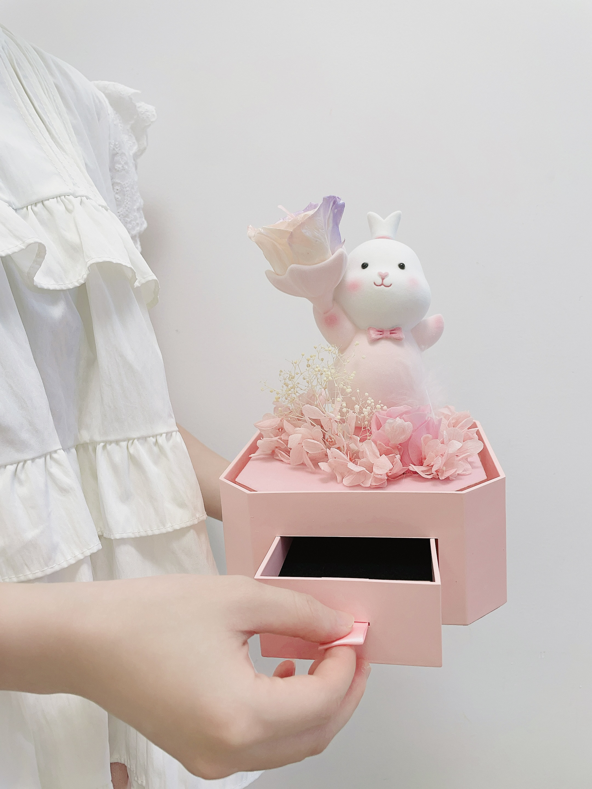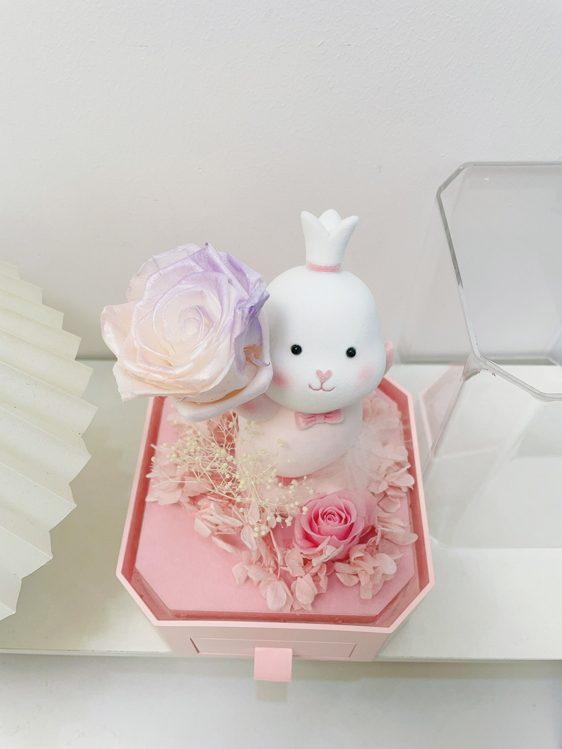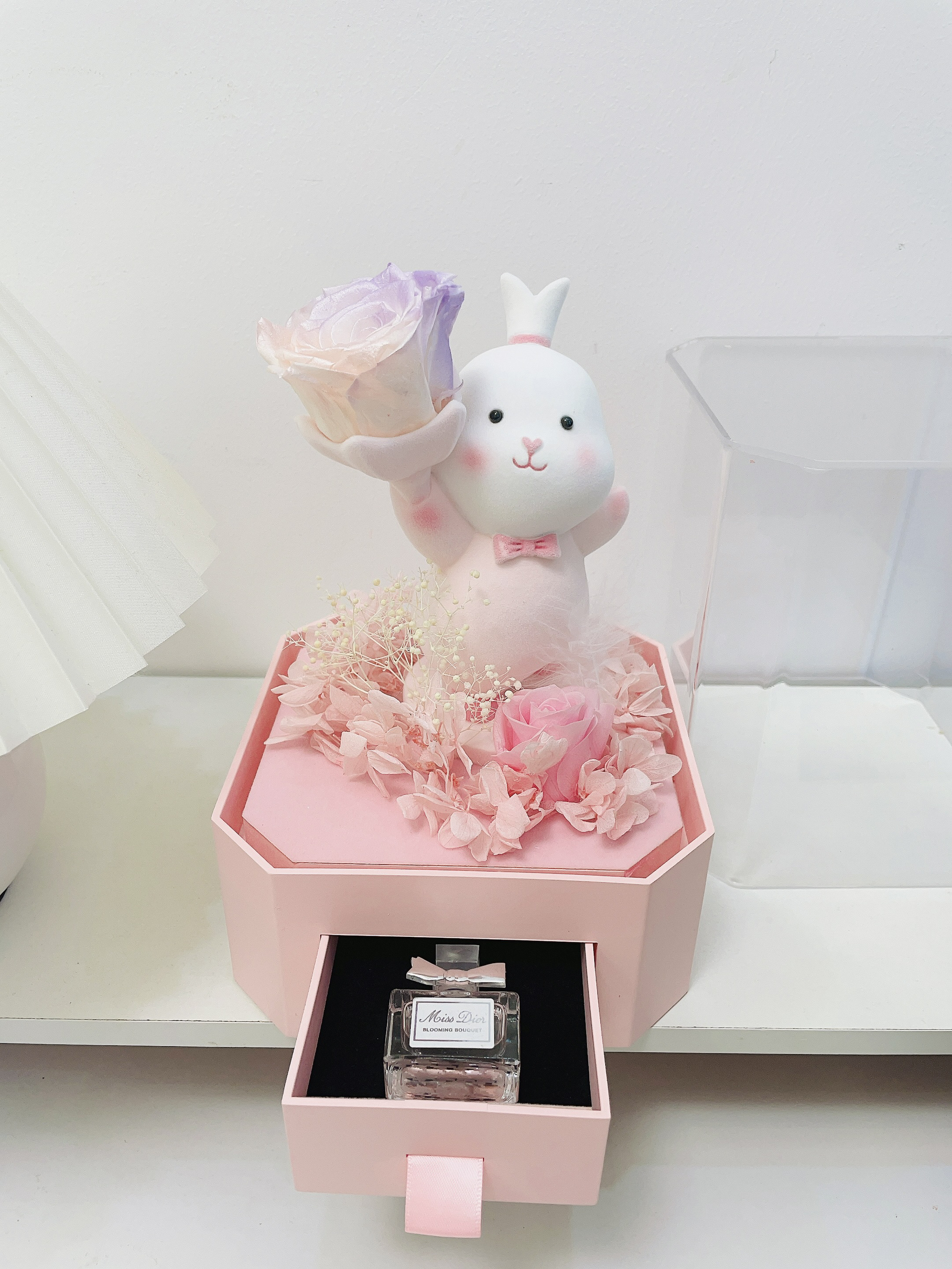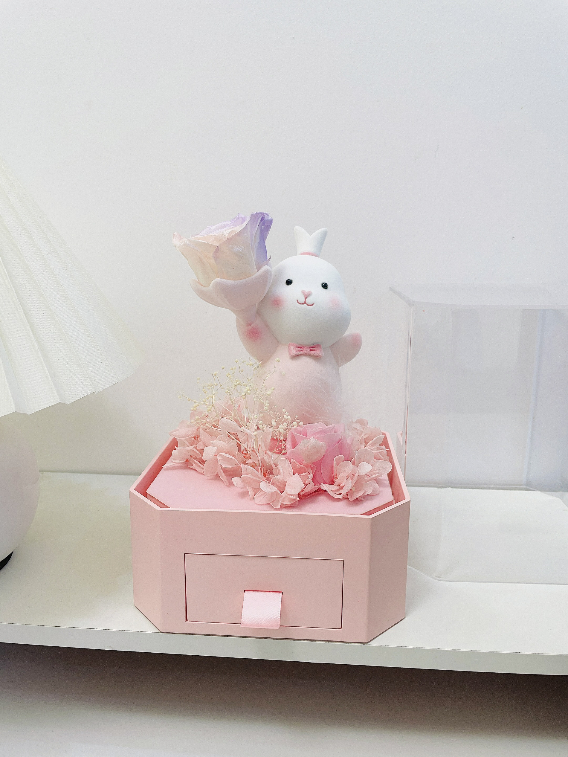 过两天就是我的生日啦 对象提前给我安排了礼物 是个幸运兔礼盒 包装hin精致 打开满满的仪式感 噂嘟奈斯 超级Q萌的兔子➕粉紫色玫瑰 永生花代表永不凋谢的爱 还有个小抽屉设计可以放首饰 夸夸对象是懂得挑礼物的
