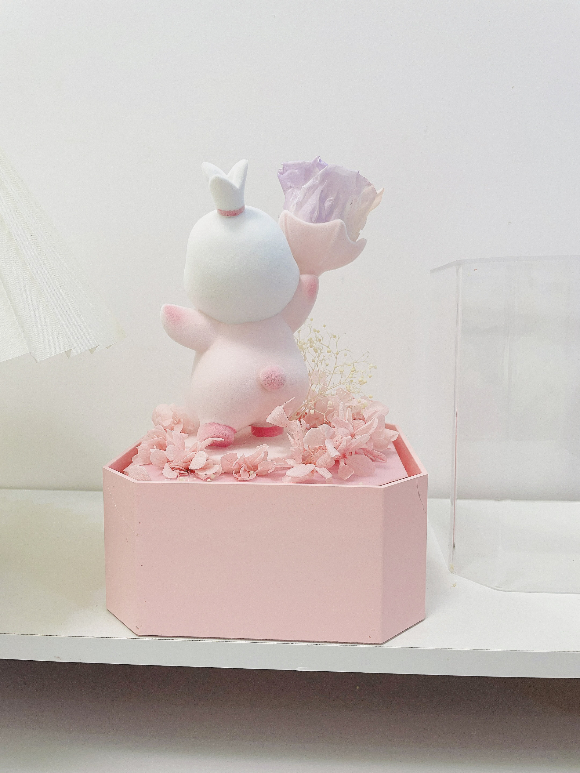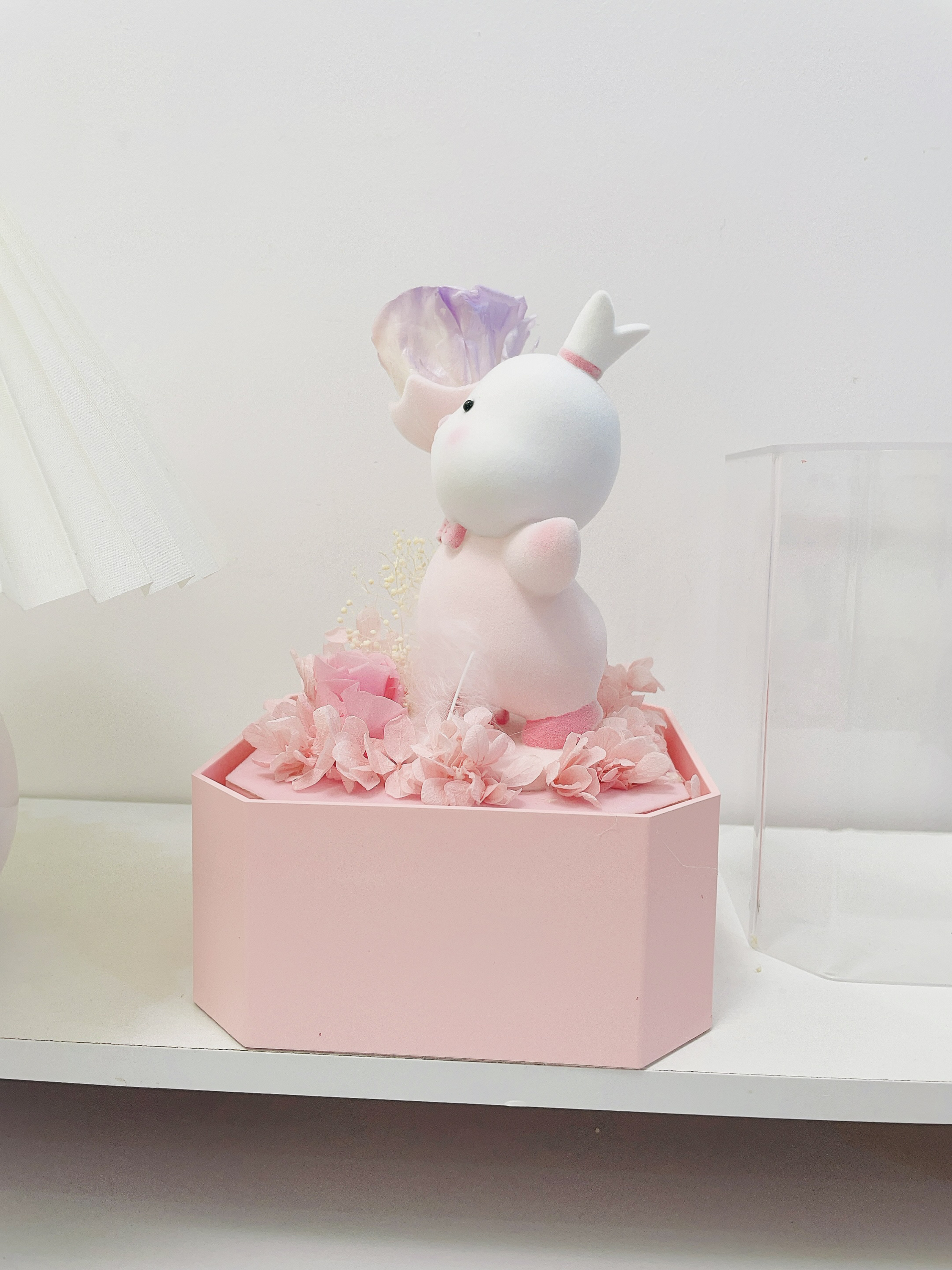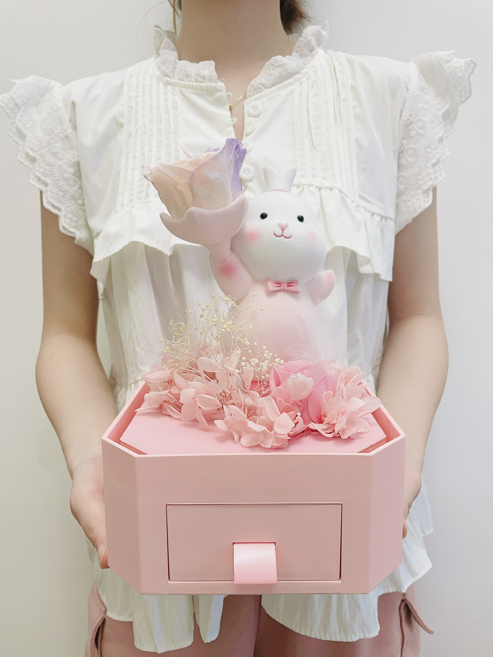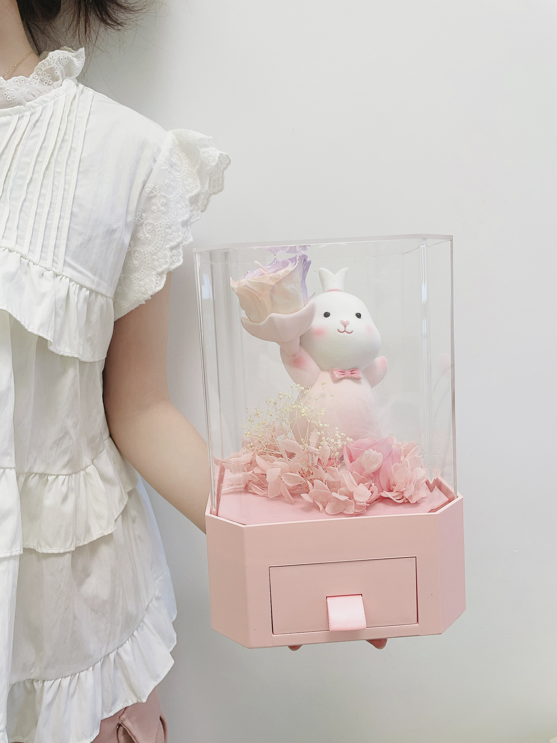 过两天就是我的生日啦 对象提前给我安排了礼物 是个幸运兔礼盒 包装hin精致 打开满满的仪式感 噂嘟奈斯 超级Q萌的兔子➕粉紫色玫瑰 永生花代表永不凋谢的爱 还有个小抽屉设计可以放首饰 夸夸对象是懂得挑礼物的