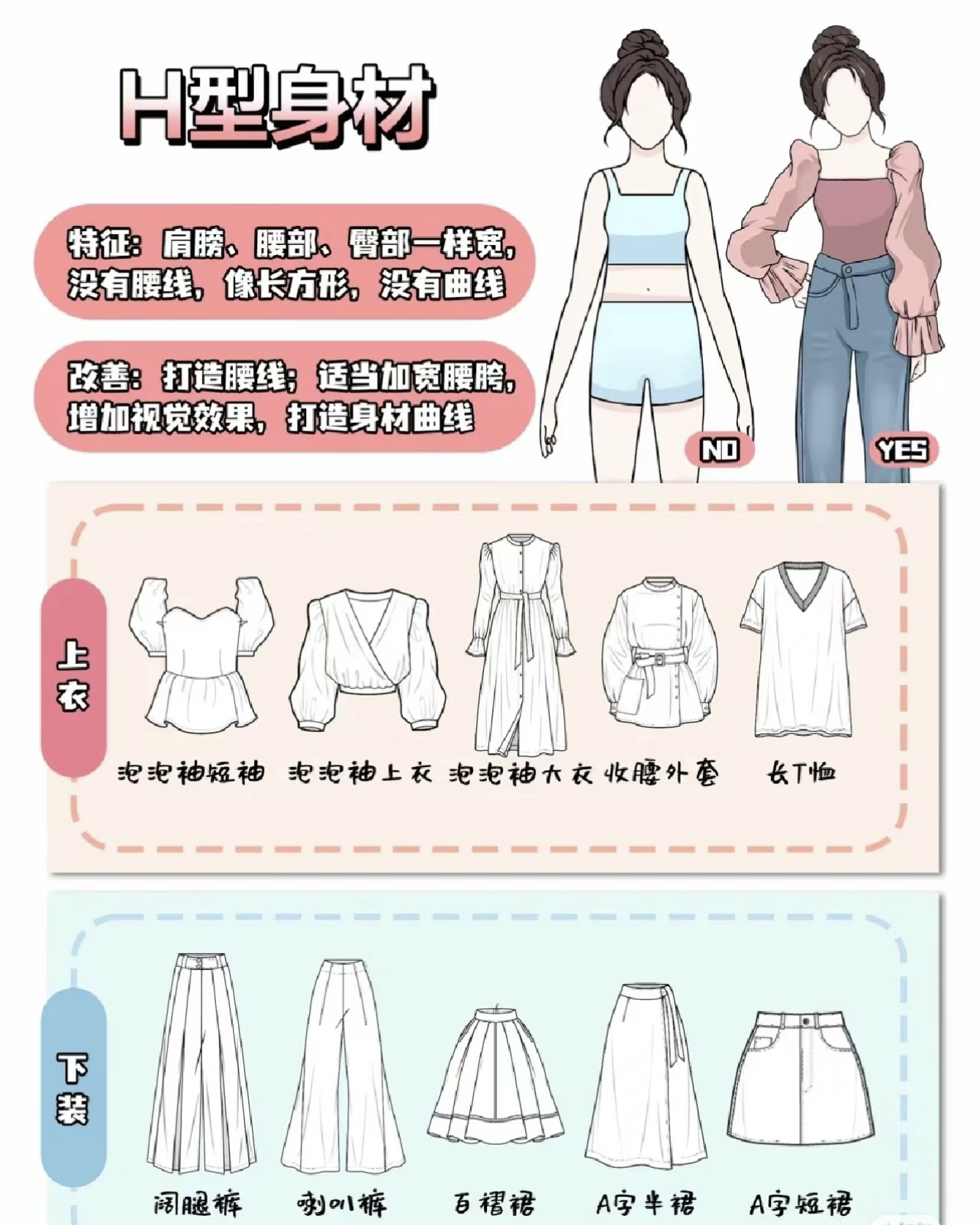 适合下装:A字短裙、阔腿裤、百褶裙、直筒裤、A字短裤