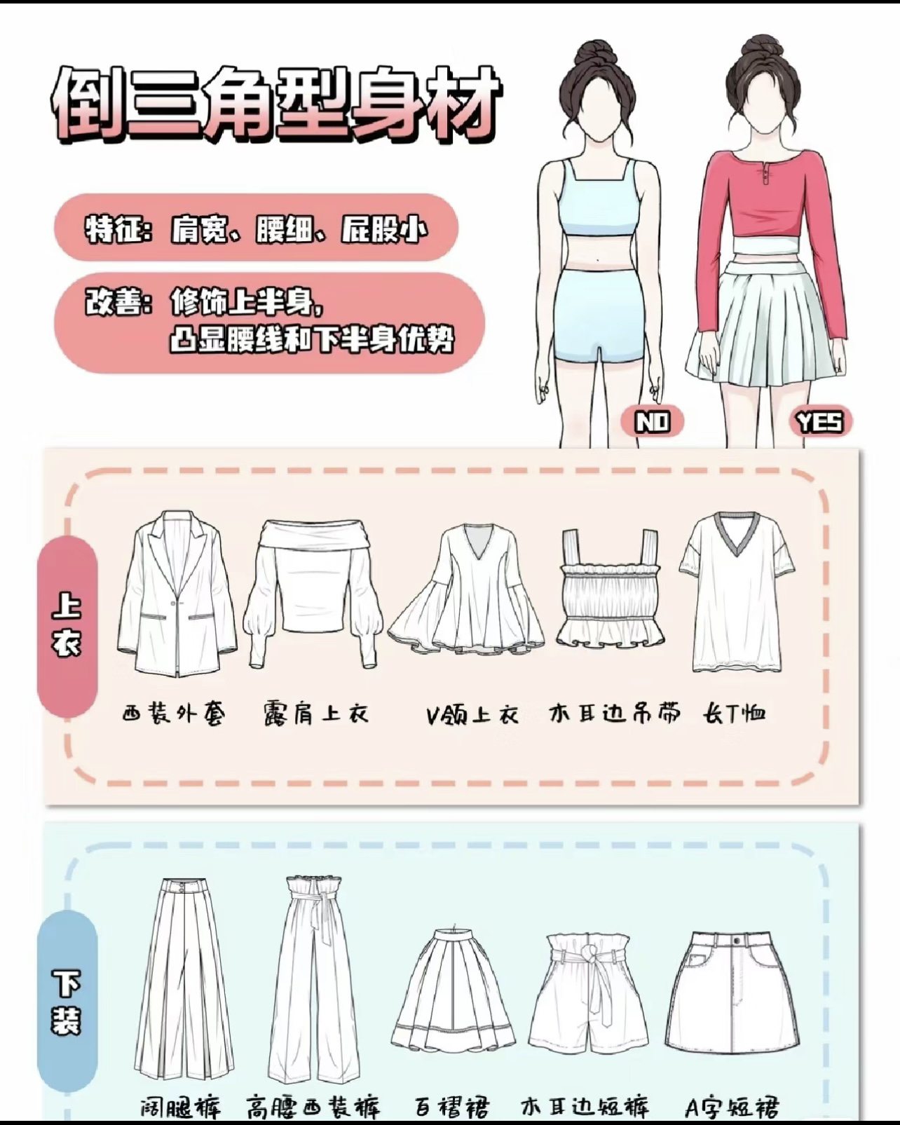 适合上衣:木耳边吊带、V领T恤、V领上衣、露肩上衣、西装外套