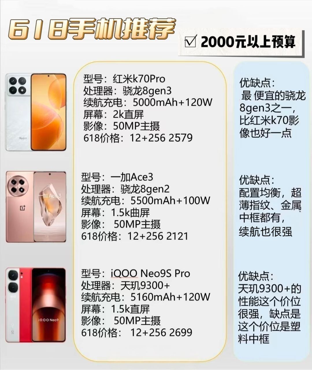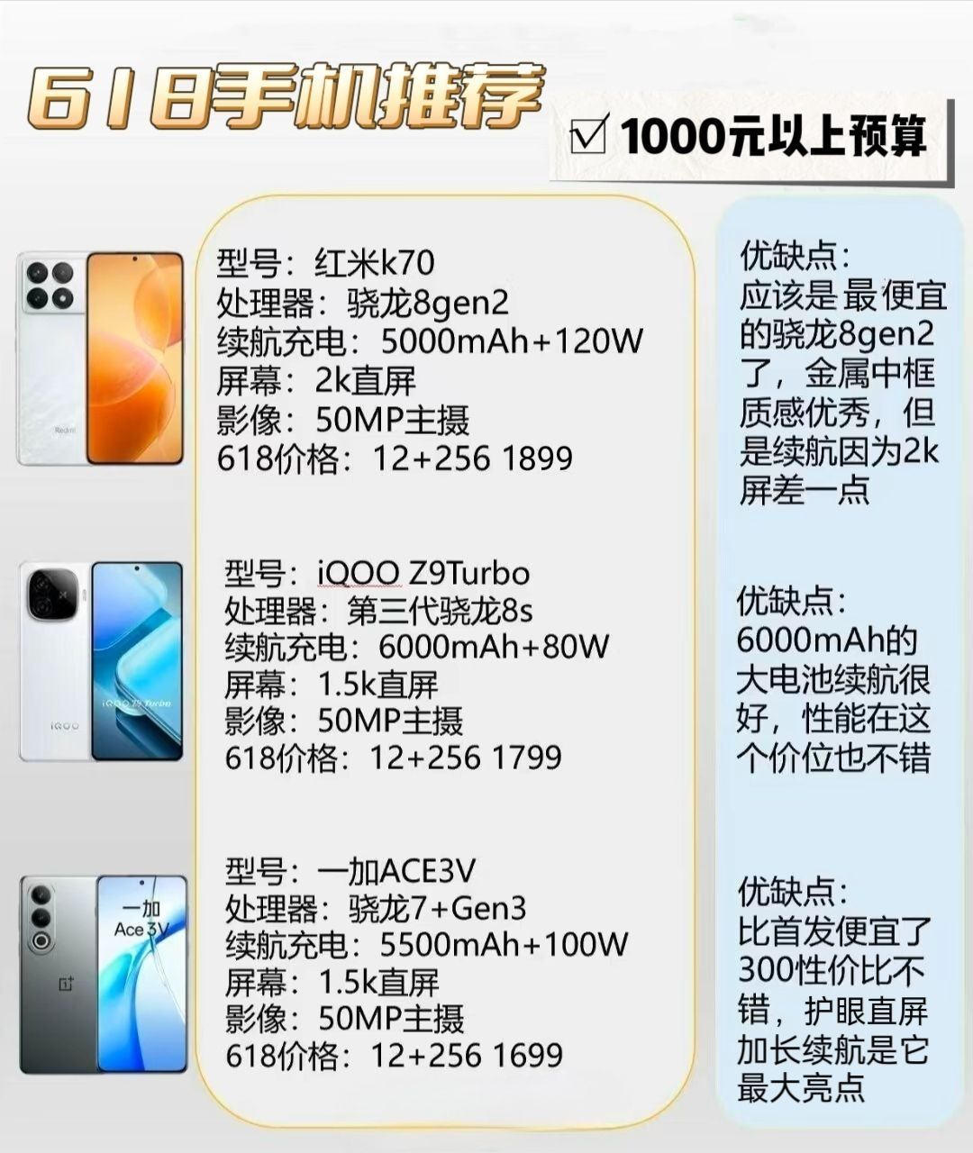买手机等到618真是明智之举,我一向不推荐粉丝冲新机首发,因为大多数手机在定价时都会留一部分空间用来做大促活动。 目前有哪些值得买的手机呢?本文分多个价位详细解读值得买的性价比手机。 1500元预算首推iQOO Z9turbo,集合了护眼直屏、强劲性能和不俗的续航表现,在这个价位很难找出它的不足。 2500元预算推荐一加Ace3,拥有骁龙8Gen2处理器和京东方高水准屏,强劲的续航能力也是领航“中...