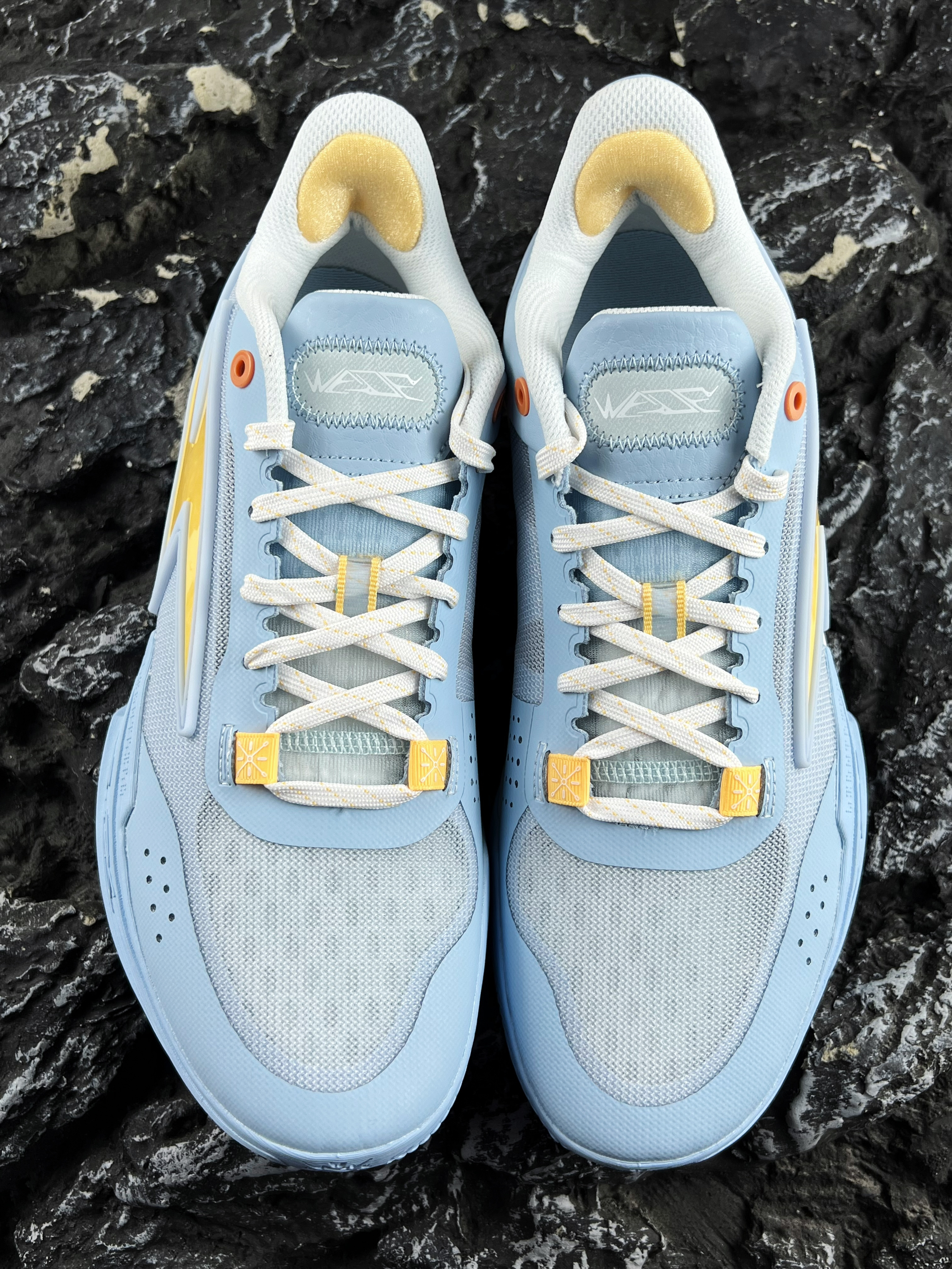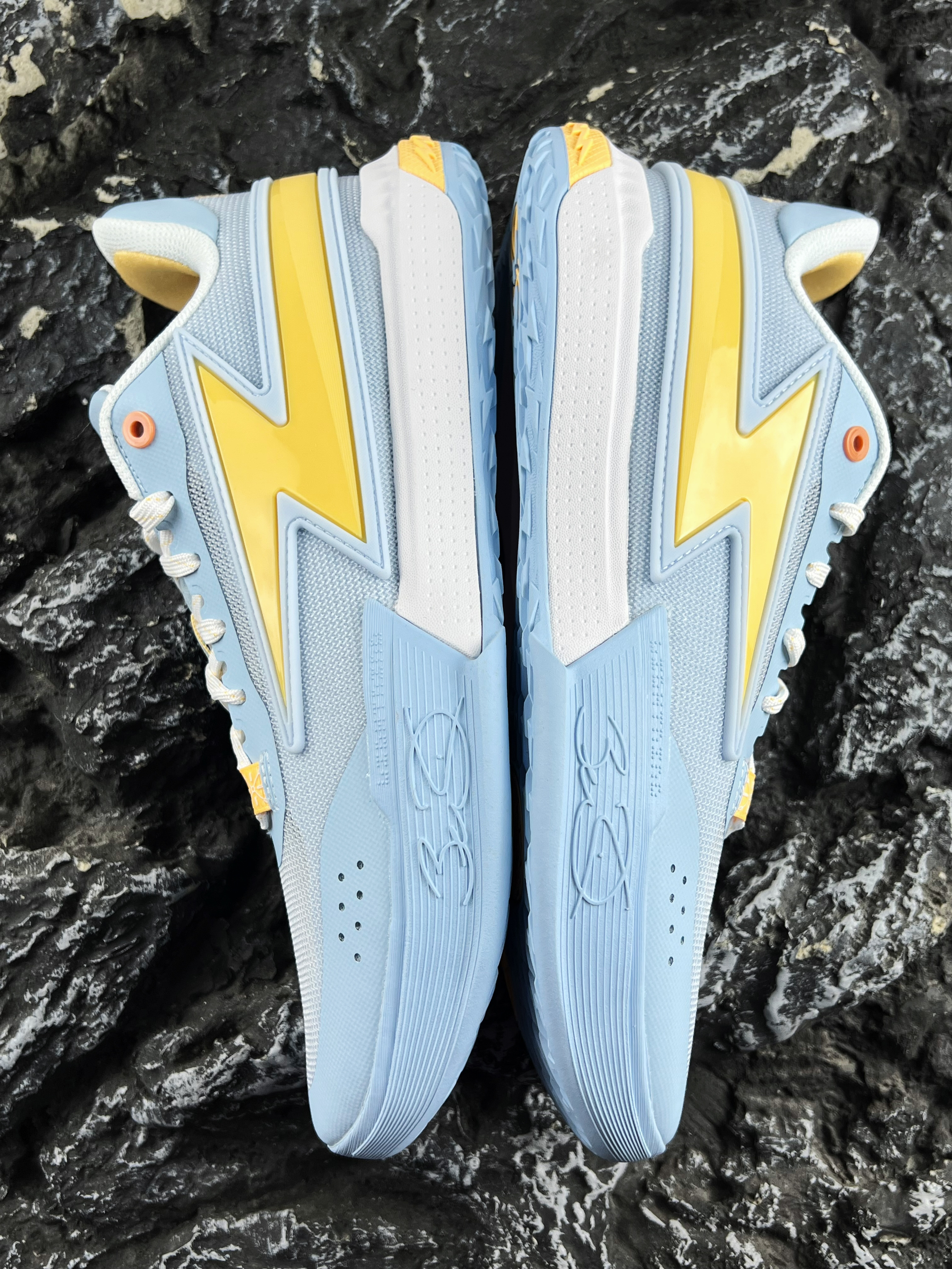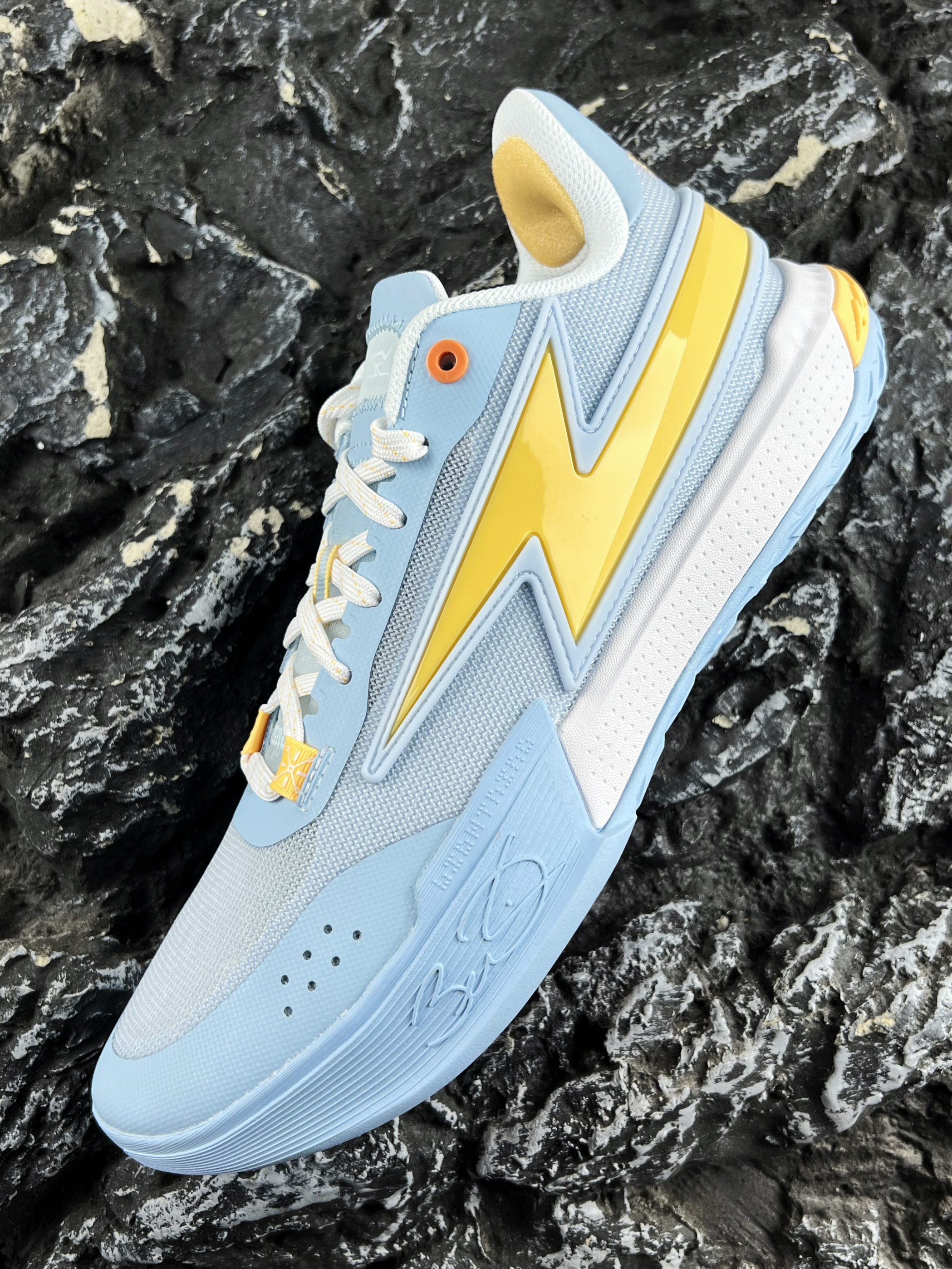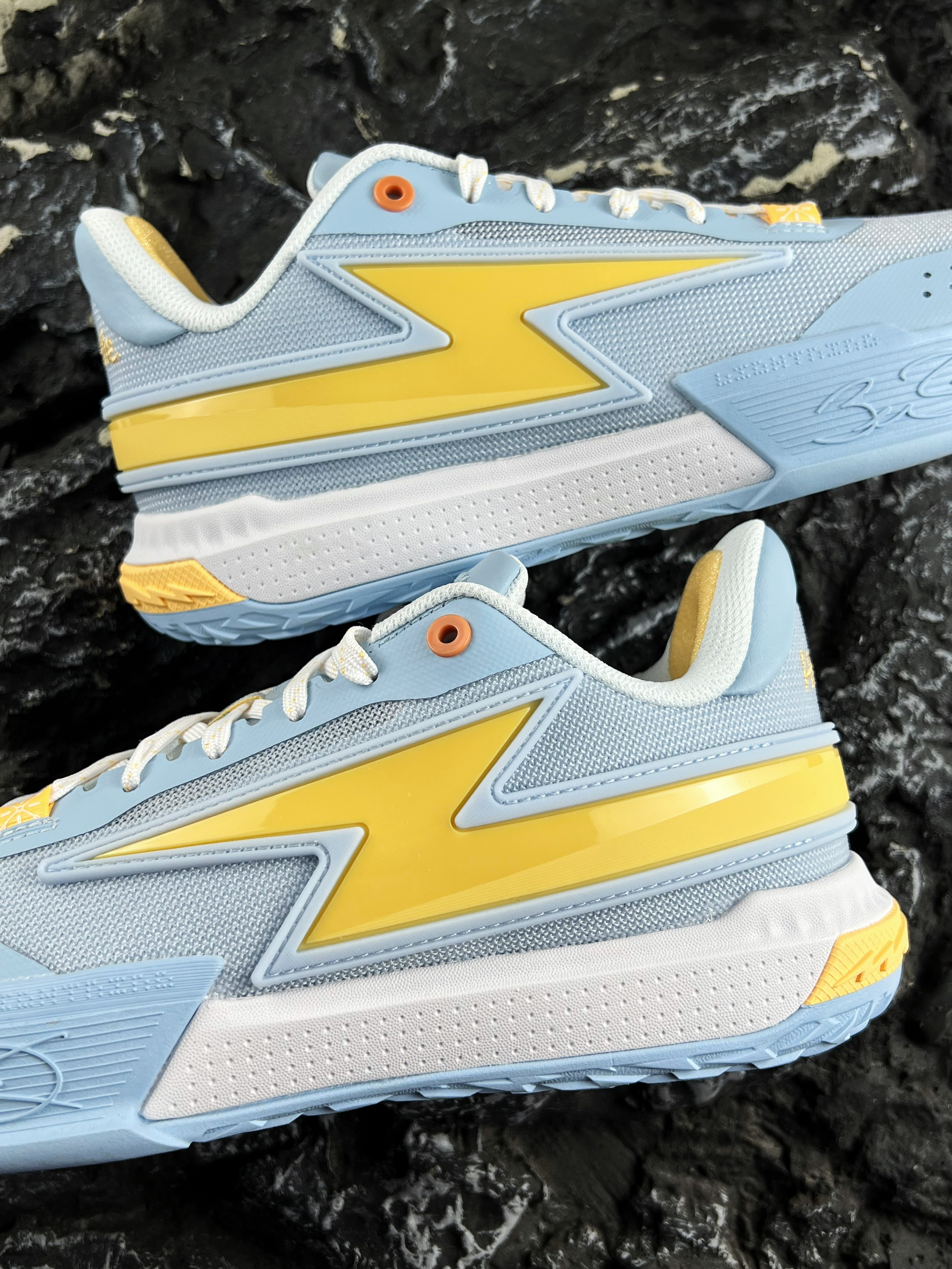 开箱即分享 今天和大家带来一款学生党高颜实战球鞋 就是这款李宁 闪电之子 白蓝色 实物颜值还是蛮酷炫的 鞋子配色比较的干净清爽,夏日的配色 中底脚感很韧弹,回弹缓震不错 外底在耐磨区域也做了橡胶覆盖 耐磨抓地不错,防滑一般 尺码不偏,正码