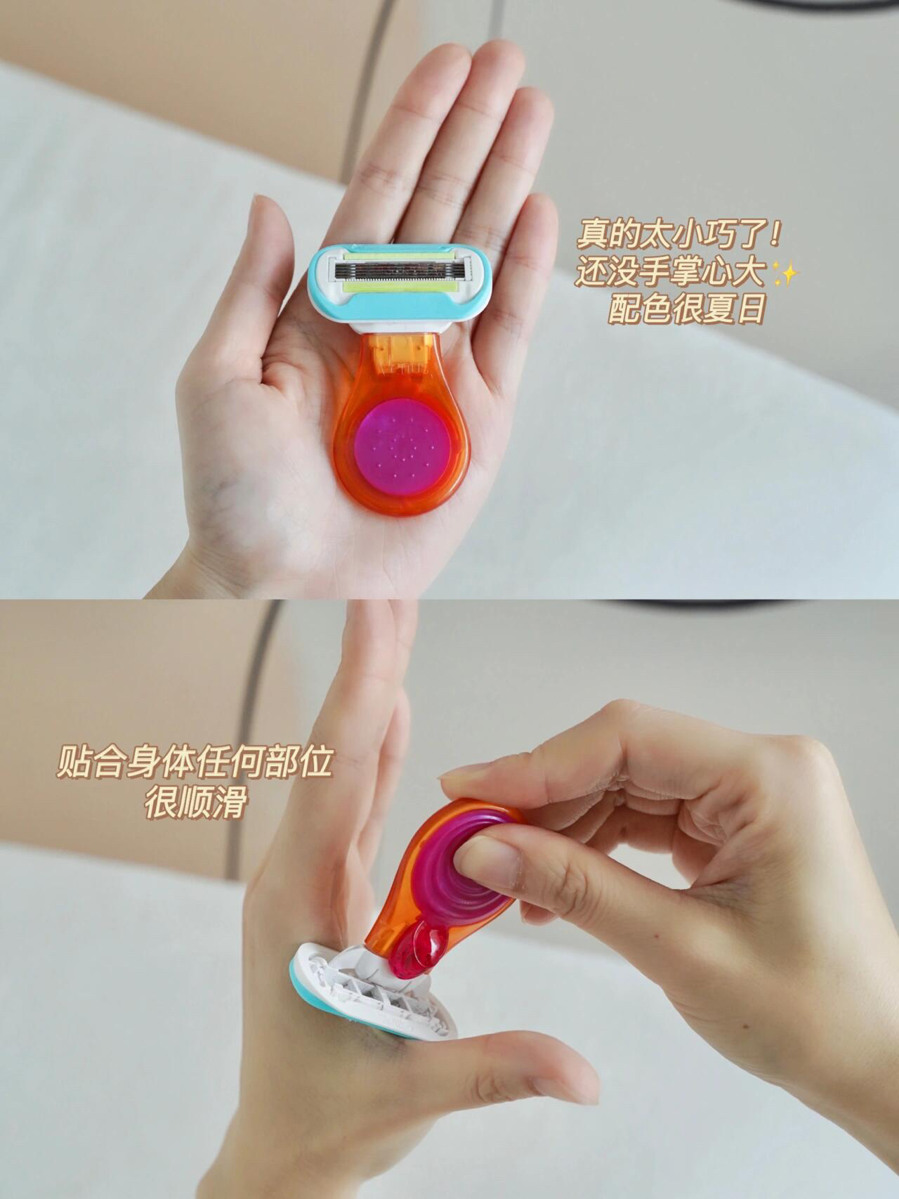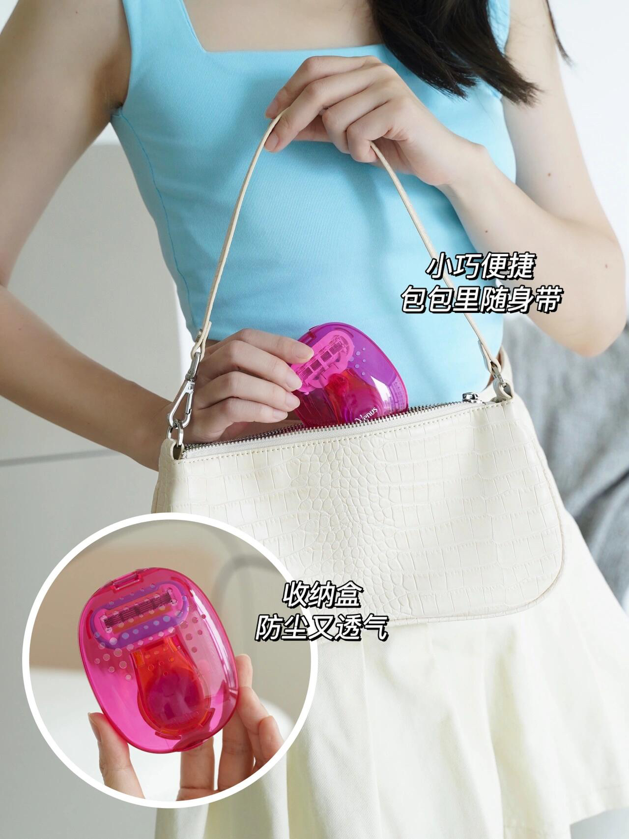 粉与维纳斯蓝的配色真的太好看了吧!简直就是夏日里一抹薄荷冰淇淋~~而且体积小巧可爱,携带很方便,看!它还自带一个防尘透气孔收纳盒,保护脱毛刀不积灰不生锈~经过这次游泳尴尬经历之后,打算再买一个放在包包里出门时带着随时用~