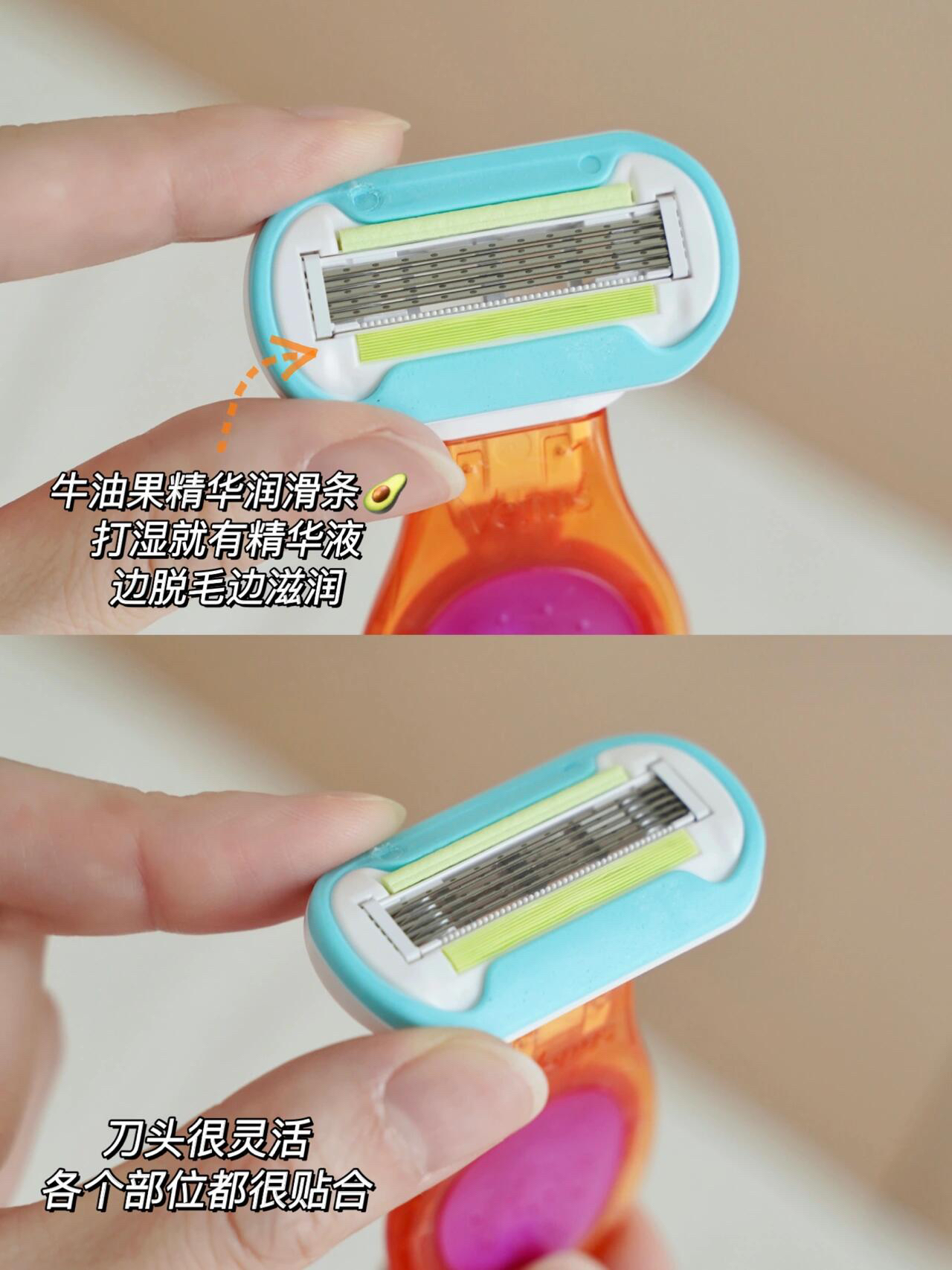 不仅小巧迷你,在它精致的外形下,还有一颗非常温柔的心哦,在刀片两边贴心的加了牛油果精华润滑条和360度环绕润滑头哦,沾湿刀头之后,它就会释放出润滑因子,加上牛油果精华,就算是比基尼娇嫩的部位也不用担心,还有些滋润,舒缓的效果呢~再加上美国皮肤健康安全协会认证的加持,新手小白也大胆的用吧!