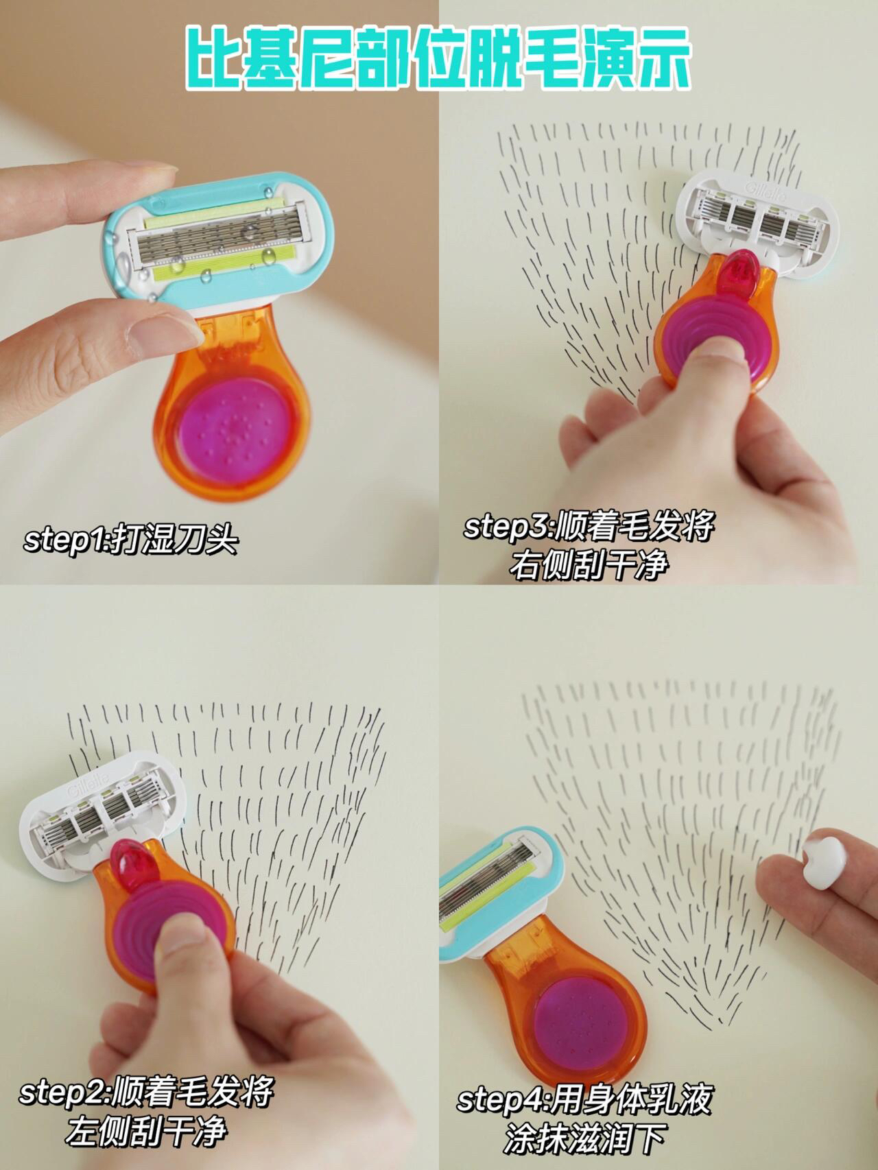 好啦,那姐妹们肯定要问我了,像比基尼这种私处部位到底要怎么脱毛呢?我画了小图给大家演示一下~分左右两侧,顺着毛发生长的方向下刮,慢慢的轻轻的刮,把毛毛清理干净,最后再用无香味的乳液涂抹下就完成了!是不是很简单呢?特别是大夏天,把小森林处理干净了,那个一个舒爽呀!!