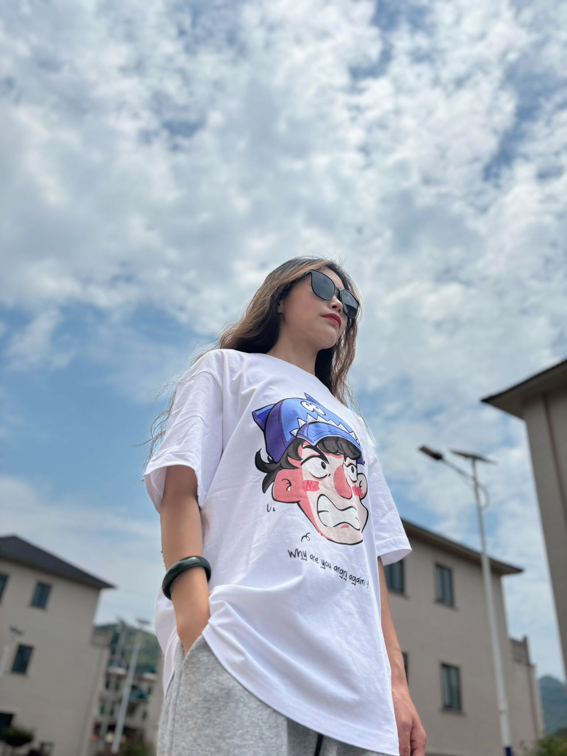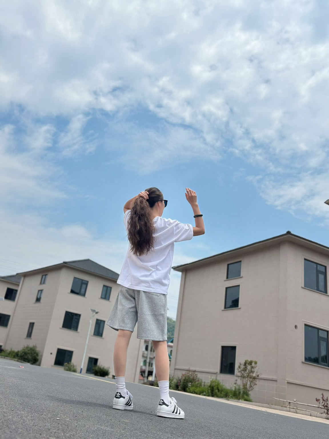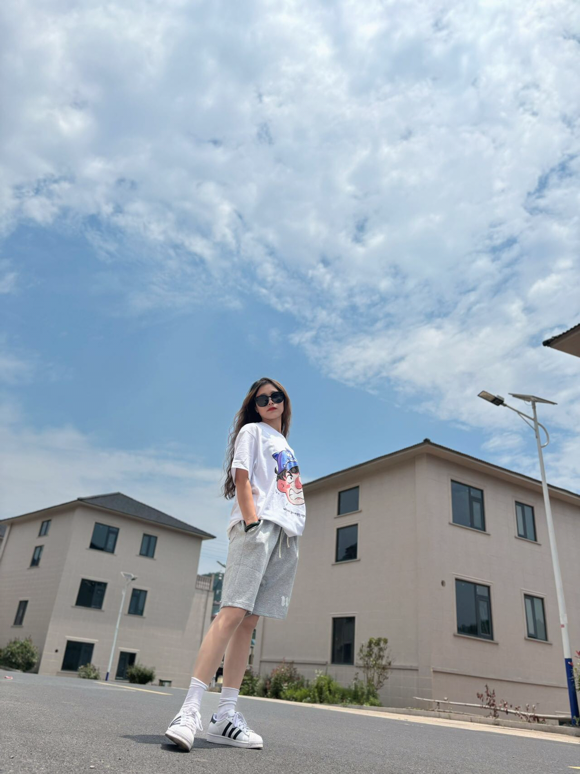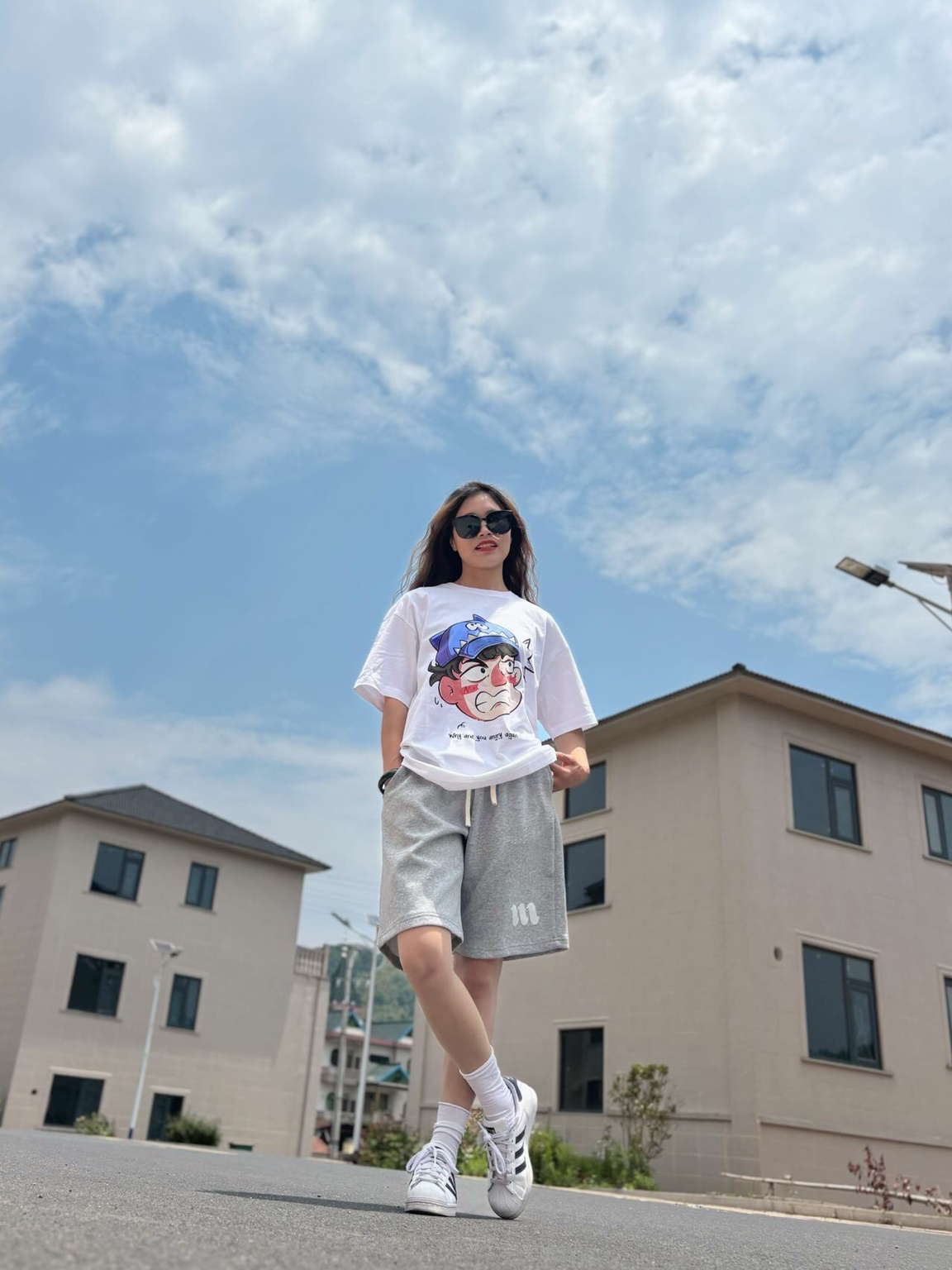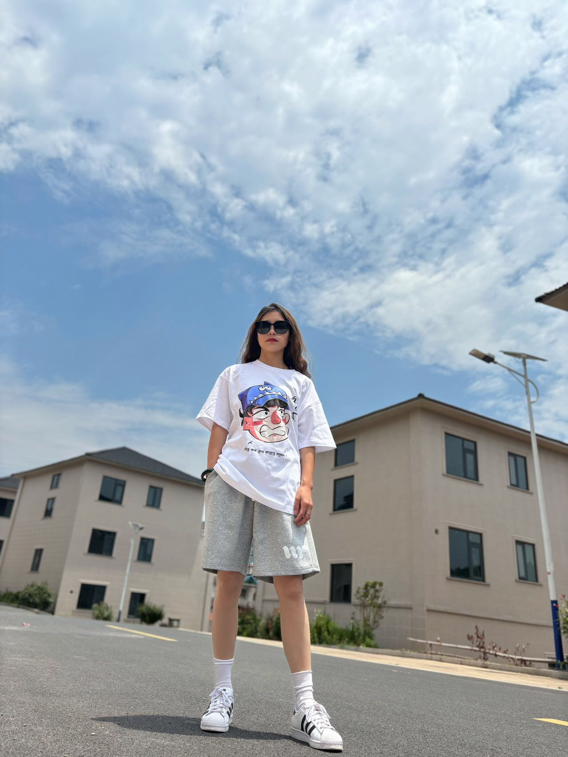 明媚阳光☀️搭配清爽运动套装,怎么看都爱❤️ 👕短袖:白色涂鸦短袖 🩳裤子:灰色运动中裤 ~ 最爱的夏天当然要白色T搭配灰色运动裤~ 是干净清爽的美式小姐姐啦~ 女孩子的我也可以穿的这么酷出门呀 白色短袖是我夏天的搭配单品~ 平常偏爱搭中裤和短裤都蛮好看滴 可爱的涂鸦图案风穿起来可爱又时尚 160的小姐姐👧M码~略美式风喽~