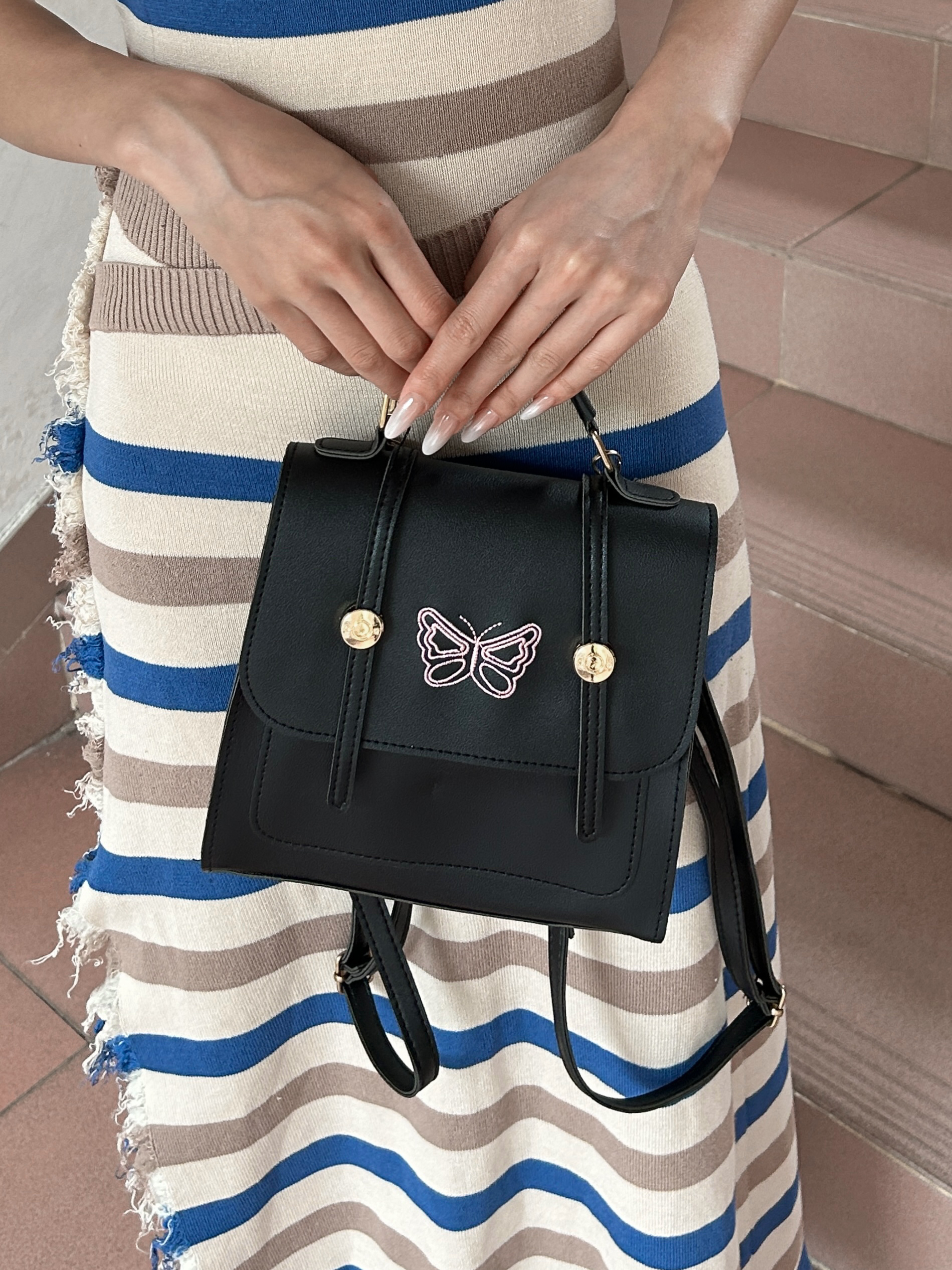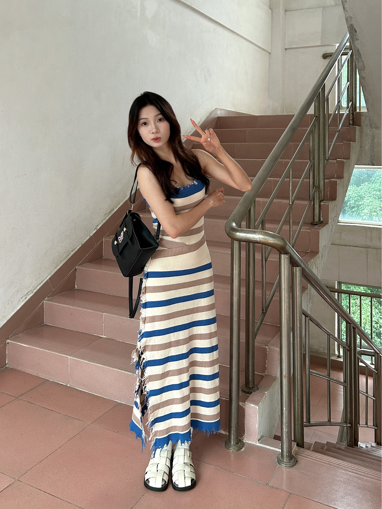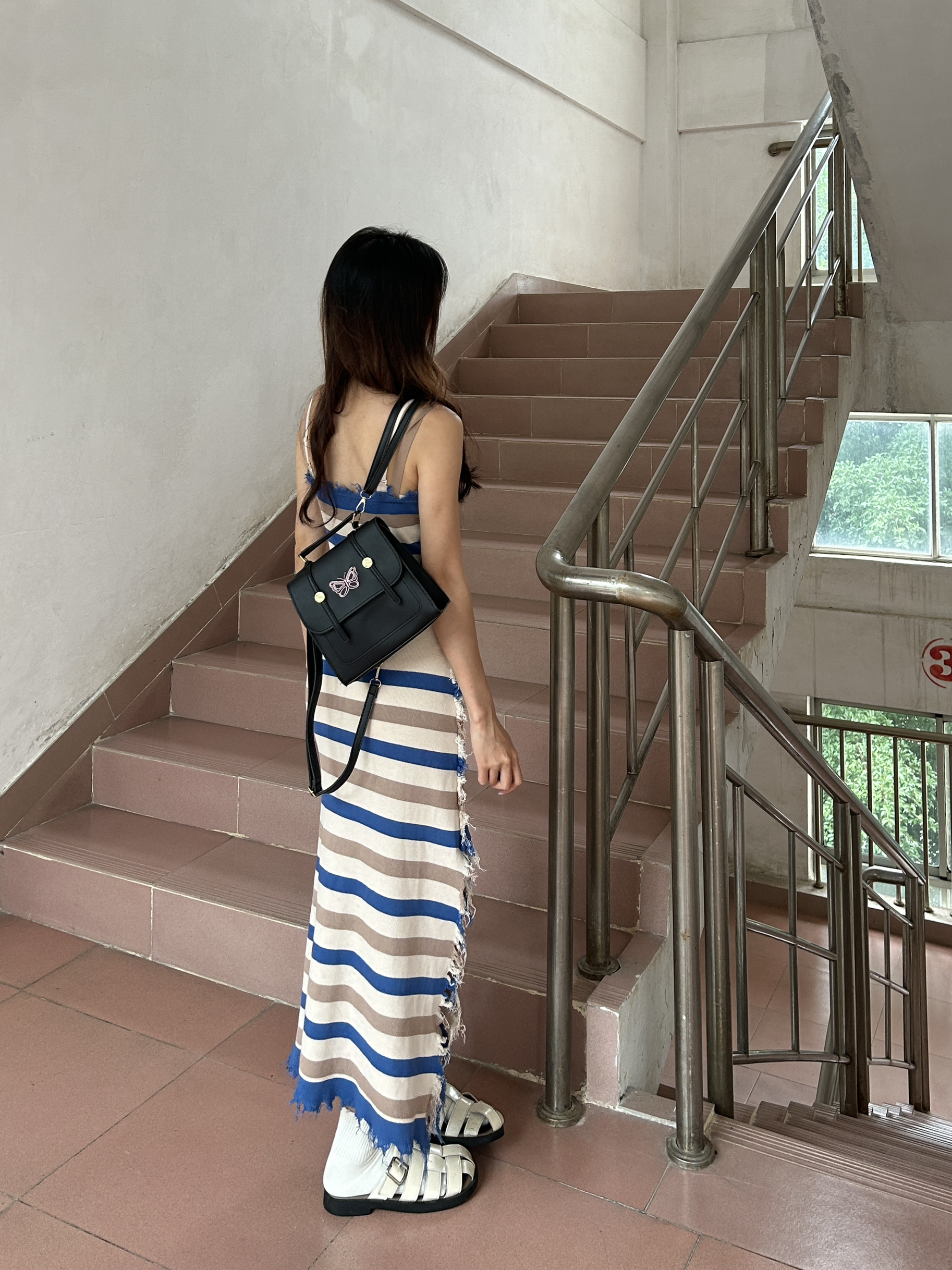 哈咯姐妹们 今天要去参加好朋友的毕业典礼☀️ 160/42今天穿的是一条条纹连衣裙👗 搭配一个黑色🦋蝴蝶双肩包🎒 温柔又时尚 在楼道拍了几张照片好好看😻