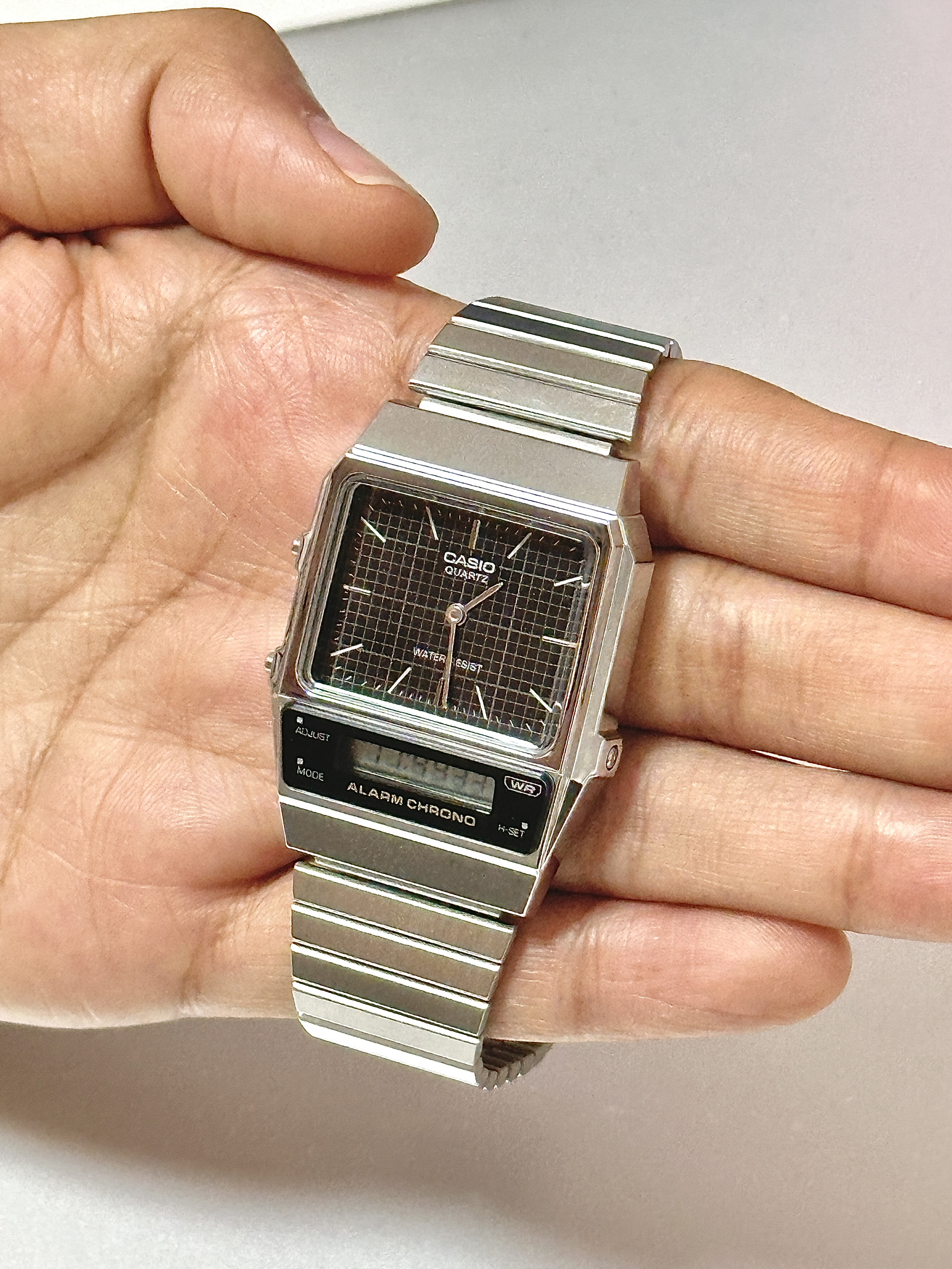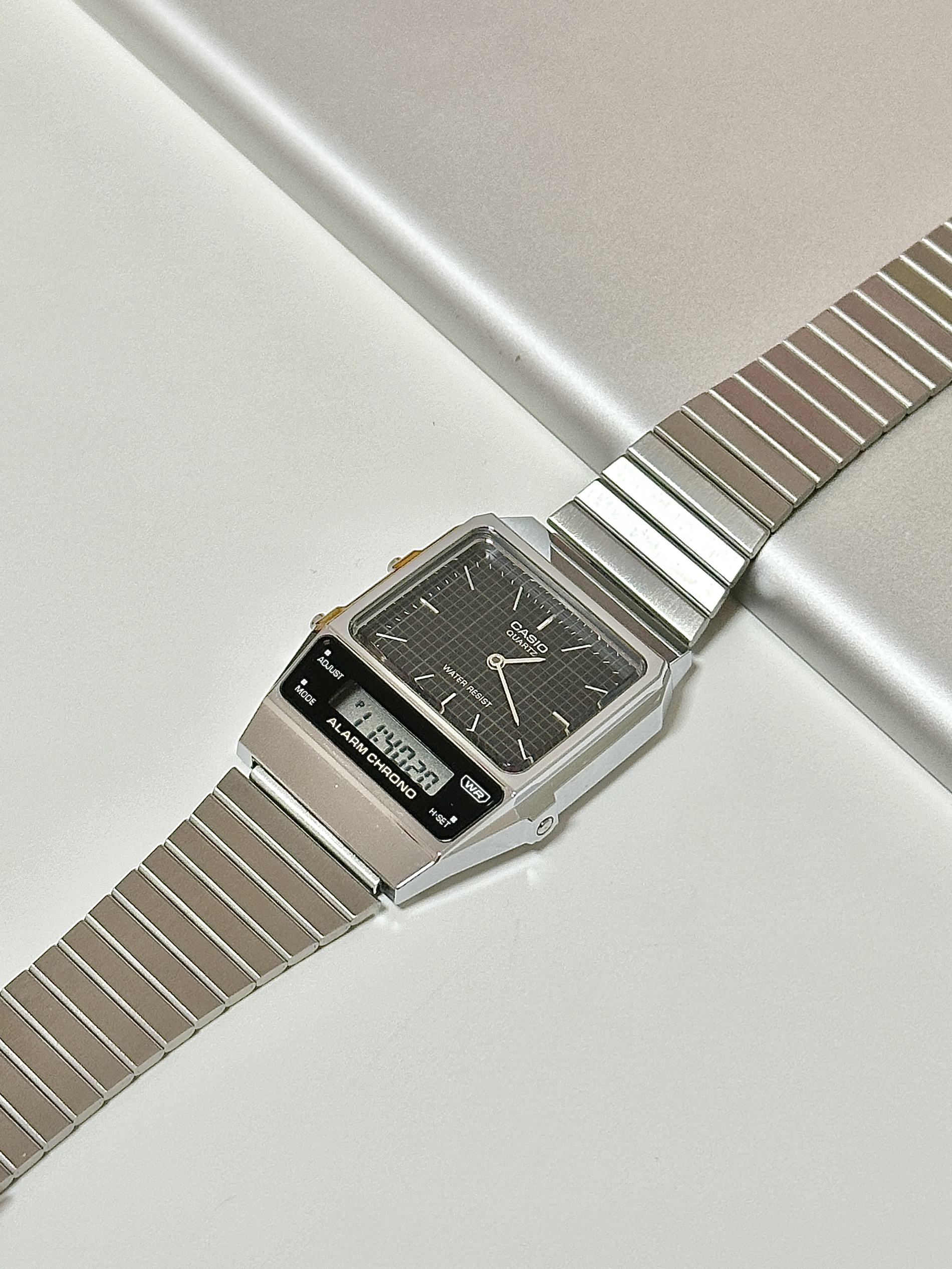 卡西欧的小银块系列 还是延续了轻盈小巧的风格 银色表盘+表带商务感十足 上手也是嘎嘎帅 手表hin轻 夏天长时间戴不累手 双显表盘 上面是指针显示 下面是数字显示 表盘不大 男女都可以带 适合早八人和学生党 是男孩子收到会敲开心的礼物呀