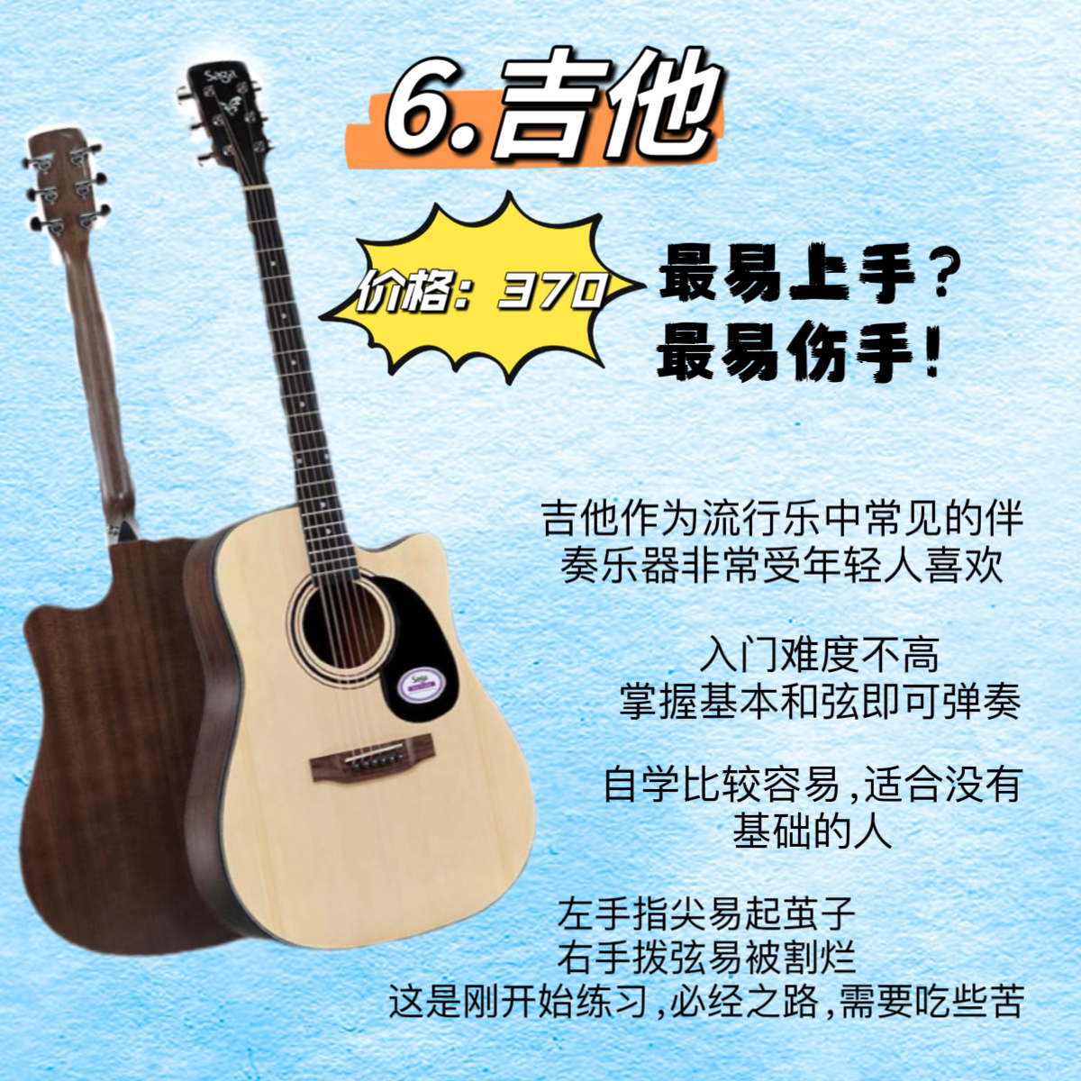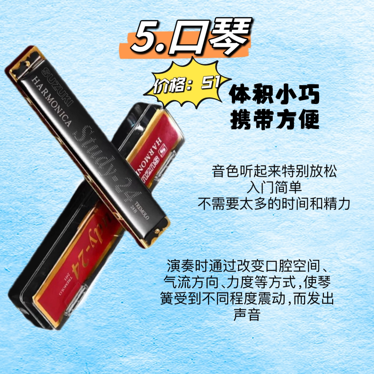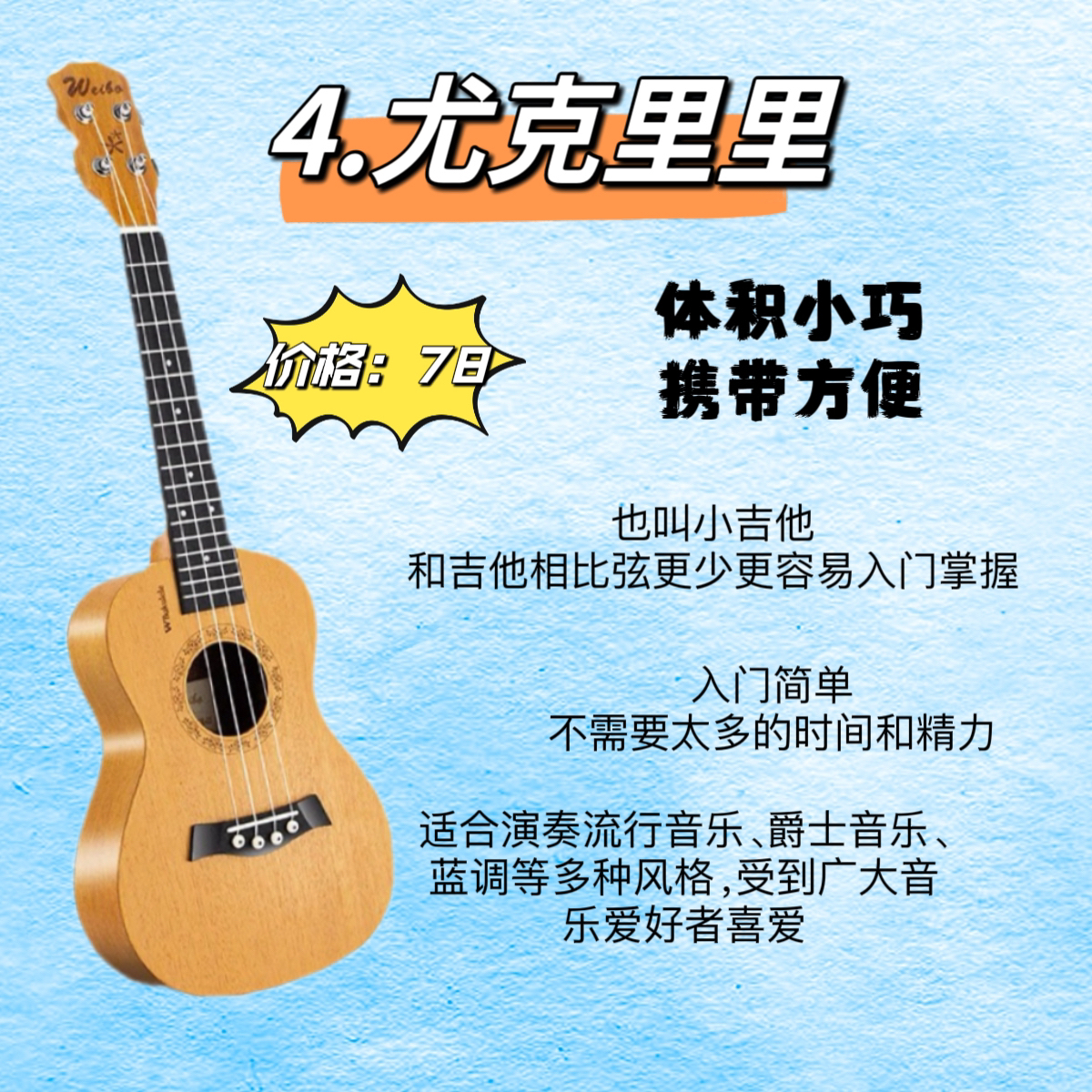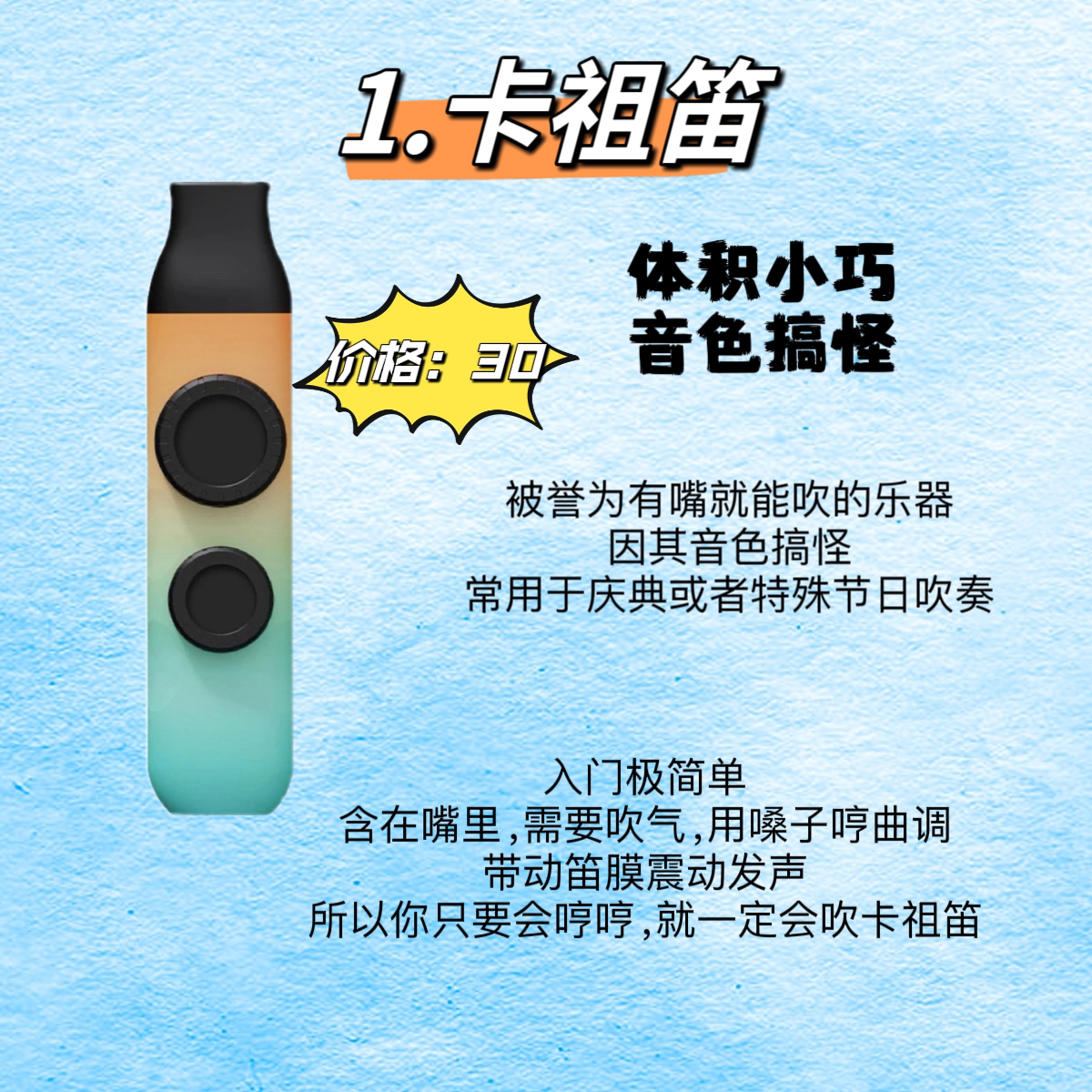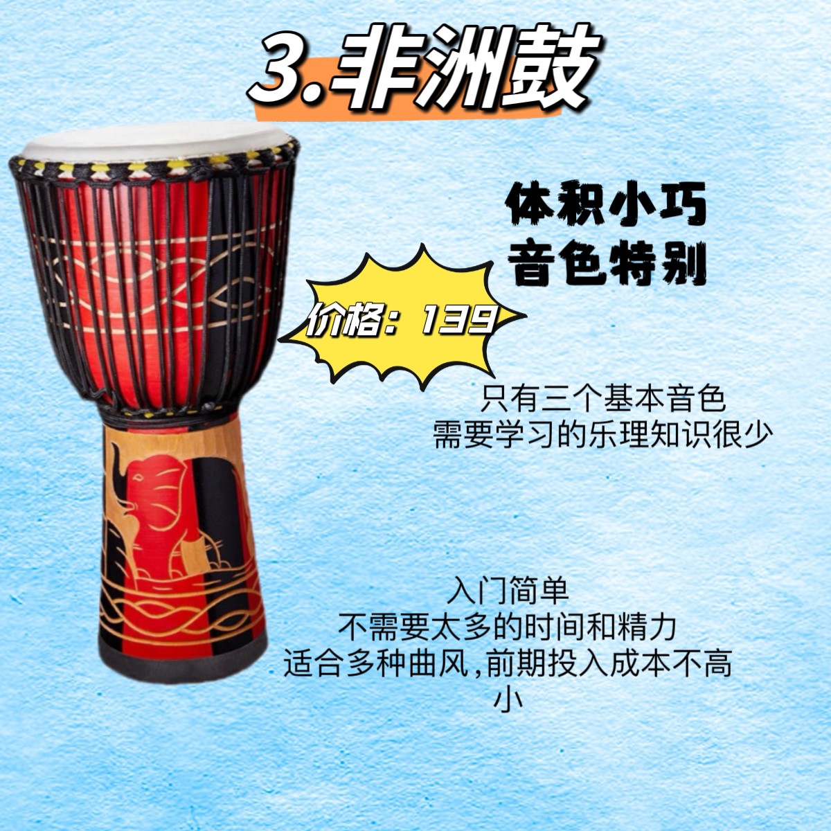 ✅1.卡祖笛 ✅2.拇指琴 ✅3.非洲鼓 ✅4.尤克里里 ✅5.口琴 ✅6.吉他 👊卡祖笛 入门极简单,含在嘴里,需要吹气,用嗓子哼曲调带动笛膜震动发声,所以你只要会哼哼,就一定会吹卡祖笛。 👊拇指琴 入门极简单,按数字弹,不需要乐理知识也能上手,小巧便携,音域宽广,可以弹奏出丰富的旋律。 👊非洲鼓 入门简单,不需要太多的时间和精力,适合多种曲风,前期投入成本不高。 👊尤克里里 入门简单,...