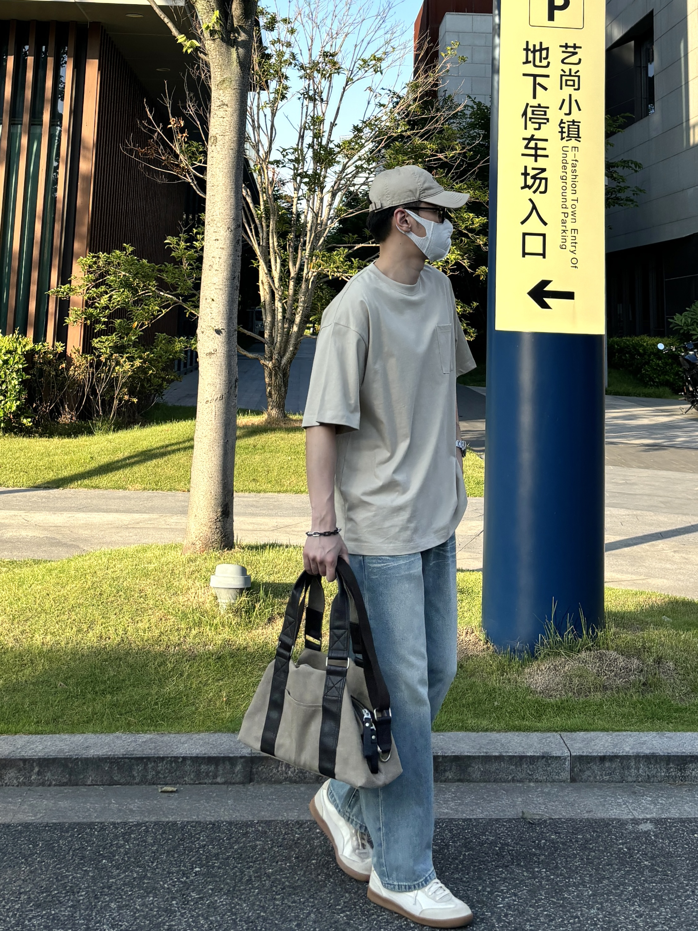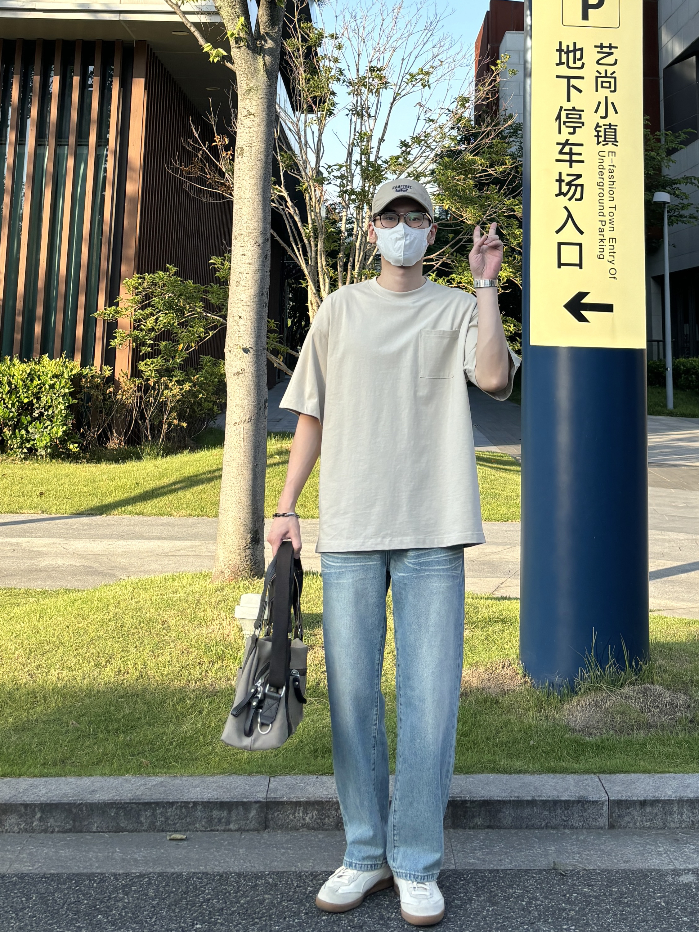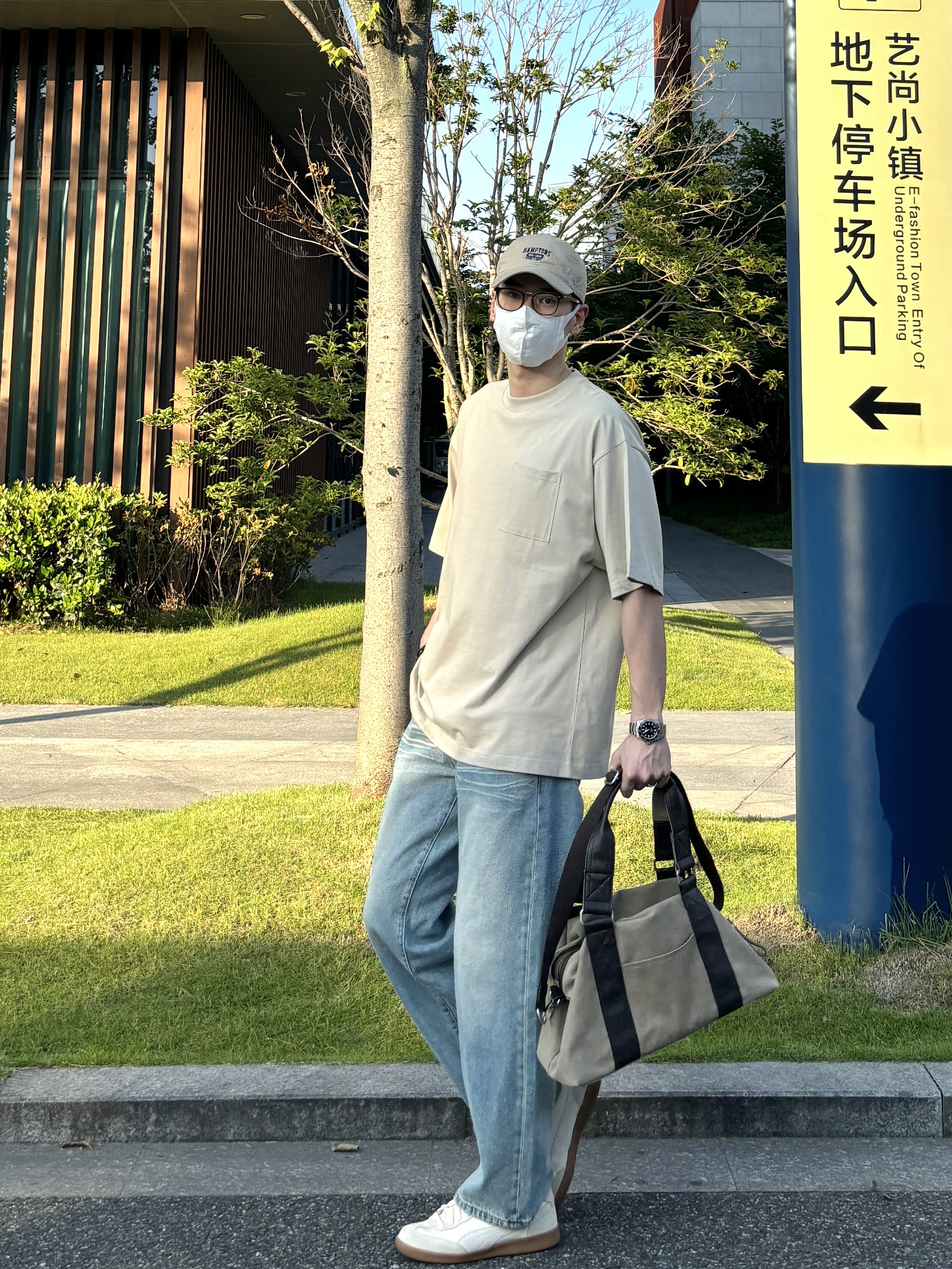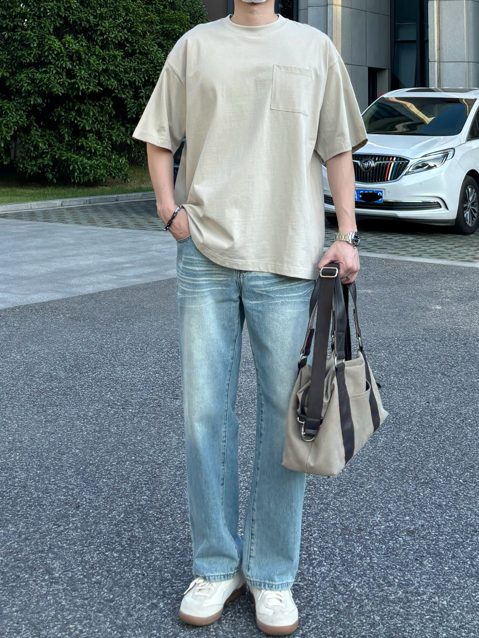 今天这套上衣穿了一件卡其色重磅宽松大口袋圆领T恤 ⬇️ 裤子选择简约大方的水洗直筒猫须纹牛仔裤 ⬇️ 鞋子上脚清爽干净的米白色puma德训鞋 ⬇️ 最后拿上大容量帆布拼接手提包 - 今日搭配 衣服裤子都来自:NICE LILI 鞋子:puma liga