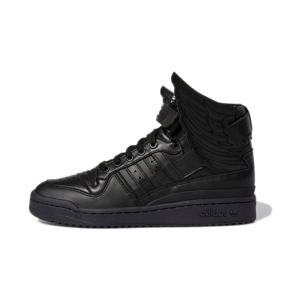 整双鞋在 Forum Hi 鞋型基础上,采用一袭黑武士装扮,带来极为低调百搭的视觉效果。鞋面的反光效果彰显出皮革的高品质。 鞋帮部分承袭 Jeremy Scott 标志性翅膀设计,不过在纯黑造型下少了几分夸张,日常上脚也丝毫没有驾驭难度。Forum Hi 的鞋帮绑带也 一应俱全,鞋舌点缀白色三叶草Log0,完善整双鞋的细节刻画。
