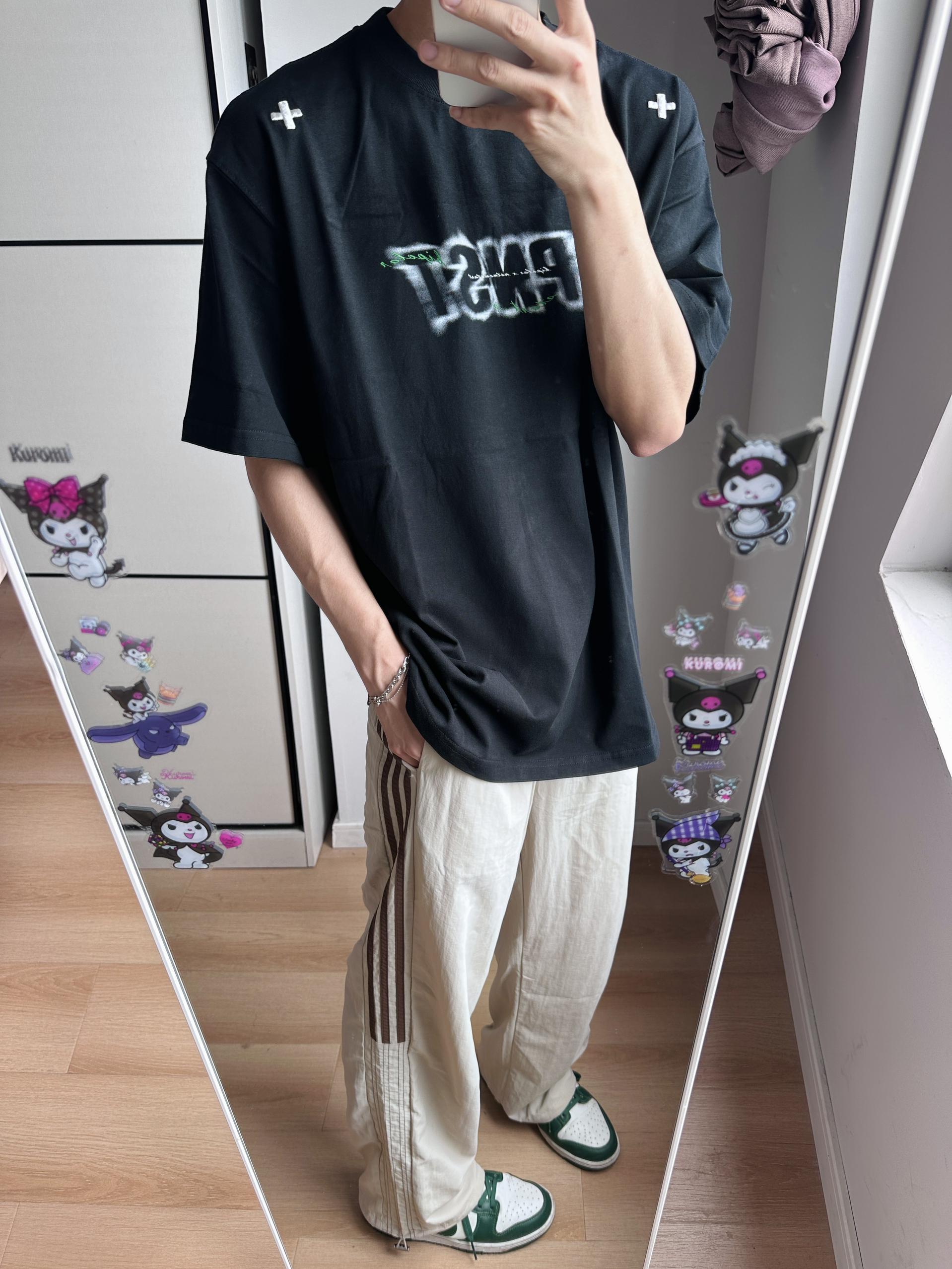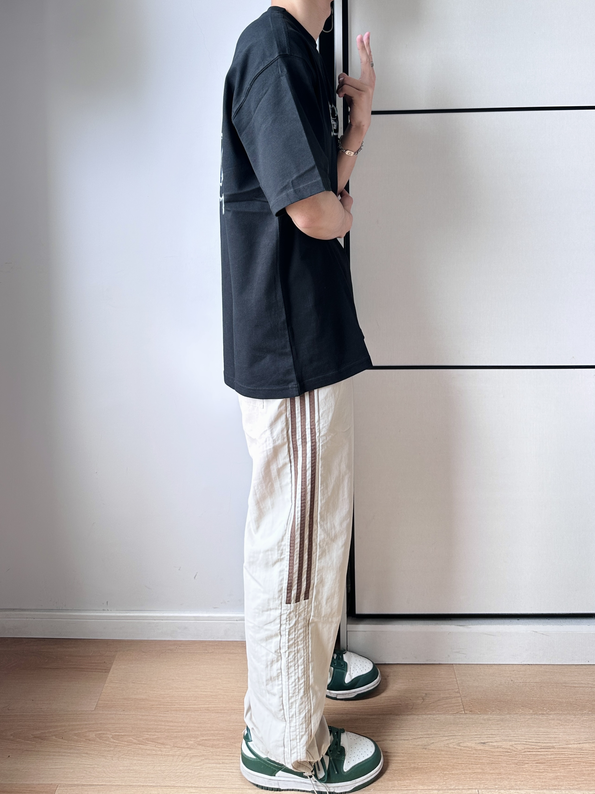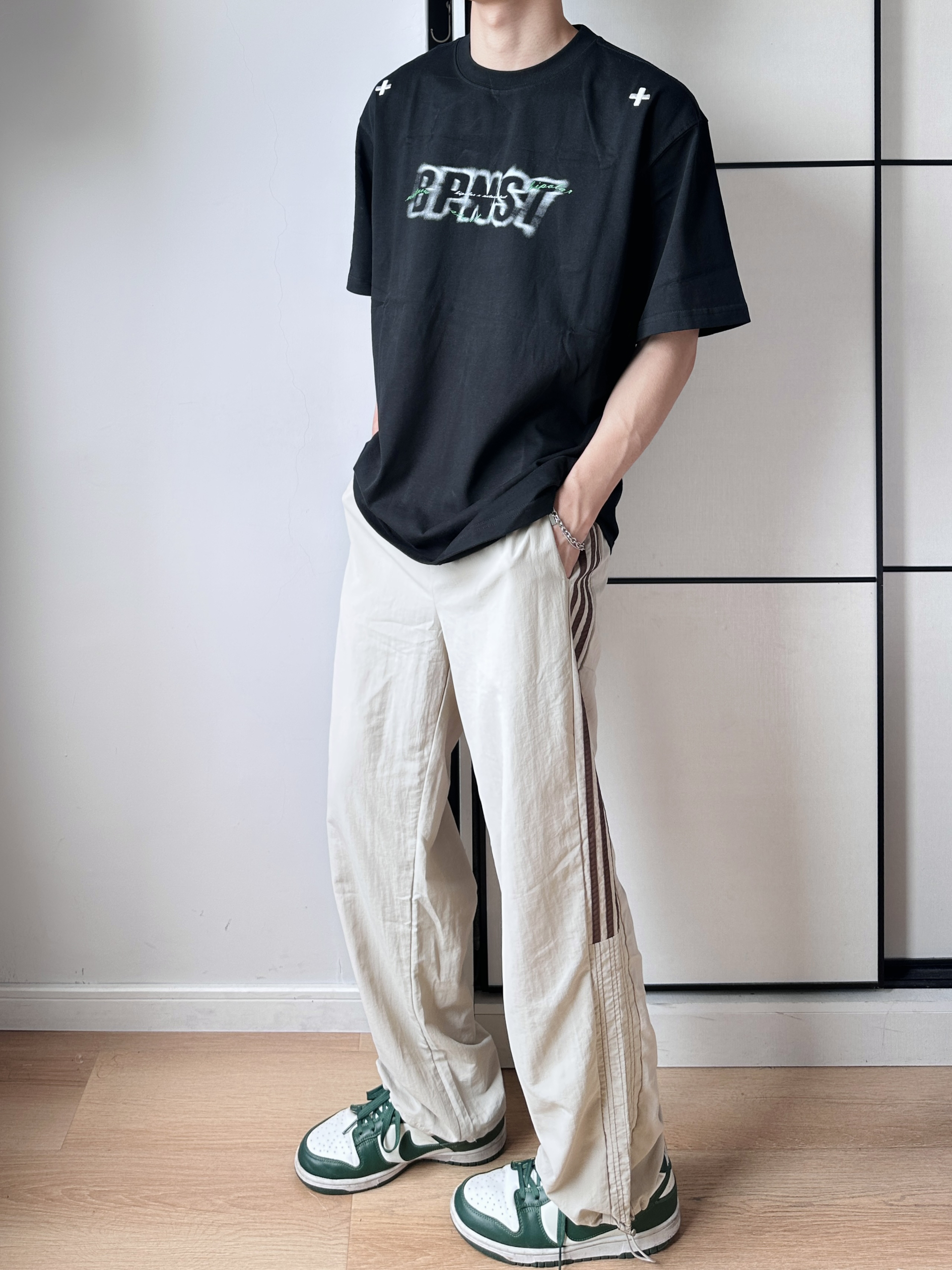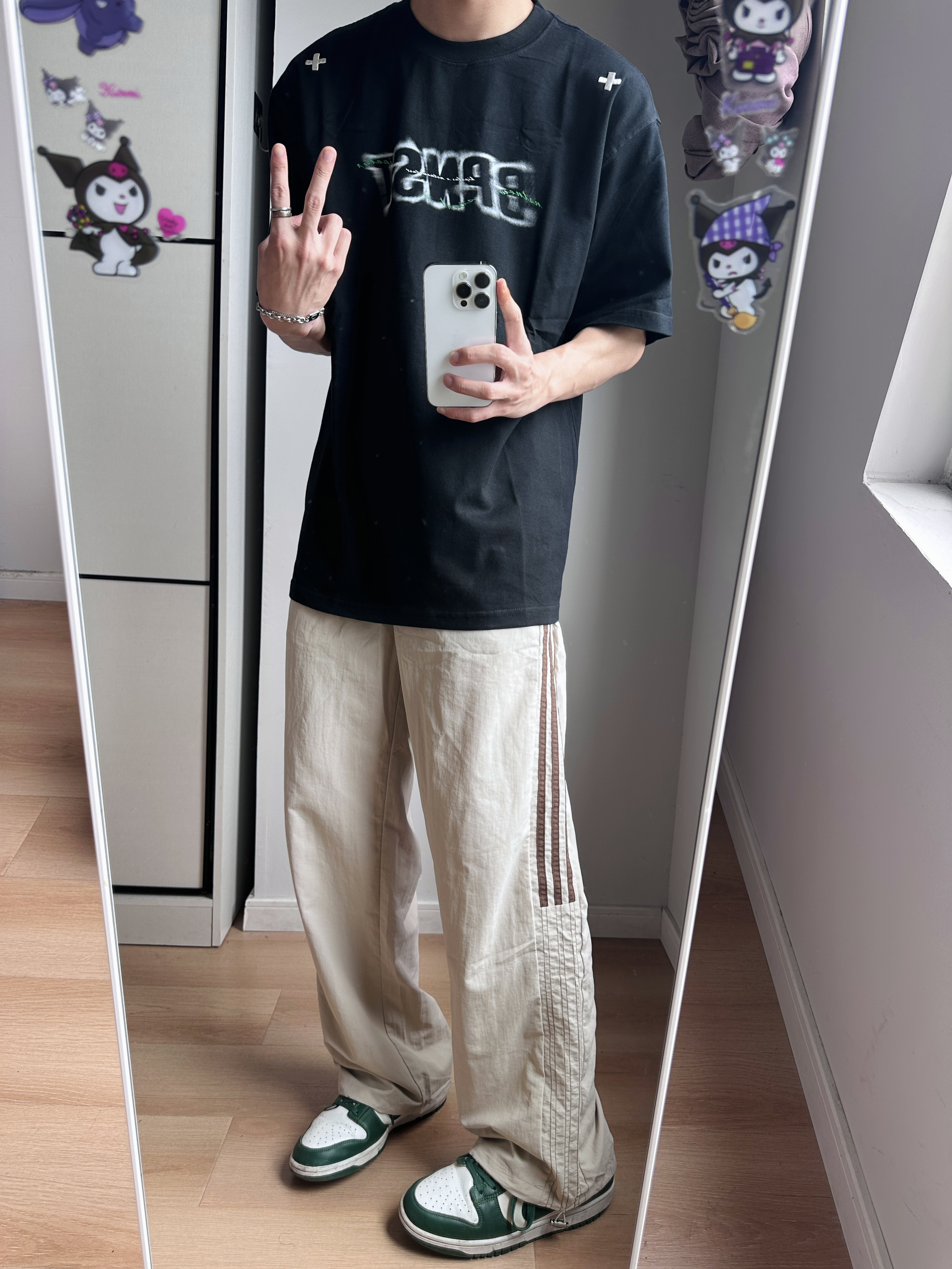 美式感黑T搭配伞兵条纹休闲裤 轻松穿出休闲氛围感 毫无疑问已经是我户外出行的搭配之一 黑T是“BIPOLAR”和“NSTNEW START”联名款 上身穿着柔软且透气 版型修身穿起来显瘦 裤子穿的灰色的 与短袖做到层次感 超薄冰丝材质 透气性涼爽度在夏天很赞的 侧边双色拼接条纹、可调节束脚口 喜欢的设计、可以实现多种不一样的穿法 再来一双白绿色dunk鞋 做到黑灰绿搭配 - 有户外出行穿搭选择困难...