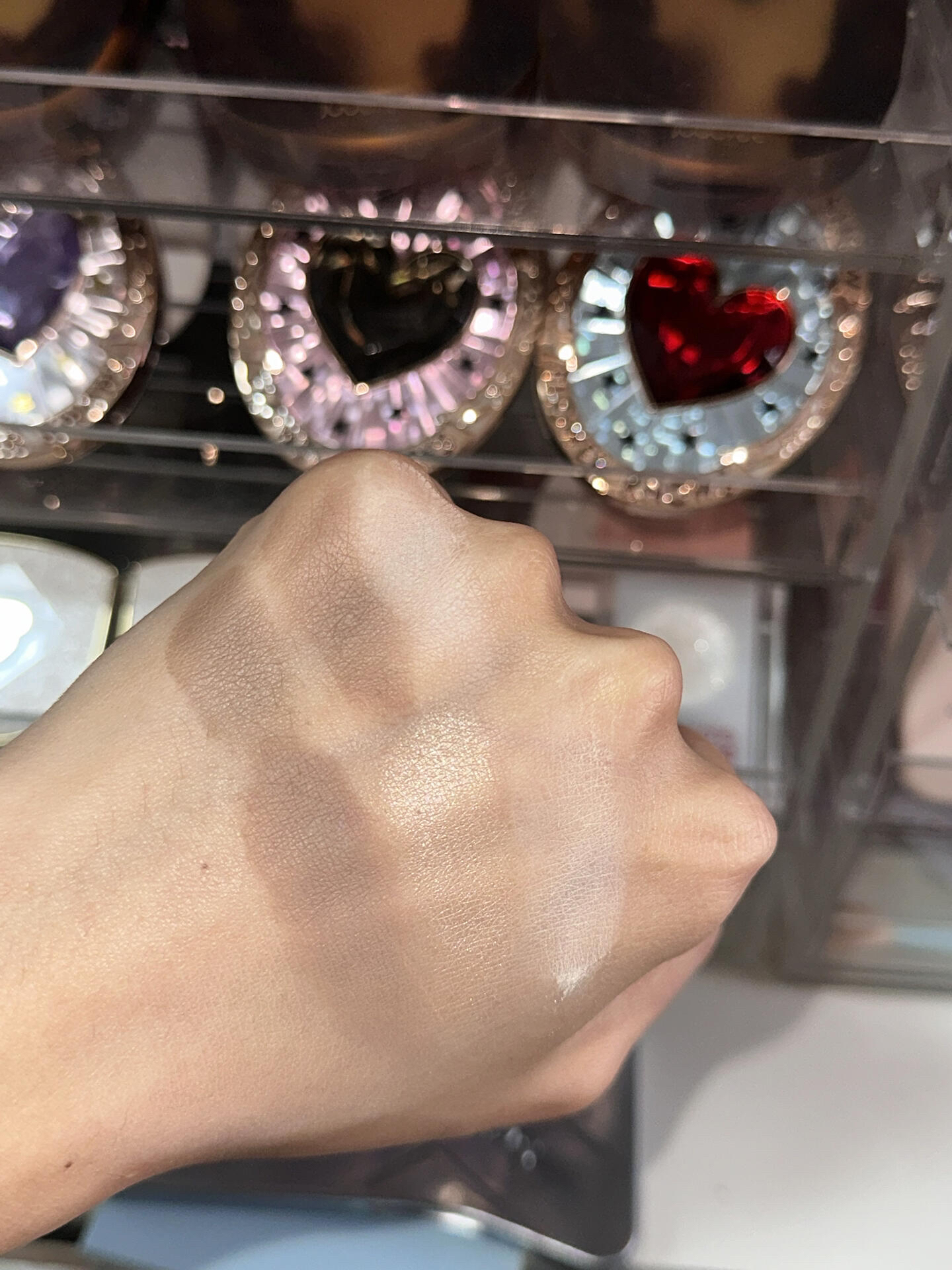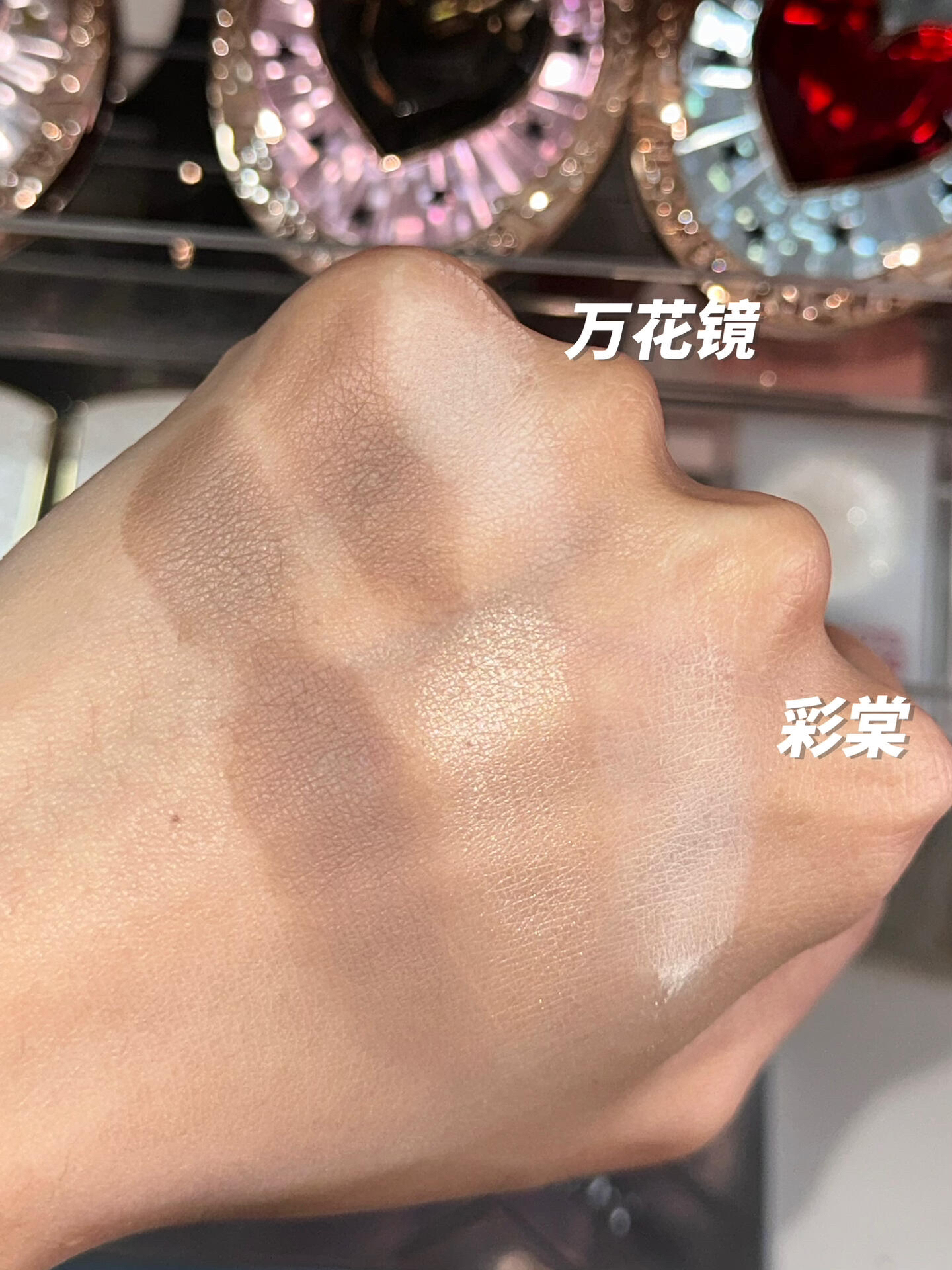 (不知道为什么实况发出来这么糊补充一张原图照片形式的) 自打我一看见万花镜这个新品就猛猛想给大家发个和彩棠修容盘的对比 可以看出来两盘都是被我多次试用才给大家出的这个笔记 两盘都是主打的冷棕色,但彩棠多一块珠光提亮,万花镜多一块色系的修容色。(手上试色上面三个是万花镜,下面三个是彩棠) − 彩棠:妆感更自然,修容色调的是偏灰调的(直到我跟万花镜的冷棕色对比才觉得它有点偏暖调)。哑光提亮色是米白...