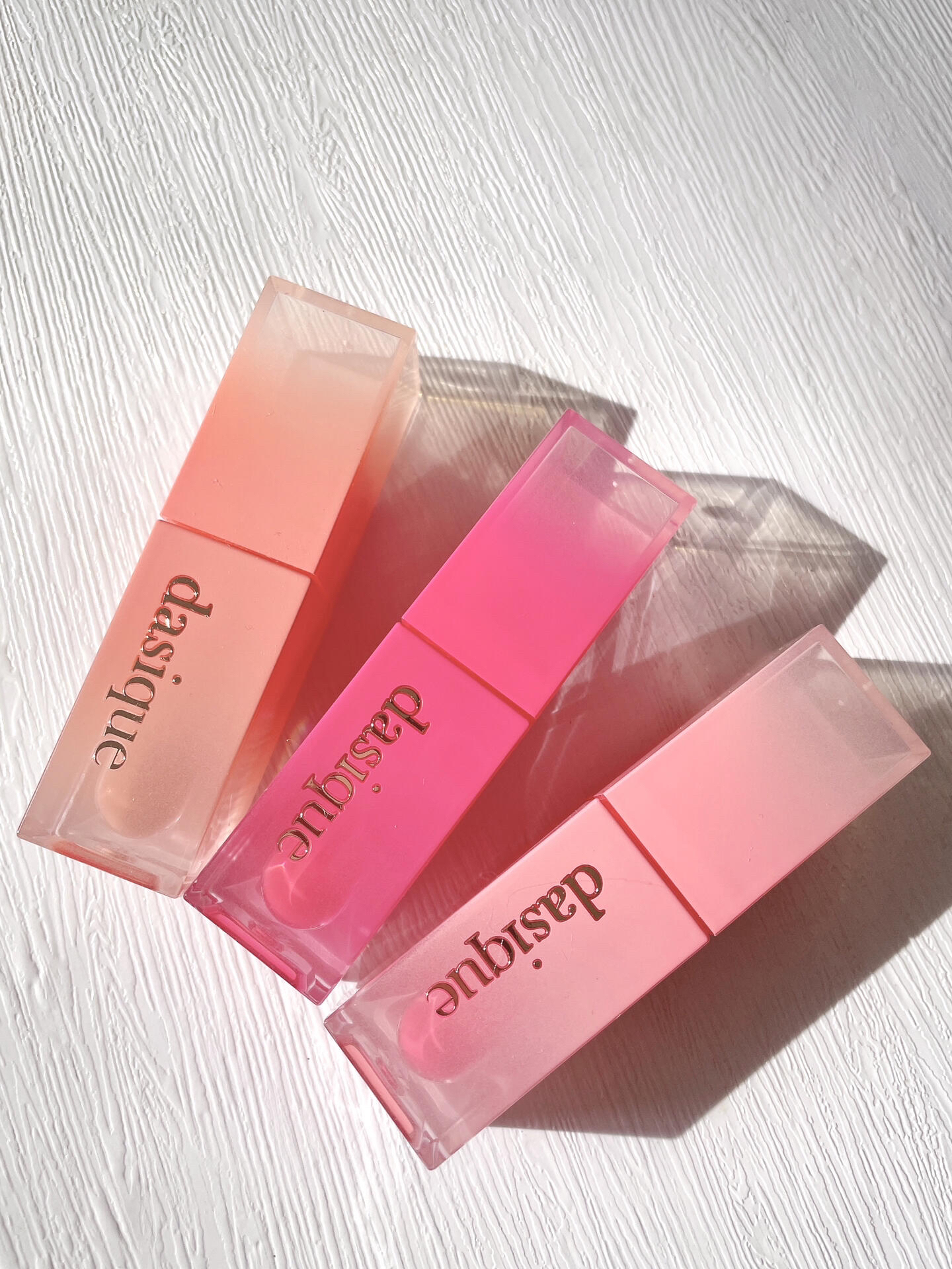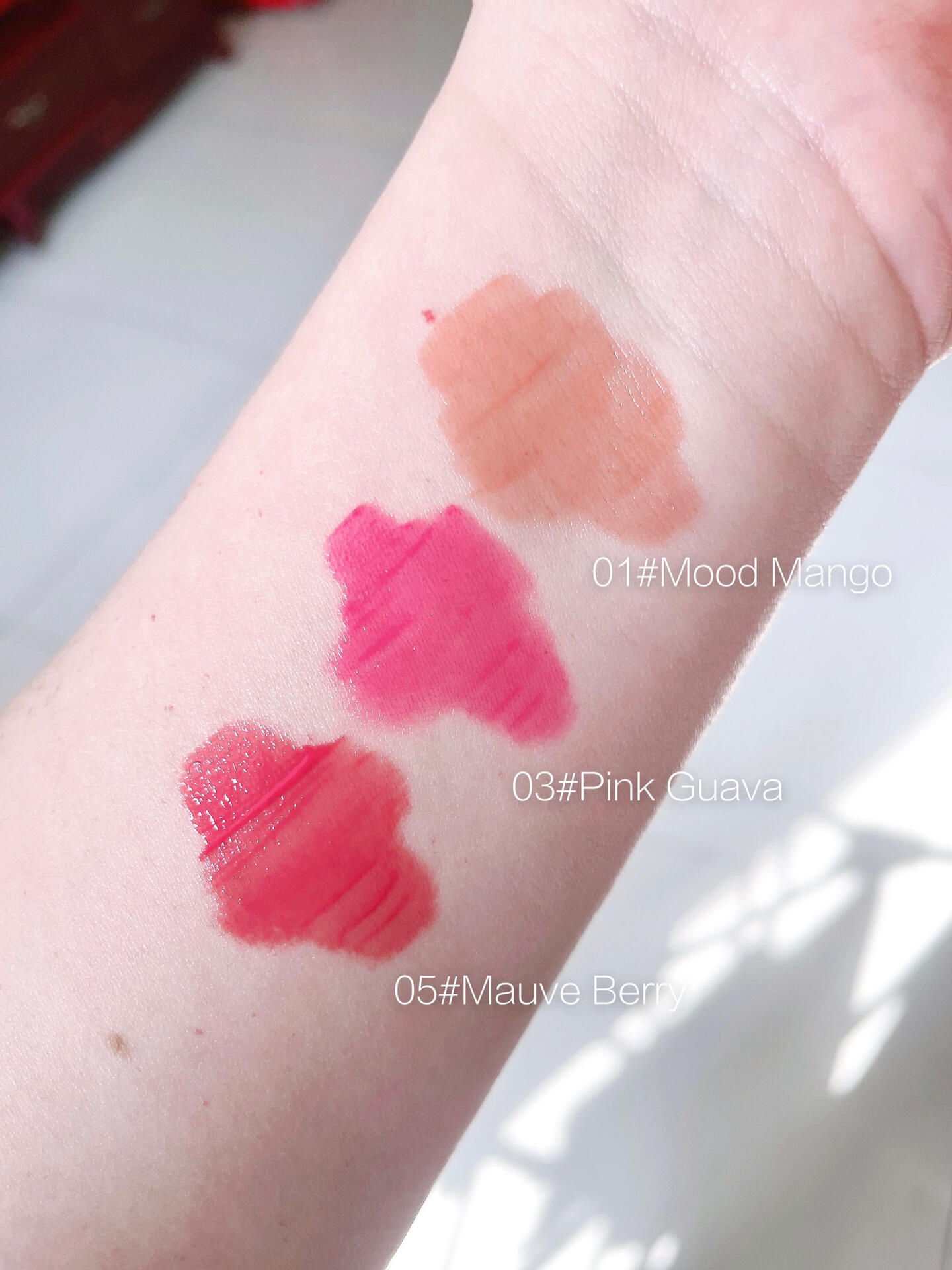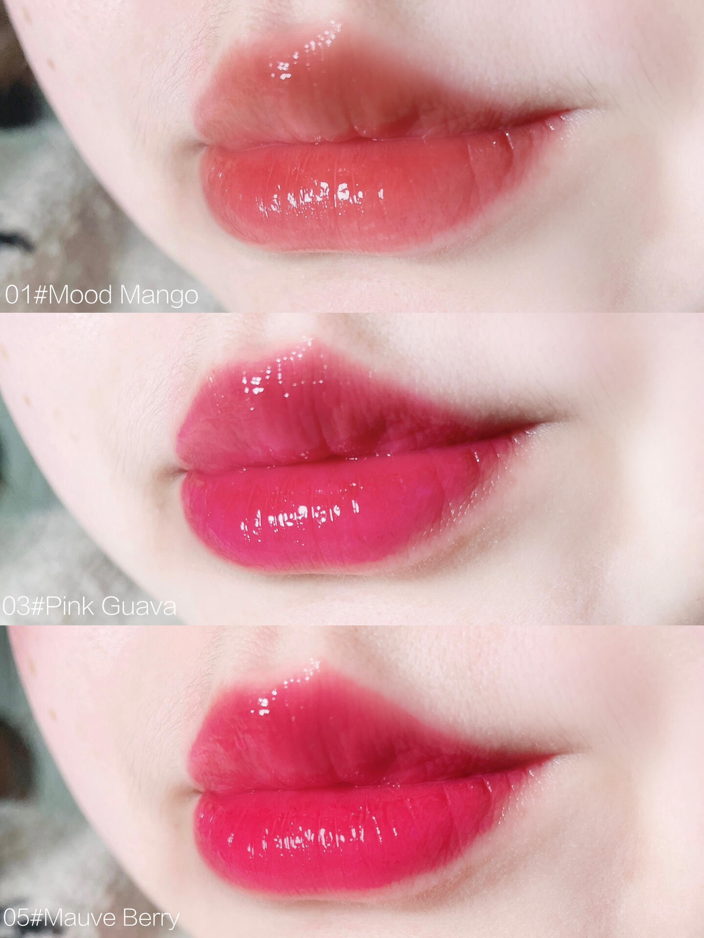 果汁感十足的dasique唇釉 水果的配色 水嘟嘟玻璃唇效果 是甜妹儿本妹的专属色了 01芒果优格:元气珊瑚橘 03番石榴汁:韩系女团粉 05浆果梅子:粉嫩梅子红