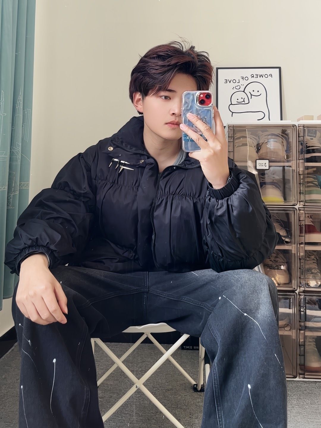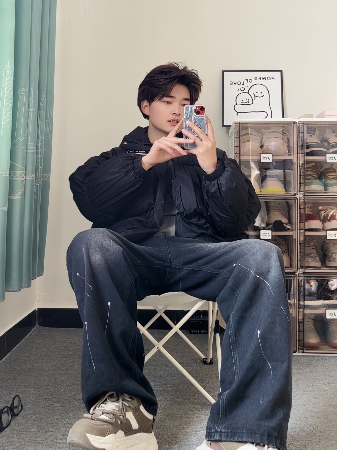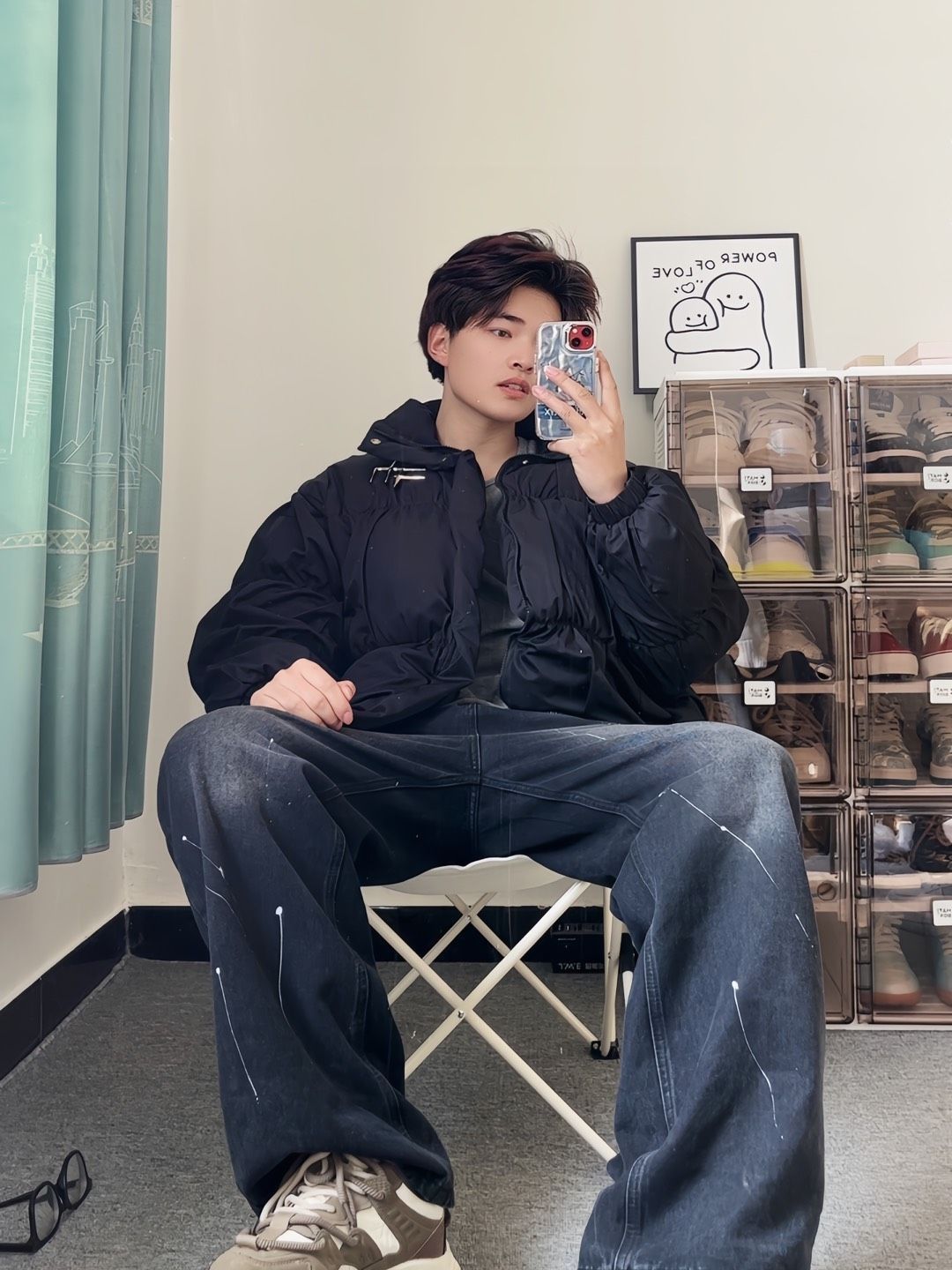 上身灰色内搭➕黑色羽绒服 下身黑色直筒牛仔裤➕卡色老爹鞋 黑色的羽绒服显的人更瘦一点 搭配上黑色牛仔裤,刚刚好, 赶快让你们的男朋友跟我一块儿,学起来