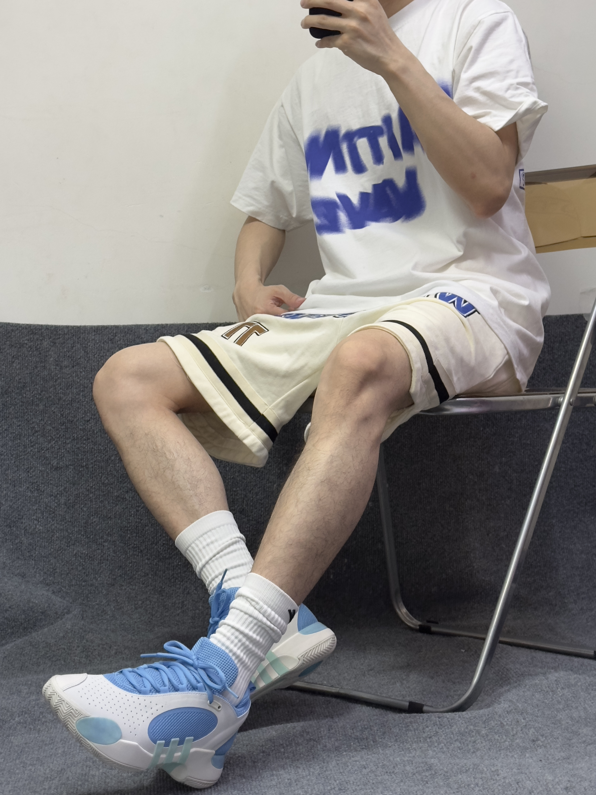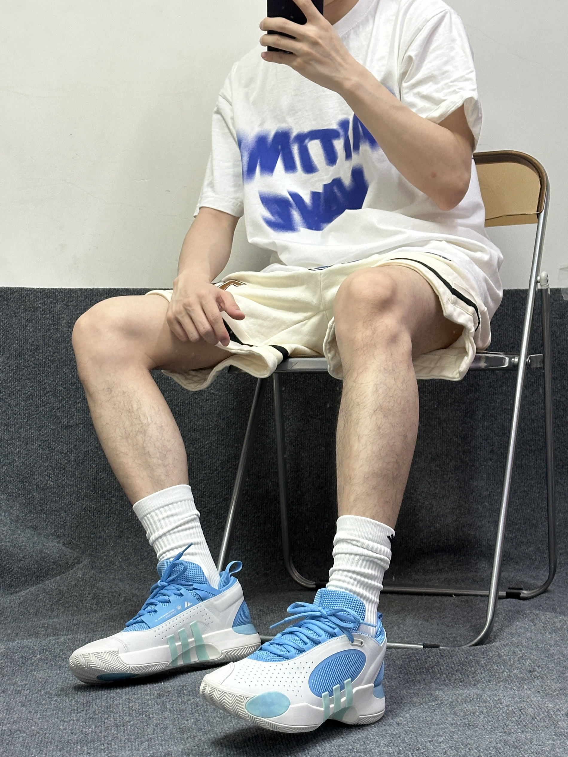 今天上脚米切尔五代 白蓝配色我个人很喜欢 平时穿搭穿也OK 搭配蓝白短袖短裤就搞定 上脚第一感受就是舒适 包裹和缓震都很舒服👍 抓地力也优秀