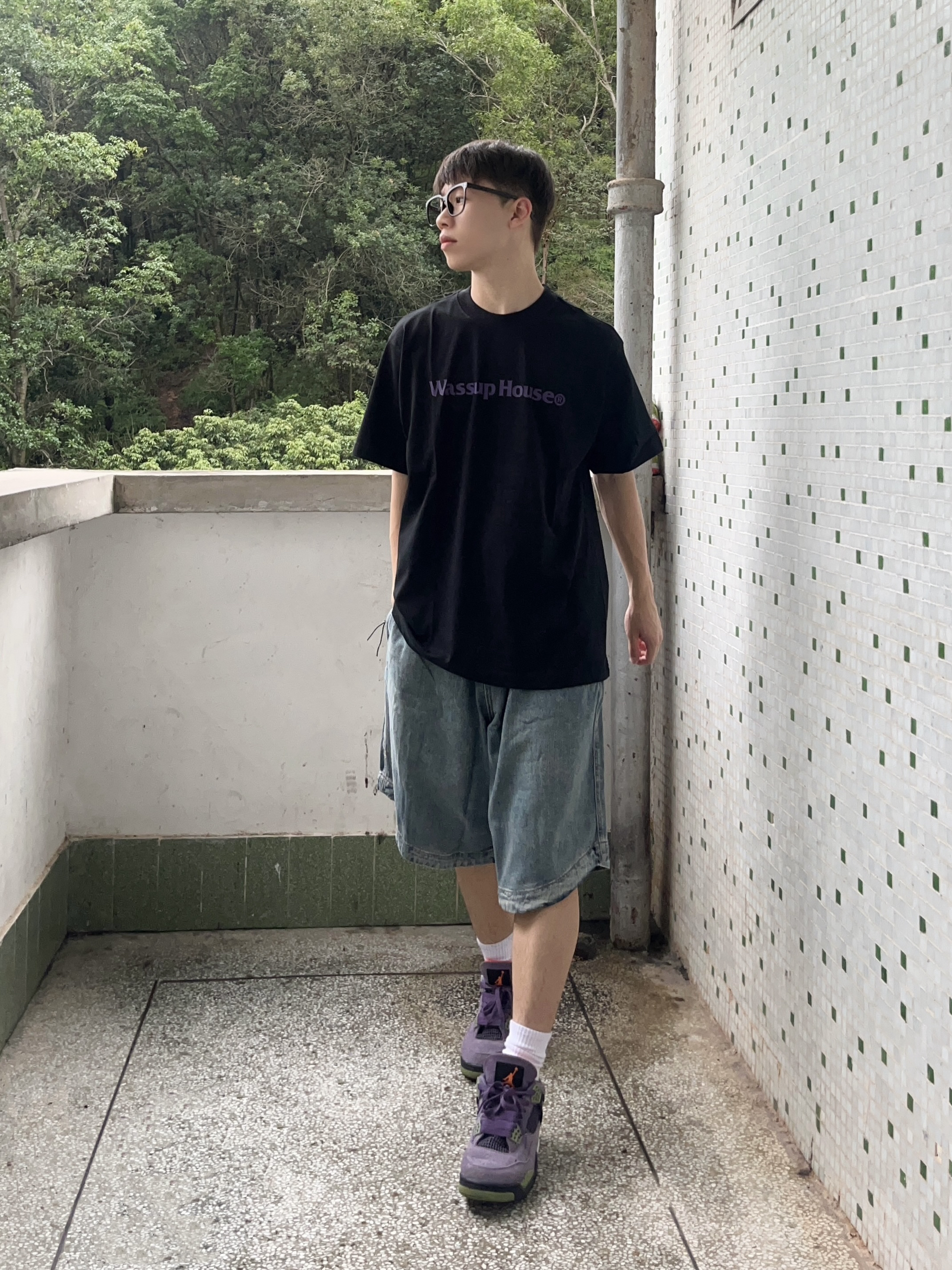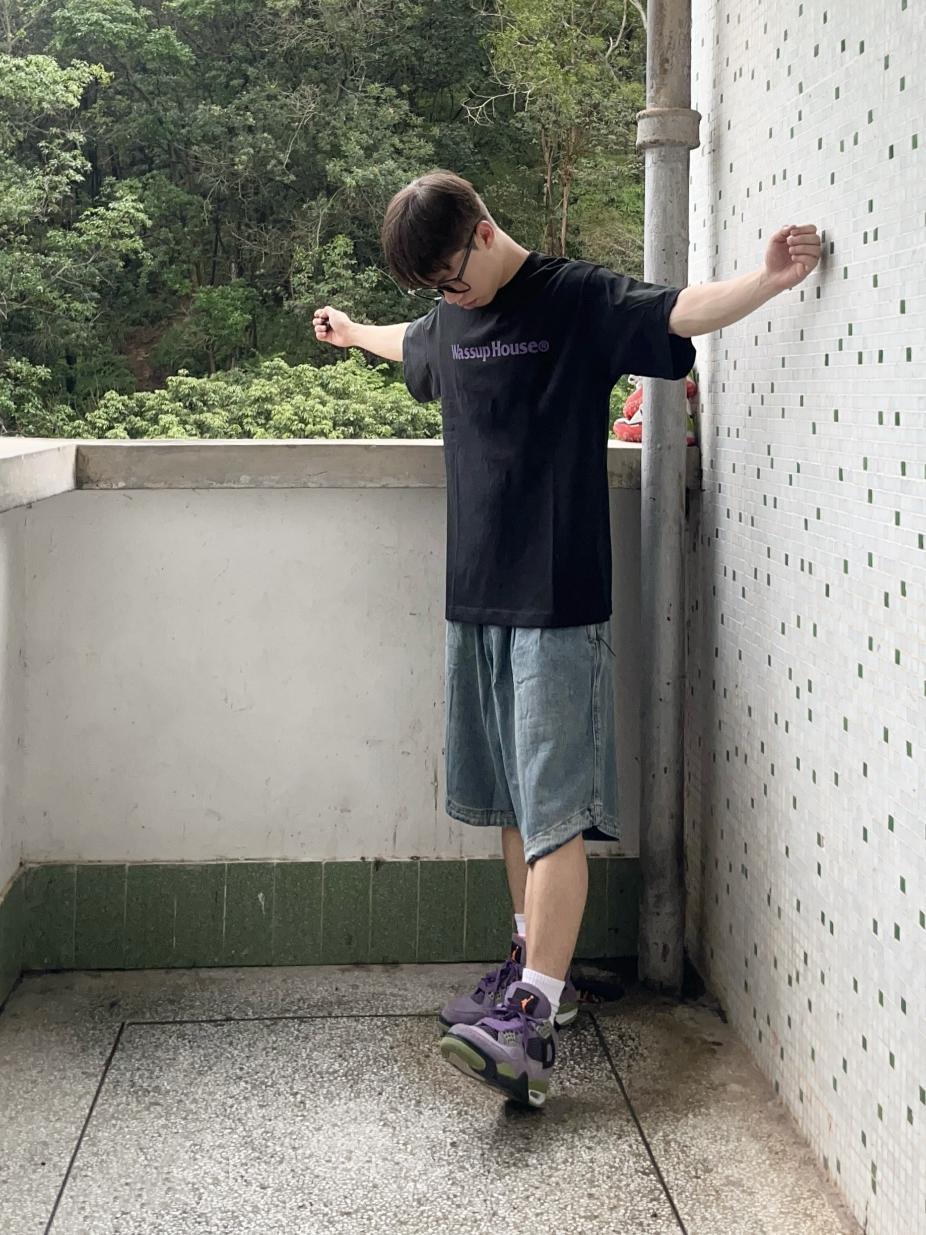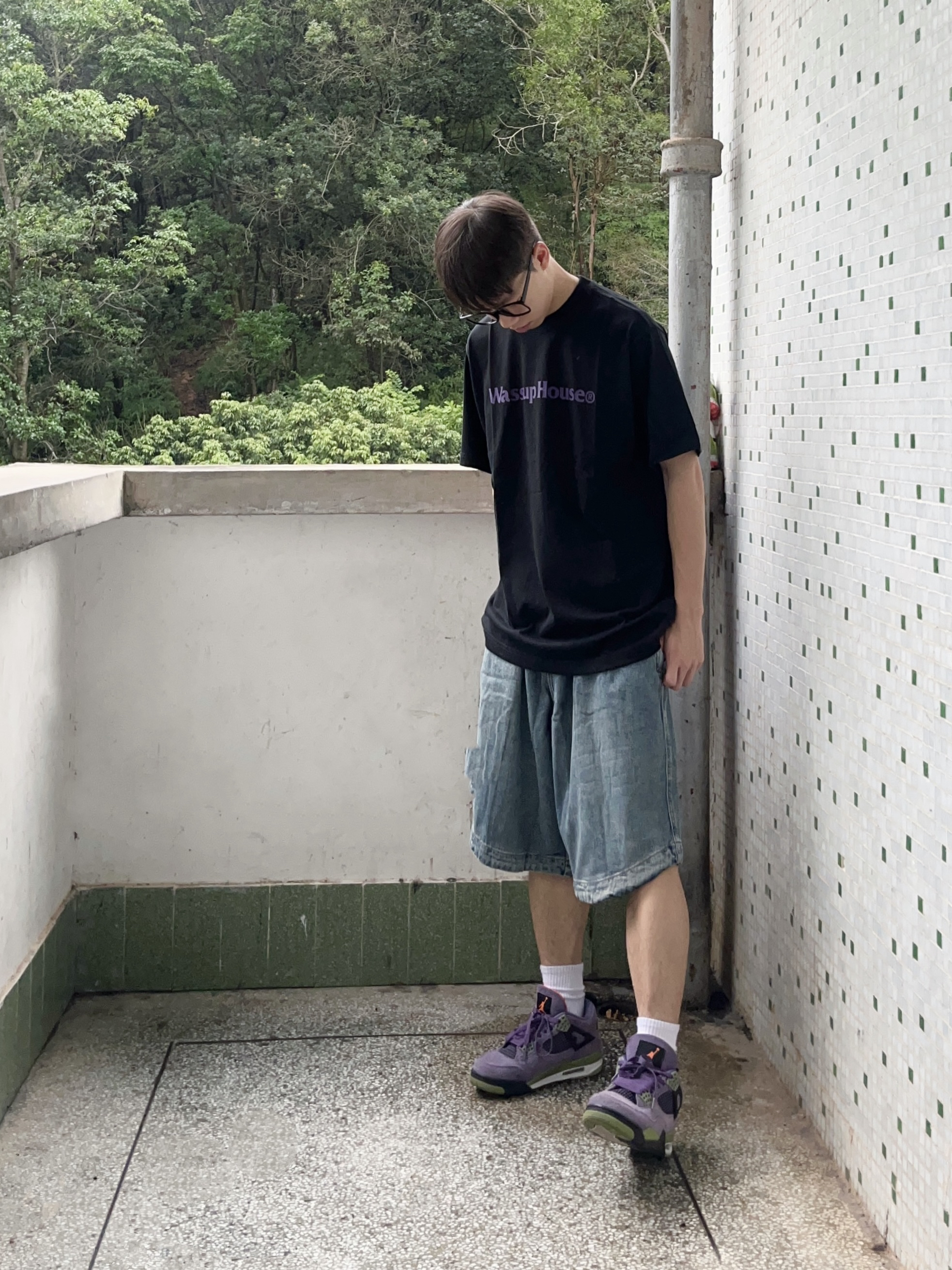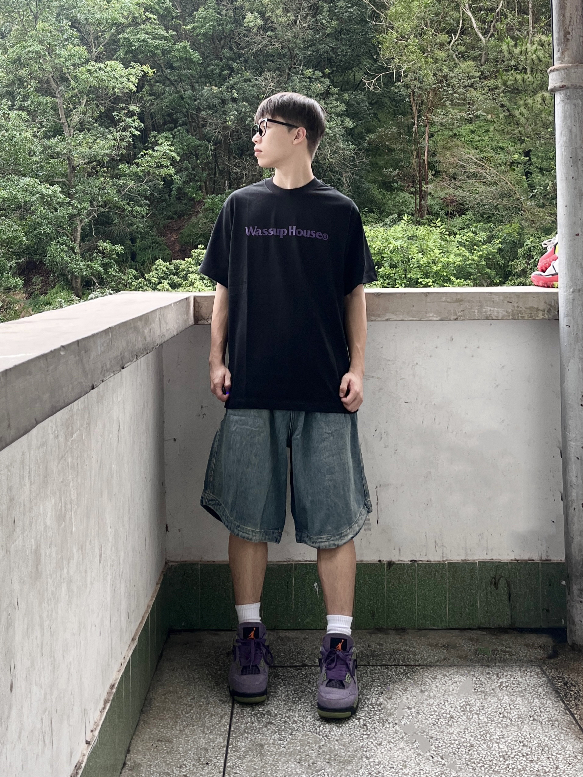 今日份国潮穿搭分享👀 衣服是 wassup 的黑色基础字母夏季短袖 经典logo印花彰显品牌文化 落肩袖版型设计也很正 纯棉面料质量很不错 再搭配一条水洗复古牛仔短裤 阔腿直筒版型 美式风直接拉满 最后经典AJ4复古篮球鞋点缀 一套搭配下来 百搭又好看