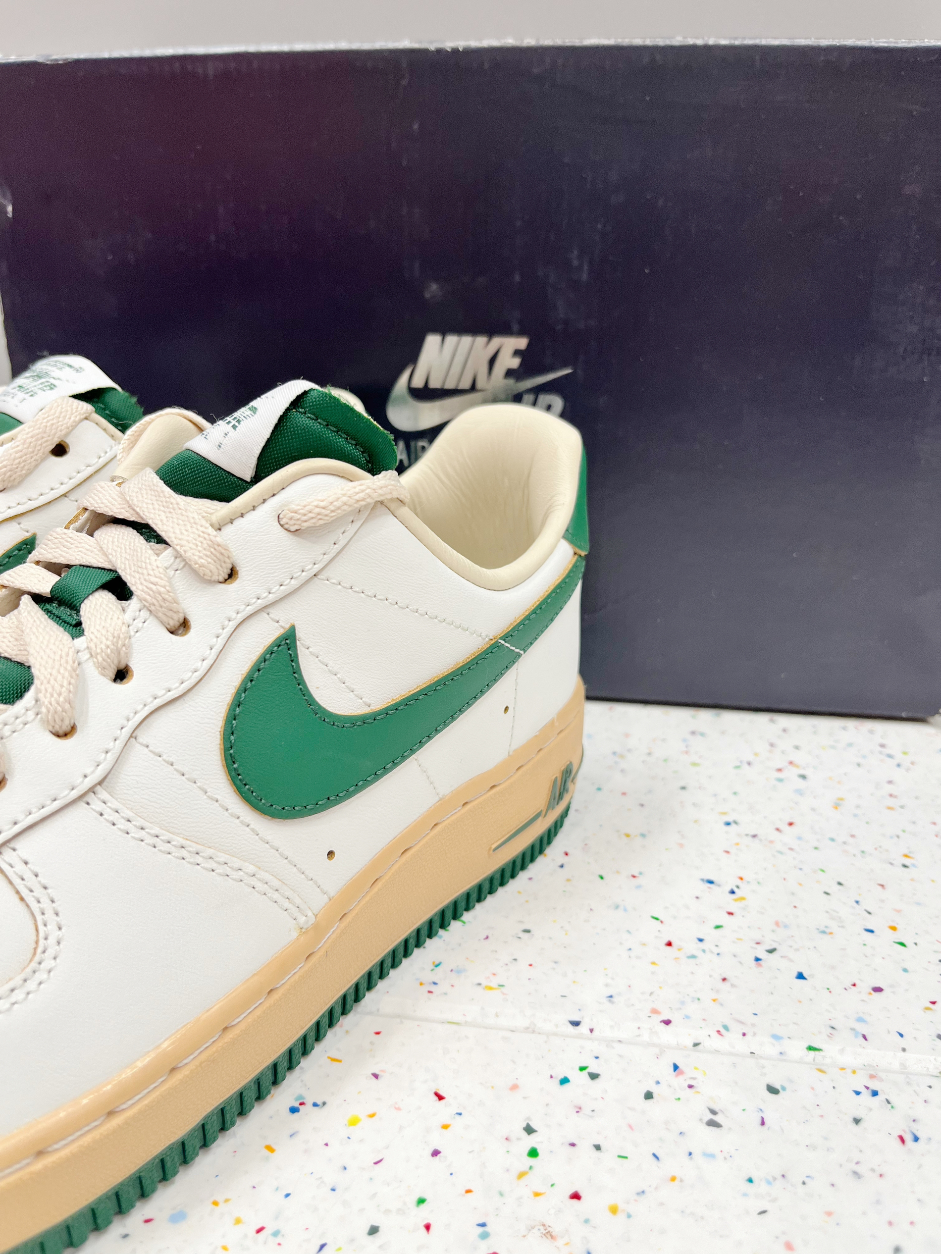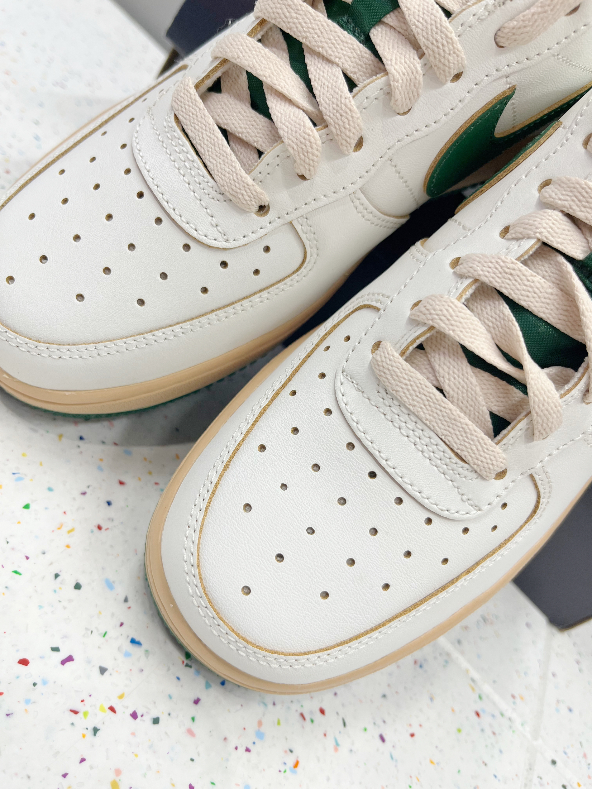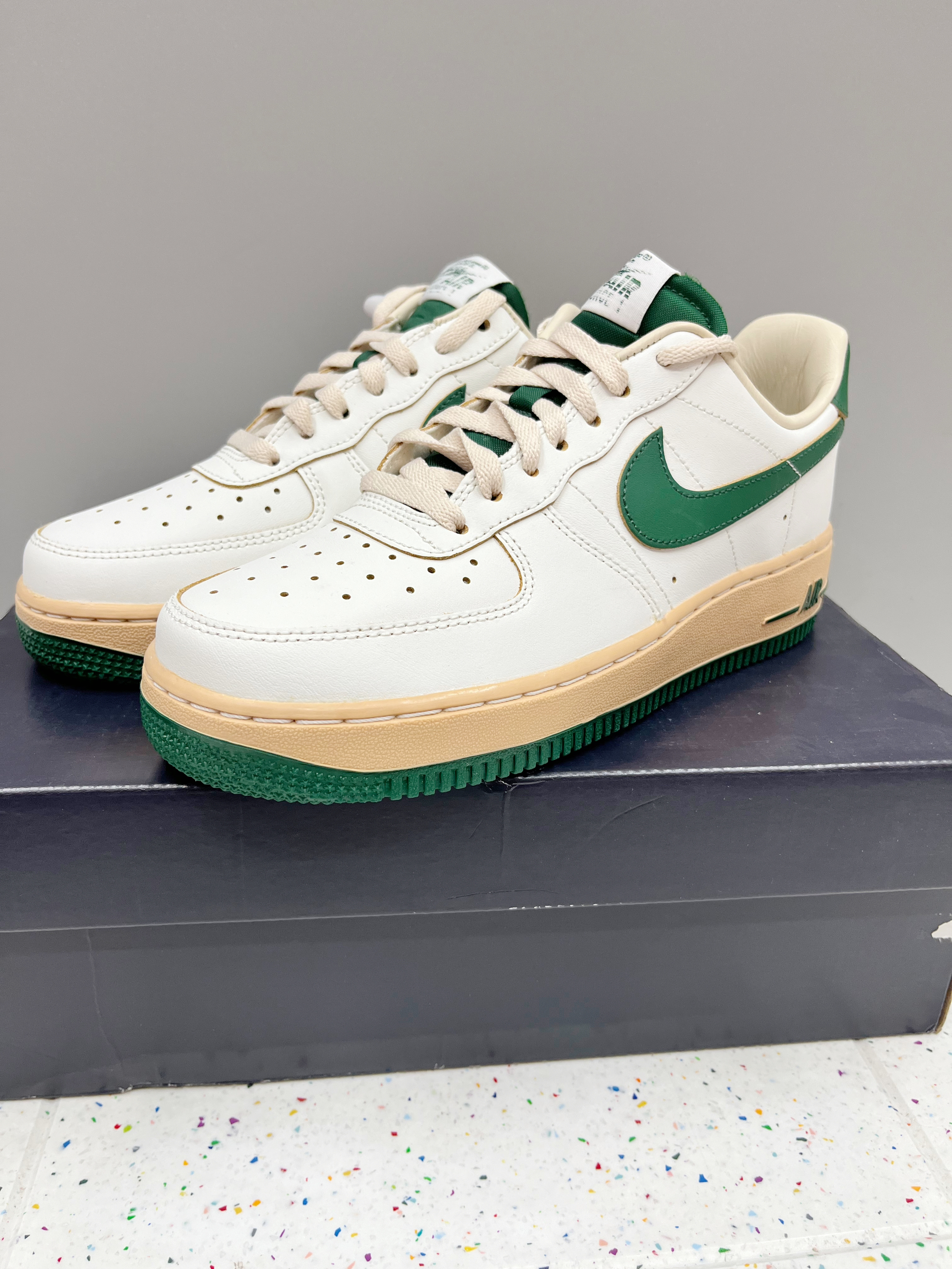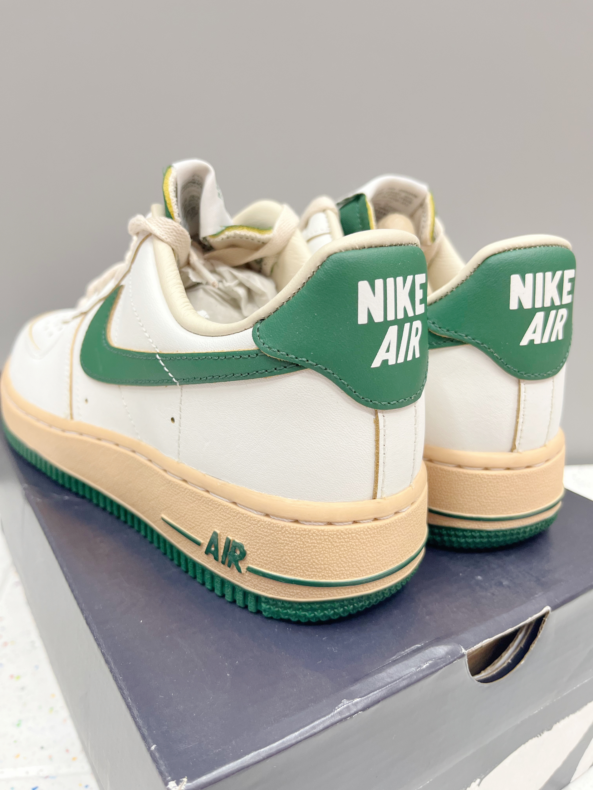 颜色: 🍃整体以白色为主,搭配深绿色Swoosh跟中底,以及后跟贴片,让鞋子很有层次感,赋予鞋子有浓浓的复古感 材质: 整体以皮革为主,日常穿搭好打理 加厚的鞋底设计,不仅增高脚感也特别好 尺码:标准尺码 前期鞋子有点硬,(空军通病)穿一段时间就好了