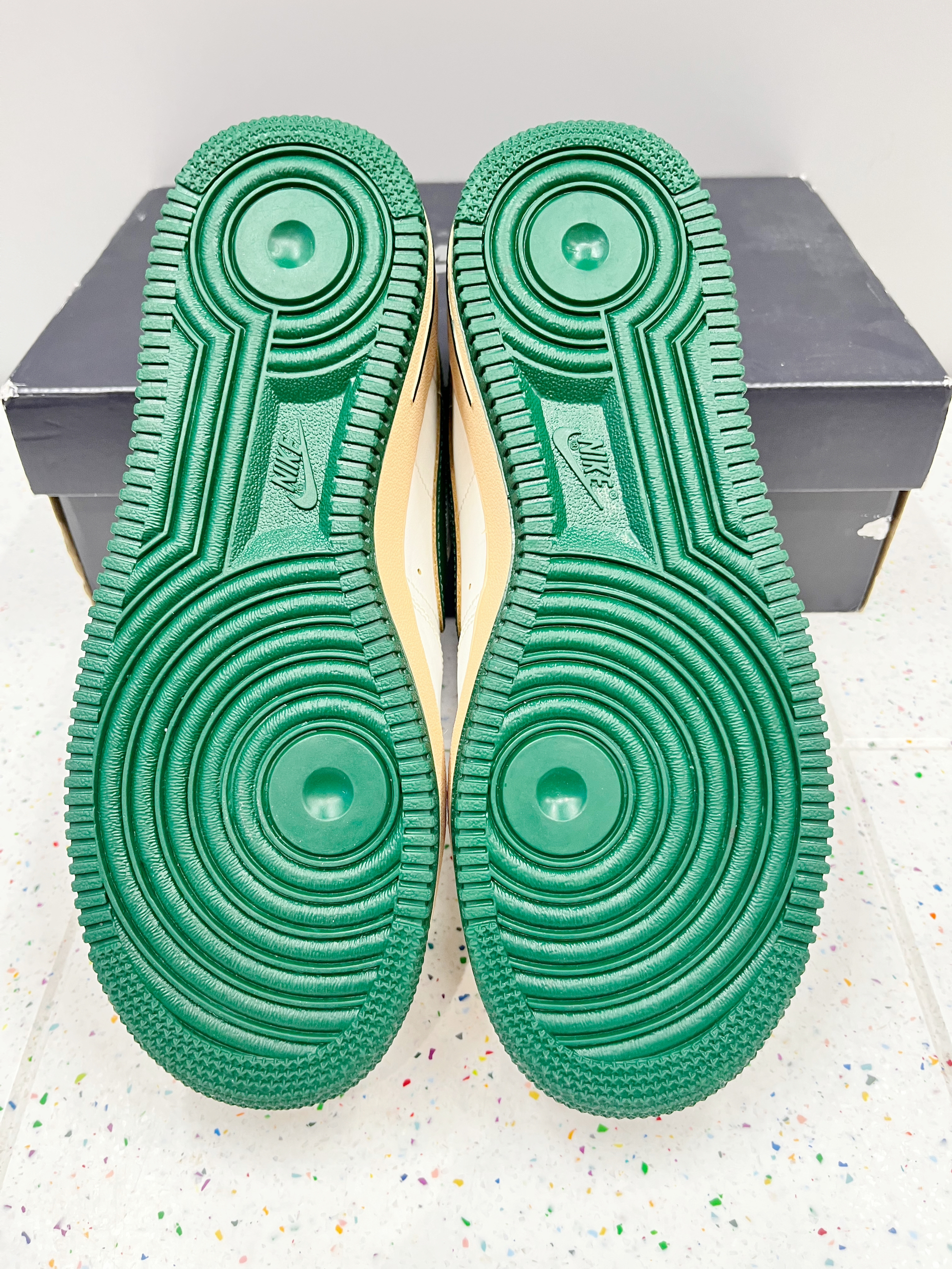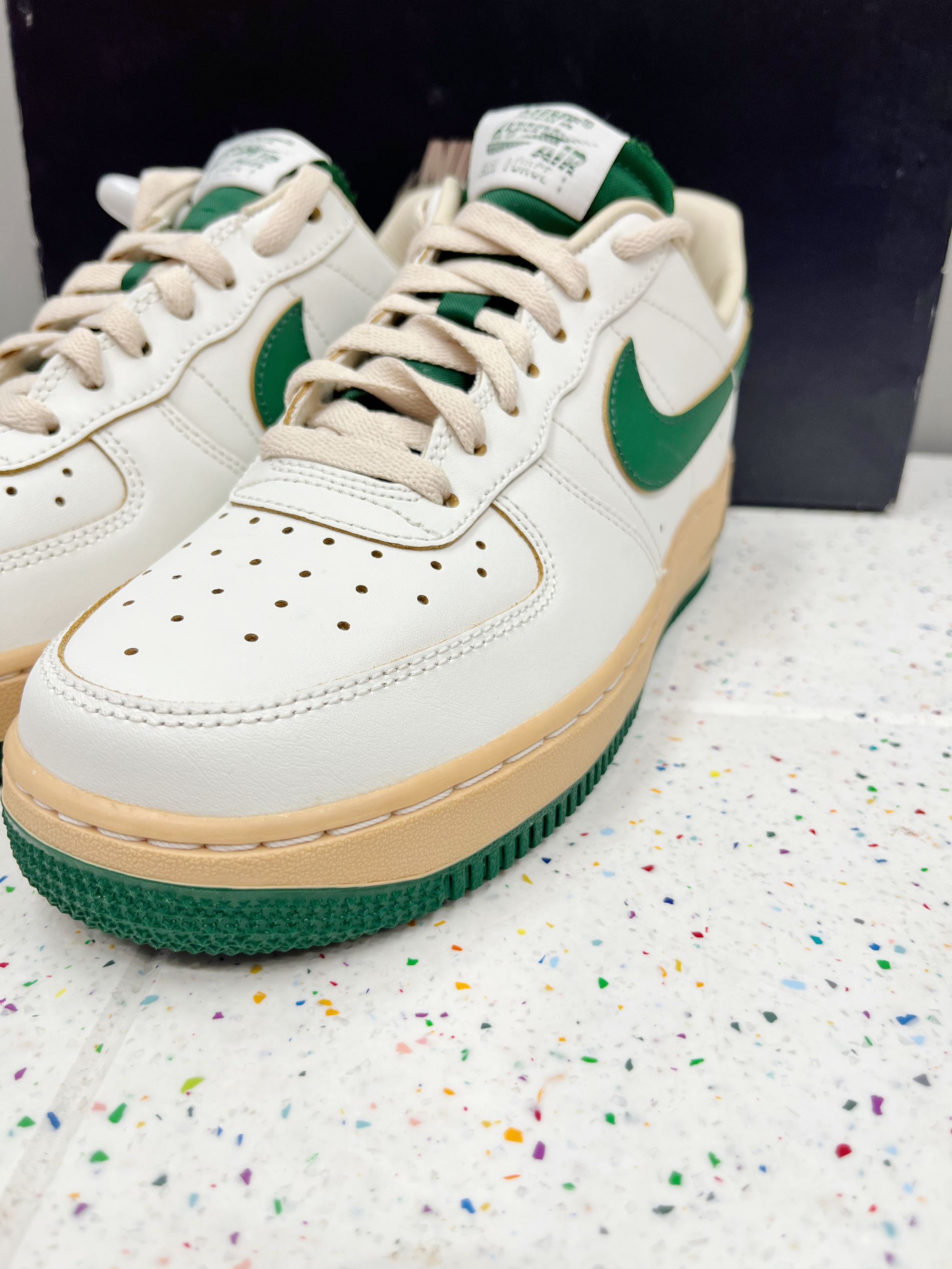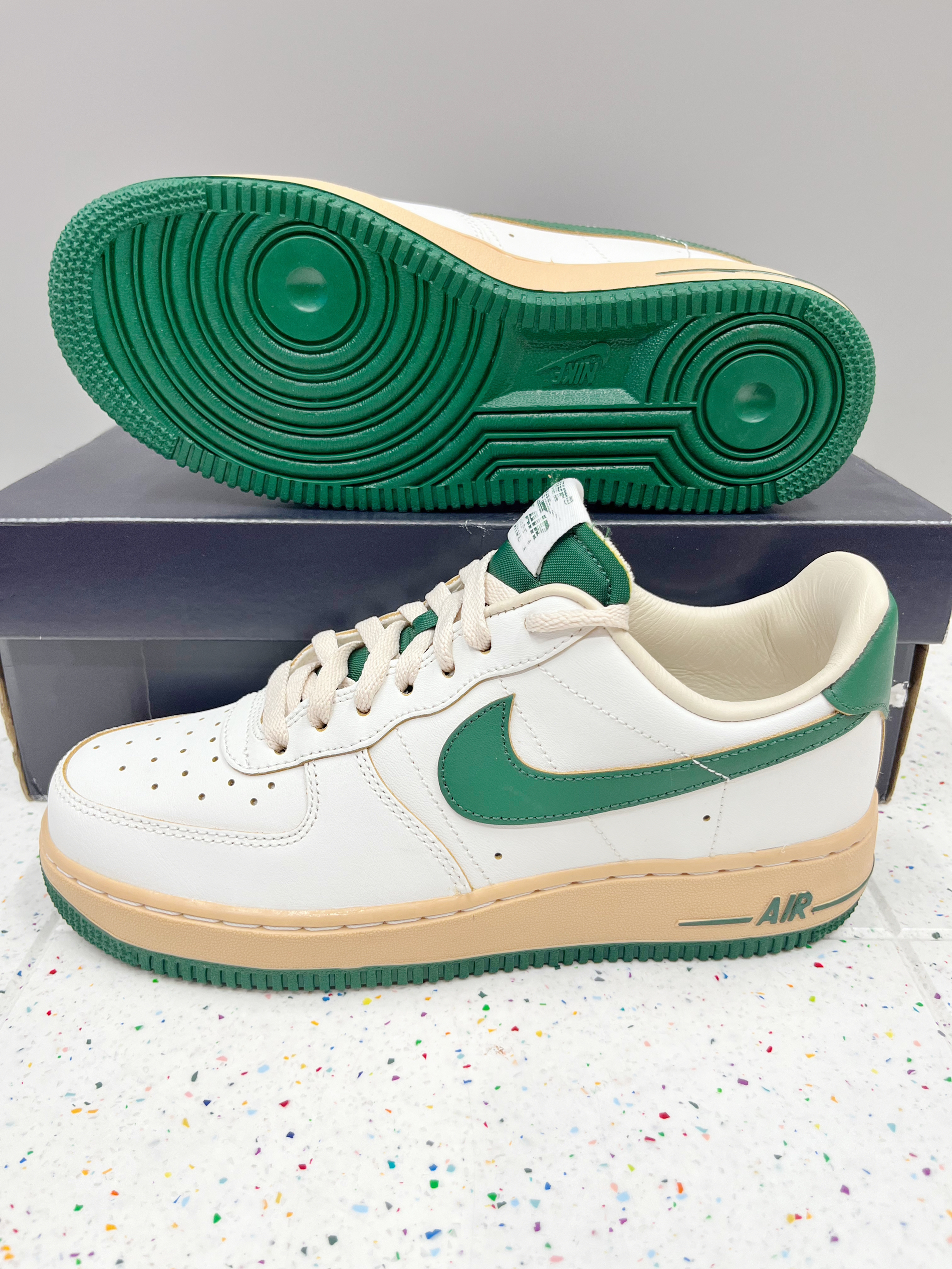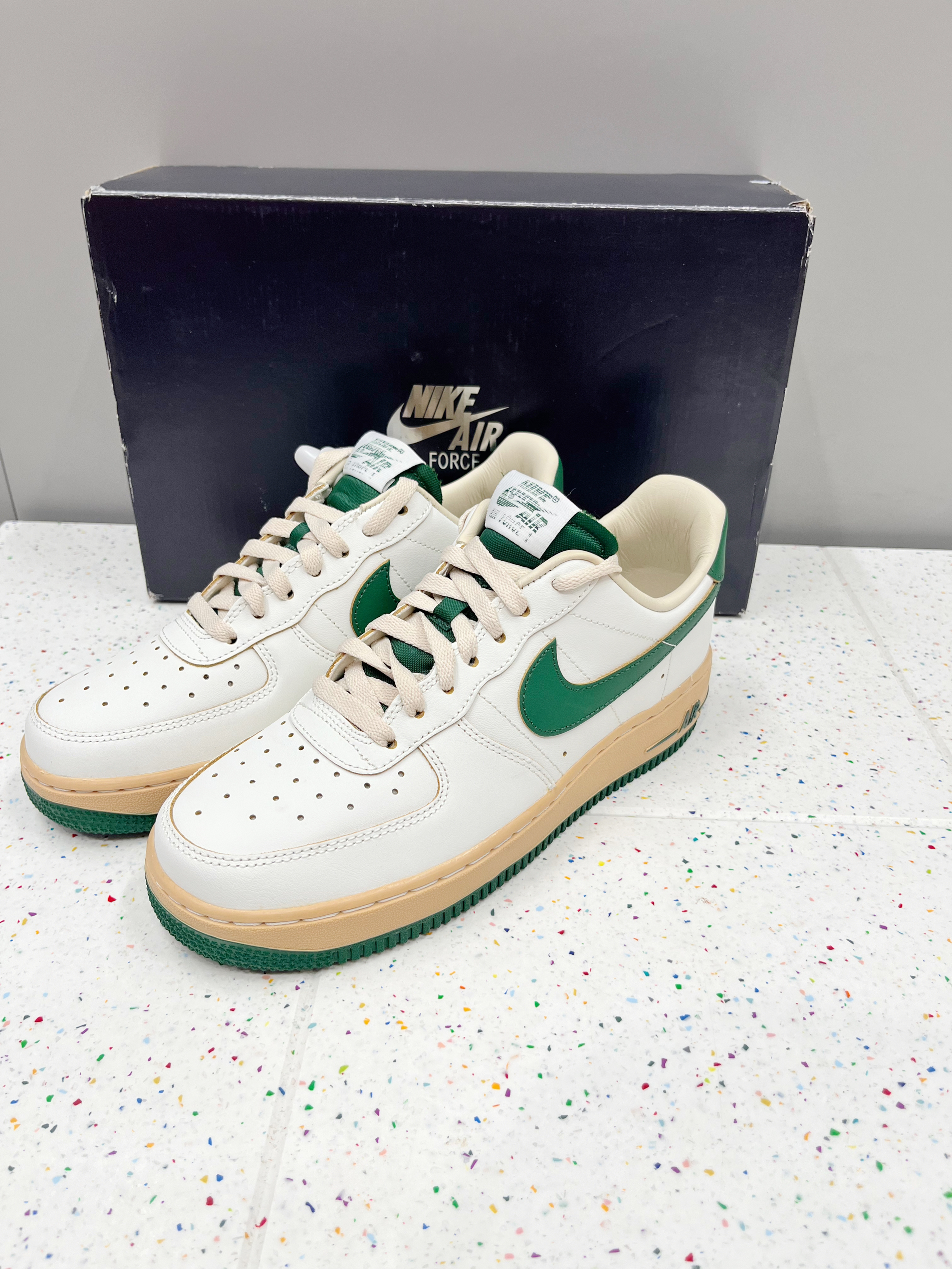 颜色: 🍃整体以白色为主,搭配深绿色Swoosh跟中底,以及后跟贴片,让鞋子很有层次感,赋予鞋子有浓浓的复古感 材质: 整体以皮革为主,日常穿搭好打理 加厚的鞋底设计,不仅增高脚感也特别好 尺码:标准尺码 前期鞋子有点硬,(空军通病)穿一段时间就好了