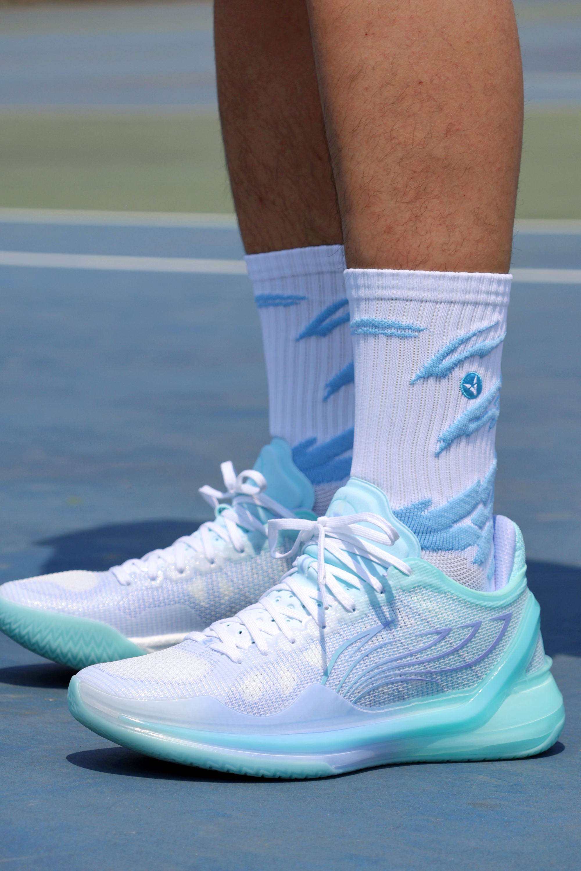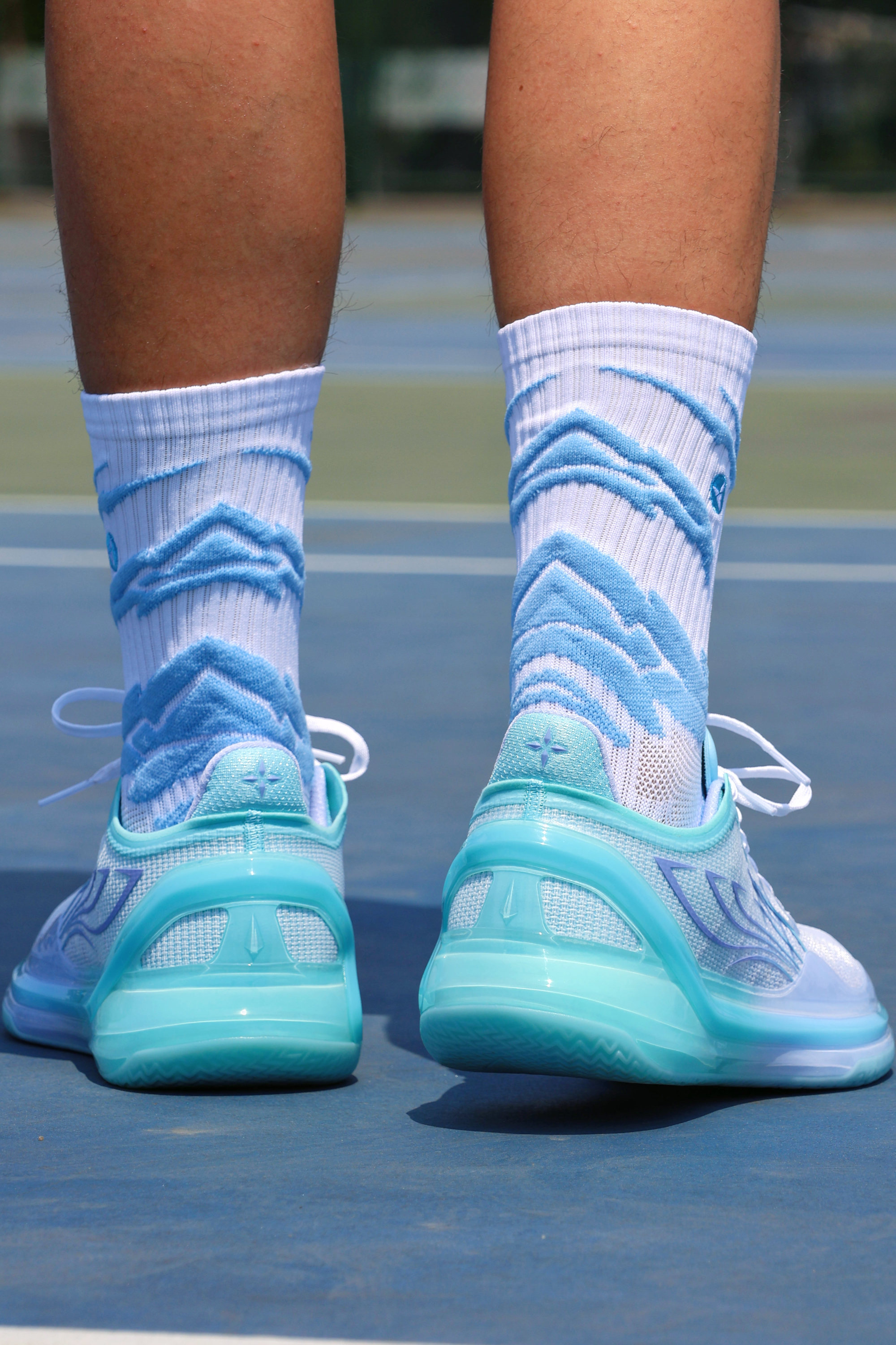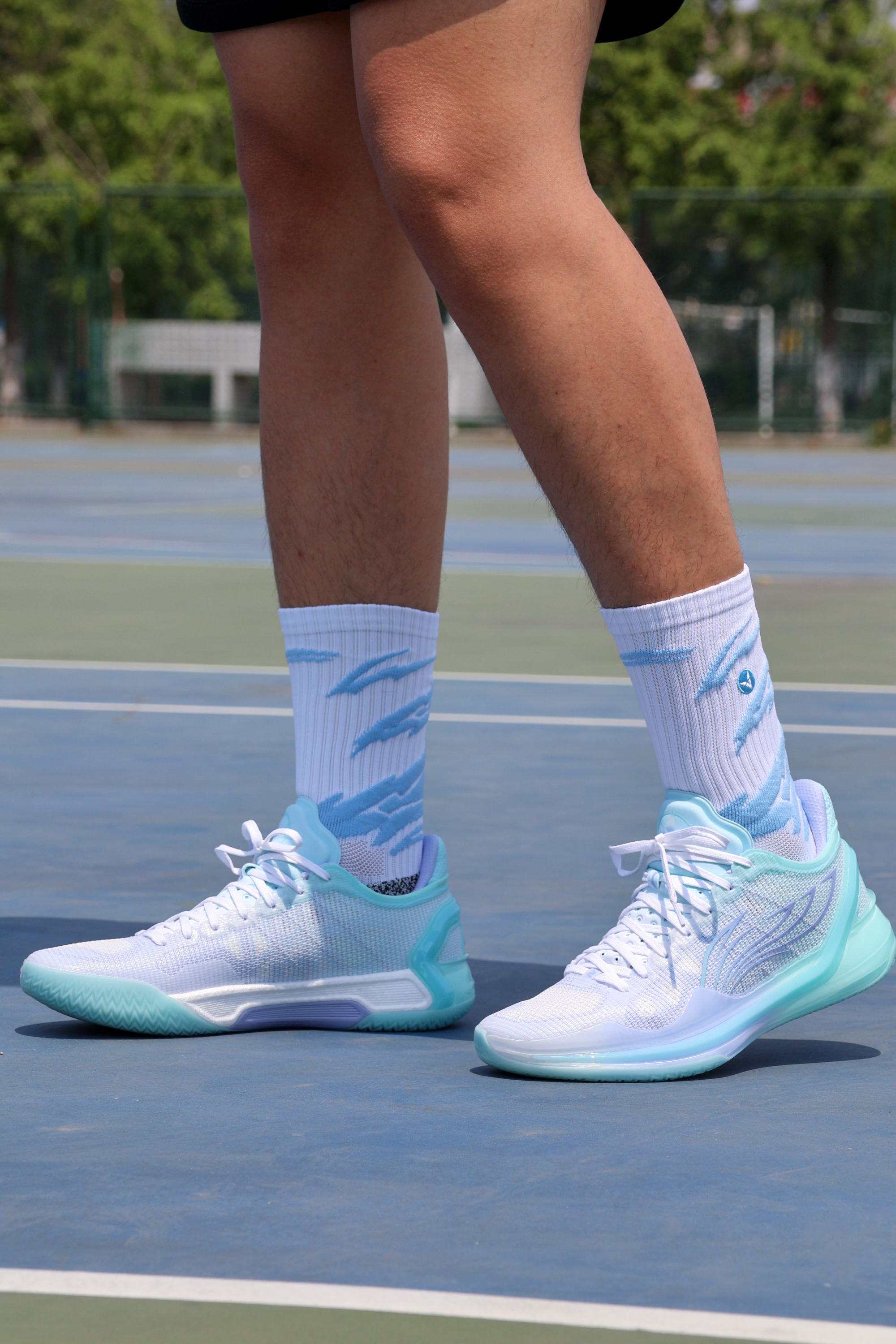 hello大家好~ 夏天球场穿搭最亮眼的就是球袜和球鞋的搭配了 今天给大家推荐的就是我上脚的这款来自 维动 VEIDOORN 的跨海系列球袜 袜子整体是高帮的设计 可以堆叠起来穿 更有层次感 本身包裹感配合球鞋是很不错的 而且袜子的配色也有几种 搭配我的利刃4V2还是很帅的哦~