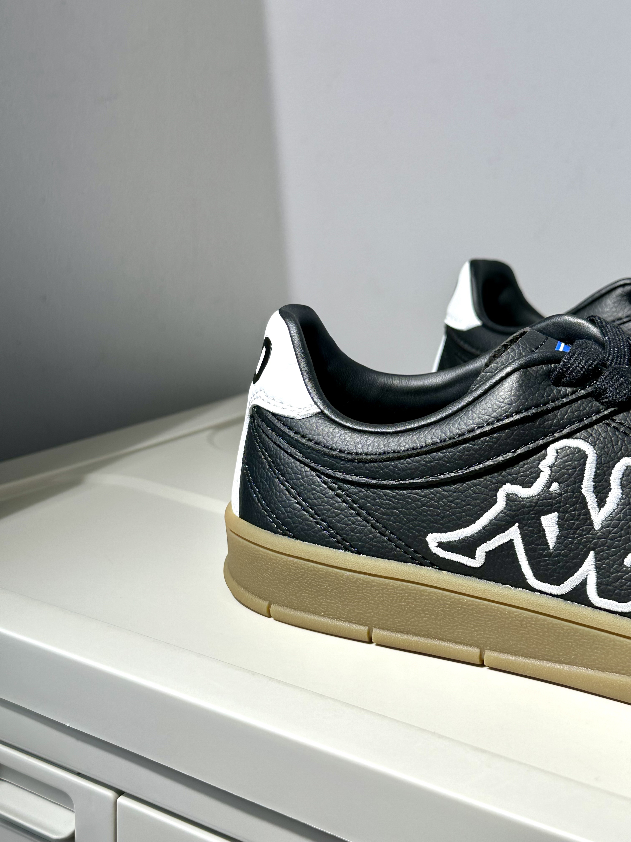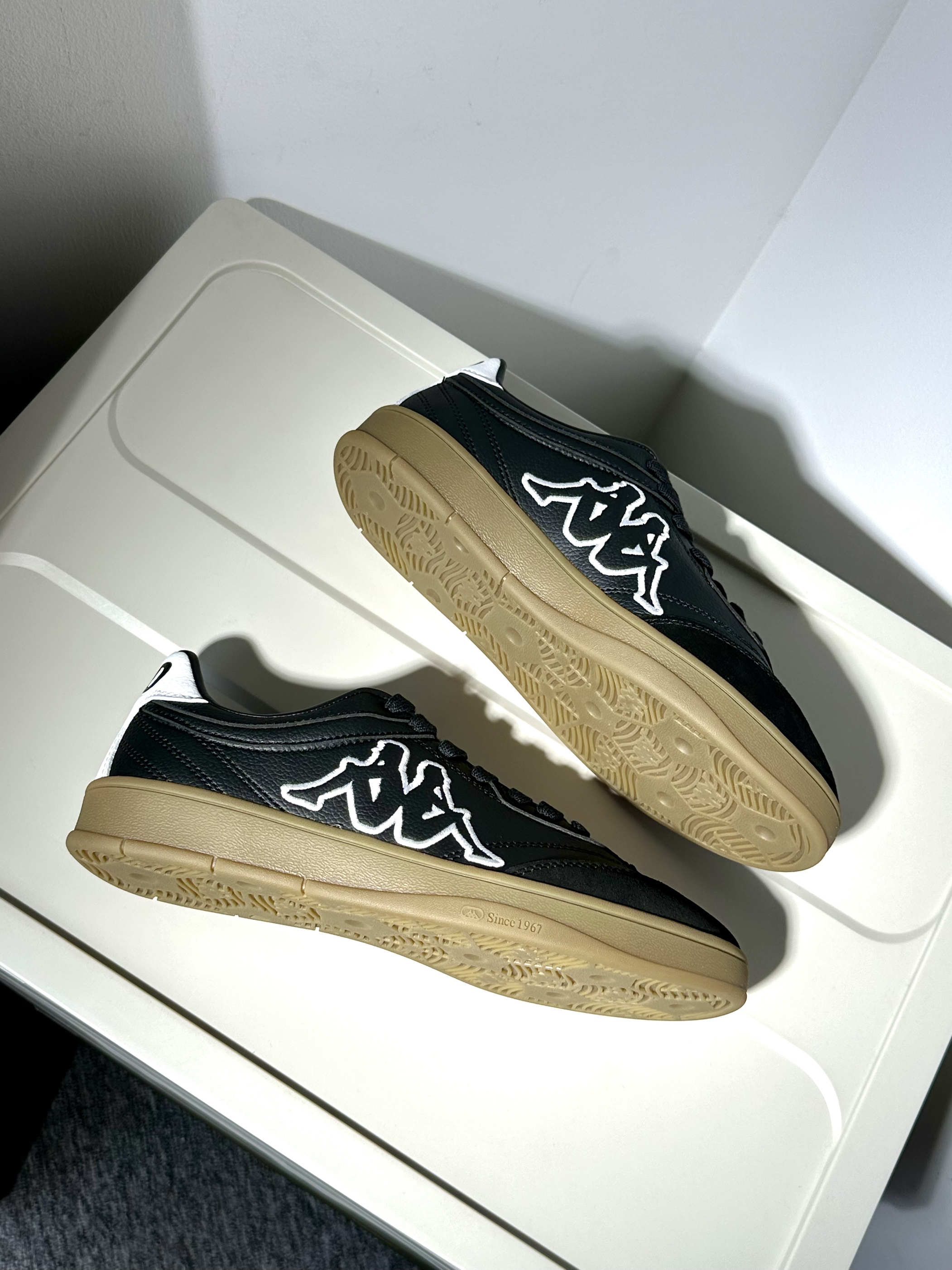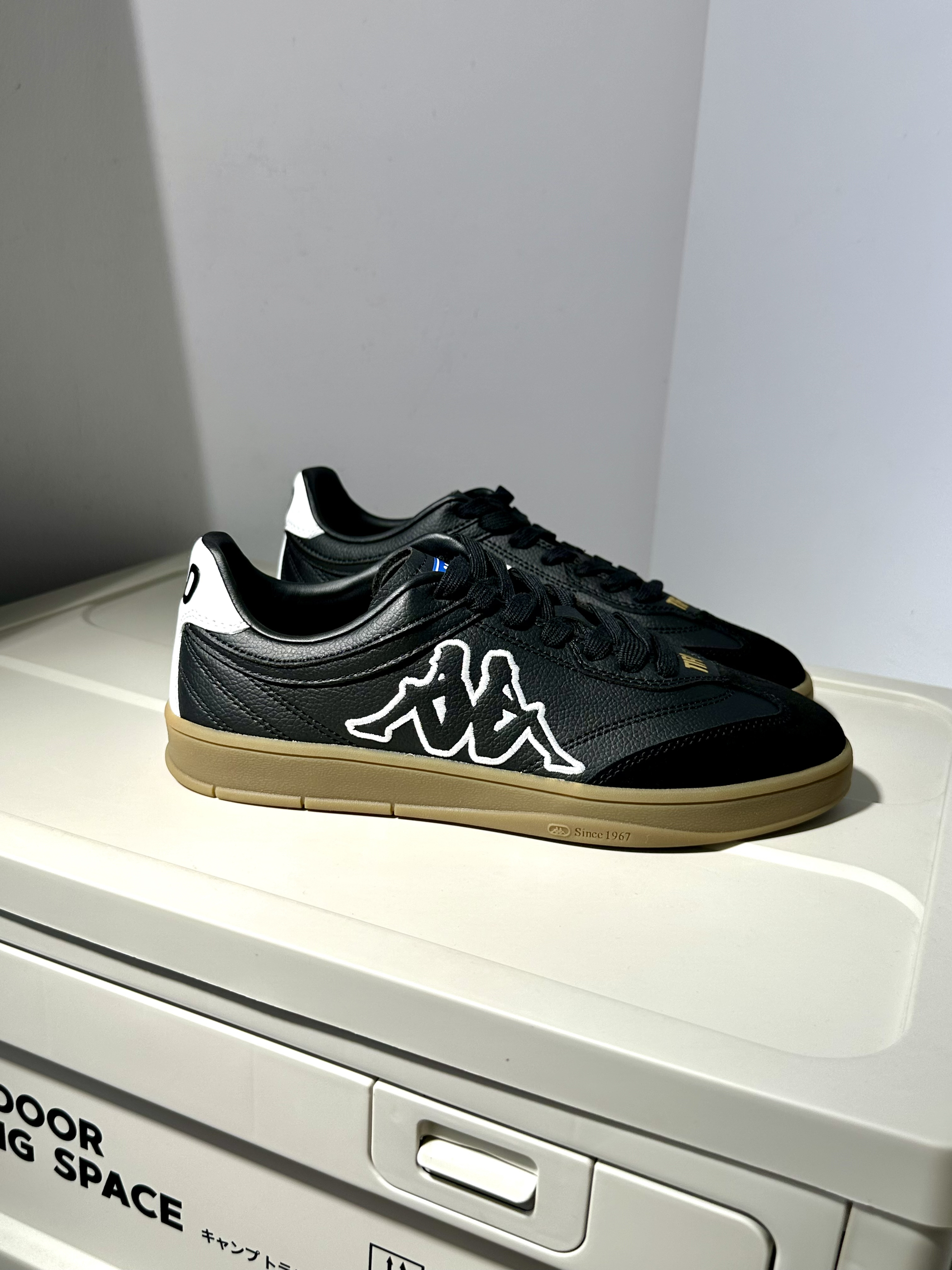 🥝配色:kappa的T头鞋的确很有质感,也是最近被种草的新系列~黑白色鞋面搭配褐色生胶底,浓浓的复古气息📼🌴 🥝材质:鞋面采用荔枝皮与麂皮拼接,质感很高级~看上去也更加复古经典‼️ 🥝脚感:踩上去软软糯糯的脚感,作为一双板鞋,上脚体验挺不错的🍋🟩 🥝尺码:正码选择就OK了!🥑