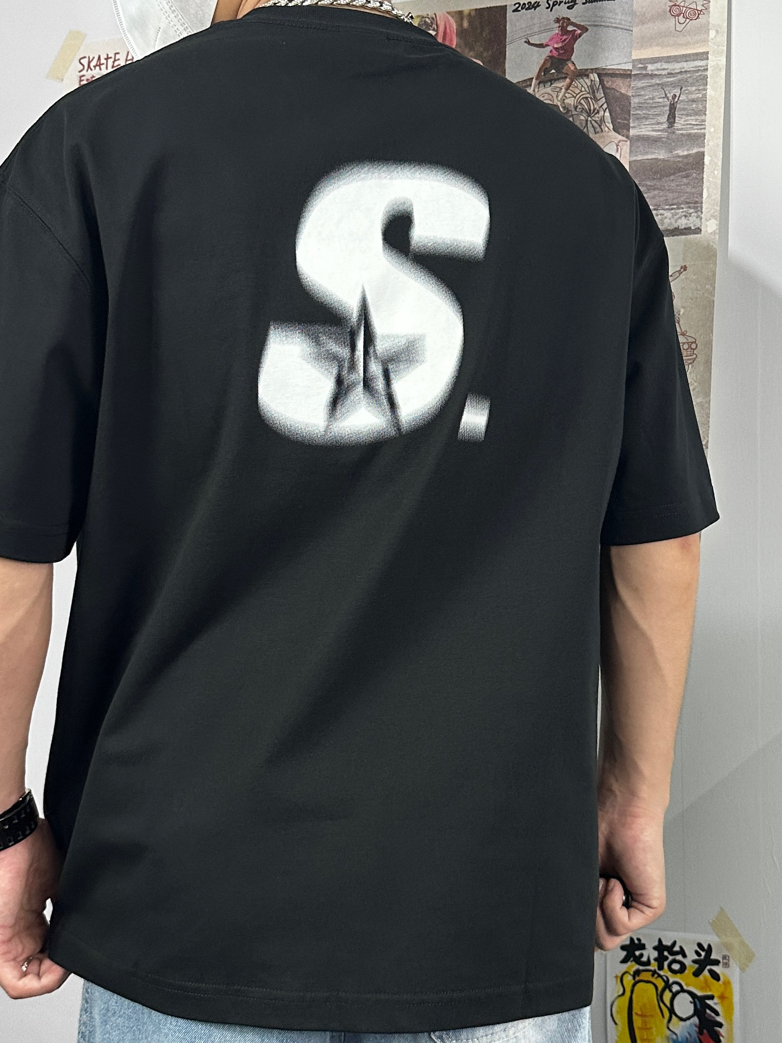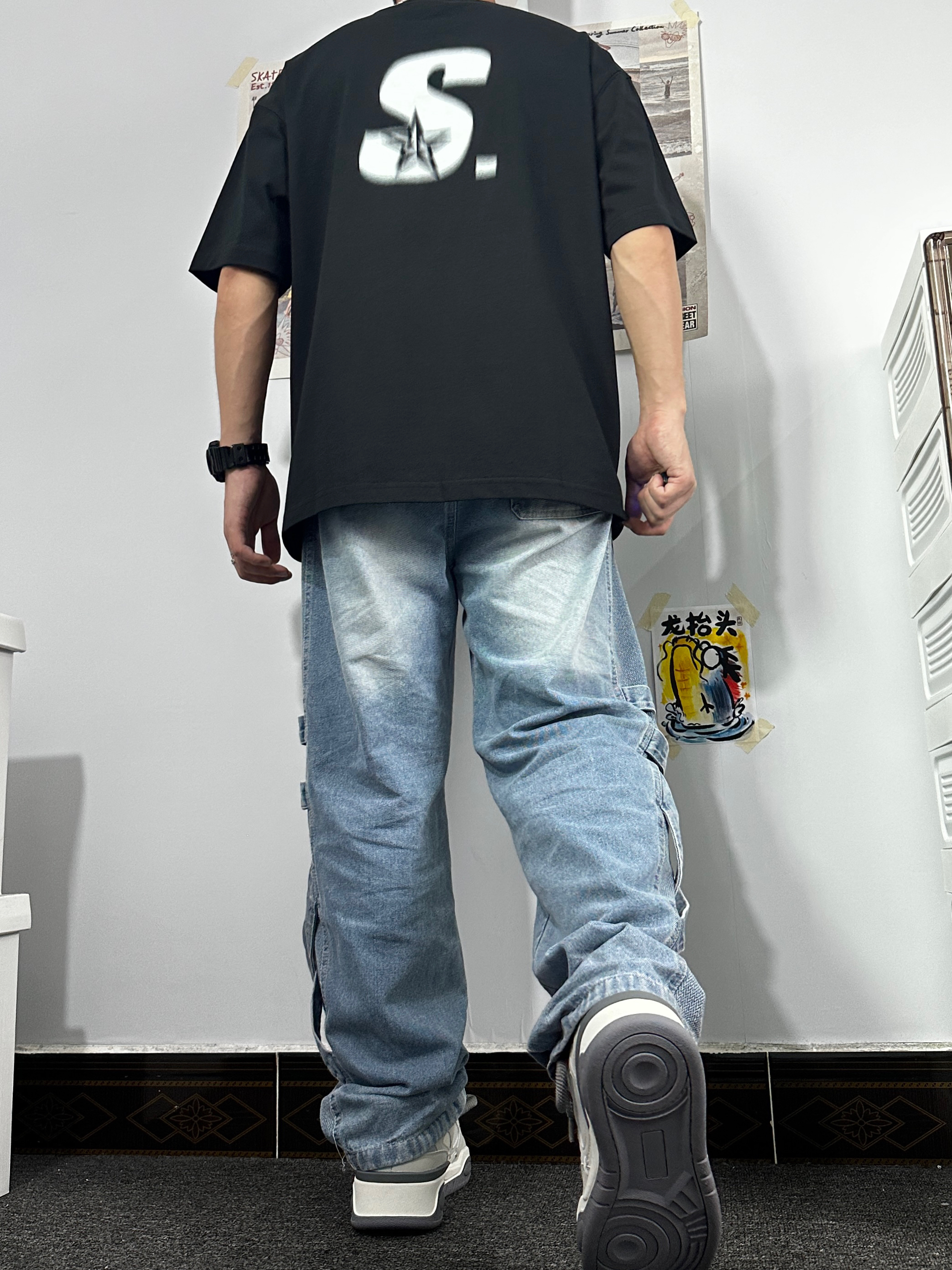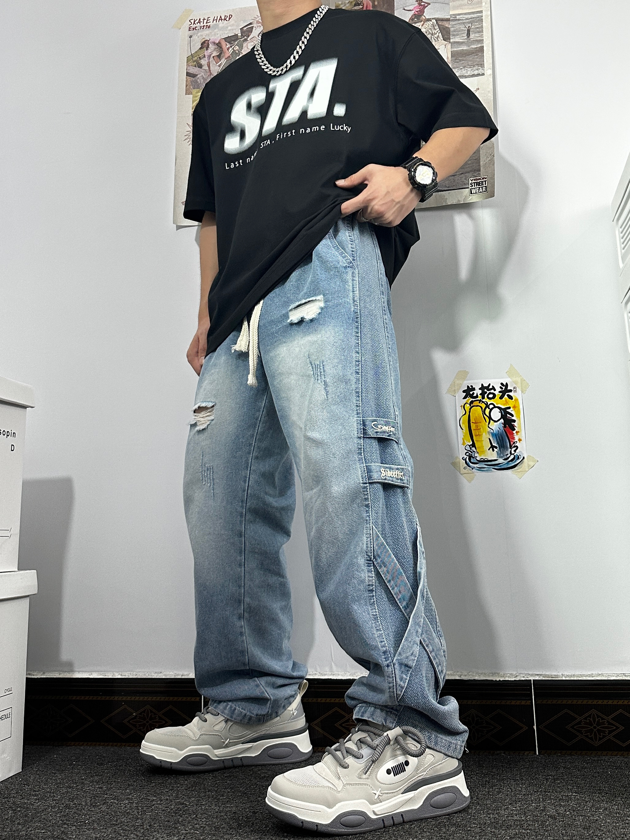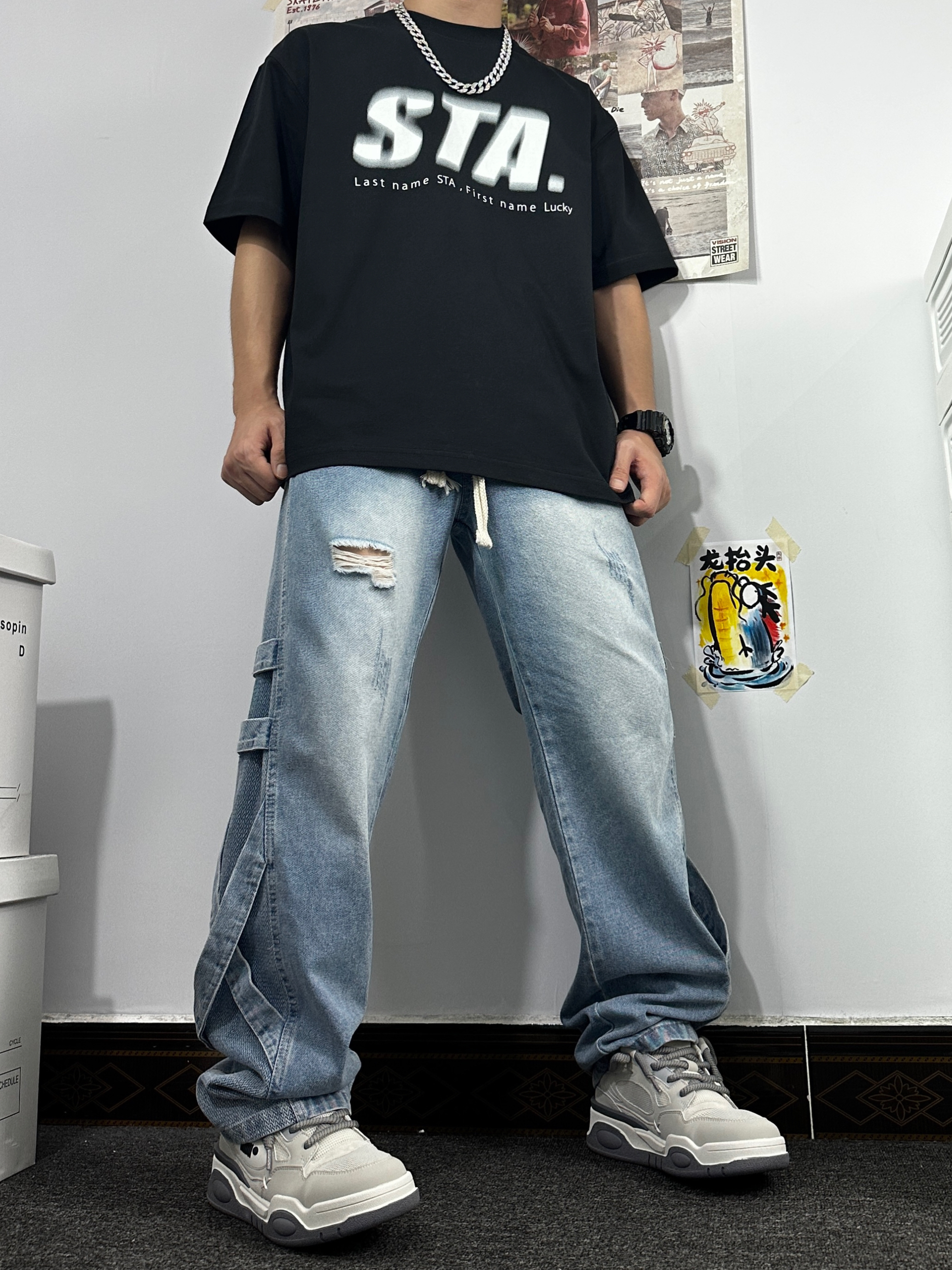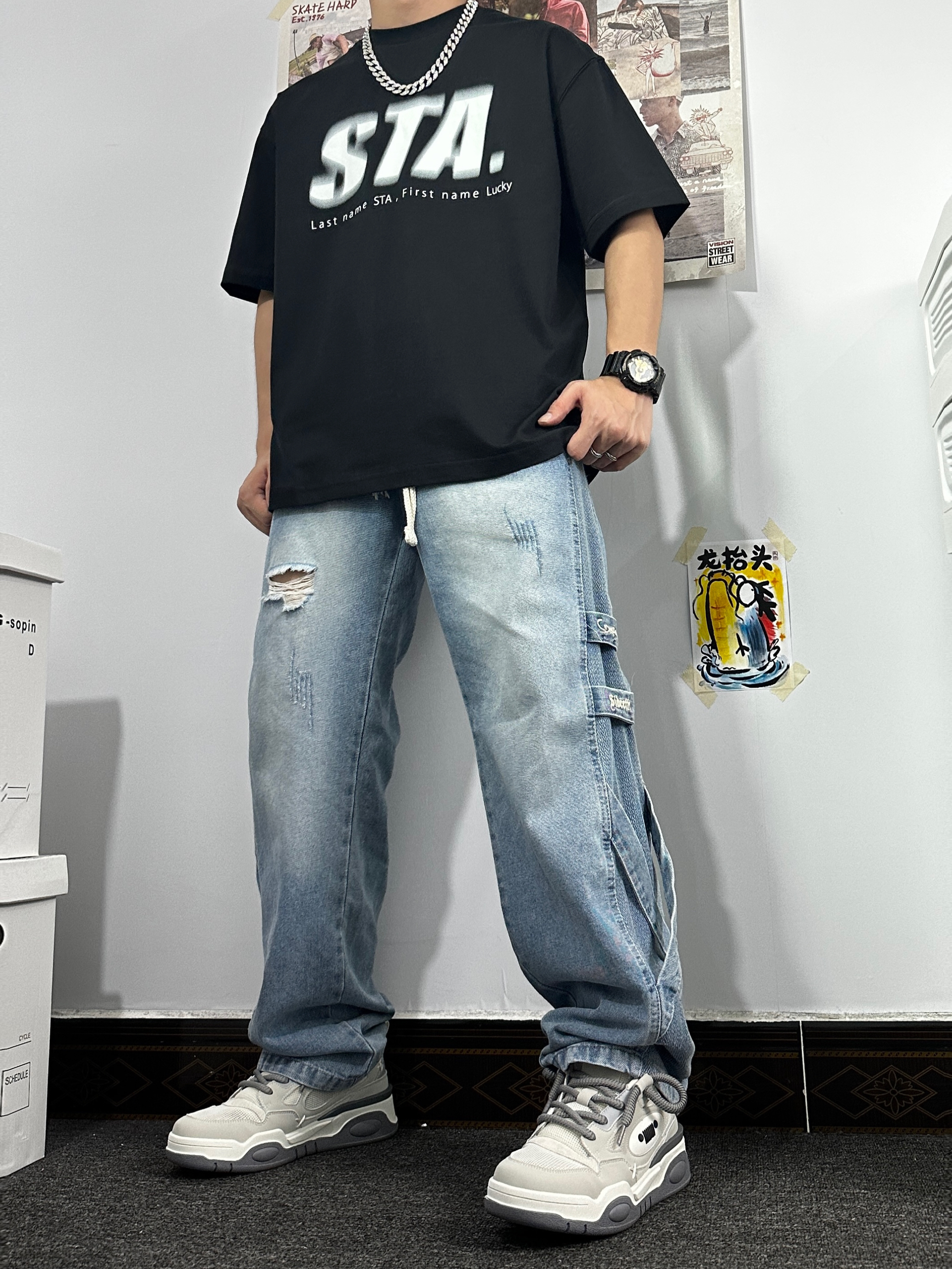 👔:STAHOOD黑色圆领短袖,版型宽松,风格可搭配休闲或者美式,胸前模糊效果logo挺特别的,吸眼耐看; 👖:复古做旧牛仔裤,有破洞和布条点缀,挺特别的; 👟:JEEP SPIRIT低帮休闲鞋,纯灰简约,侧边的logo也可爱,也是双百搭的鞋子呢;