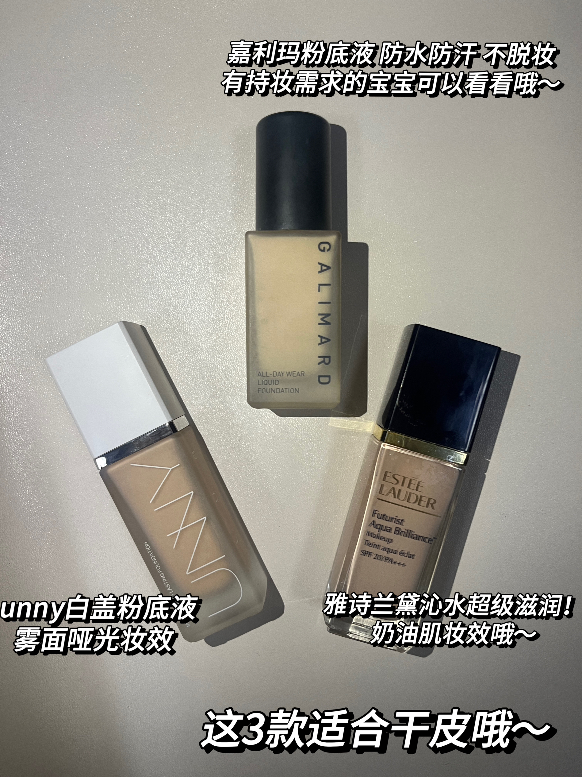 汇总了一下我们宿舍都在用的粉底液 有平价的有大牌的! 大家可以看看自己的需浓哦~ 我先来介绍一下适合干皮的粉底液: 第一款我要推的就是嘉利玛粉底液 我真的超爱! 在我的脸上服帖自然不脱妆 防水防汗 持妆好!不拔千哦 第二款就是大牌雅诗兰黛沁水喽~ 大牌就是大牌 里面添加了很多精华 滋润肌肤 不拔干~有预算的宝宝们可以考虑哦 口ESTEE LAUDER/雅诗兰黛 第三款当然是unny喽~ 平价中的...