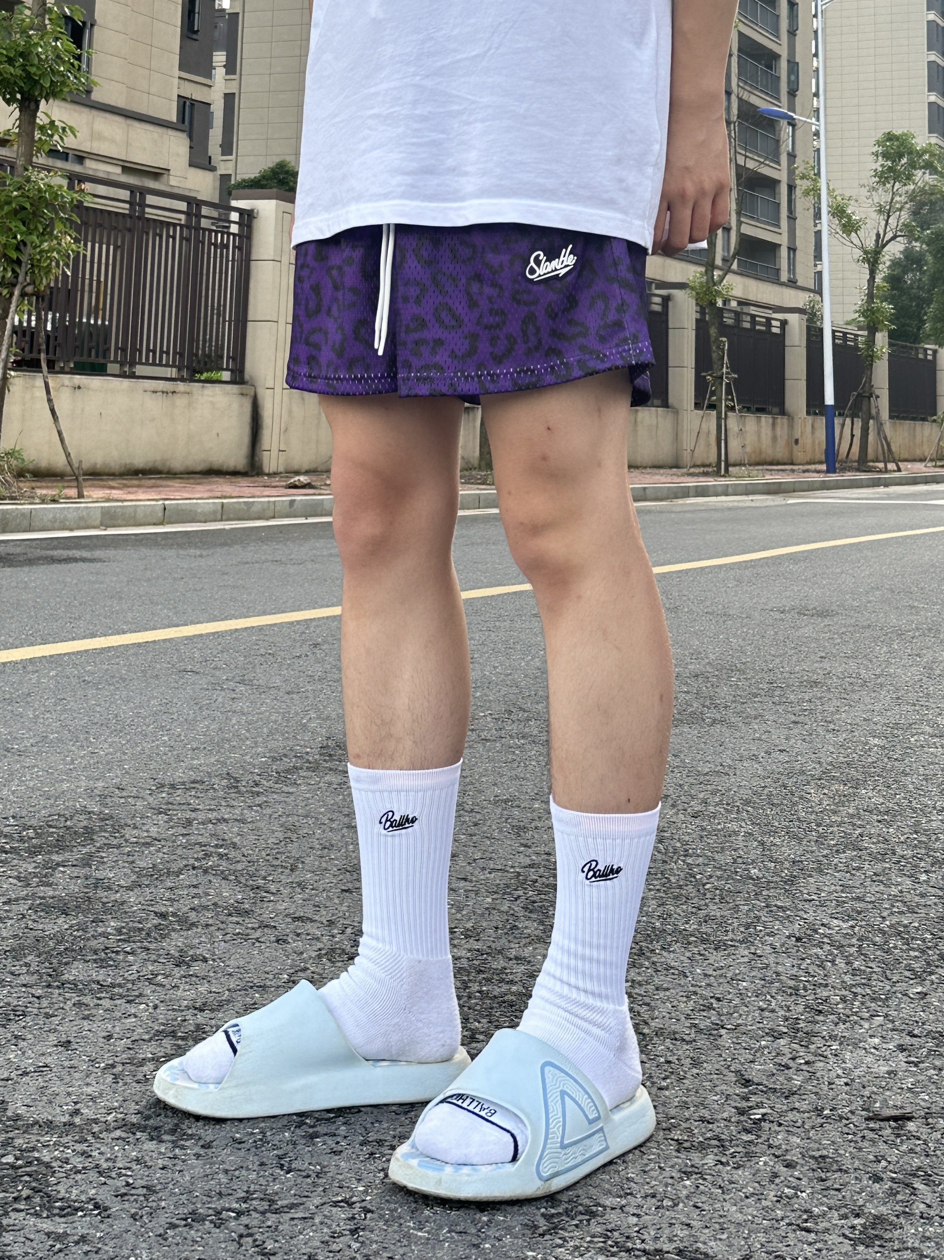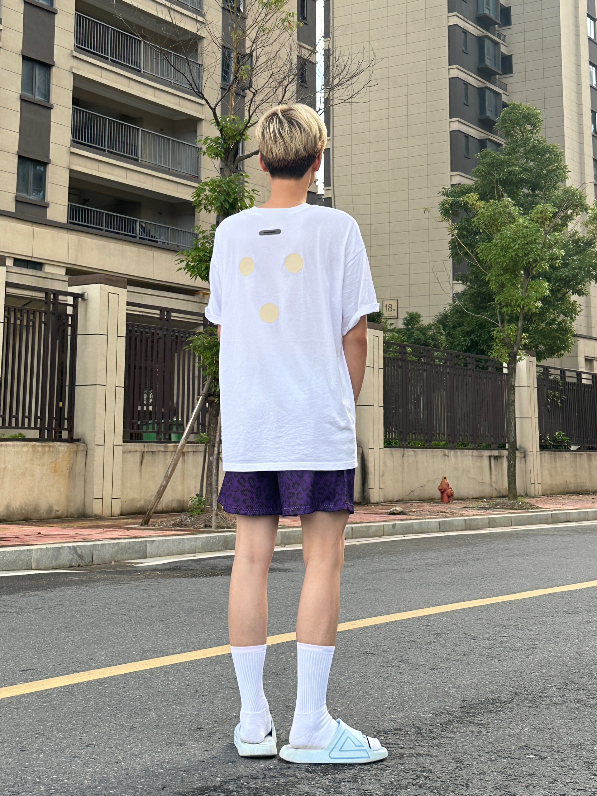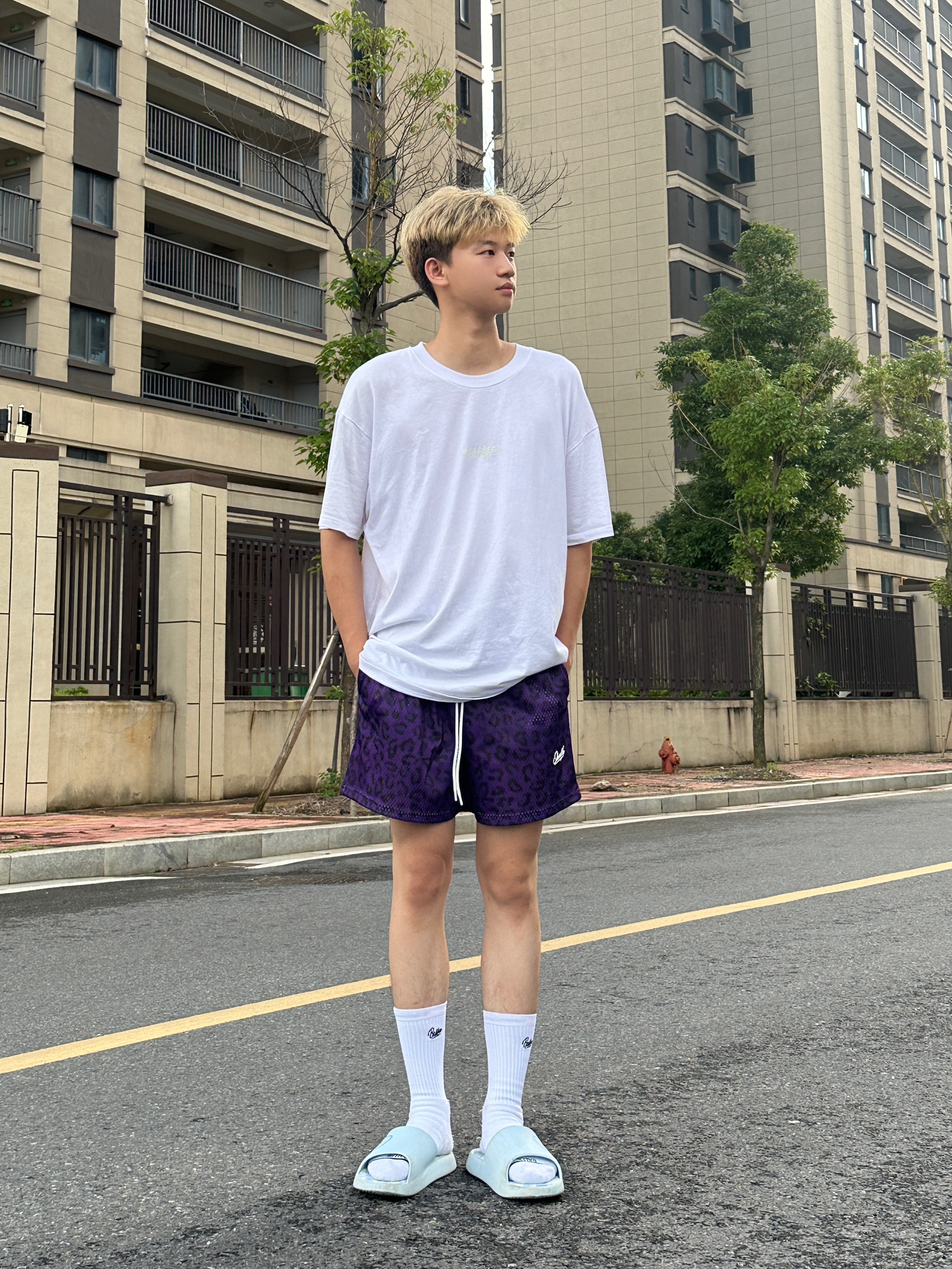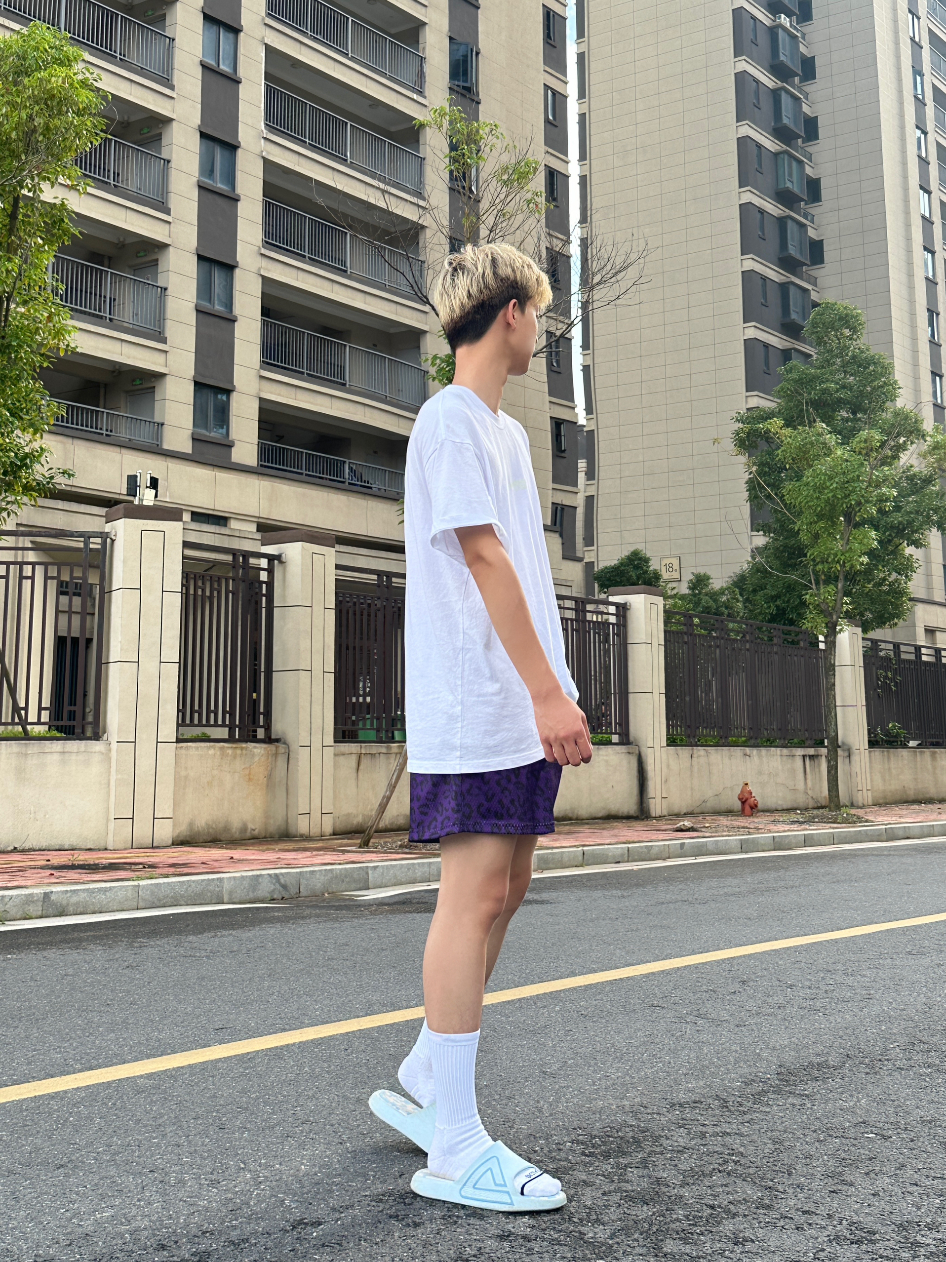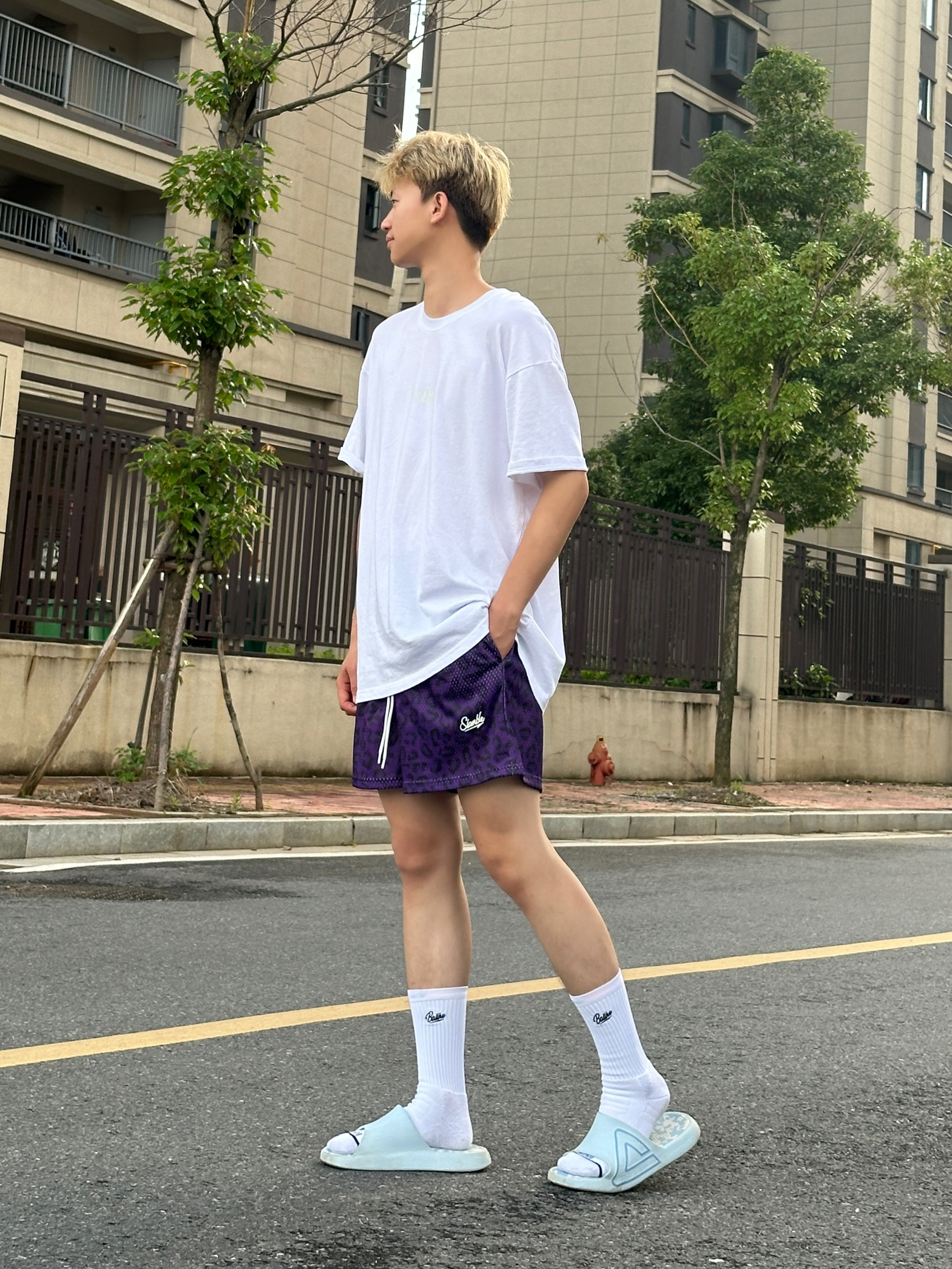 今天是很简约的一套穿搭 白色的简约T恤 搭配很有亮点的紫色豹纹短裤 不过膝的设计真的很显腿长 搭配一双匹克的拖鞋 夏日随意感直接拿捏