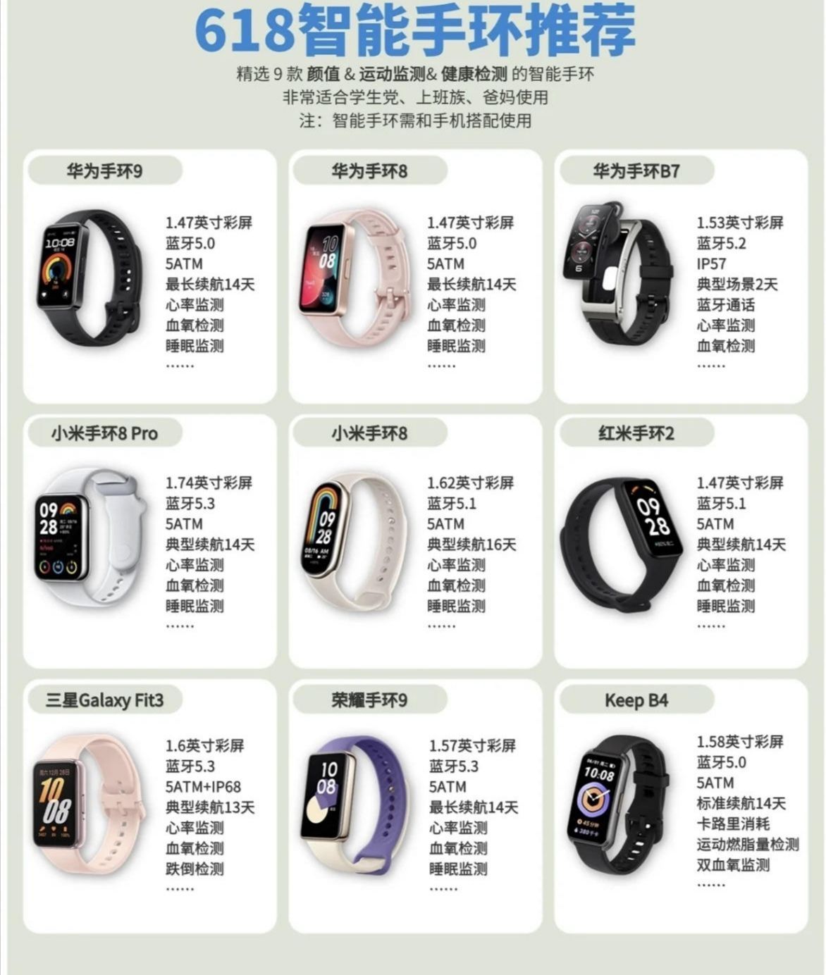 618快到了,除了手机外,数码配件如智能手环是否引起你的关注? 现在的智能手环除了手机厂商(华力、三星、荣耀、小米、红米、OPPO)生产外,佳明(价格较高)、Keep、乐心等也有想过产品。 智能手环除了基本的运动监测功能,个别手环还具有心率、血氧、睡眠、压力、女性生理周期管理甚至蓝牙通话等功能,个别手环还分标准版和NFC 版,大家根据个人使用需求选择即可。 另外,手环基本都兼容iOS系统(苹果手机...