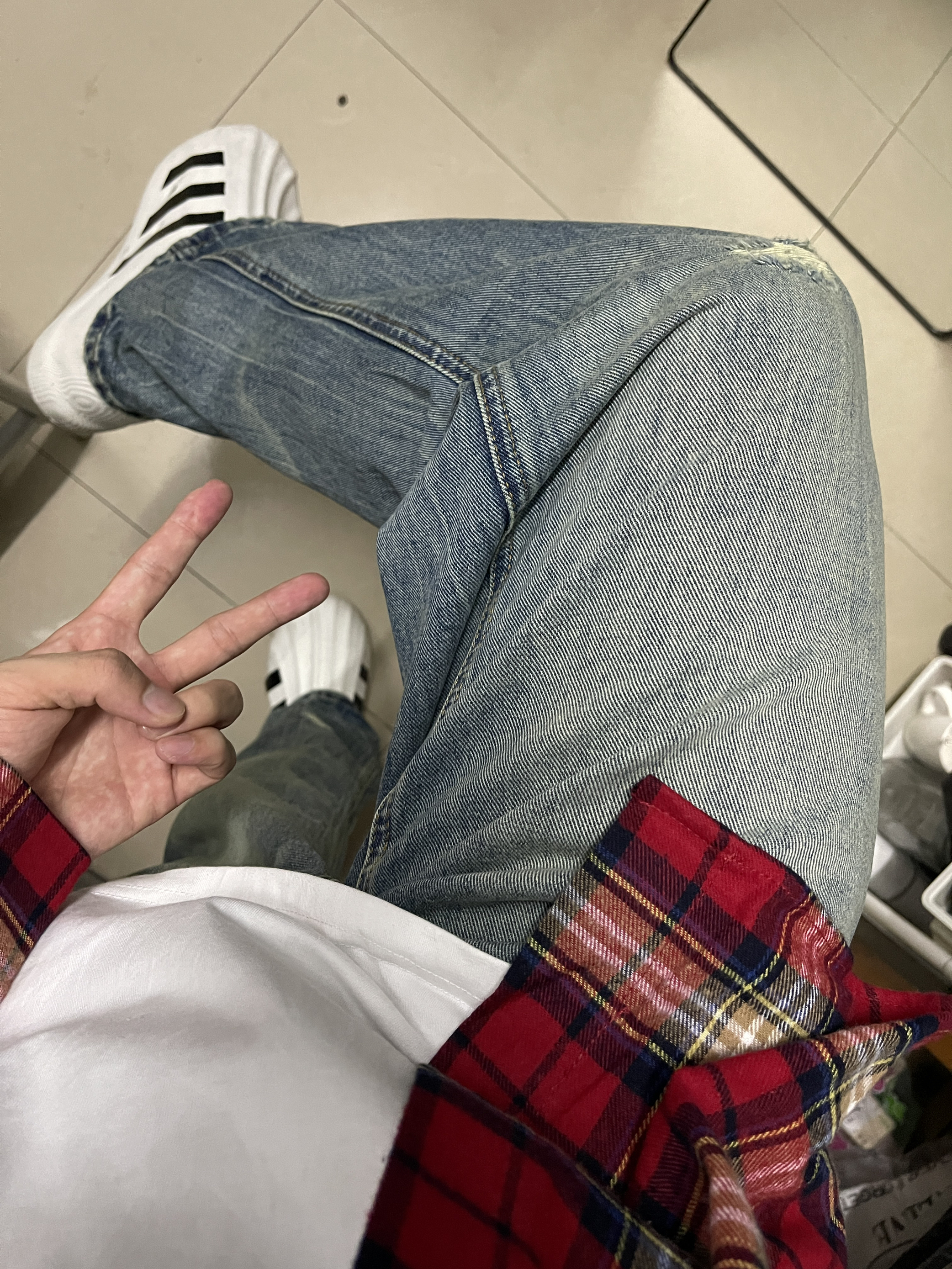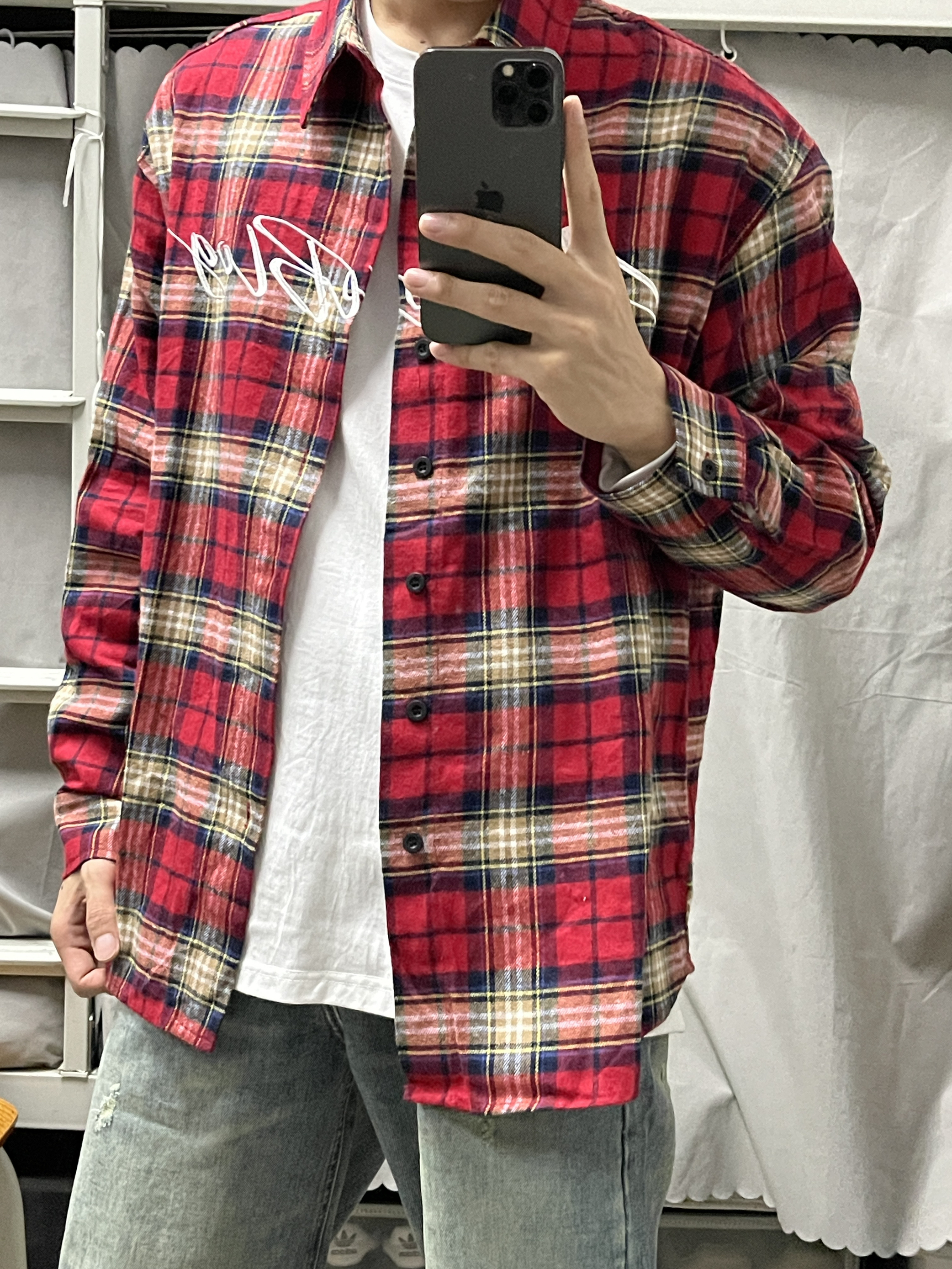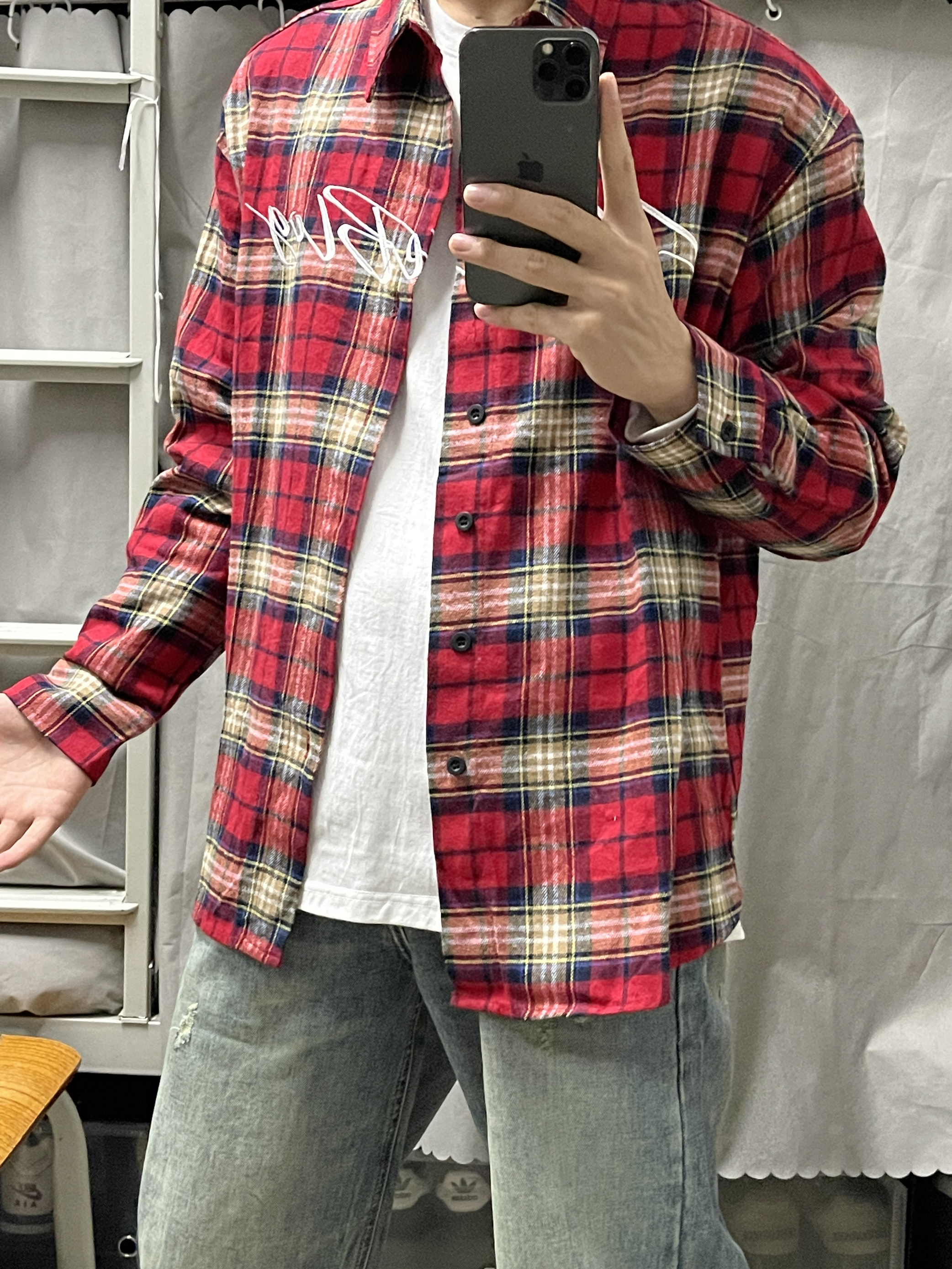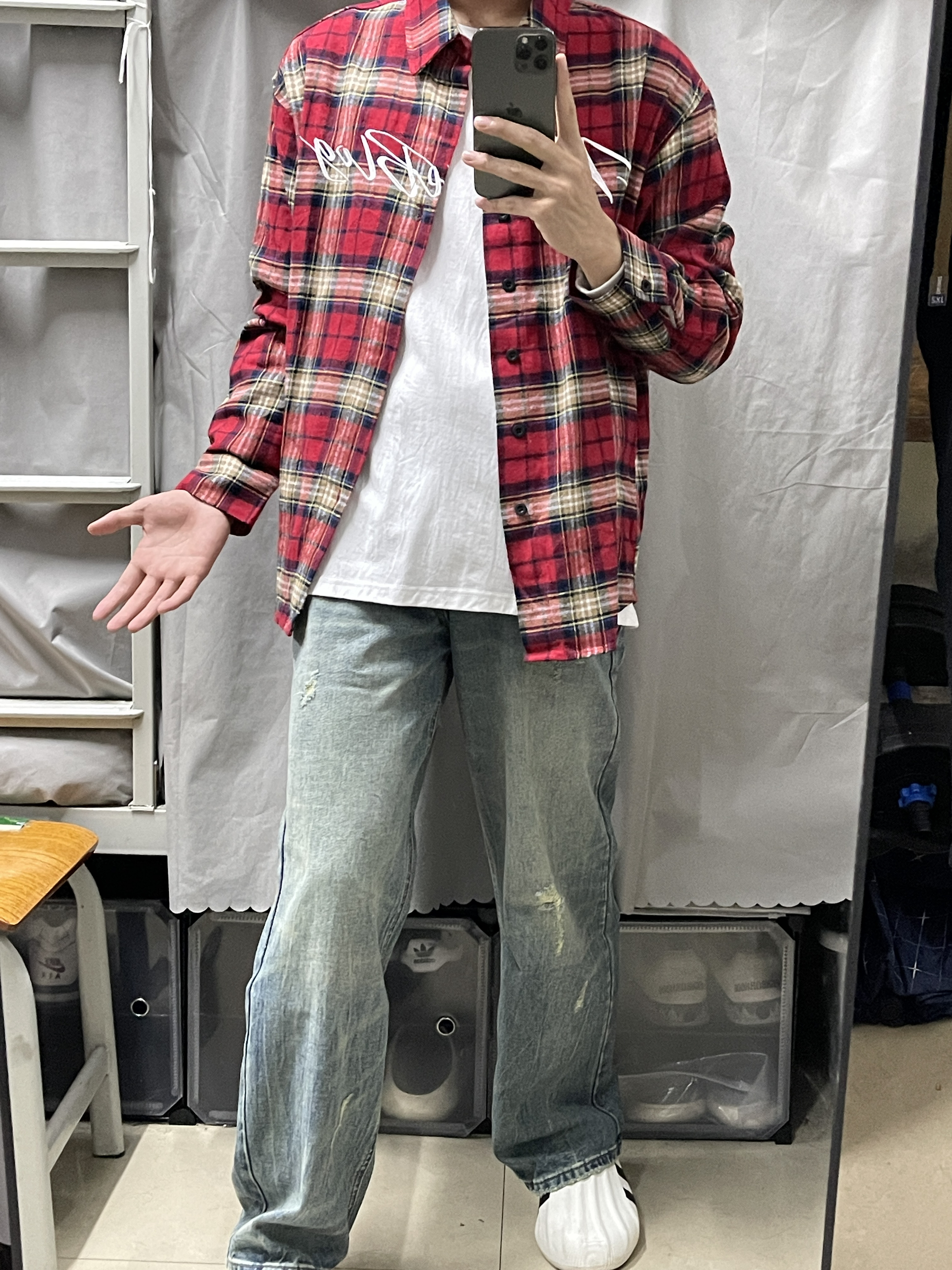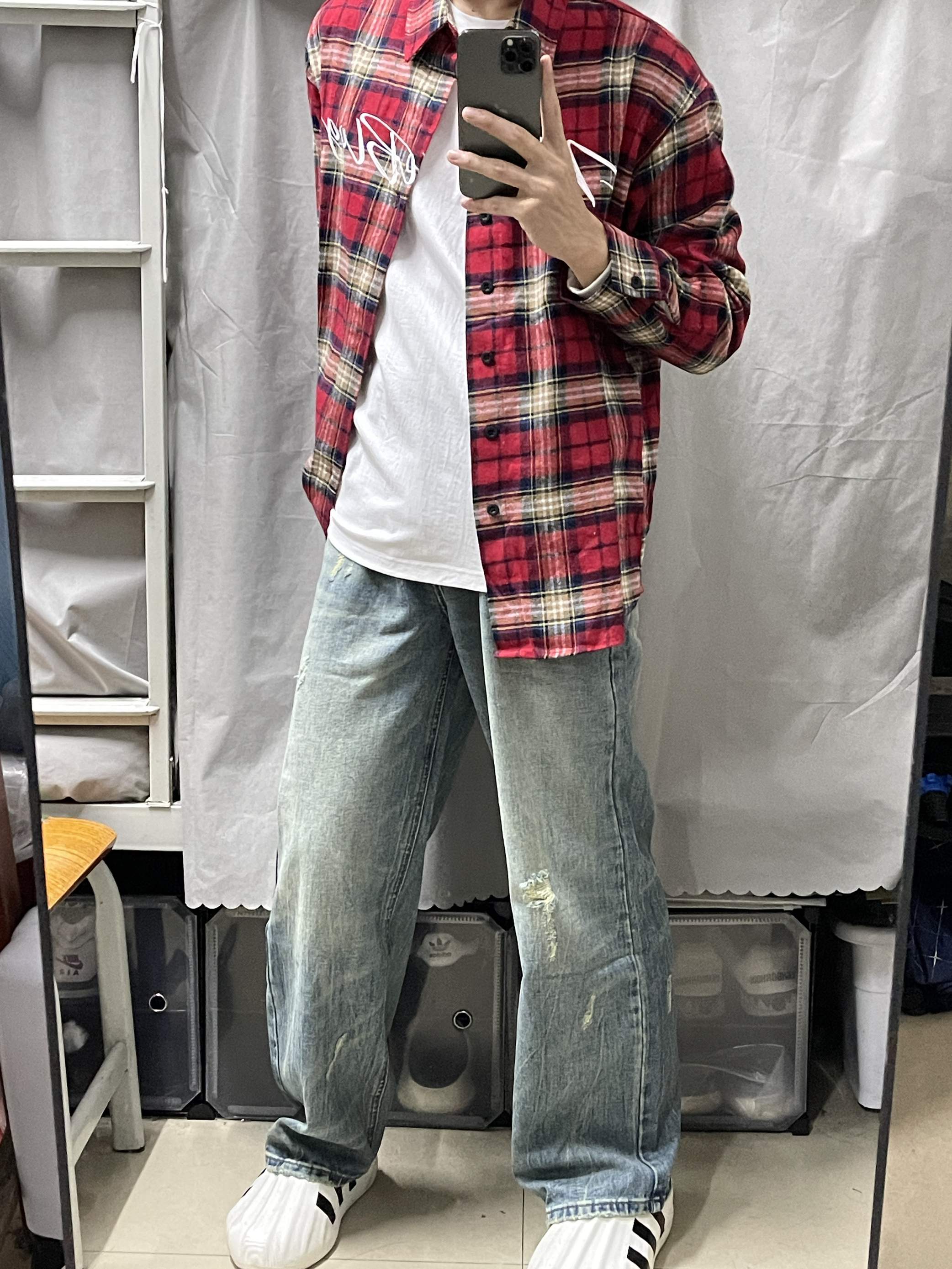 今日份穿搭: 一上半身 美式复古个性红色格子衬衫刺绣字母短袖衬衫的面料柔软透气,摸起来很滑顺,穿在身上感觉很轻松。格子图案很经典,而且颜色搭配得很好看,让人一眼就能注意到。 一下半身 美式复古水洗破洞阔腿高腰潮牌做旧宽松直筒牛仔裤 这条牛仔裤真的很百搭,无论是搭配T恤还是衬衫,都能显得很有品味。而且它的质量也很好,我看得到一些细节的地方,比如缝线和口袋,都做得很精致。 一每天更新不同穿搭,感谢支持...