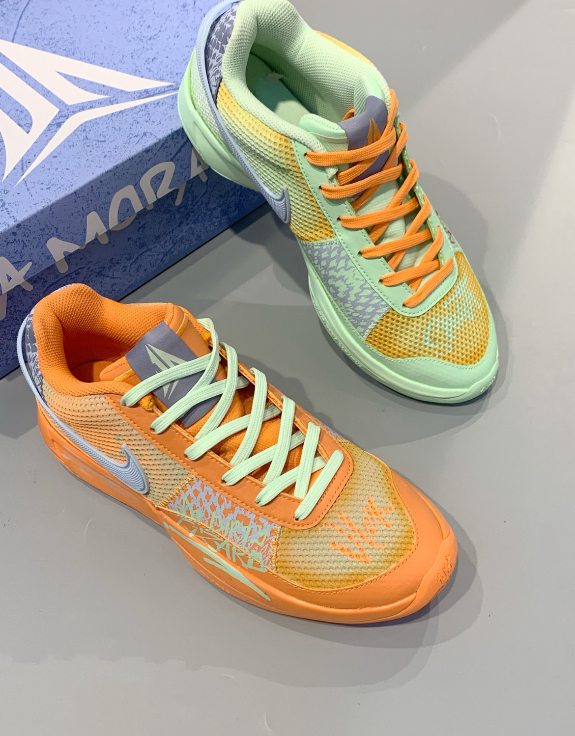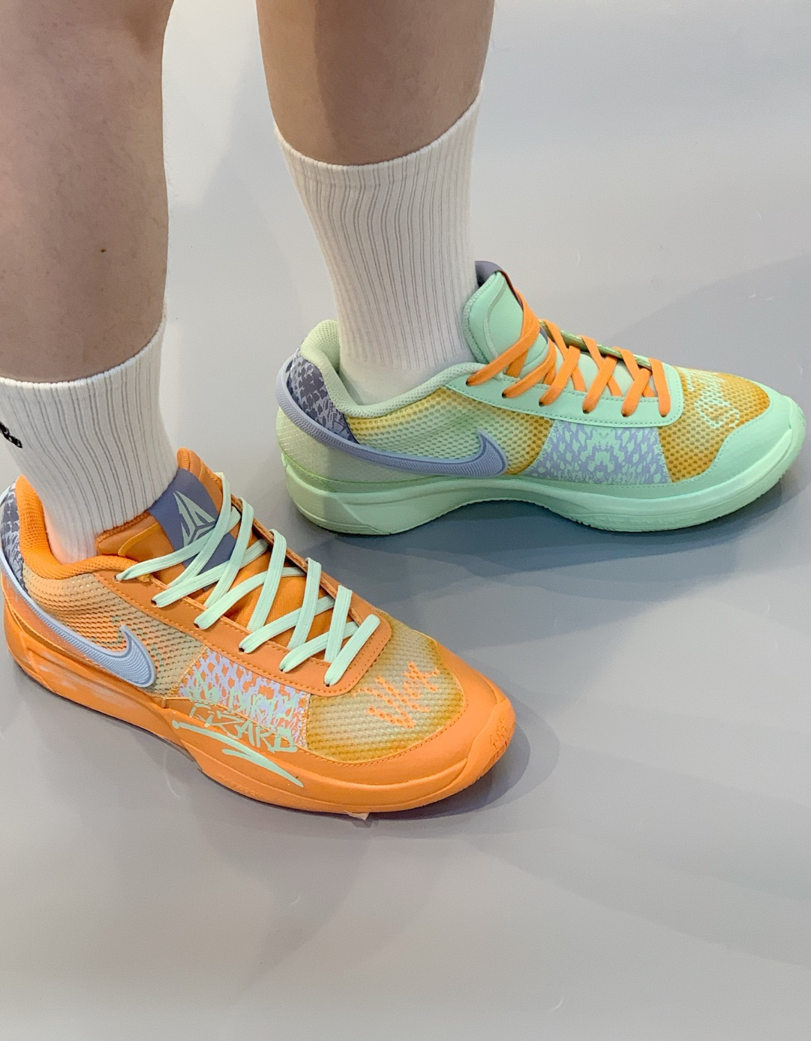夏天的第一双篮球鞋有点猛|绿橙鸳鸯鞋! 第一次尝试这么亮的篮球鞋还是绿橙色的 一只脚穿着哈密瓜,一只脚穿着橙子走在街上回头率百分百 这么特别,球场上都舍不得穿了 搭配篮球短裤,工装短裤穿不会很刺眼只会更好看!