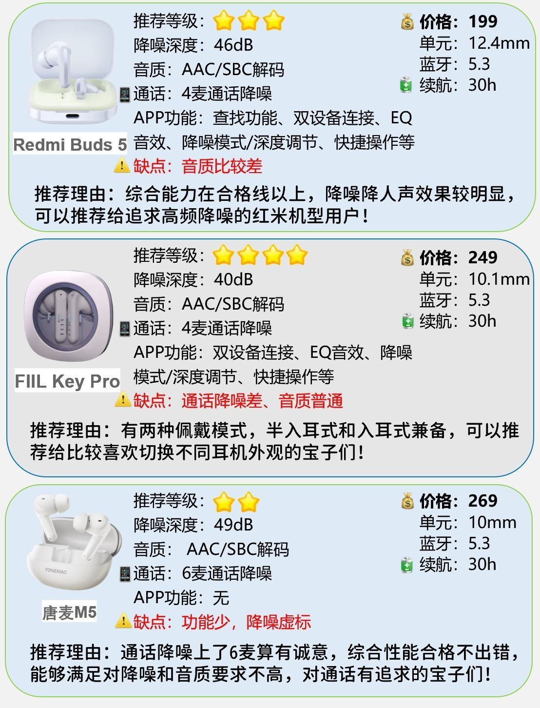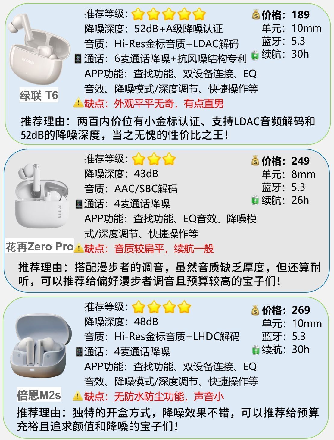 本篇笔记关联了Edifier/漫步者 花再 Zero Buds 半入耳式 蓝牙 耳机 真无线 高音质 长续航 降噪 运动 通话音乐 荼白色、Baseus/倍思 M2S 入耳式 蓝牙 耳机 真无线 深度降噪 超长续航 主动降噪 高音质 低延迟 ANC 抗风噪 空间音效 皓月白、UGreen/绿联 HiTune T6 入耳式 蓝牙 耳机 真无线 主动降噪 高音质 低延迟 超长续航 半入耳 运动 白色等商品,为用户提供真实的使用体验和购买参考。