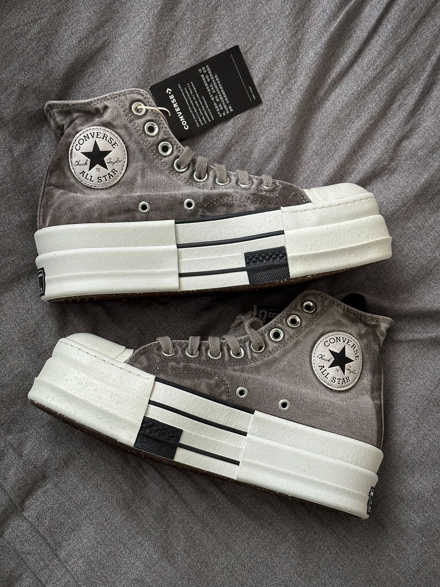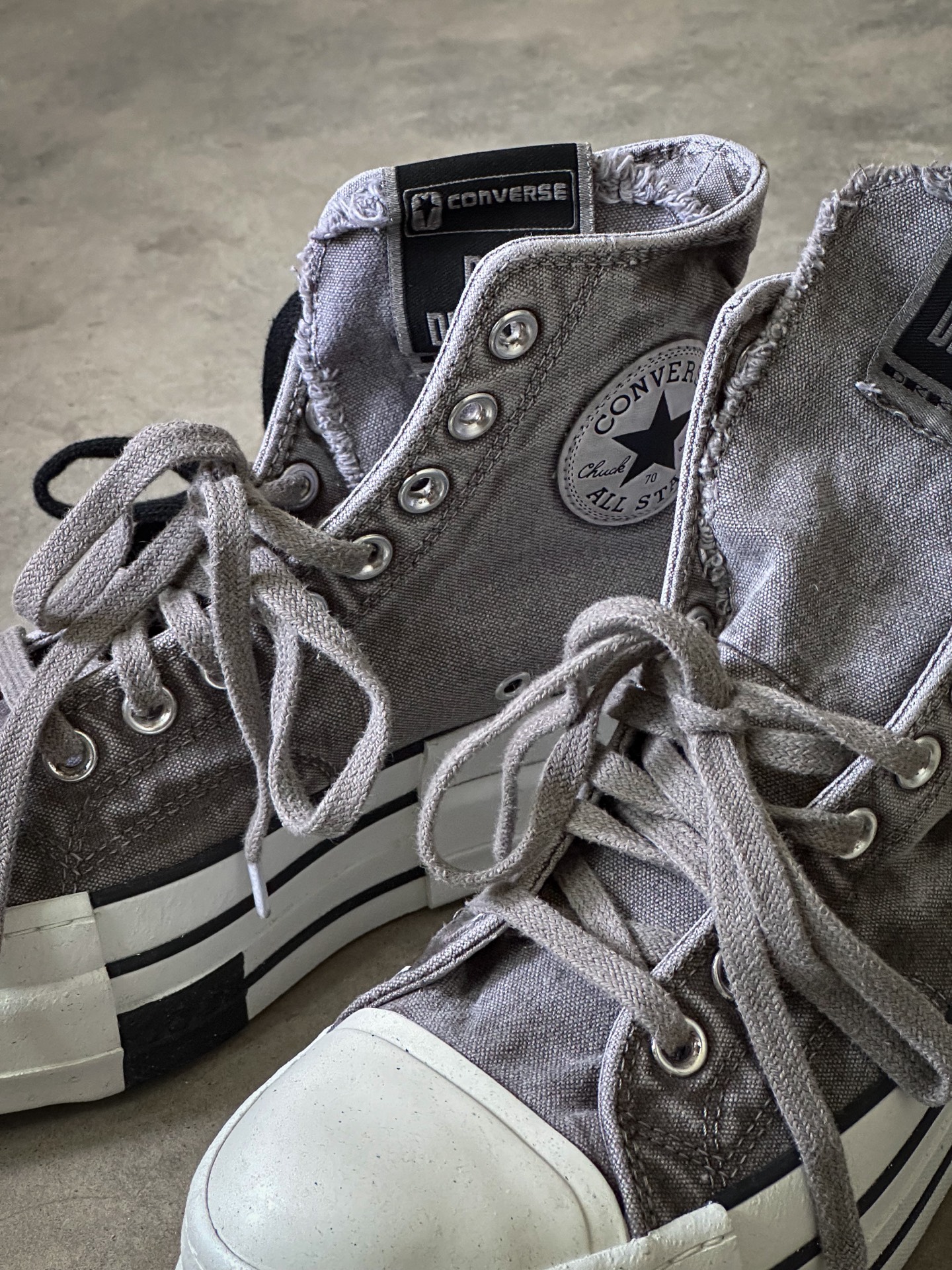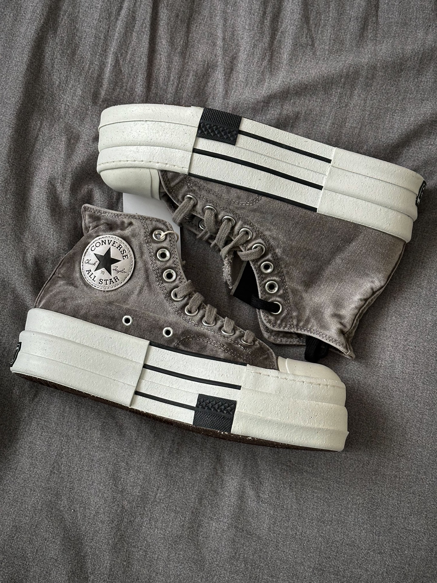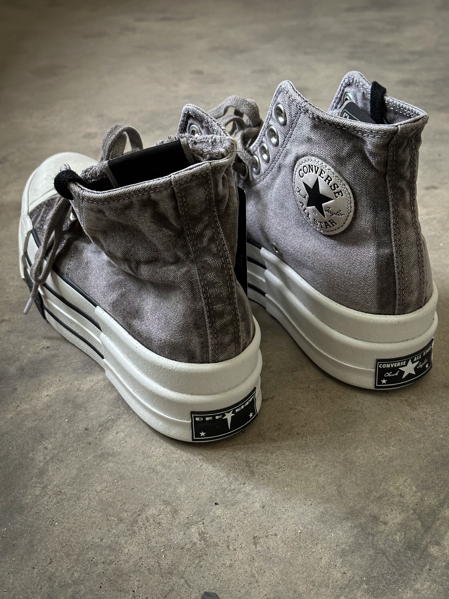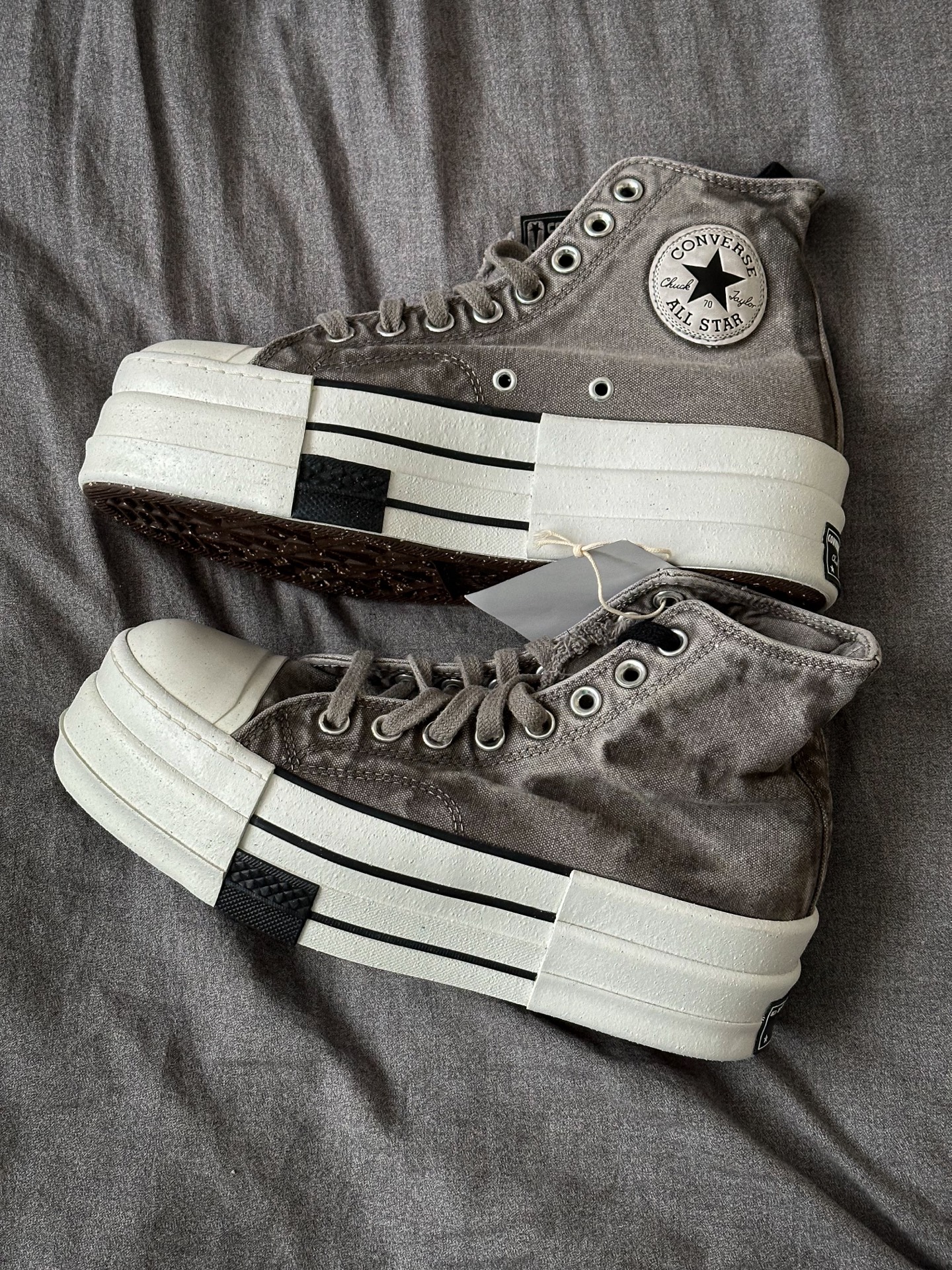Rick Owens DRKSHDW x CONVERSE Chuck 70 这次厚底应该是2.0版本,上回白色低帮和黑色高帮都是比较OG的保守配色,这次的灰色和棕色真让我眼前一亮💡,特别是这个灰色,布料的水洗做旧感很强,鞋舌毛边细节,废土感满满 缺点,💰1499的发售价我觉得是有点贵的,毕竟它只是双帆布鞋 #RICKOWENS #这双匡威很难不爱 #匡威厚底帆布鞋 #这双匡威超帅 #...