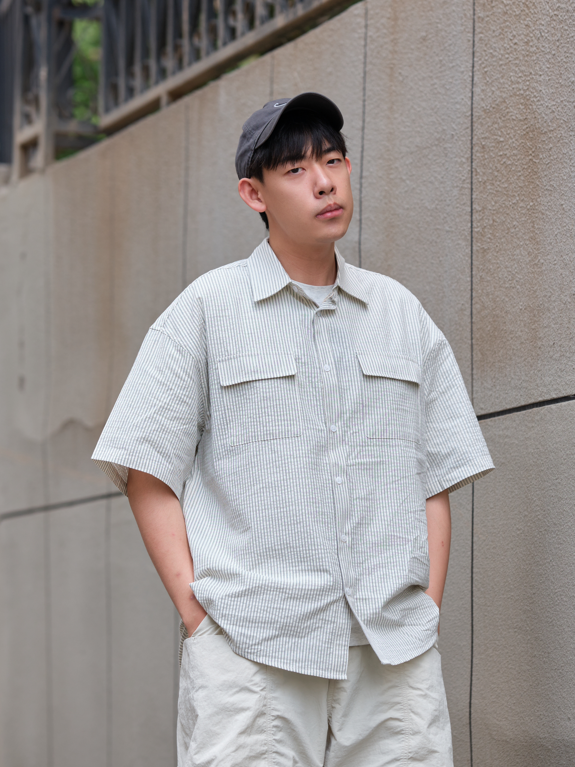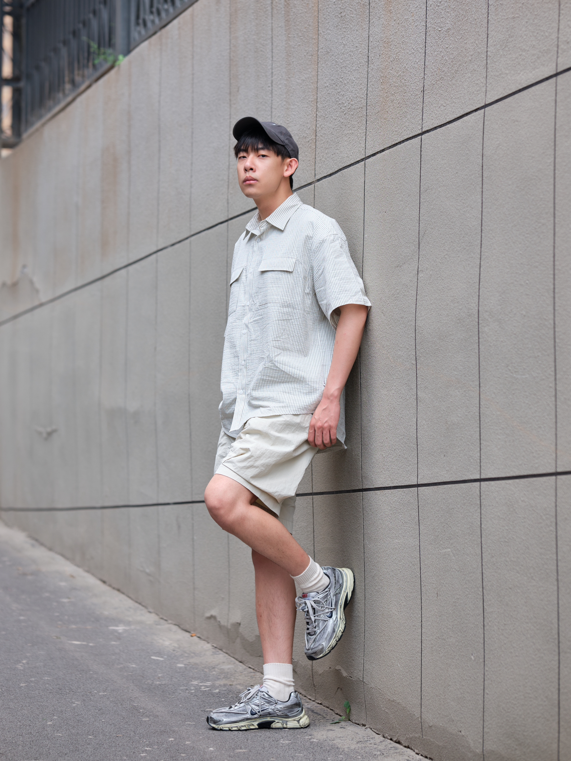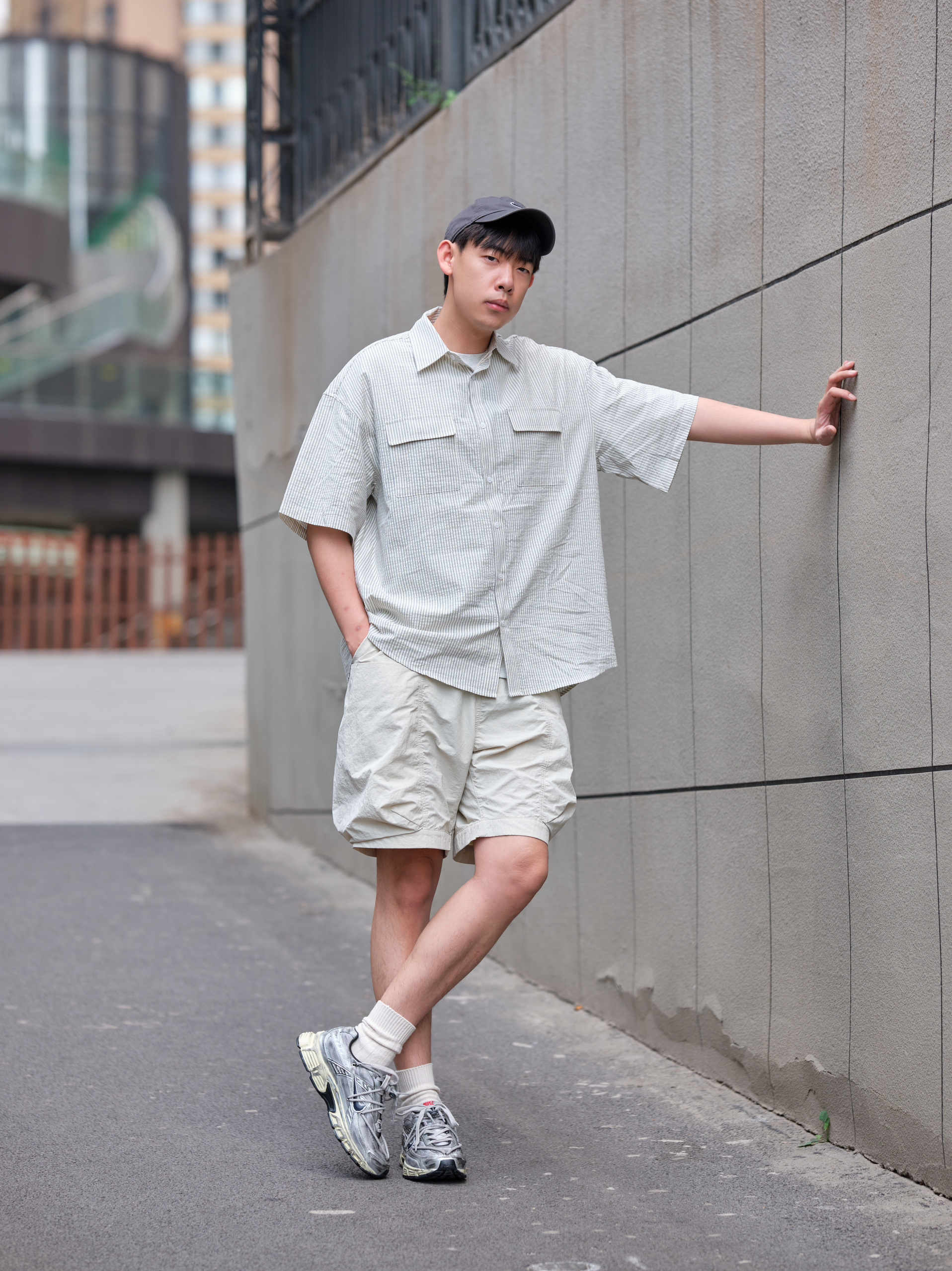 哟!wassup!大家好 夏日浅色系outfit 这样也能打造街头风? 上半身一件灰白色衬衫 来自URBAN STANDARD 宽松版型设计 适合夏天的泡泡纱面料 竖条纹十口袋点缀 整体上身简约又有小细节 再搭配白色工装短裤把色彩很好的过渡 上脚这双定制款Nike Initiator 做旧处理搭配机能绑带设计 复古又不失层次感最后色棒球帽呼应 浅色系穿搭照样打造街头氛围