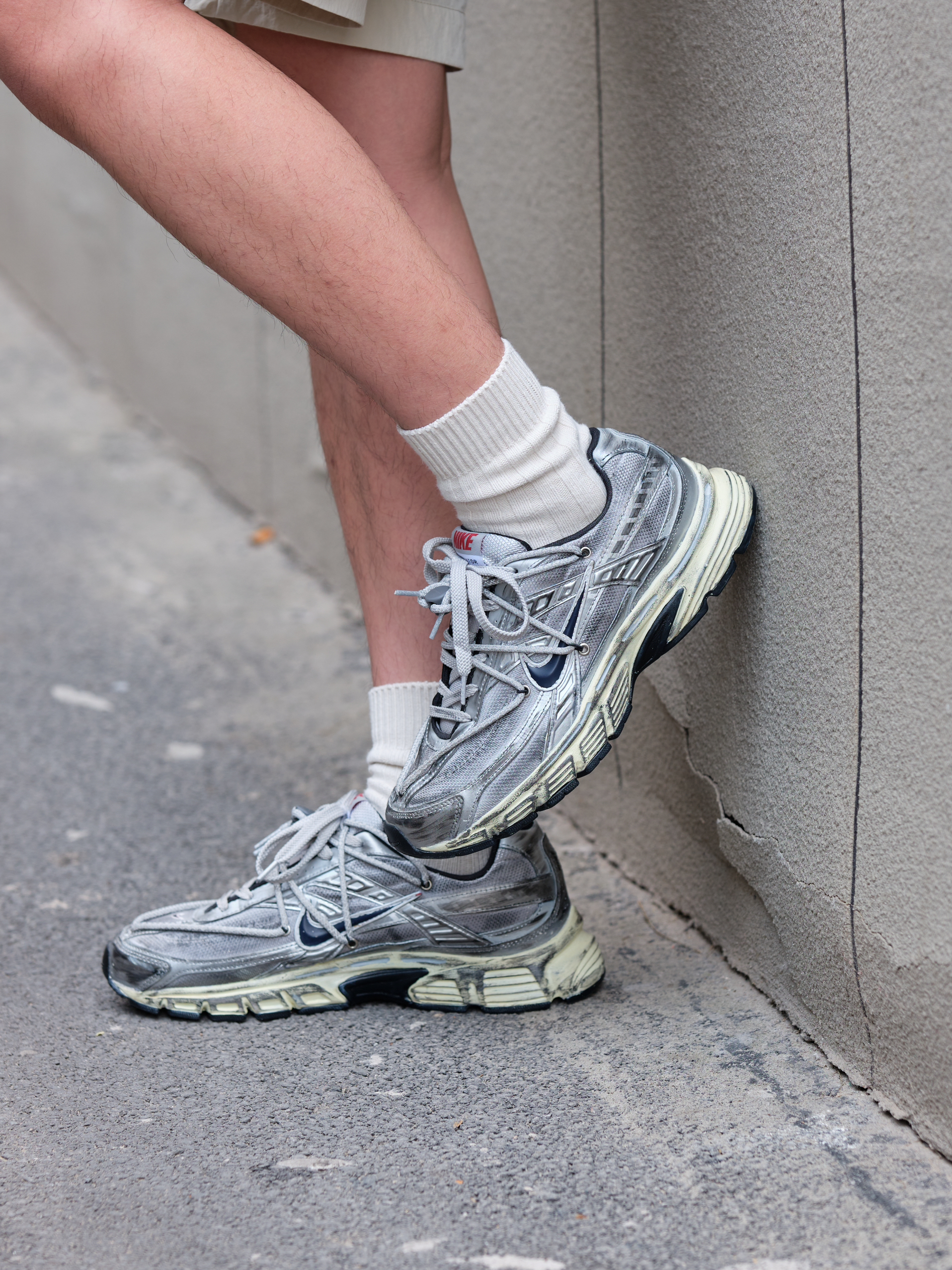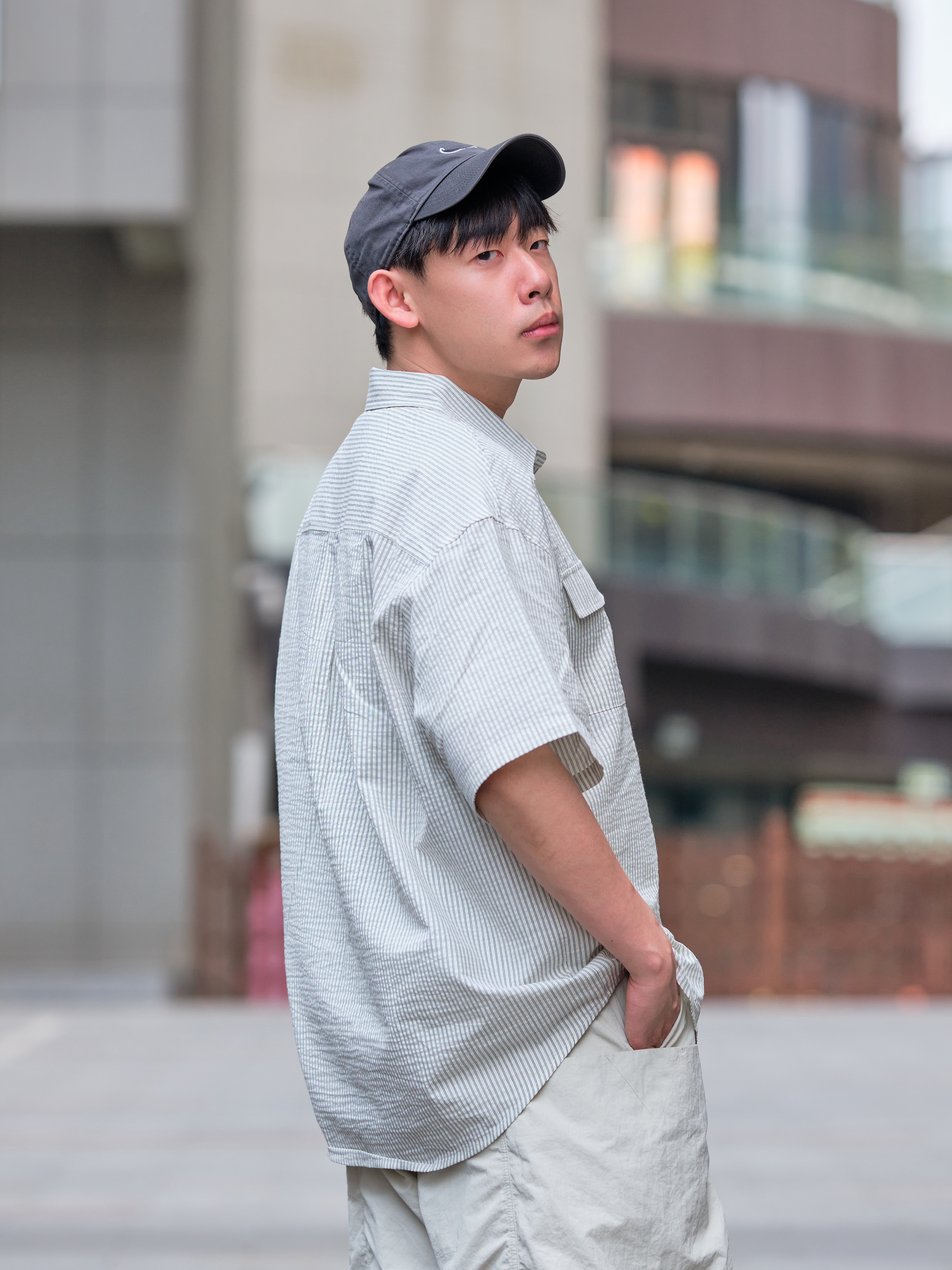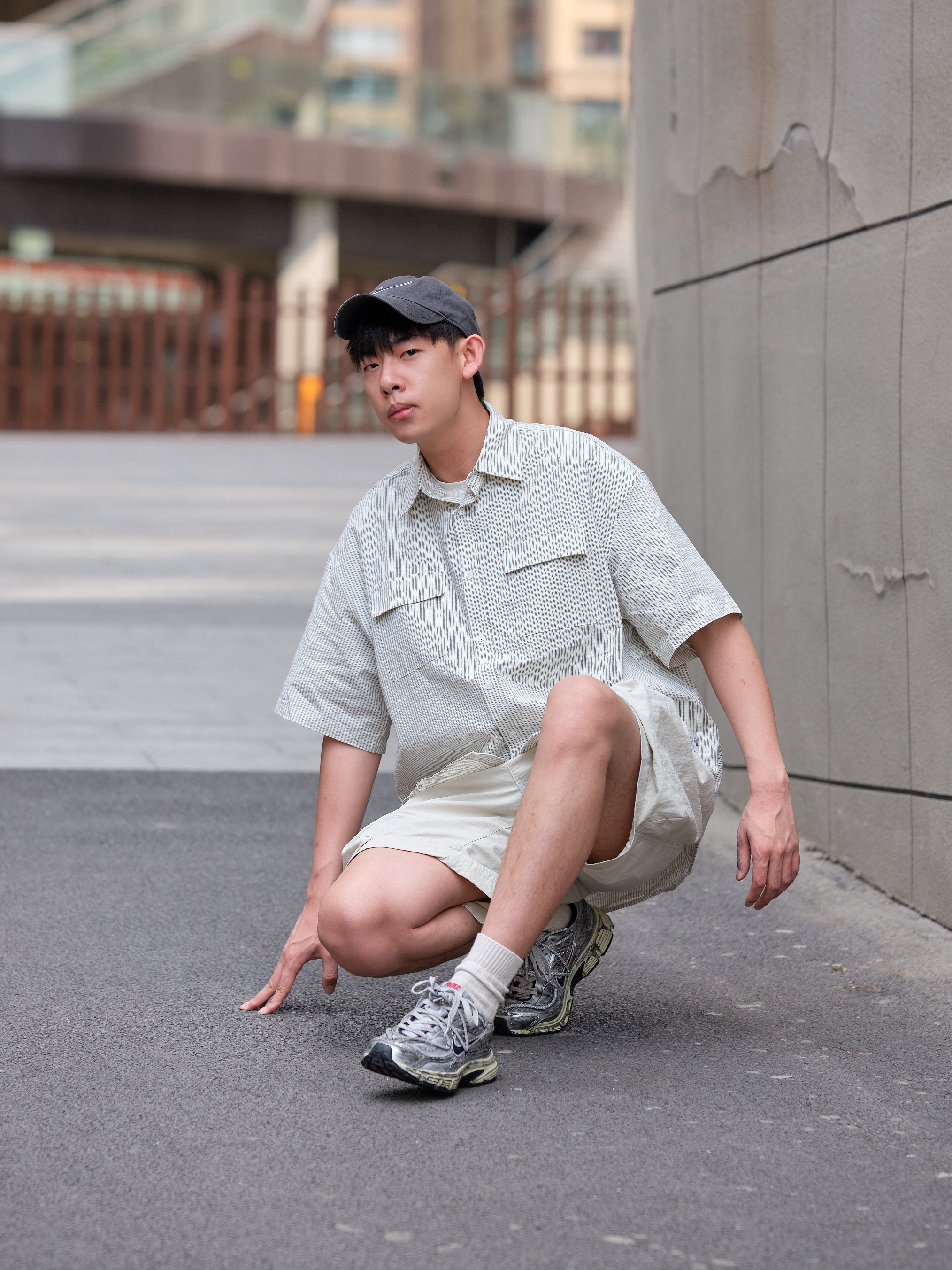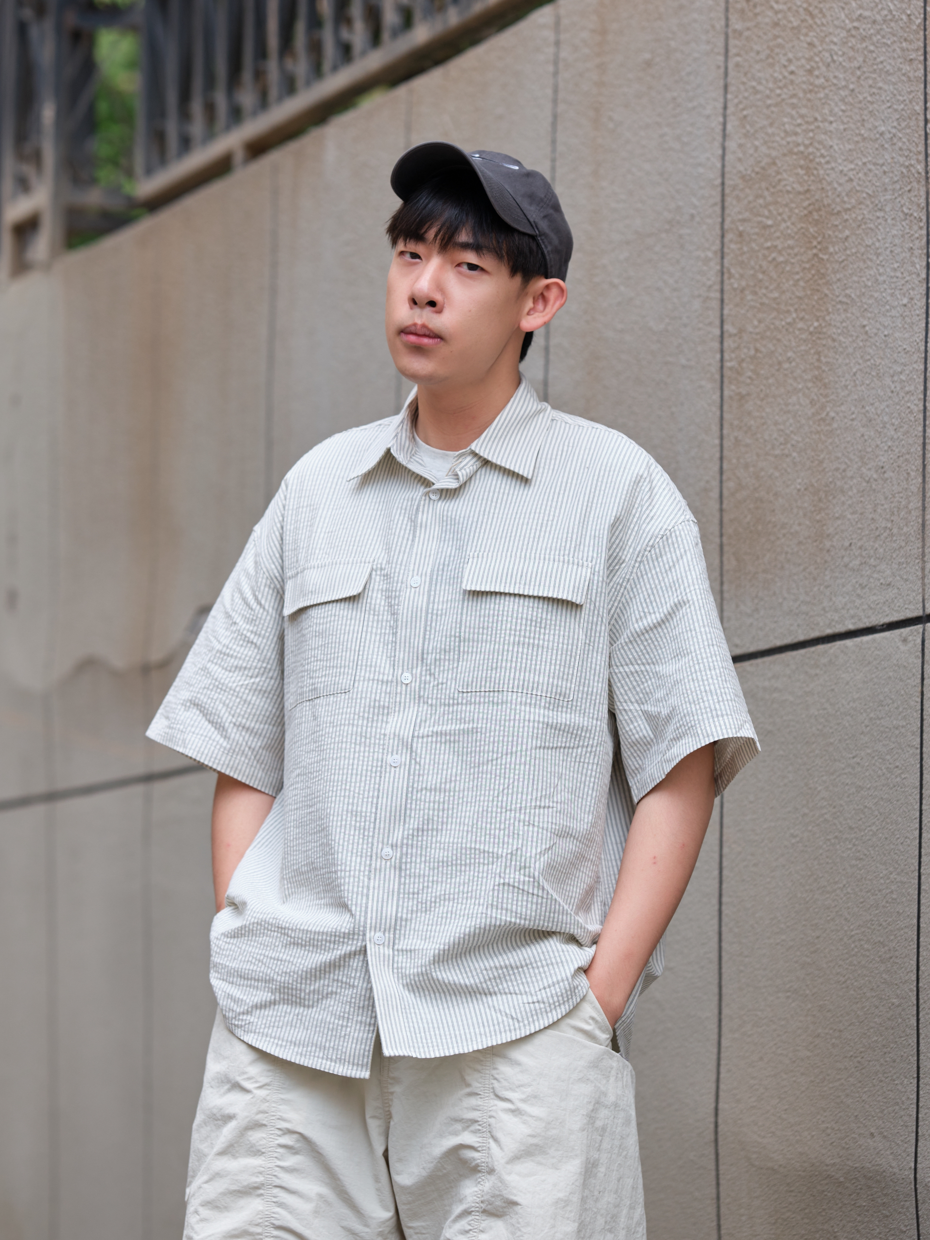 哟!wassup!大家好 夏日浅色系outfit 这样也能打造街头风? 上半身一件灰白色衬衫 来自URBAN STANDARD 宽松版型设计 适合夏天的泡泡纱面料 竖条纹十口袋点缀 整体上身简约又有小细节 再搭配白色工装短裤把色彩很好的过渡 上脚这双定制款Nike Initiator 做旧处理搭配机能绑带设计 复古又不失层次感最后色棒球帽呼应 浅色系穿搭照样打造街头氛围