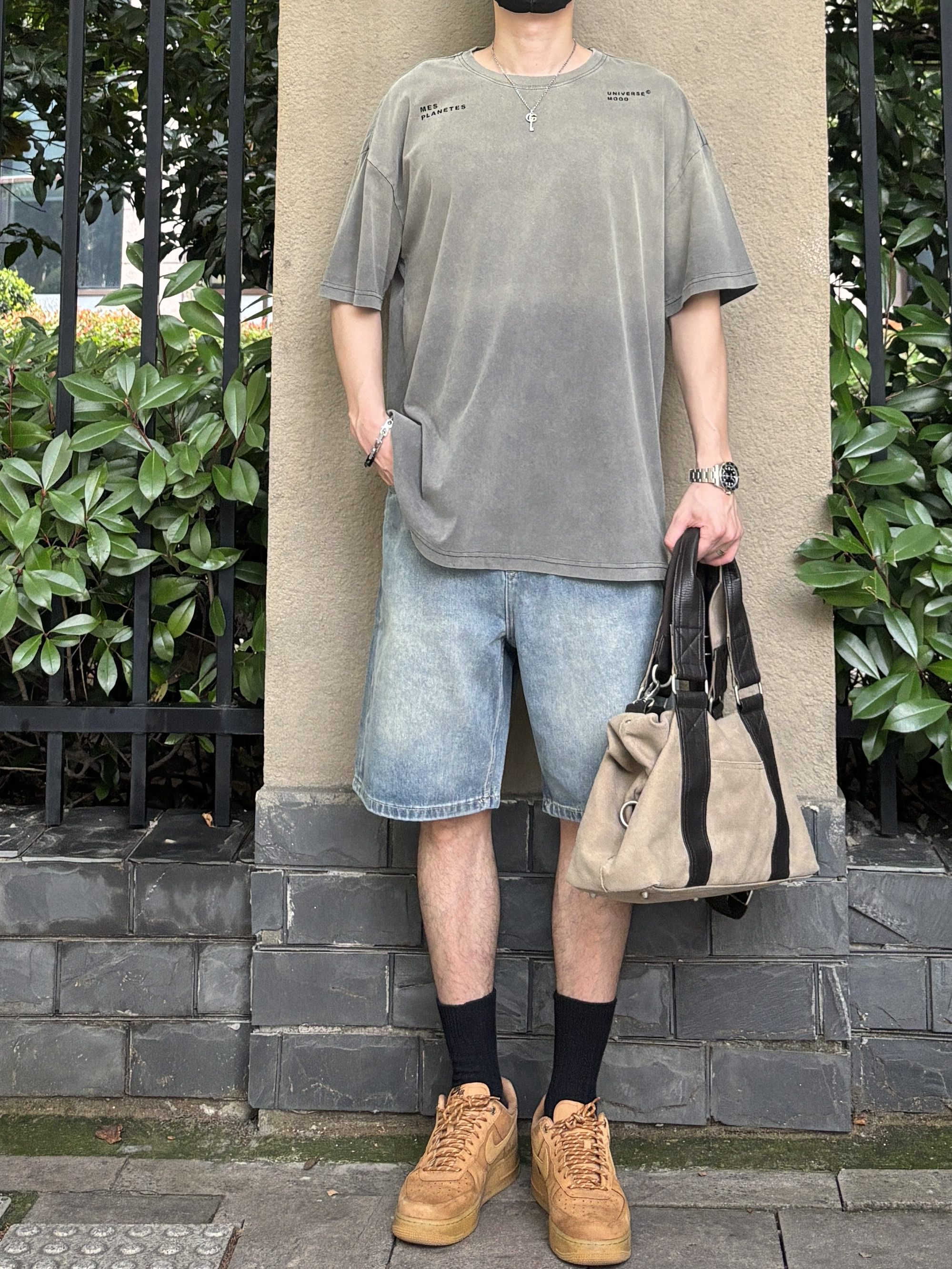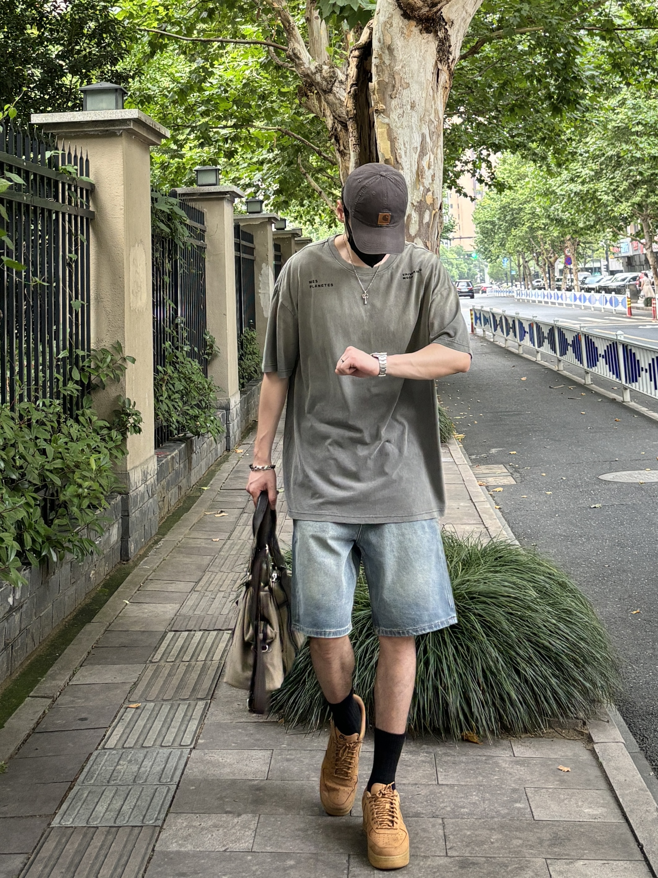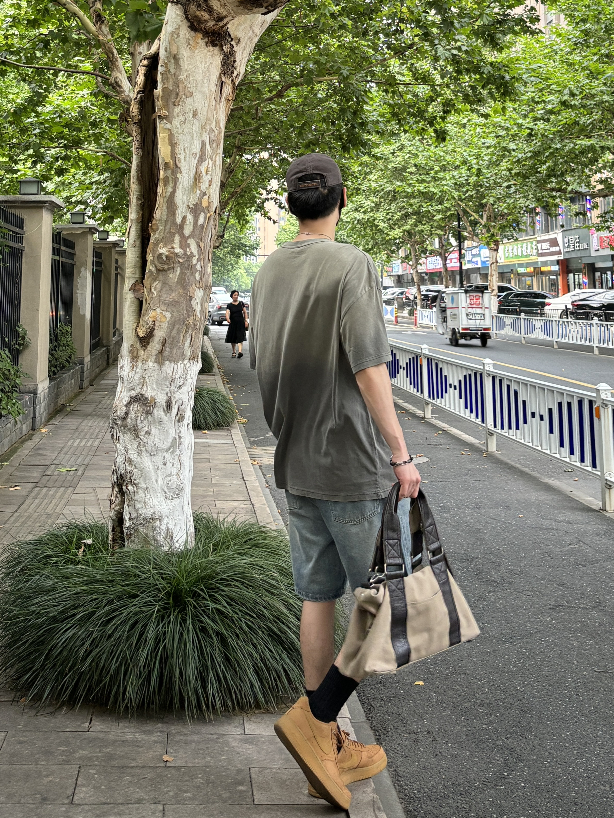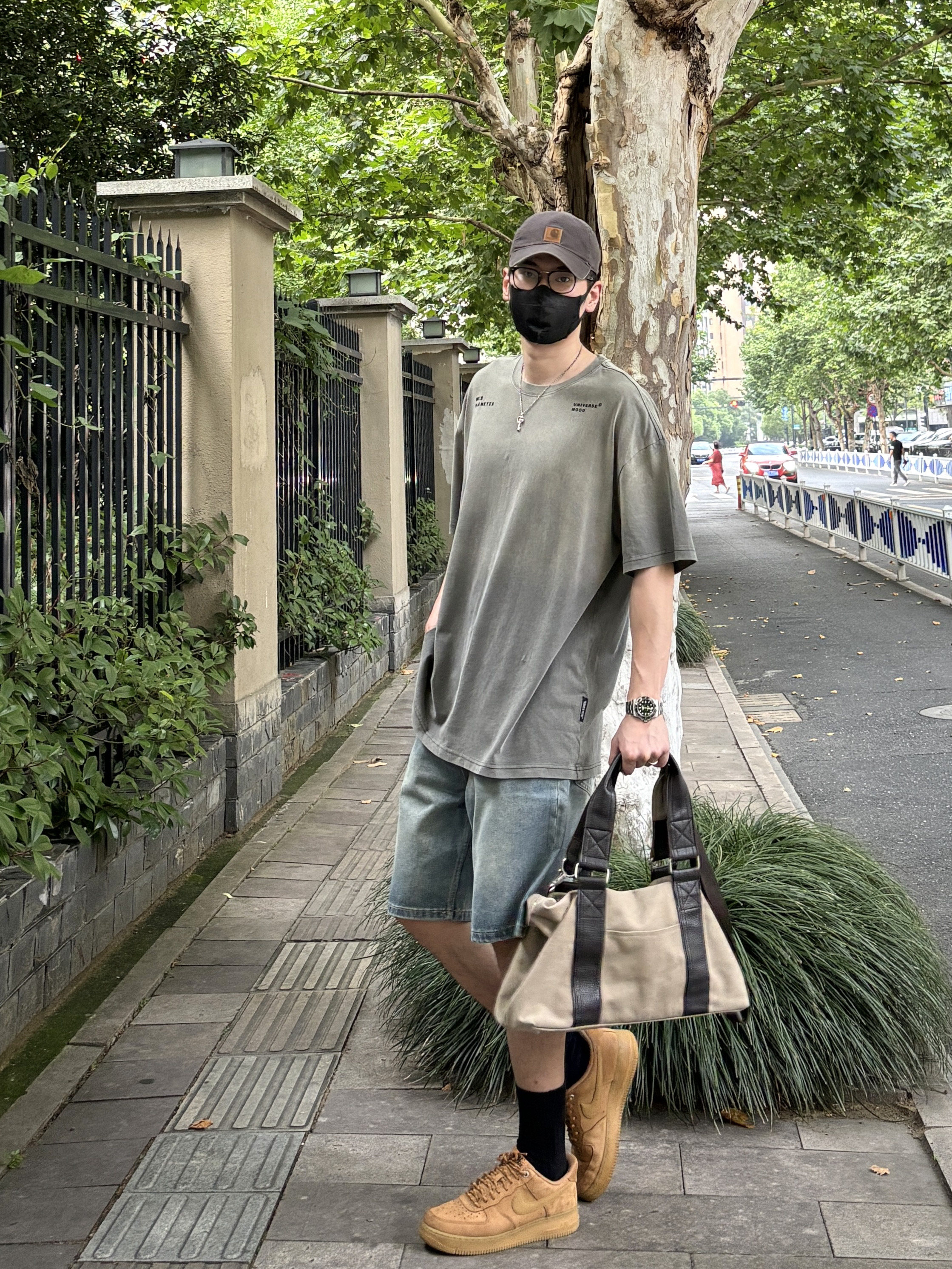 今天这套上衣穿了一件军绿色宽松阔版水洗做旧字母印花圆领T恤 ⬇️ 裤子选择简约大方的水洗直筒牛仔短裤 ⬇️ 鞋子上脚经典百搭的小麦色af1 ⬇️ 最后拿上大容量帆布拼接手提包 - 今日搭配 衣服裤子都来自:NICE LILI 鞋子:AF1小麦