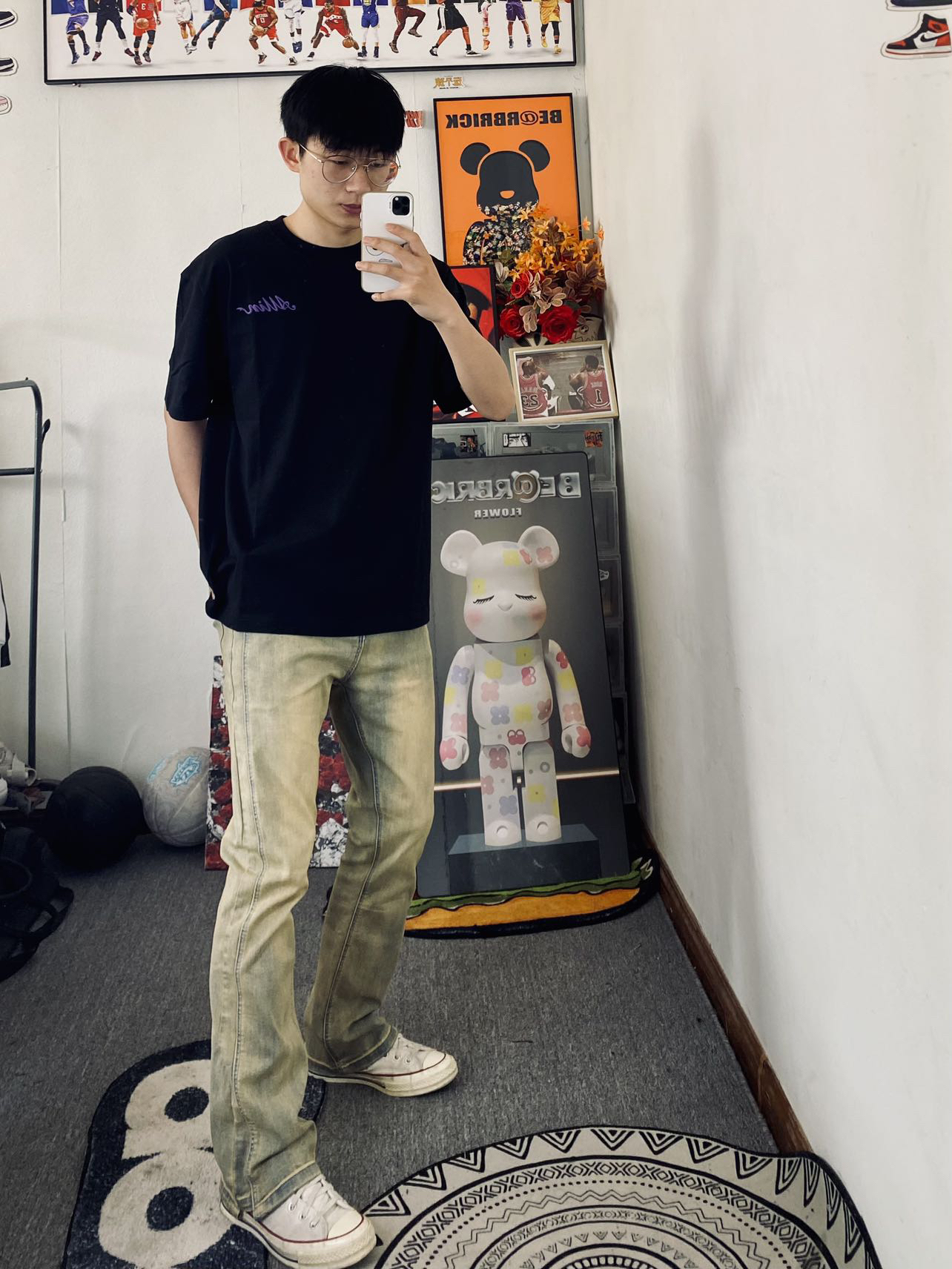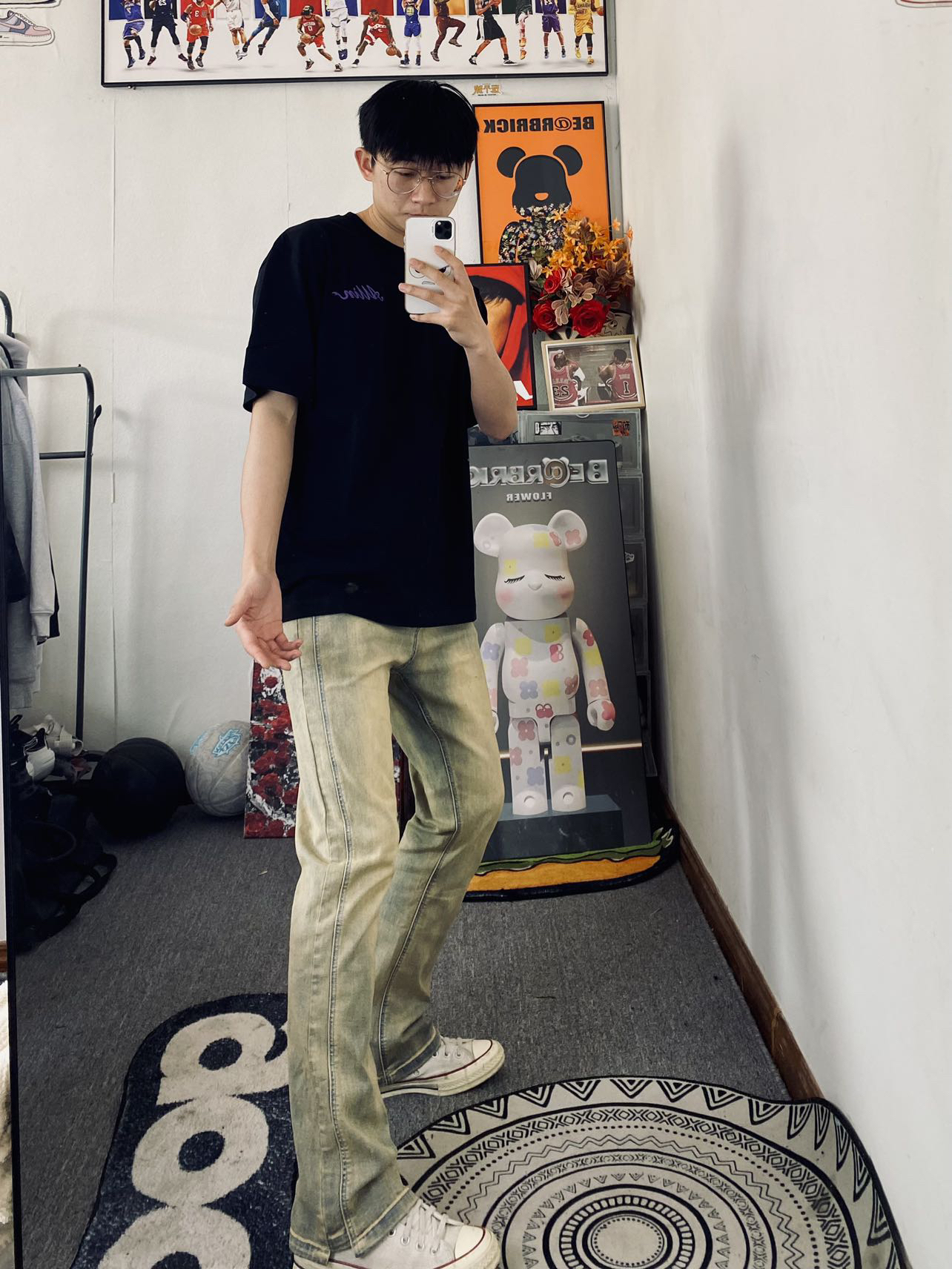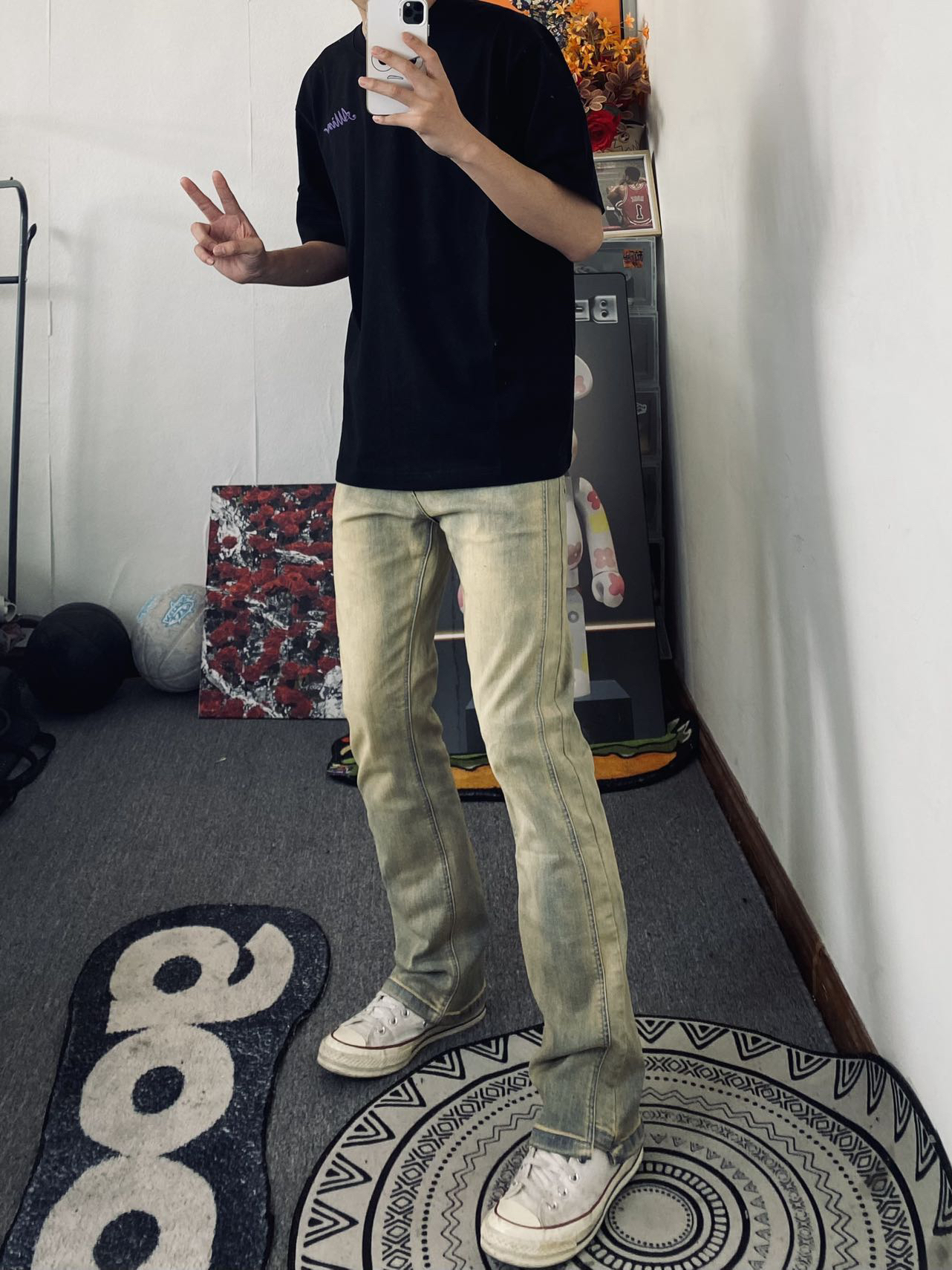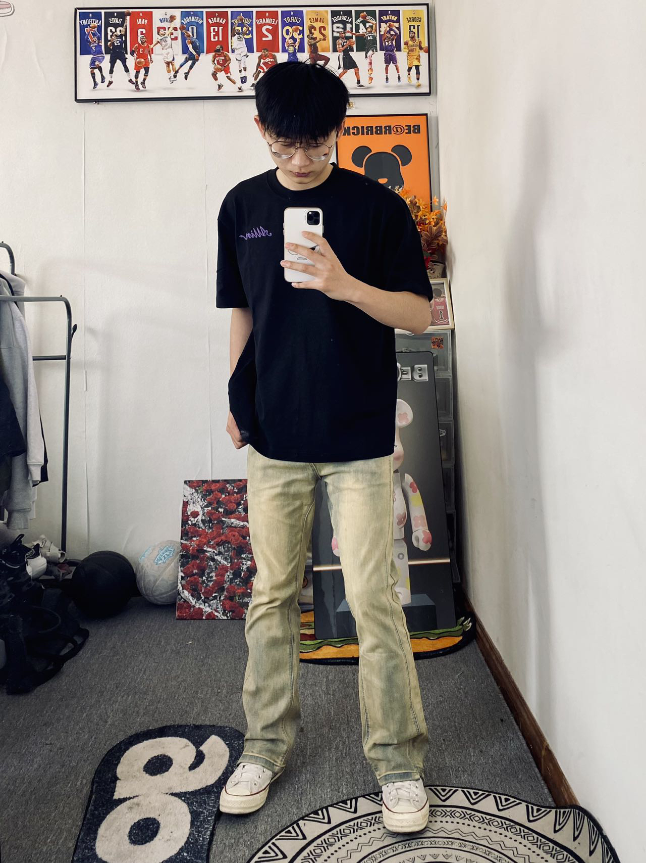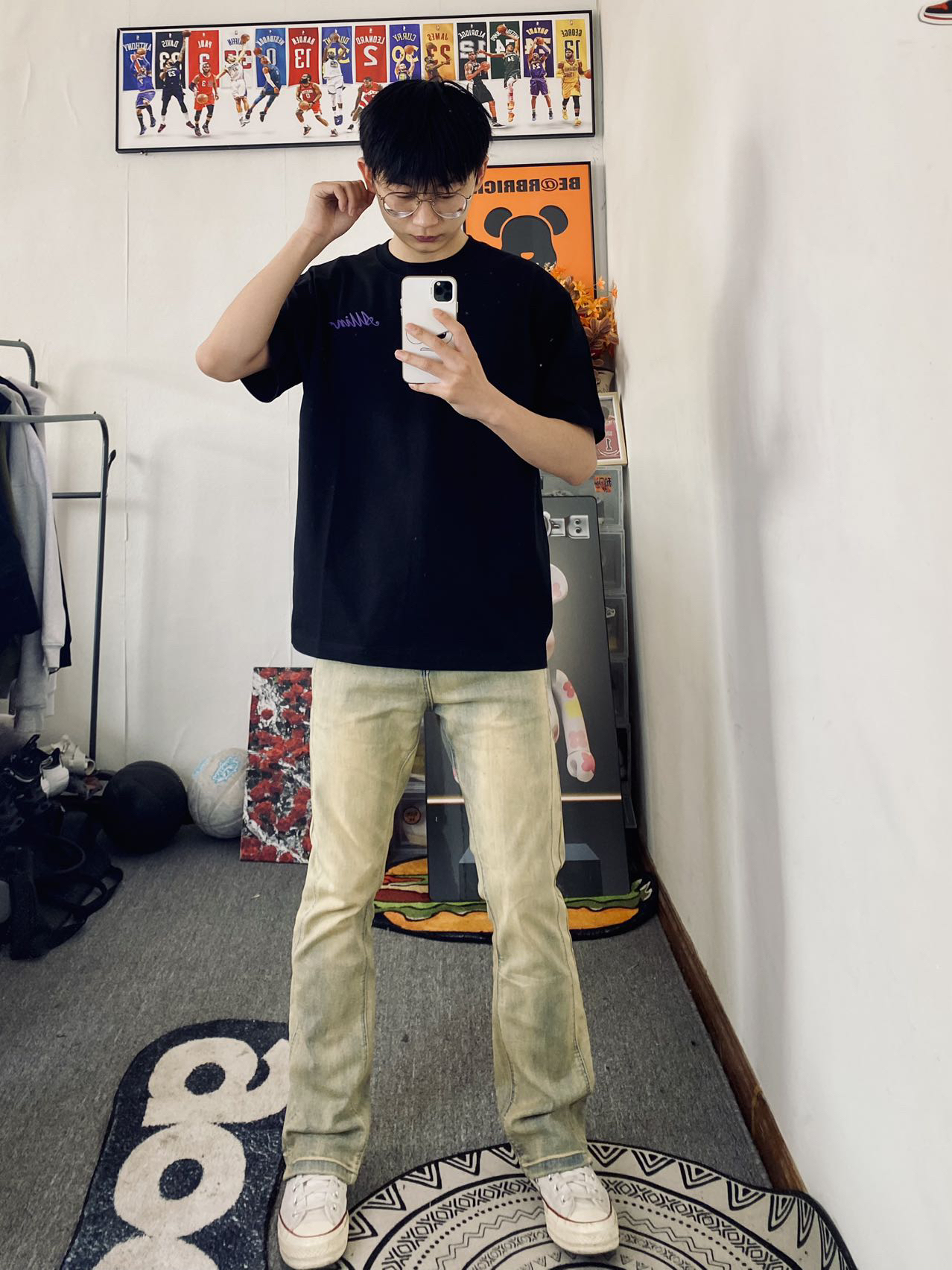 🌹冰美式今日穿搭 👔衣服是一件字母印花圆领短袖 宽松版型显瘦遮肉 独特的印花Logo设计新颖独特💐 — 👖裤子是一条美式水洗直筒牛仔裤 黄泥色是最近比较火的一款牛仔裤氛围感十足 微弹面料穿着舒适度满满💕 — 👟匤威白色1970S — 身高/体重:178/130衣服L裤子XL