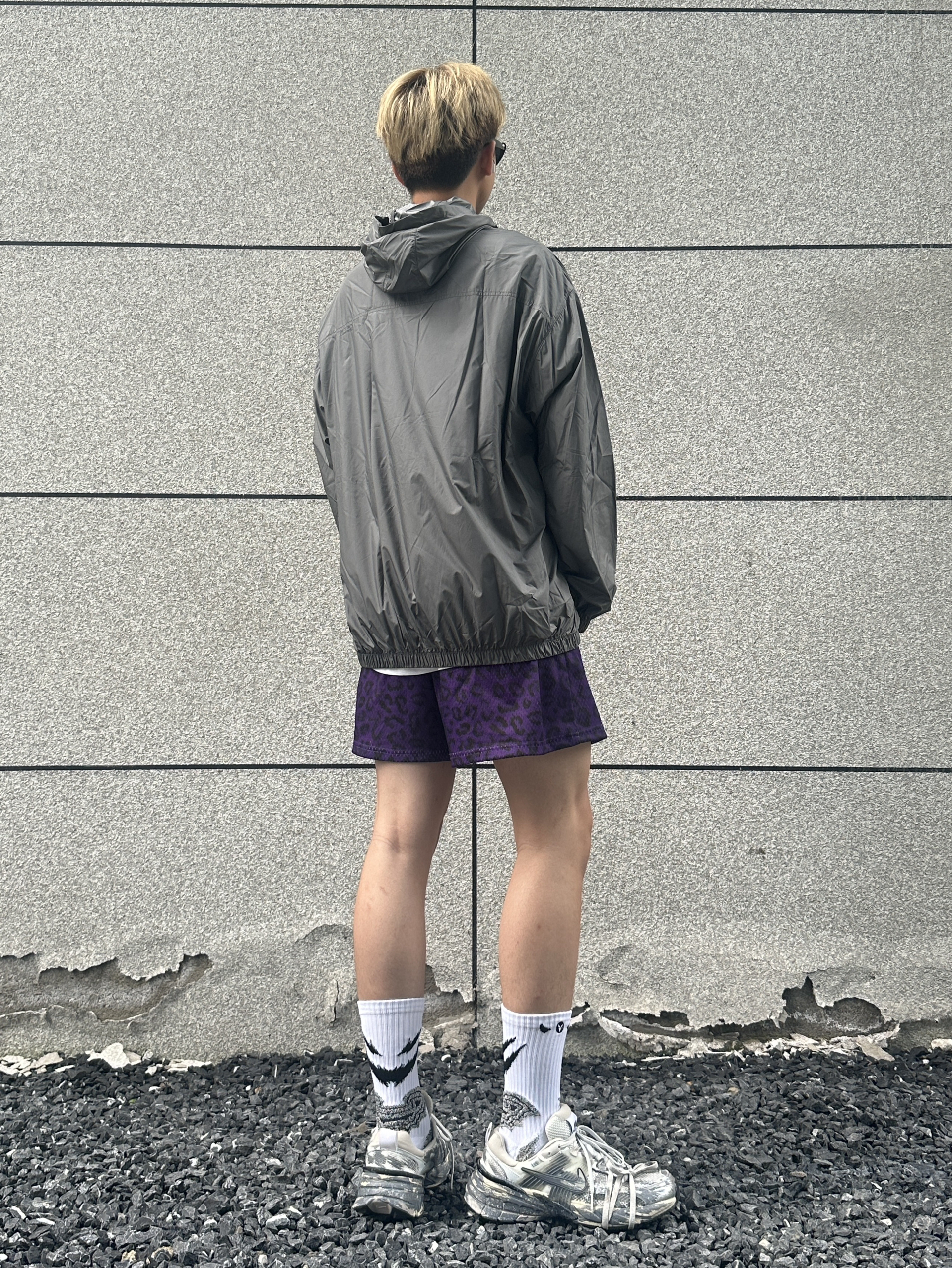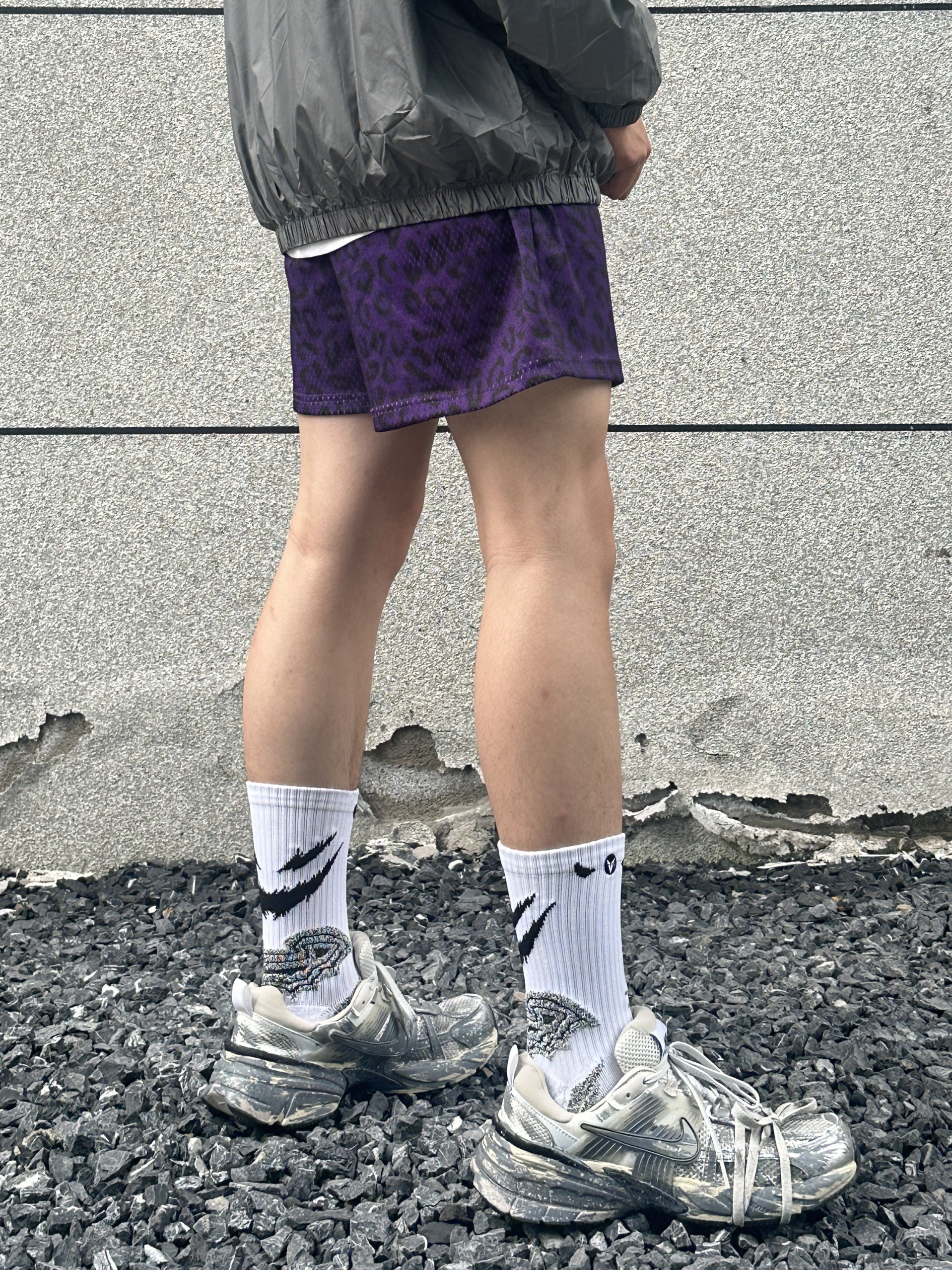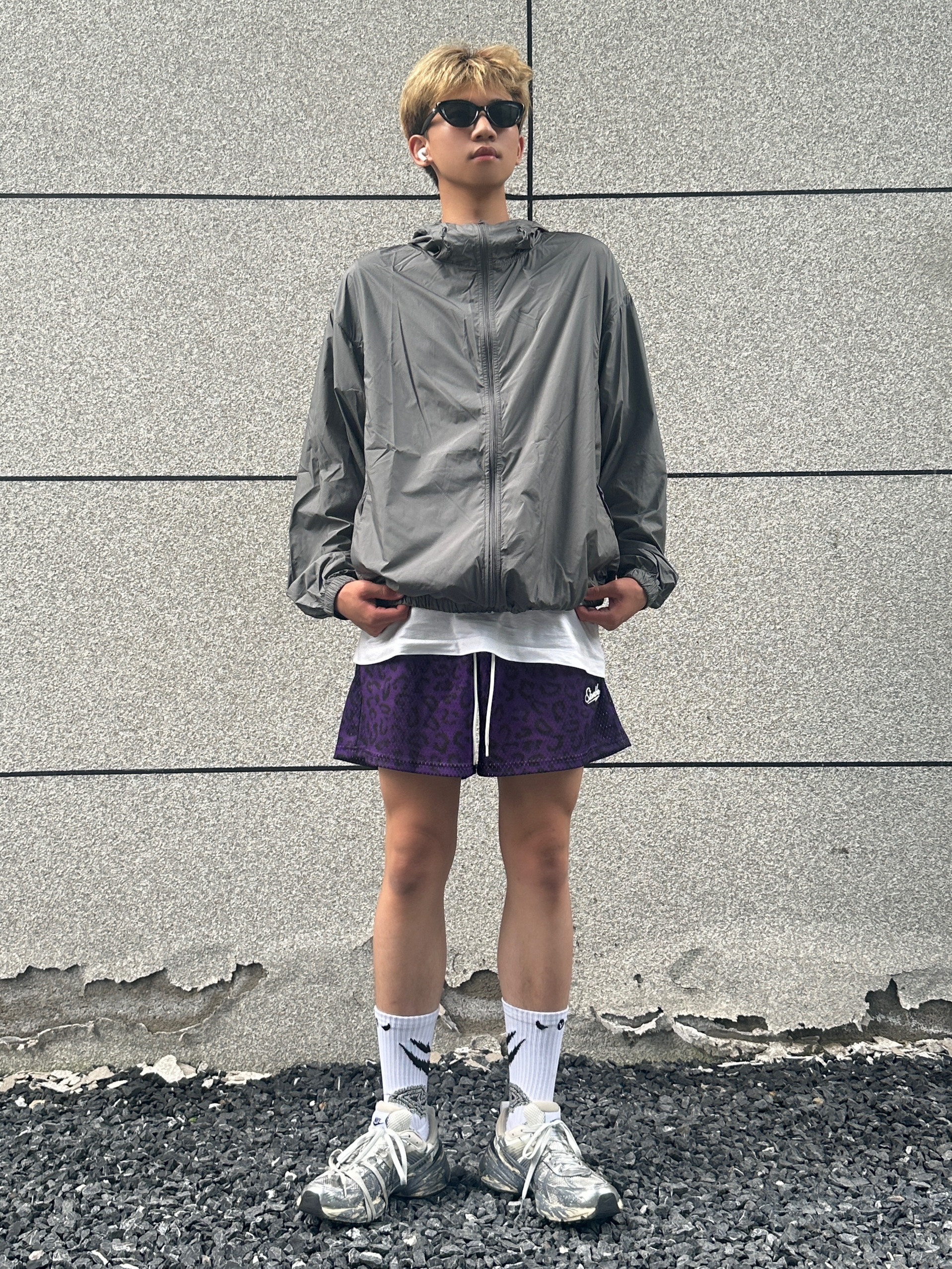 今天给大家分享夏季穿搭上衣搭配一件灰色的防晒衣下装是一条紫色豹纹短裤 鞋子是nike的废墟v2k 这双定制款的设计真的很拿捏我超级喜欢这个感觉 @良粹营造