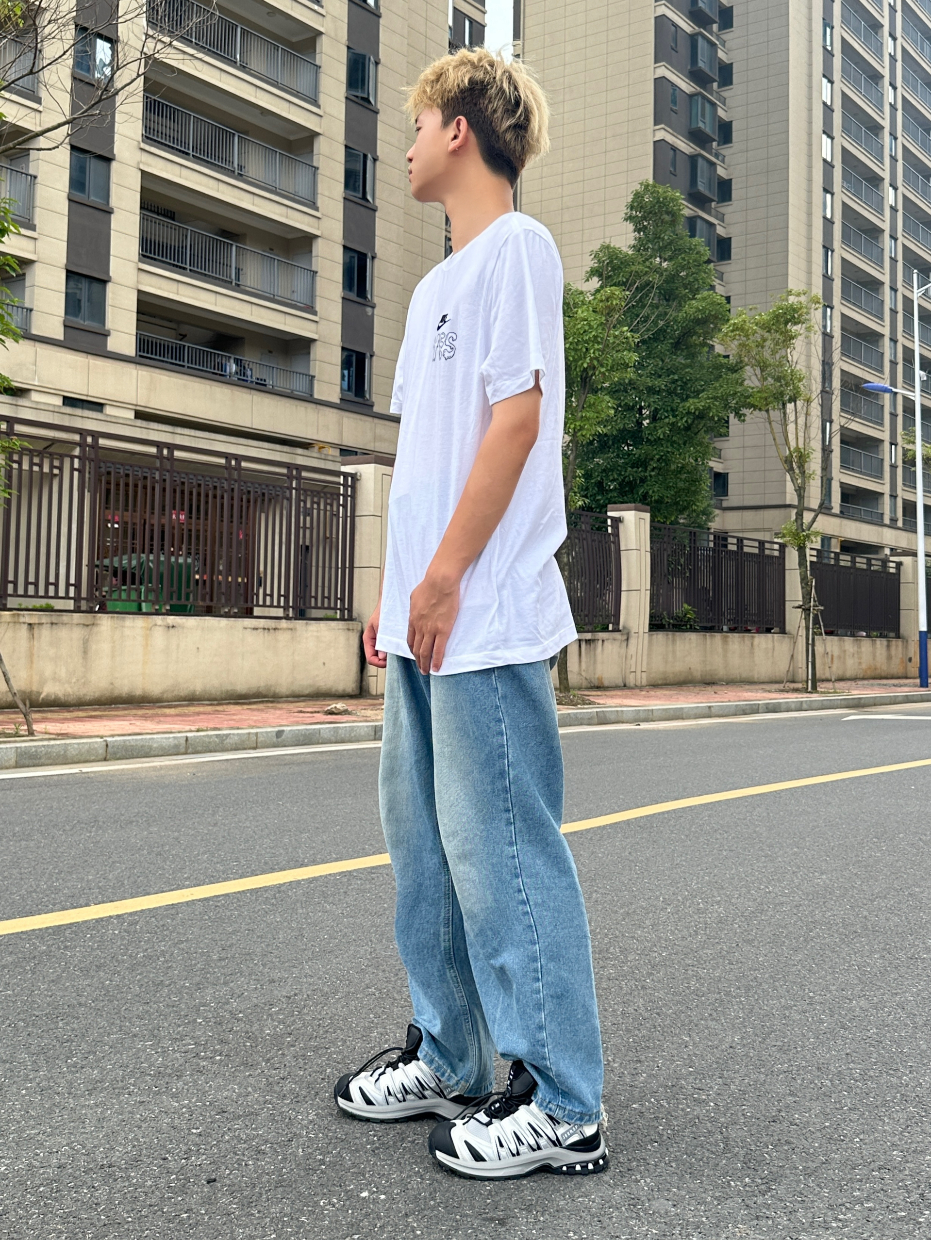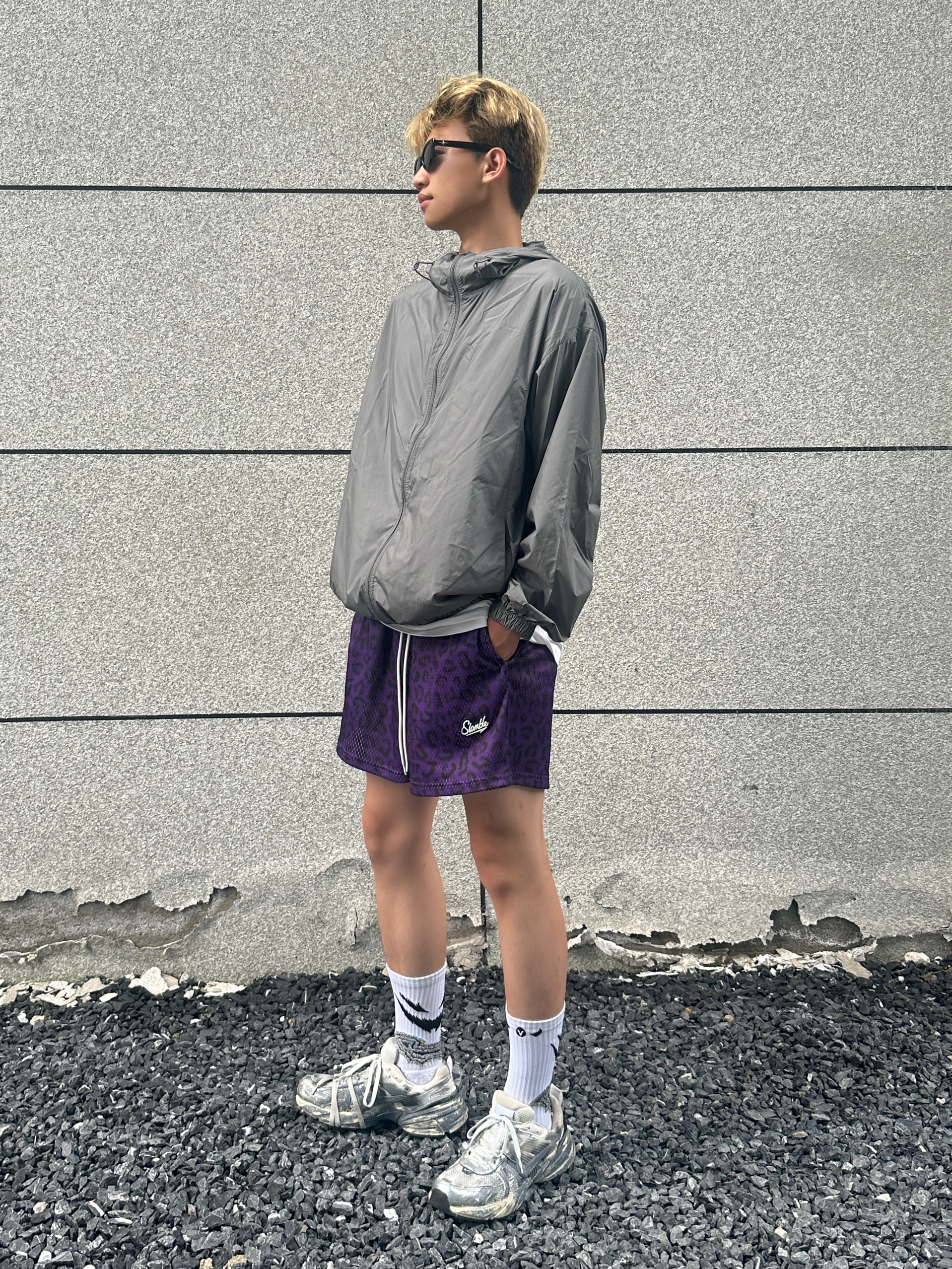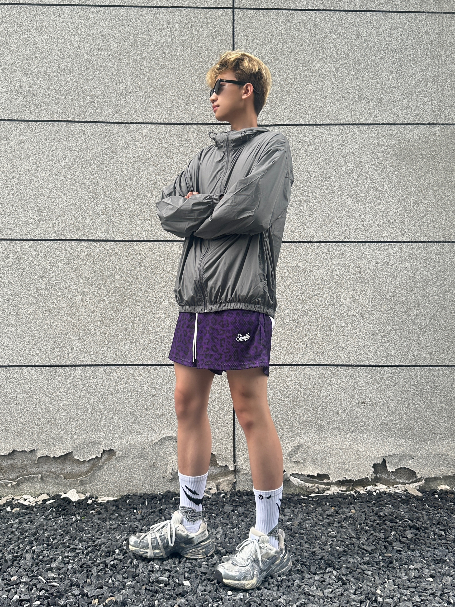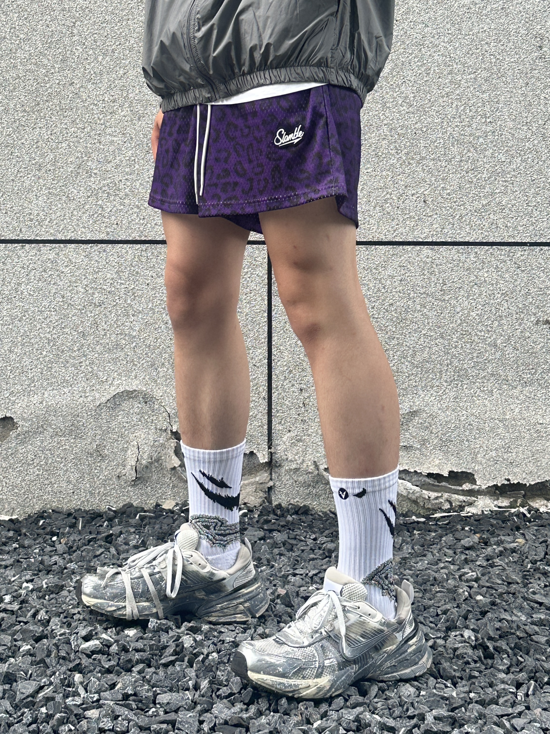 今天给大家分享夏季穿搭上衣搭配一件灰色的防晒衣下装是一条紫色豹纹短裤 鞋子是nike的废墟v2k 这双定制款的设计真的很拿捏我超级喜欢这个感觉 @良粹营造