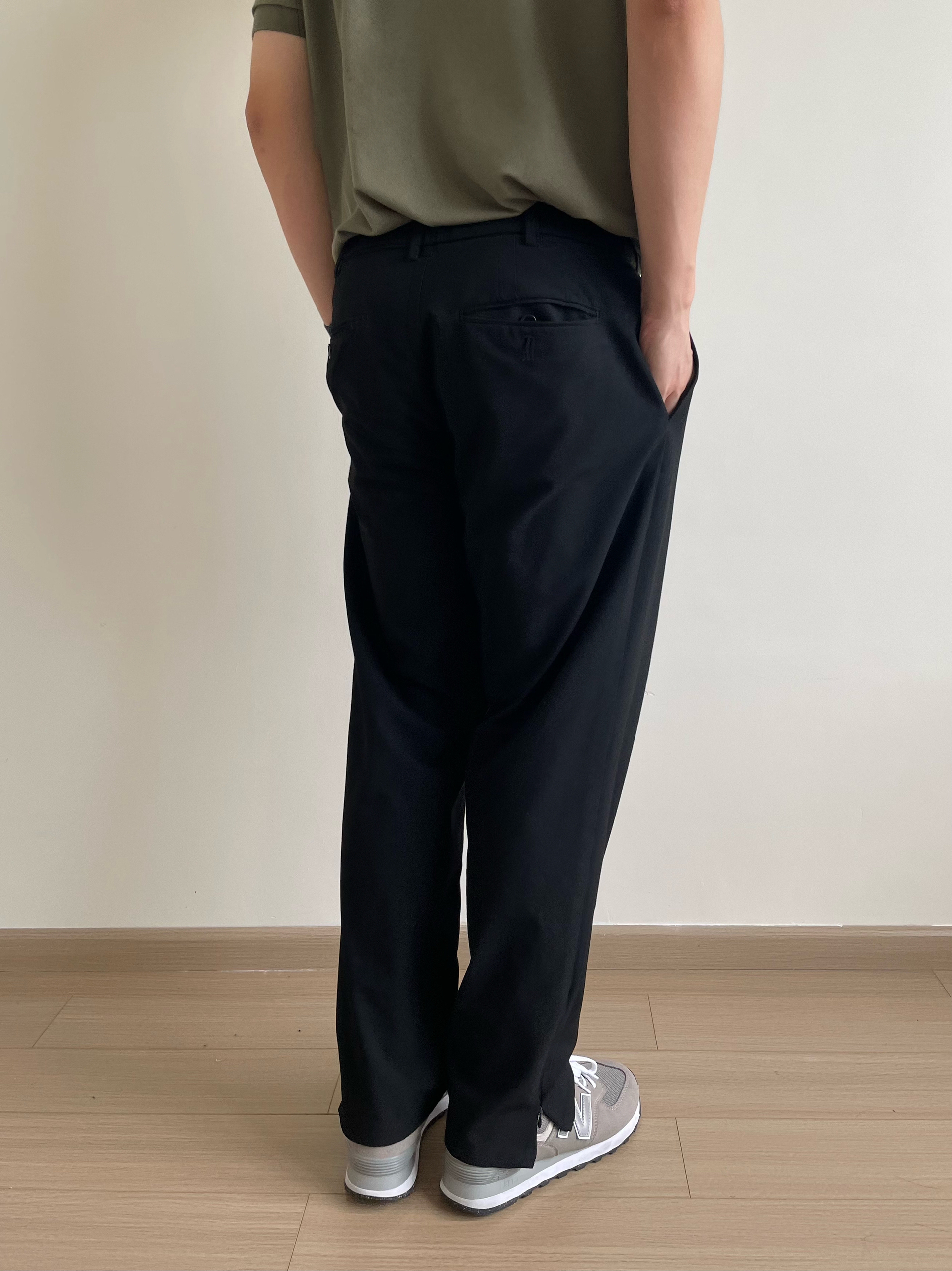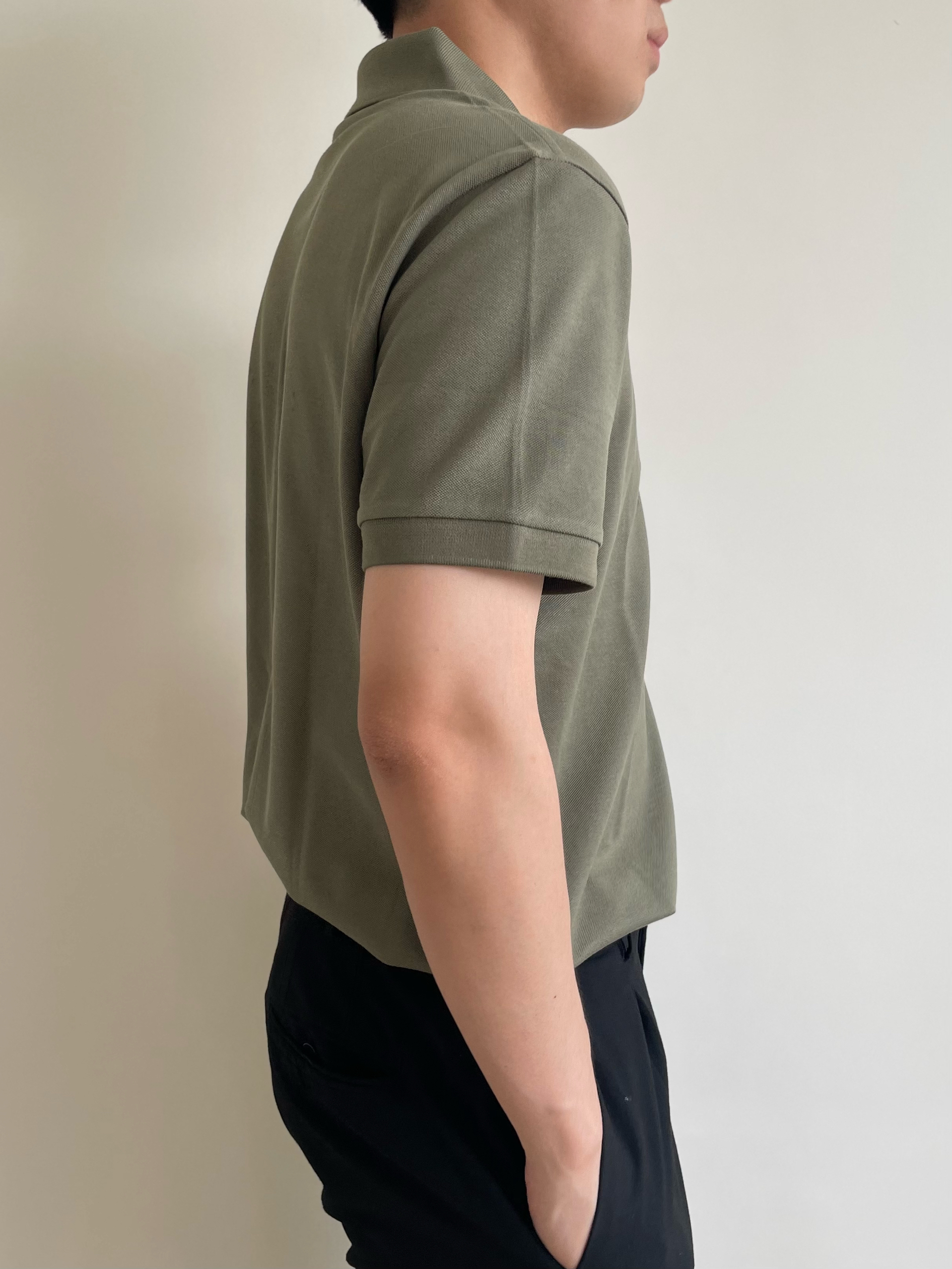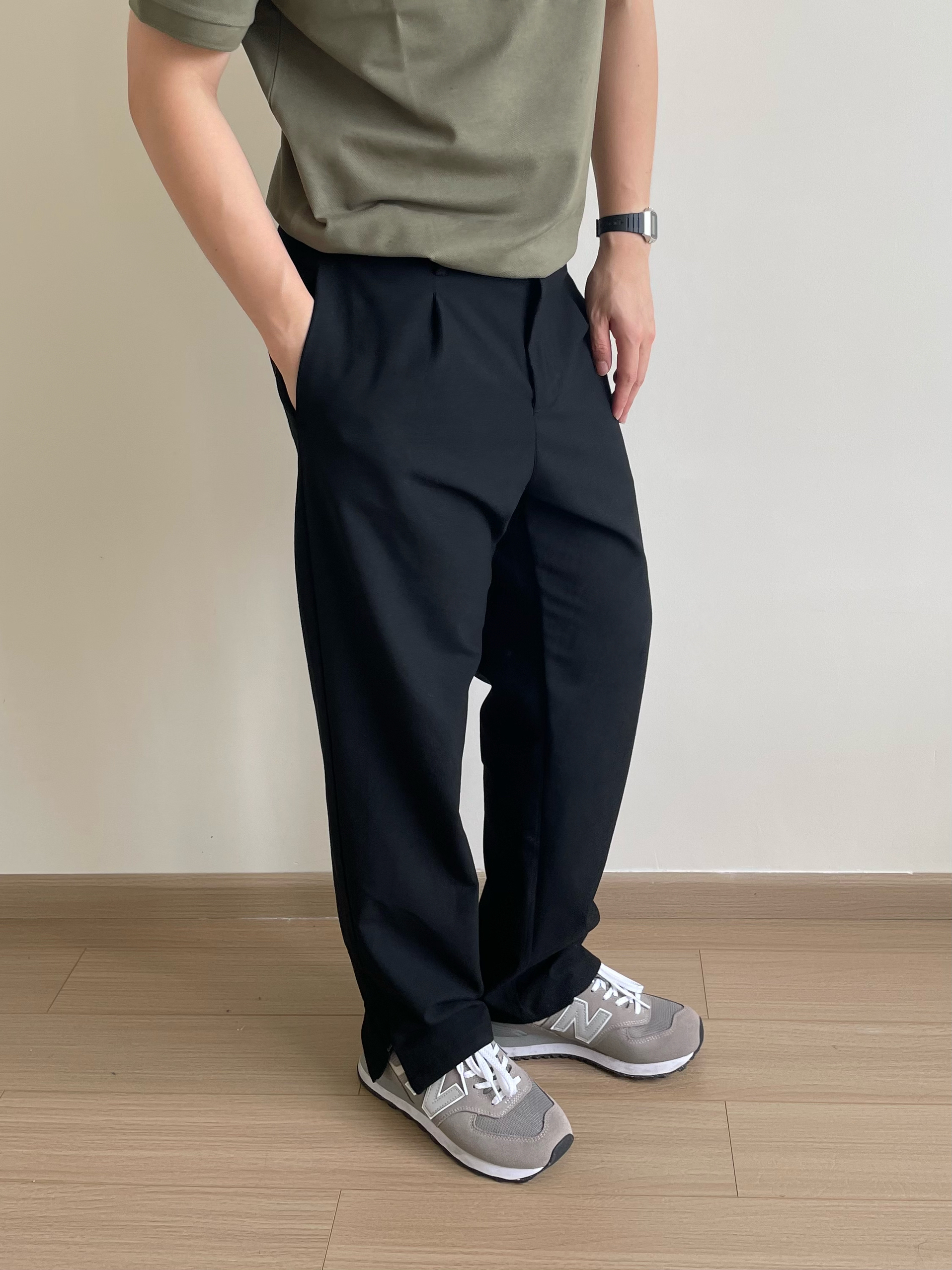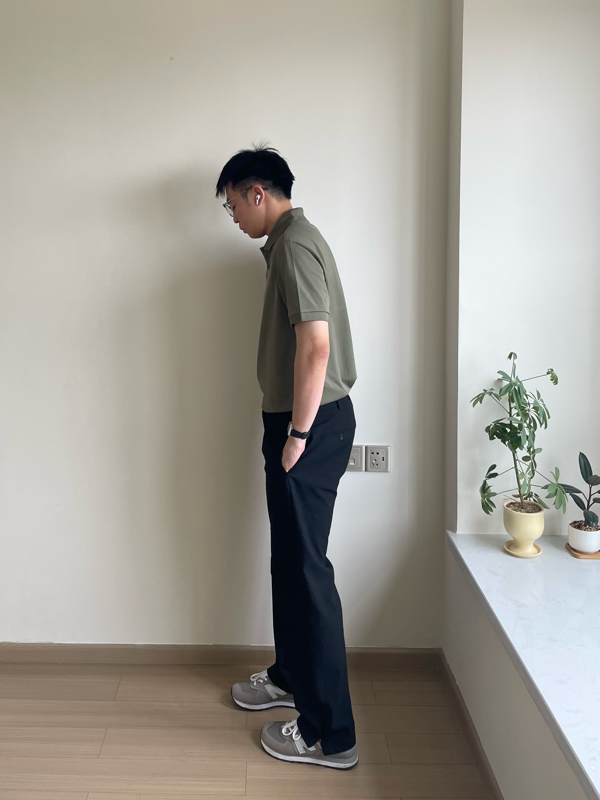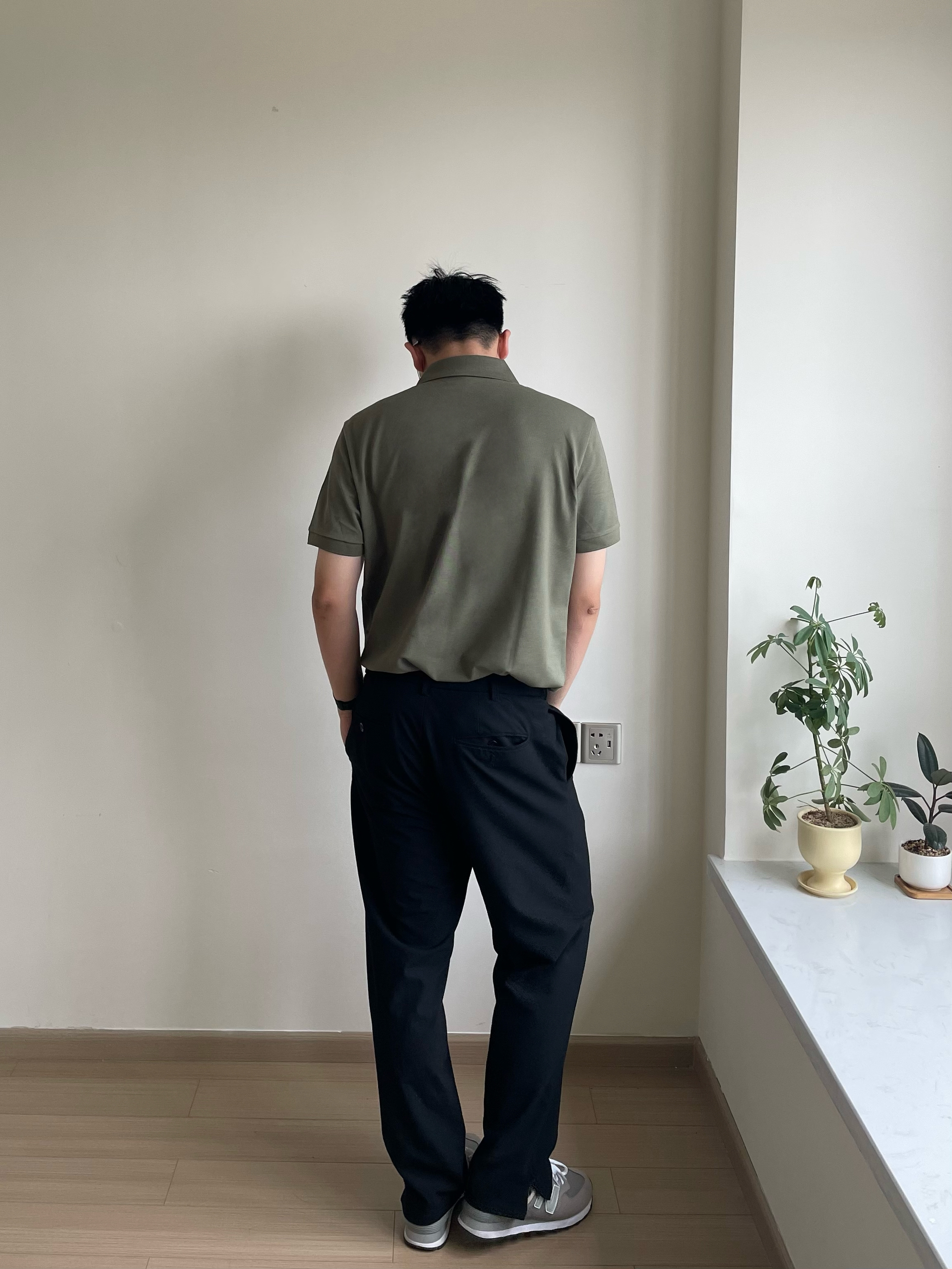 将POLO衫下摆塞入裤腰。在比较正式的场合。 在较为轻松的场合,则可以适当松弛,展现休闲随性的风格。 上身的一件豆绿色polo,低饱和色系在夏季中更舒适,视觉降温。L码,微宽松版型,通勤百搭。 搭配一条黑色简约款西裤,干净利落,防皱面料打理容易。