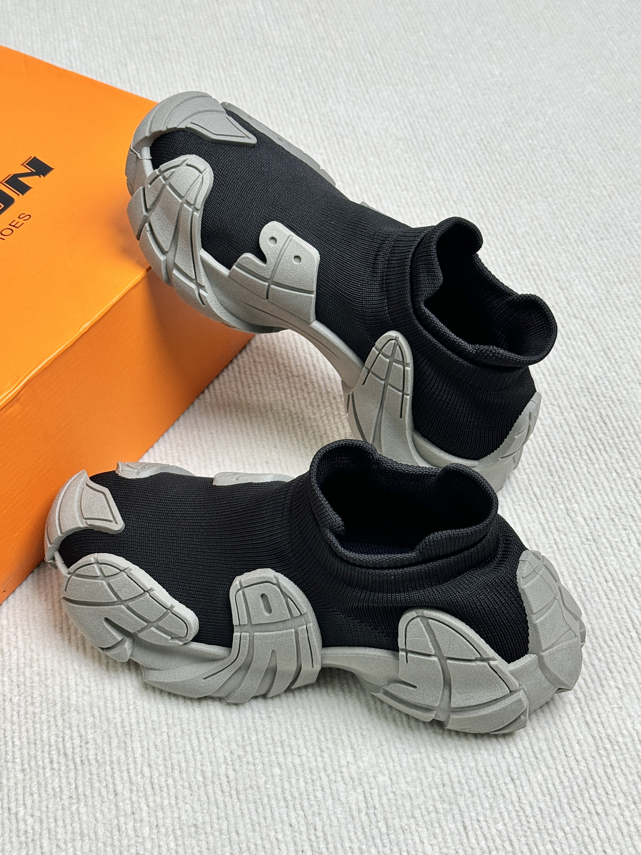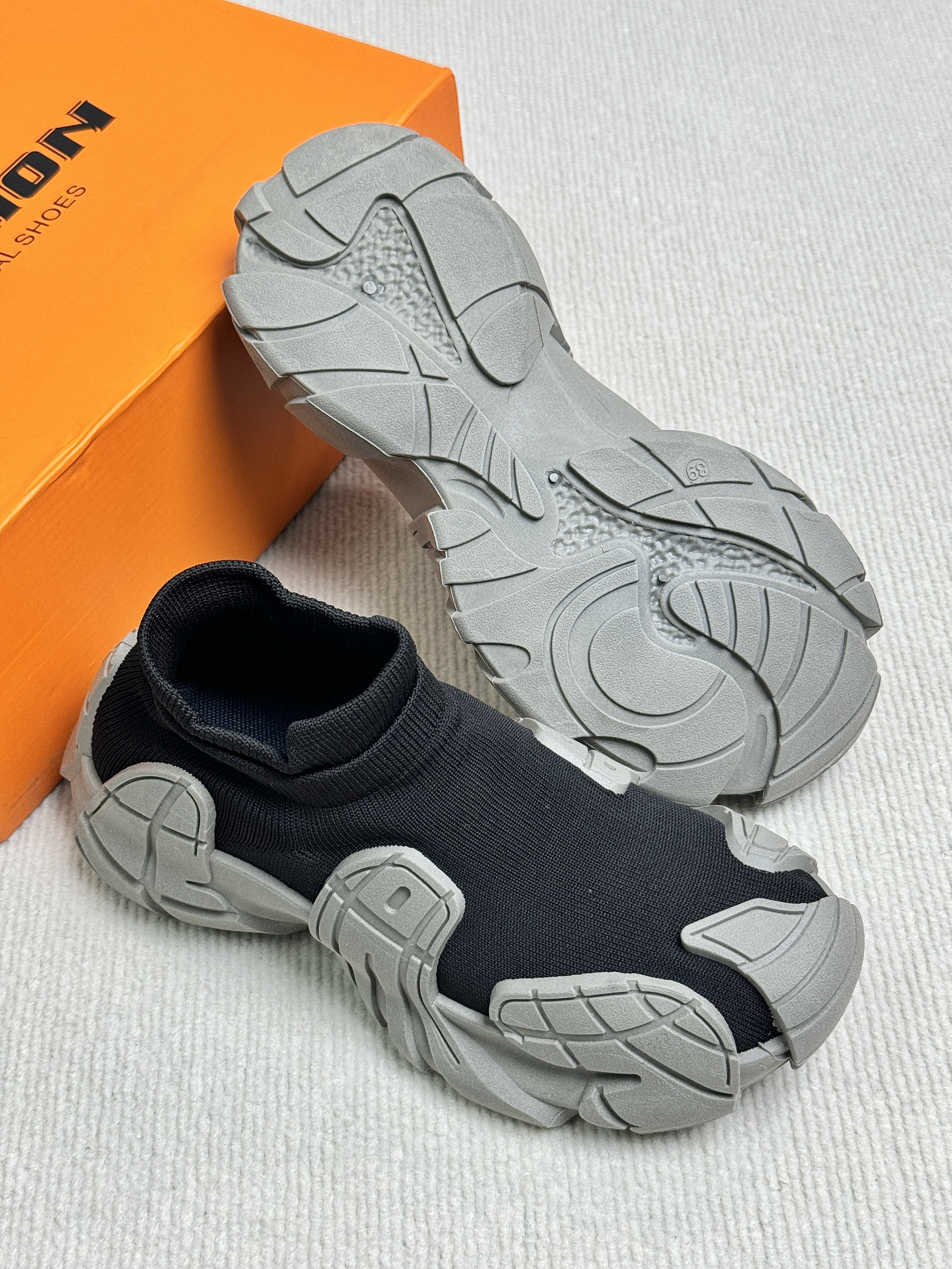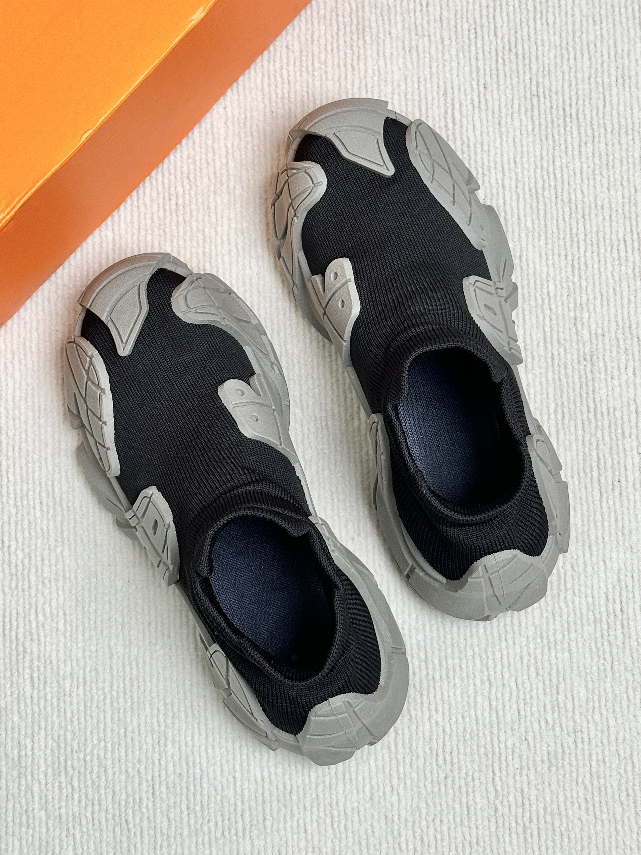 黑灰的配色有点沙丘的废土风 鞋底的上翻轮廓防踢防撞 带一丝机甲感飞织的鞋面 不仅贴合舒服而且透气不捂脚 套脚的设计穿脱很方便