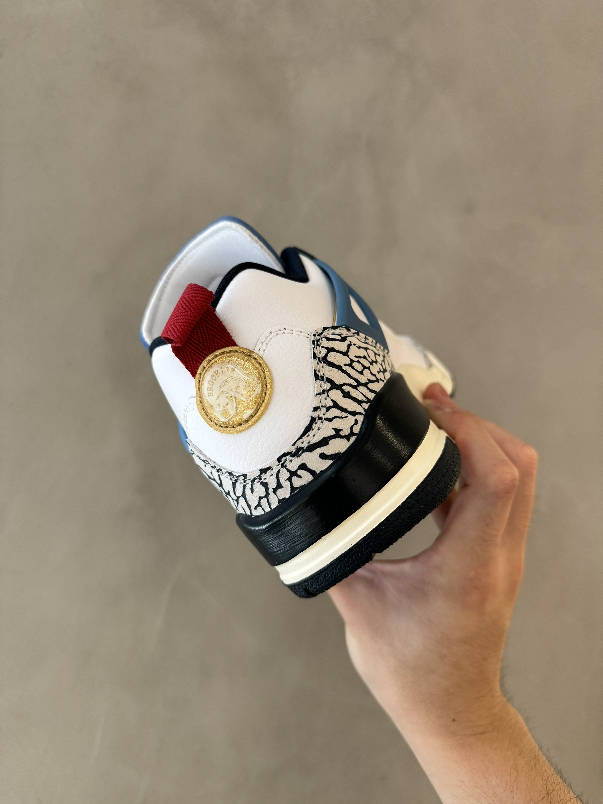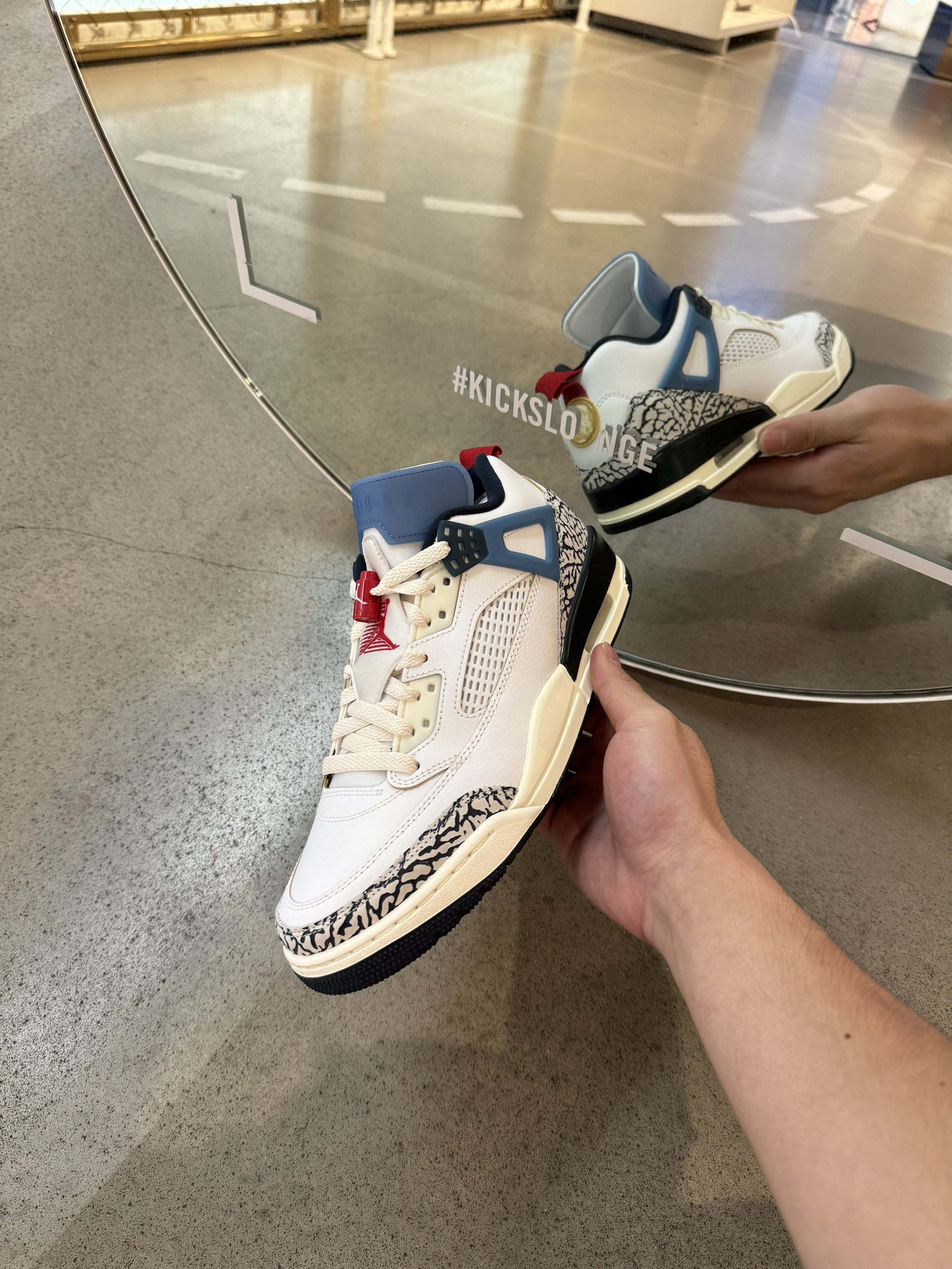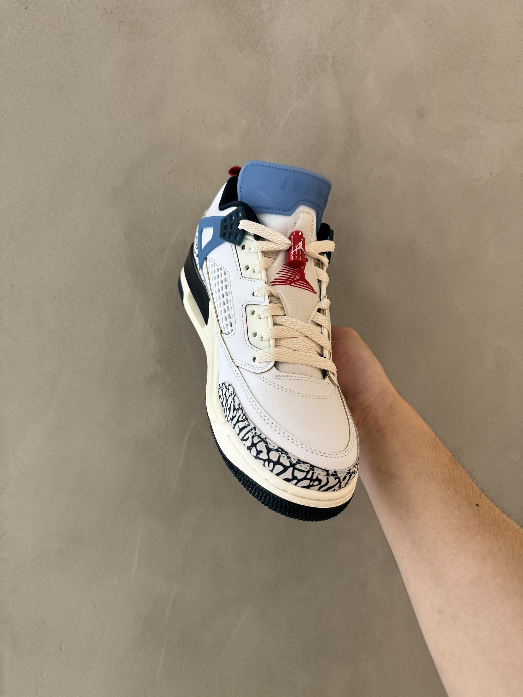 新款Spizike采用70-80年代奥运元素风格设计 鞋面采用纯白皮革 tpu采用复古蓝点缀 鞋舌logo采用叠影飞人logo 后跟及鞋头包边采用经典爆裂纹工艺 整体显得十分复古