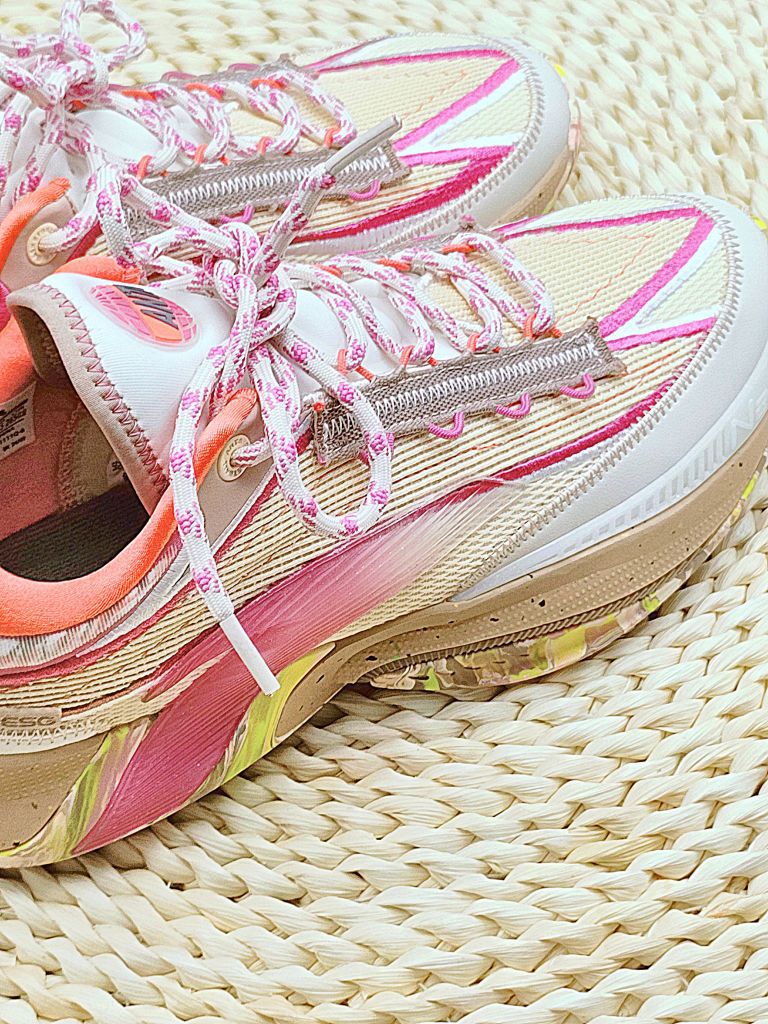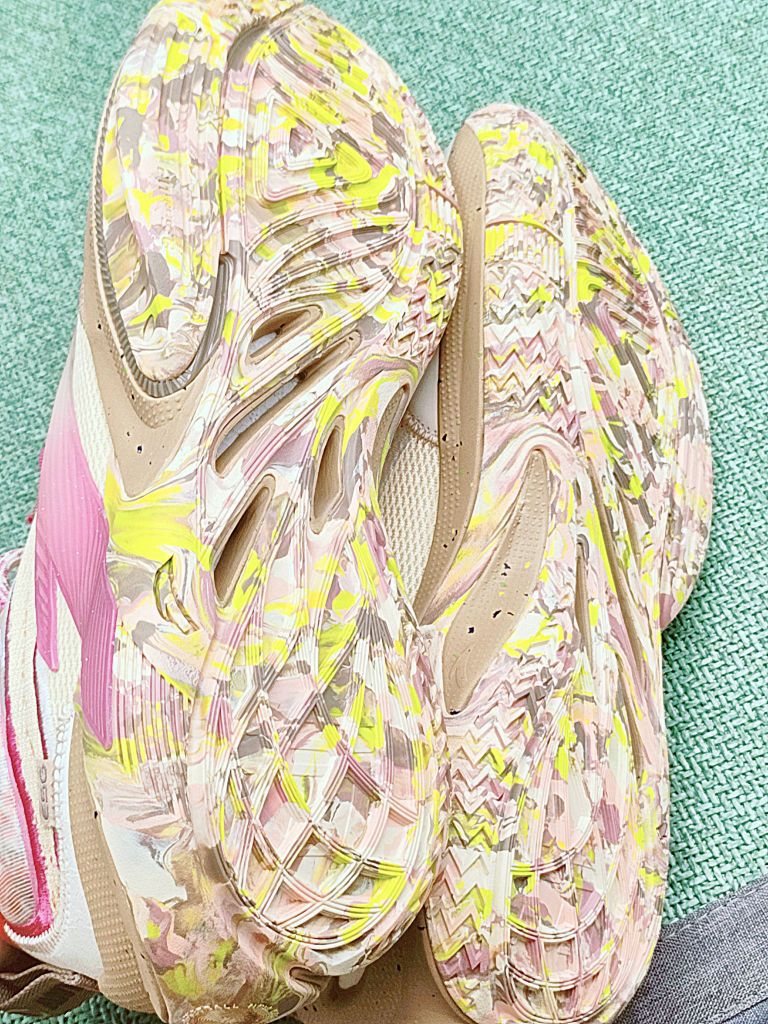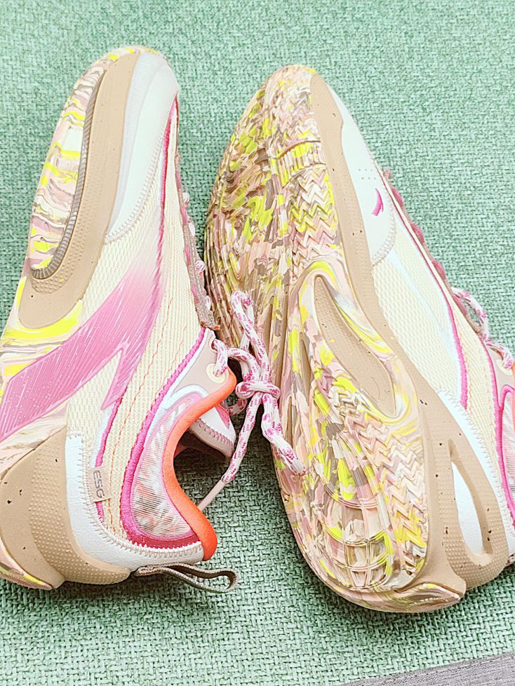 个人认为颜值在线,细节挺多。整双以粉色白色为主。环保主题采用了缝线的鞋面。 我很喜欢这个鞋底花纹的艺术,色彩斑斓抢眼。 尺码标准不偏码,包裹感也可以。 蛮适合夏天的一双,穿起来。冲