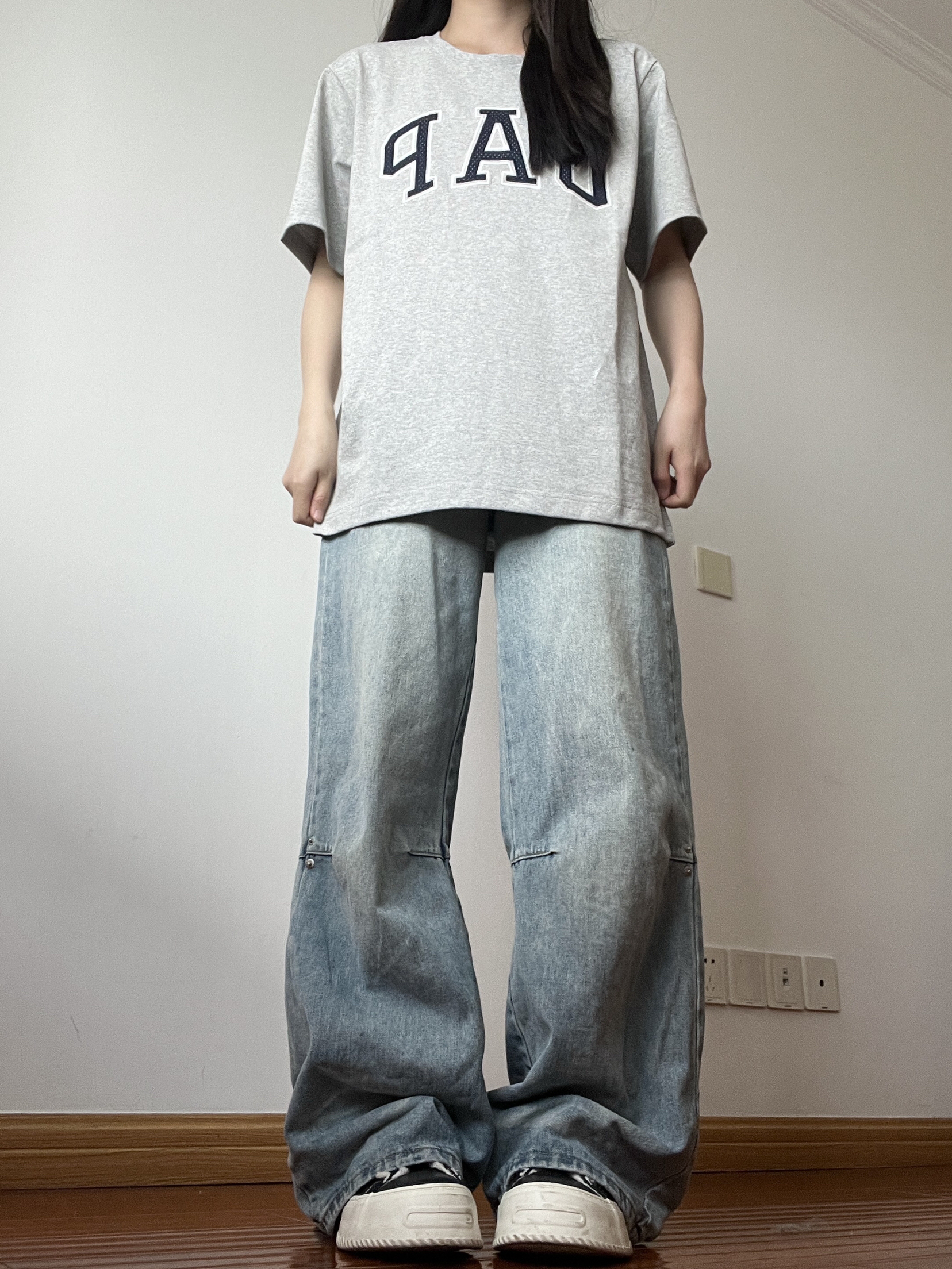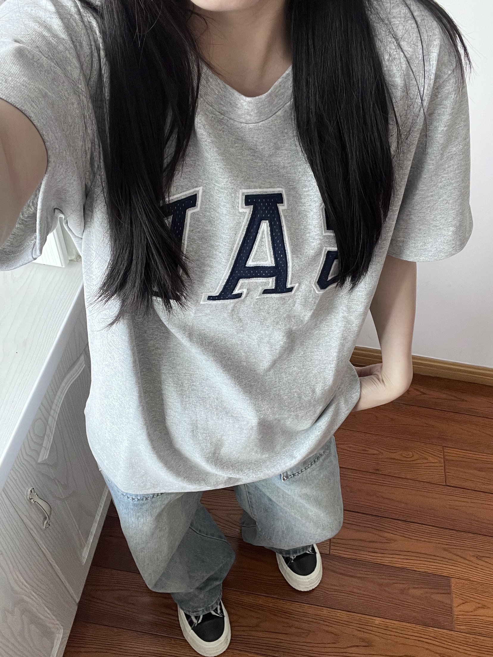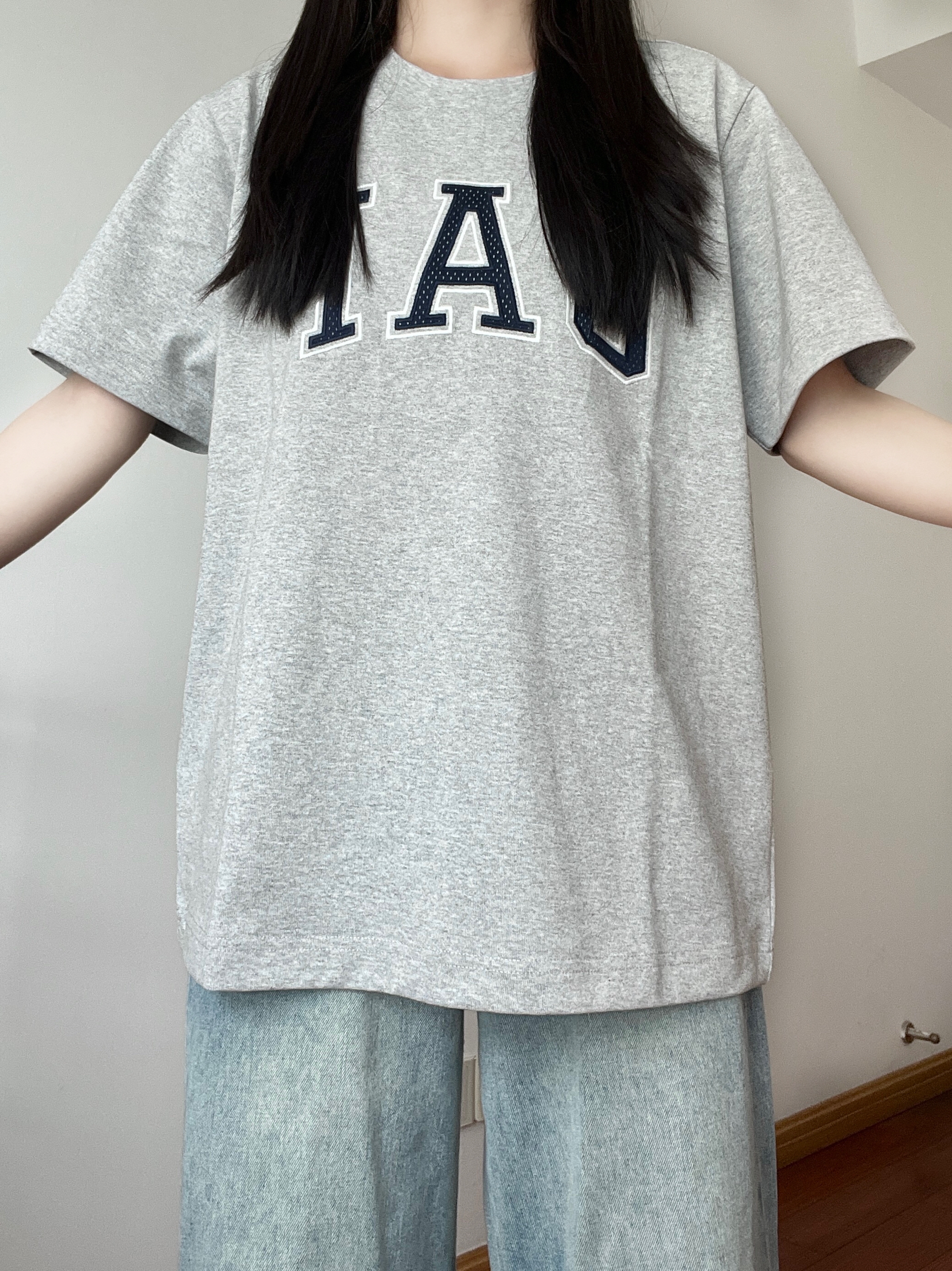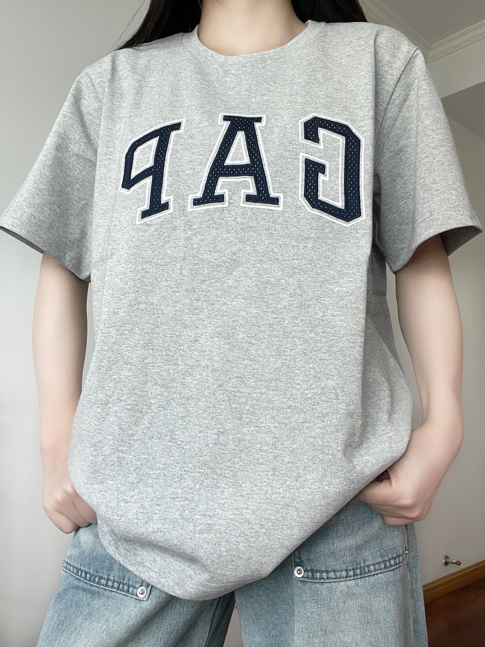 种草了这件GAP的灰色T恤,上身好好看耶! 质感好好的T恤,衣服上的LOGO是网眼拼接耶好别致😆我身高是160cm上身穿的是灰色M码,这件短袖料子我很喜欢,很硬挺有型,上身特别好看🤗 今日随意搭配宽松牛仔裤很绝,短袖日常穿或者运动穿都OK,近期好爱的T恤(˃ ⌑ ˂ഃ )